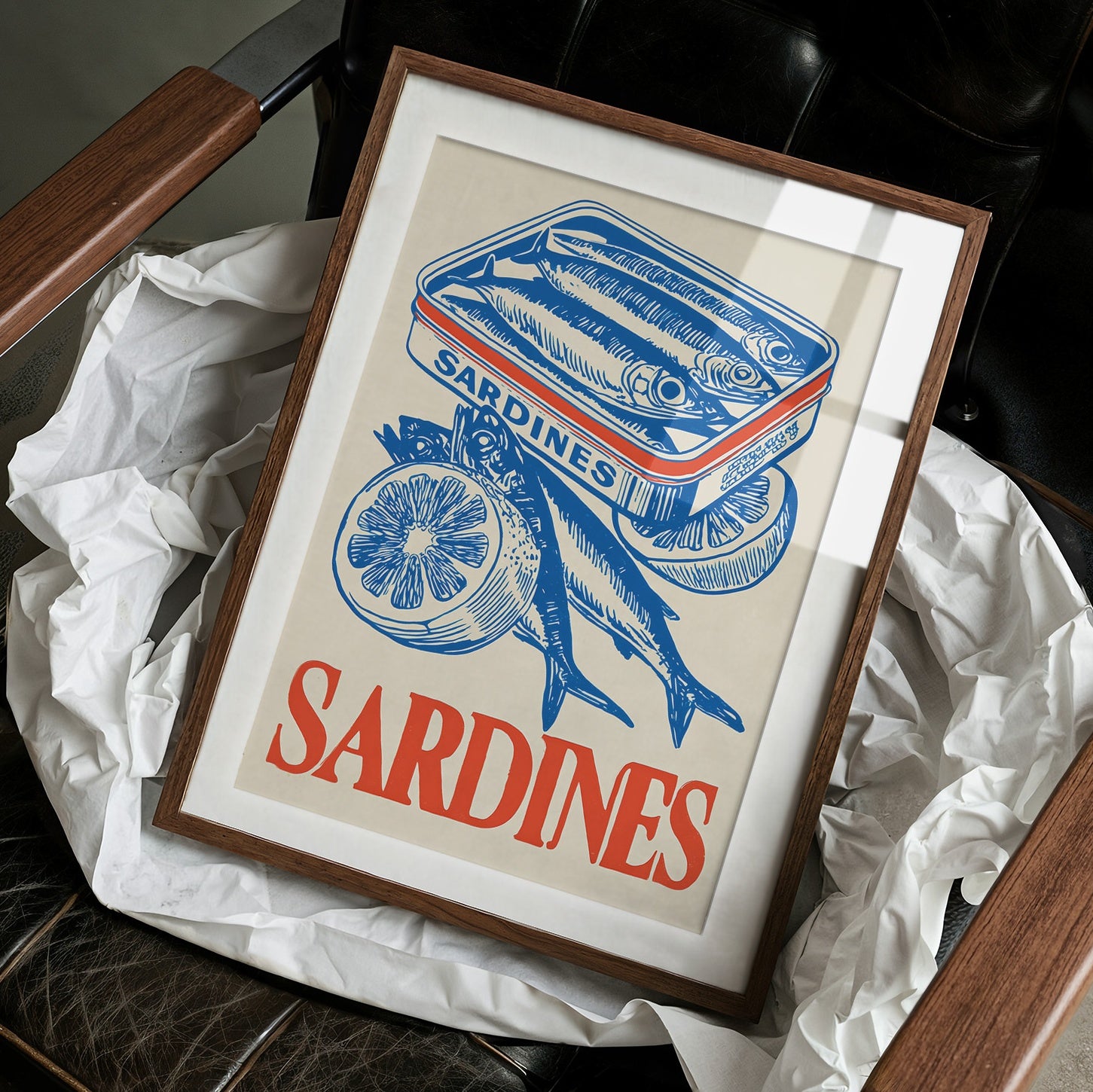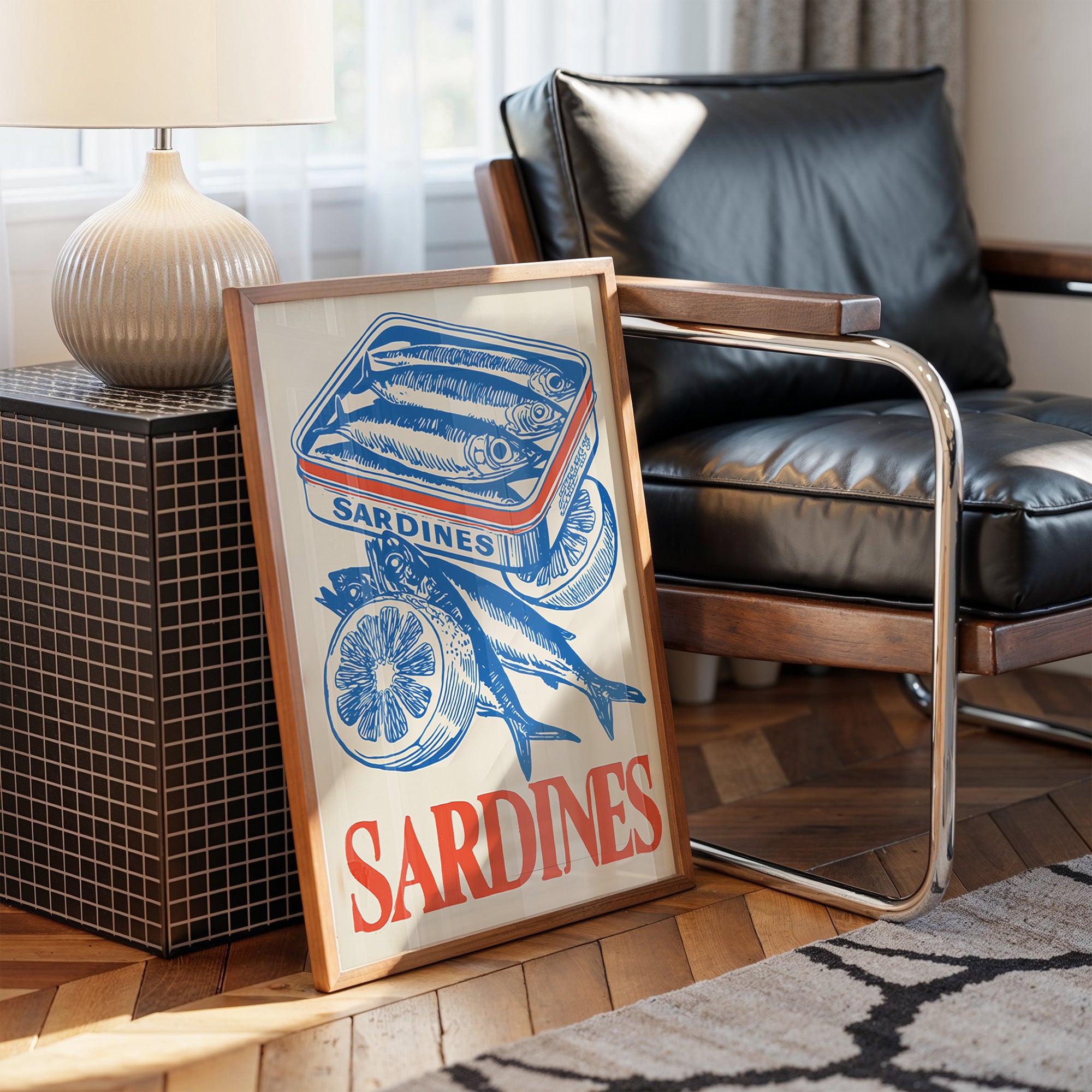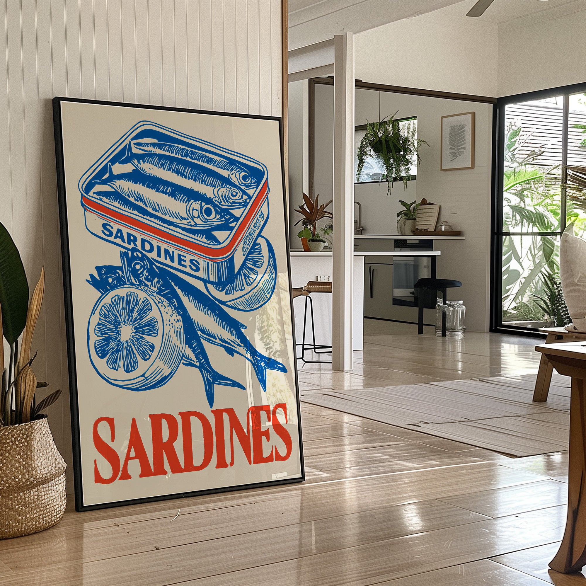 A striking contemporary canvas print featuring a vintage-inspired illustration of sardines in bold cobalt blue against a natural beige background. The composition showcases a tin of packed sardines alongside fresh fish and sliced lemons, creating a nostalgic yet modern culinary still life. The word "SARDINES" anchors the bottom in vibrant coral-red lettering, providing a perfect color contrast to the dominant blue illustration.