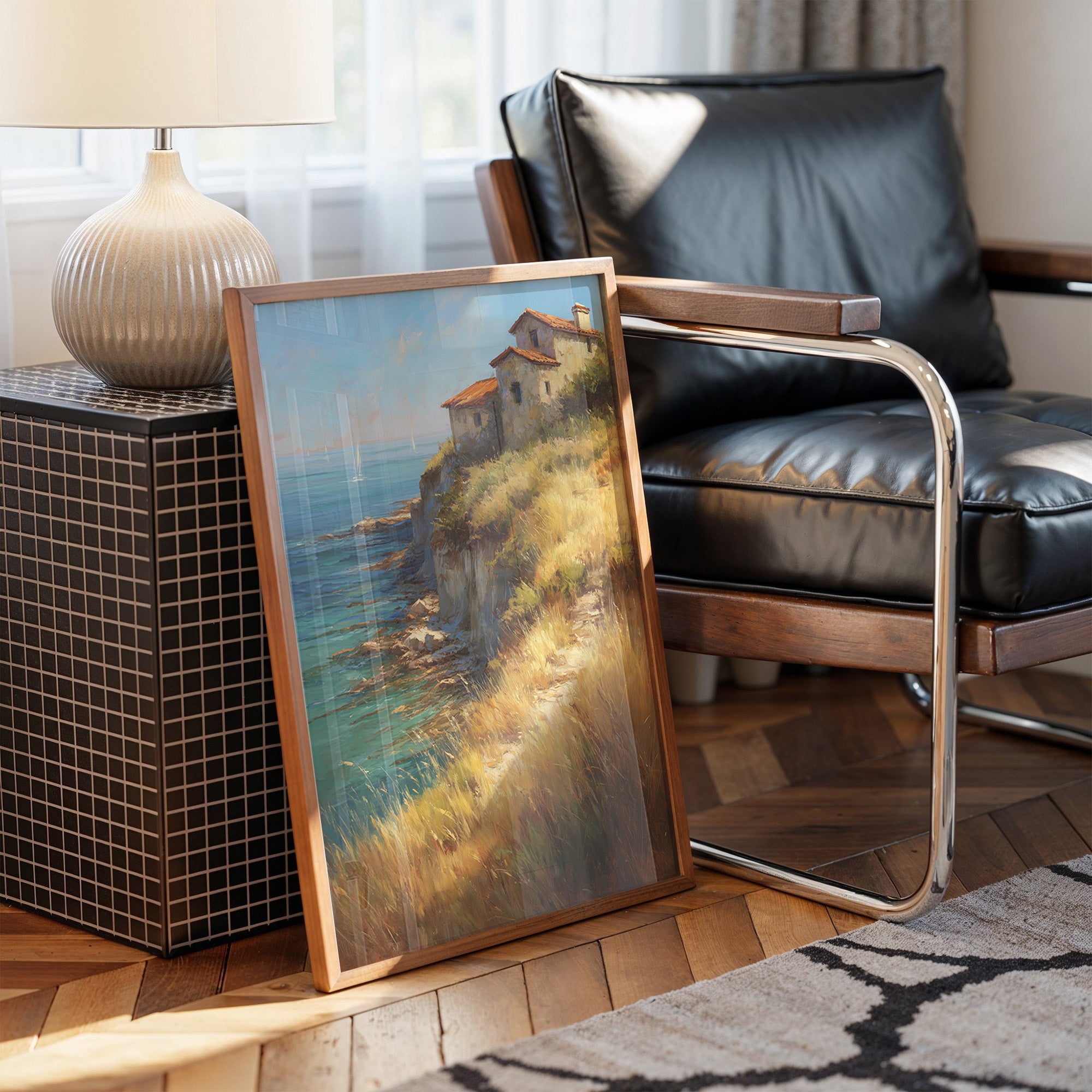 Golden grasses dance on the edge of a coastal precipice, warmed by afternoon sun. The painting captures a serene Mediterranean villa perched above azure waters, its terracotta roof and weathered walls telling stories of salt-kissed years. Sunlight bathes the scene in a honey glow, highlighting the textural contrast between rugged cliffside and tranquil sea.