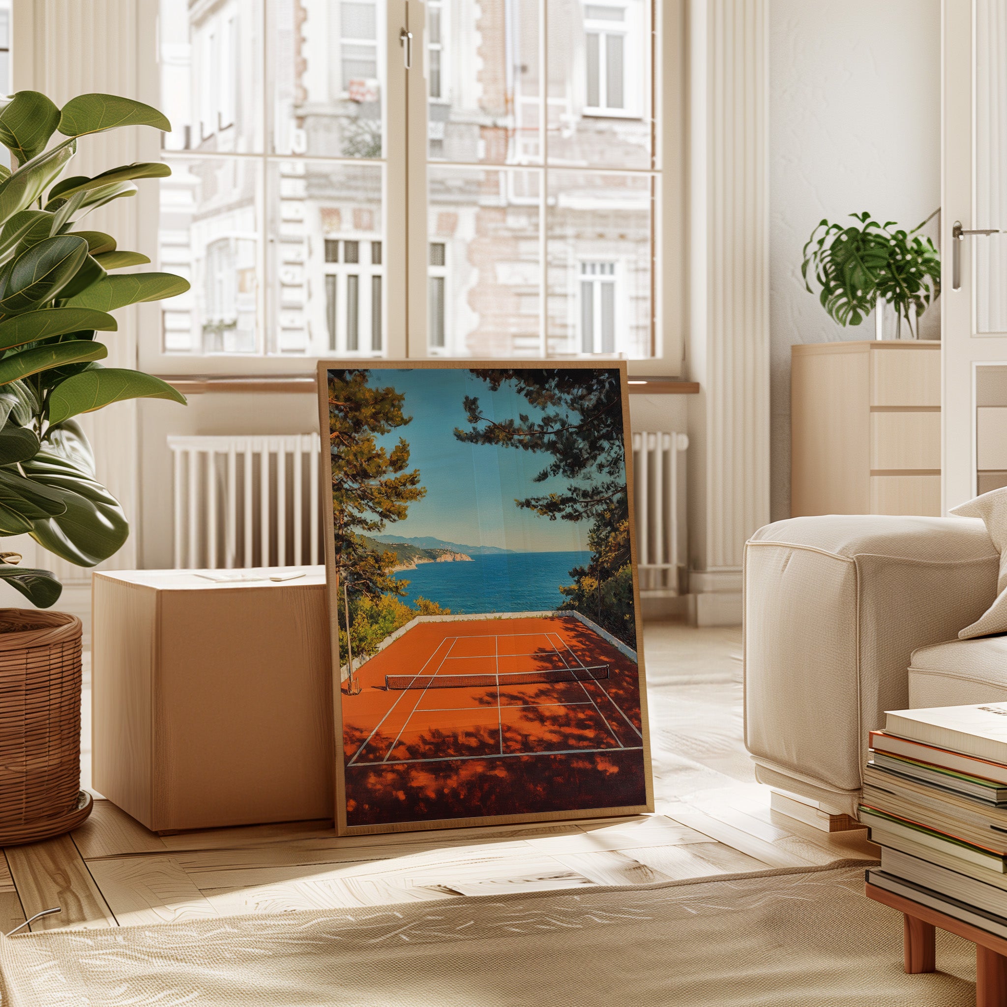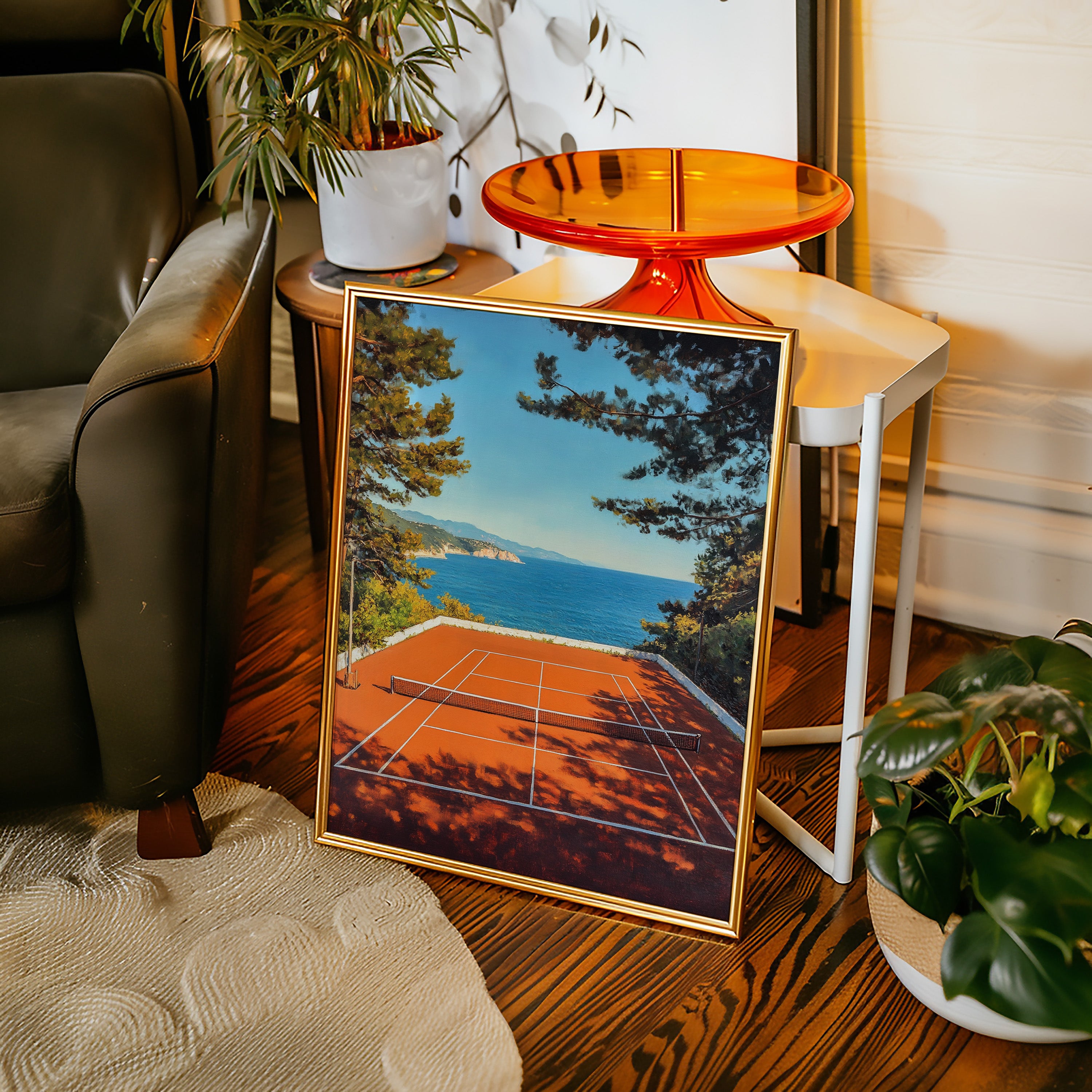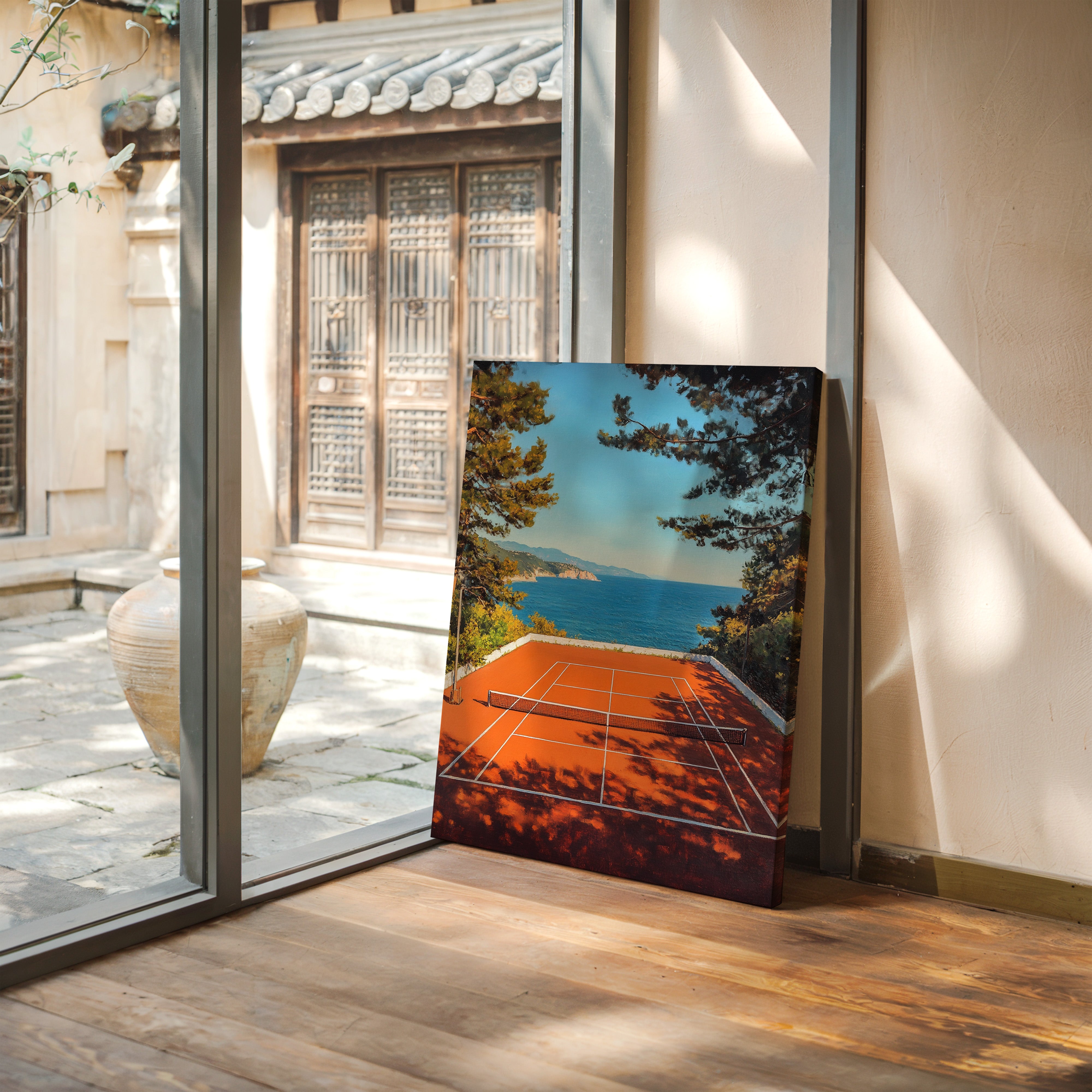 A clay tennis court perches dramatically above the azure Mediterranean, framed by sun-dappled pine trees casting their afternoon shadows. The vibrant orange court creates a striking contrast against the deep blue sea, while distant cliffs fade into misty mountains along the coastline. The scene captures the essence of coastal luxury, where sport meets natural splendor in perfect harmony. This stunning vista would bring sophisticated energy to a home office, sports den, or any space celebrating the intersection of athletic pursuit and natural beauty.