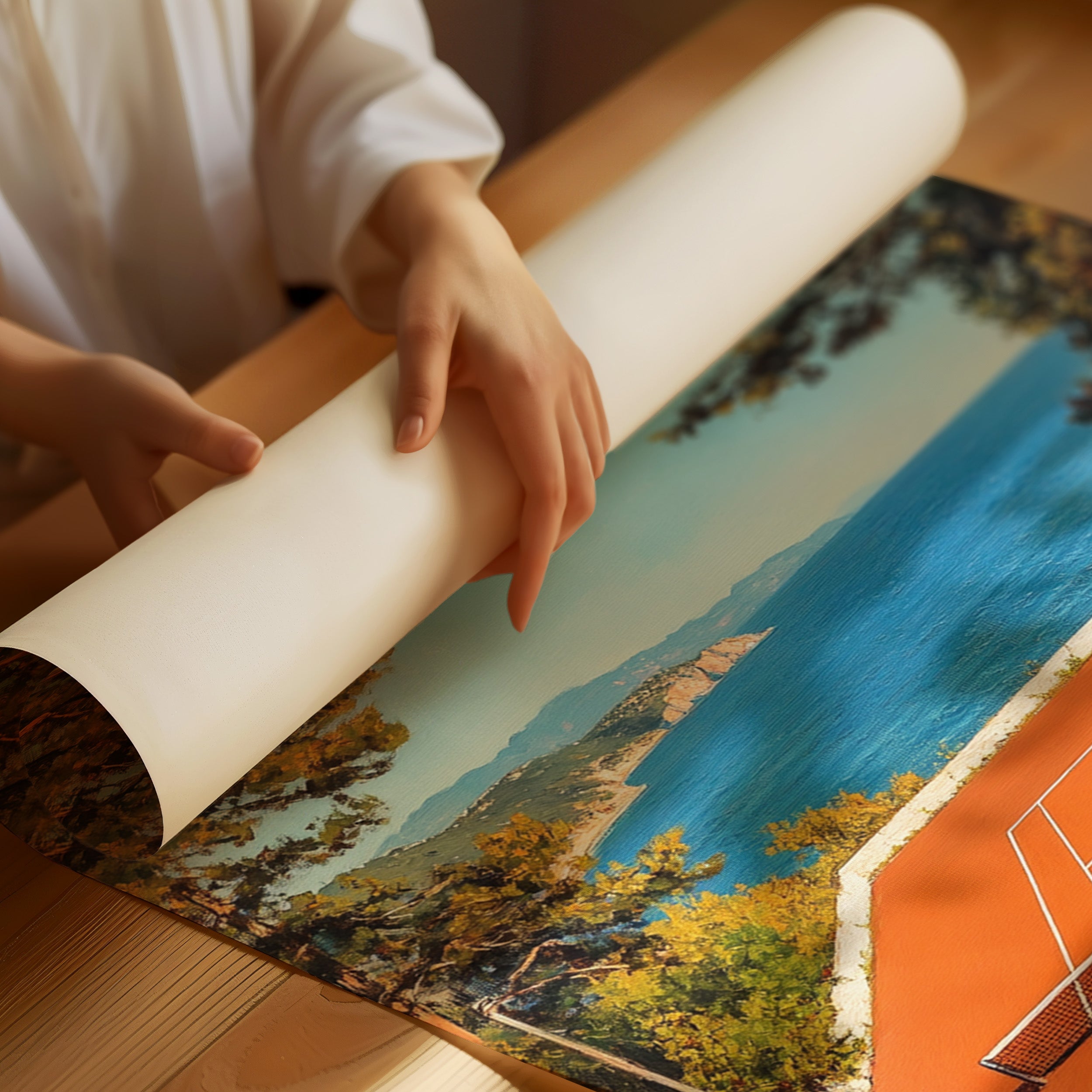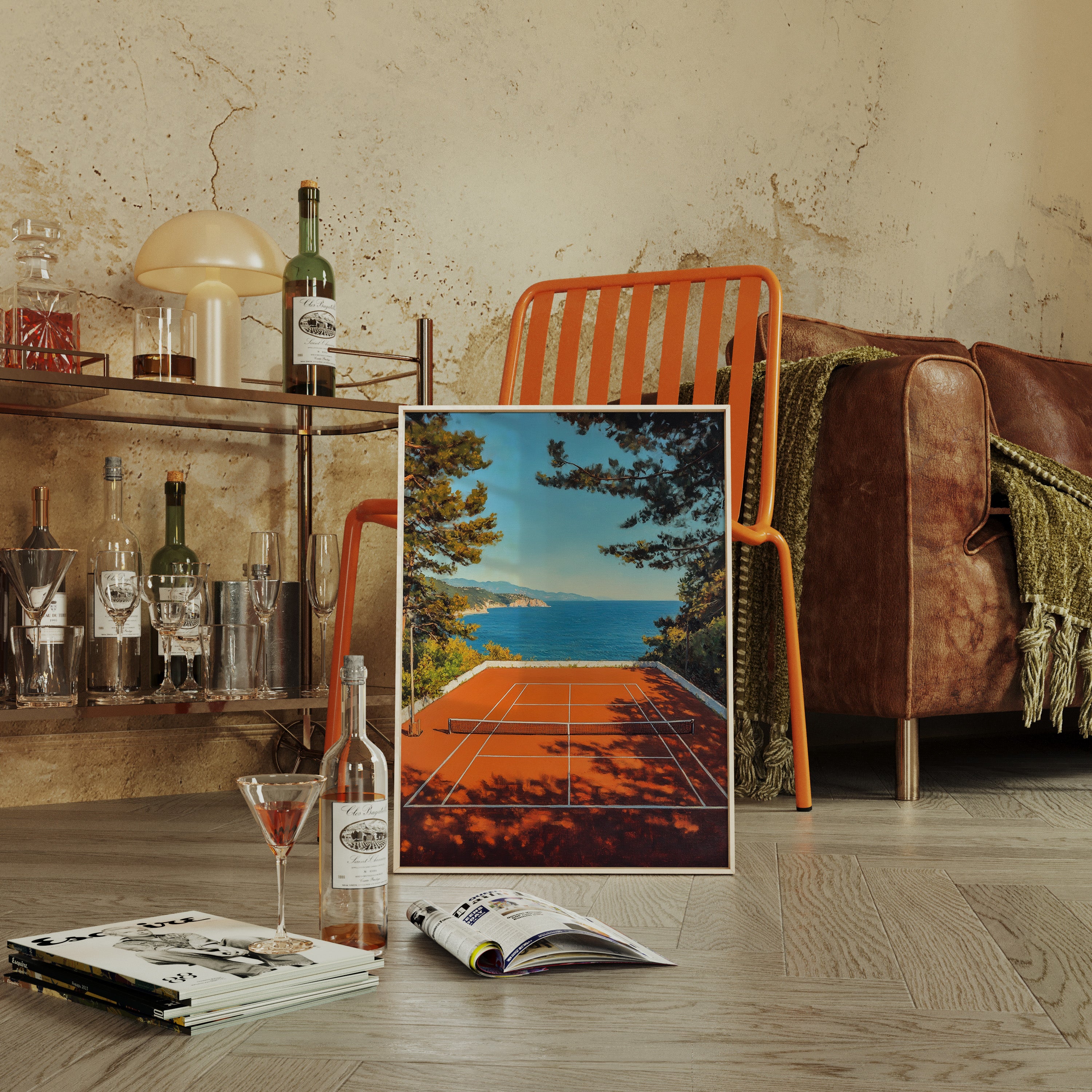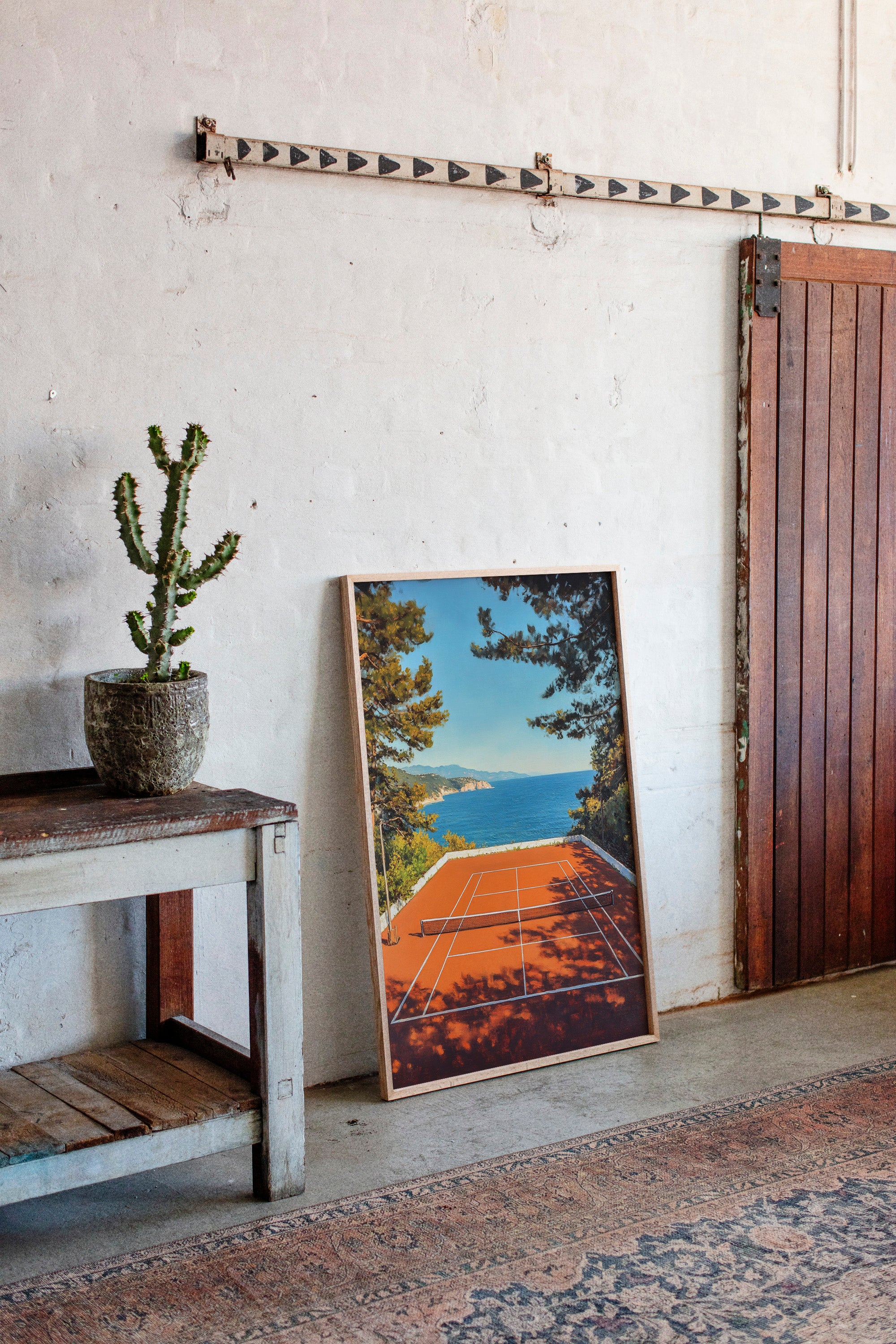 A clay tennis court perches dramatically above the azure Mediterranean, framed by sun-dappled pine trees casting their afternoon shadows. The vibrant orange court creates a striking contrast against the deep blue sea, while distant cliffs fade into misty mountains along the coastline. The scene captures the essence of coastal luxury, where sport meets natural splendor in perfect harmony. This stunning vista would bring sophisticated energy to a home office, sports den, or any space celebrating the intersection of athletic pursuit and natural beauty.