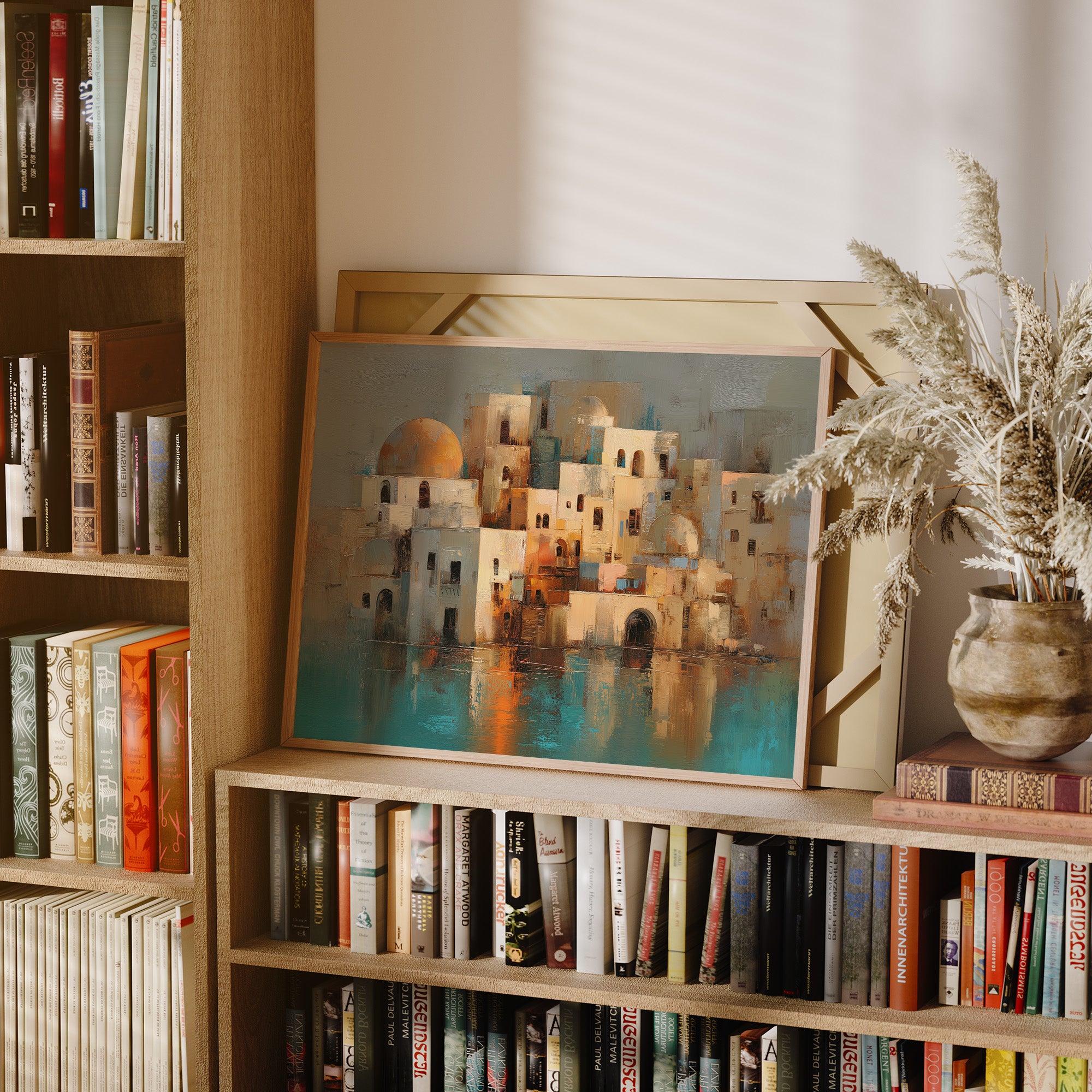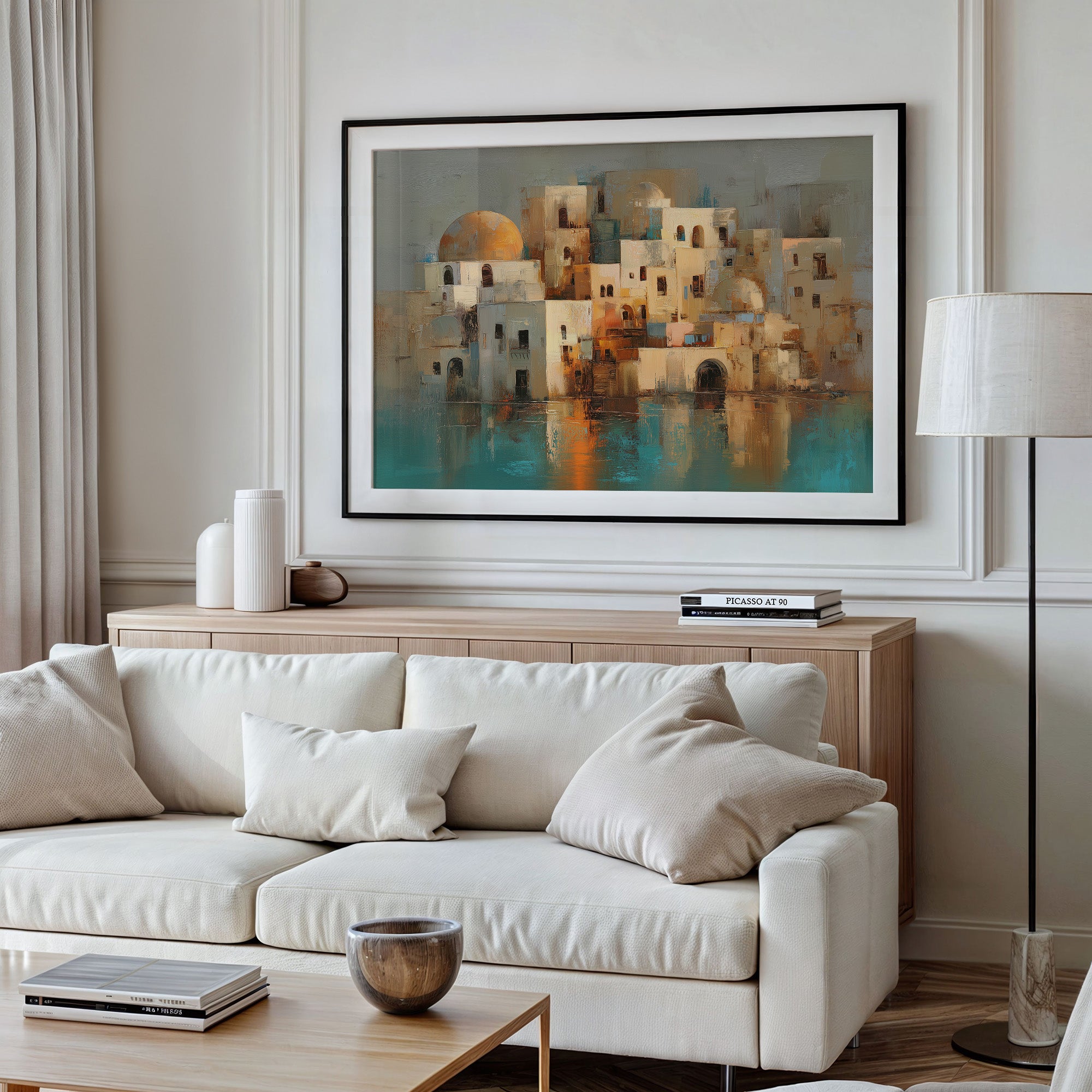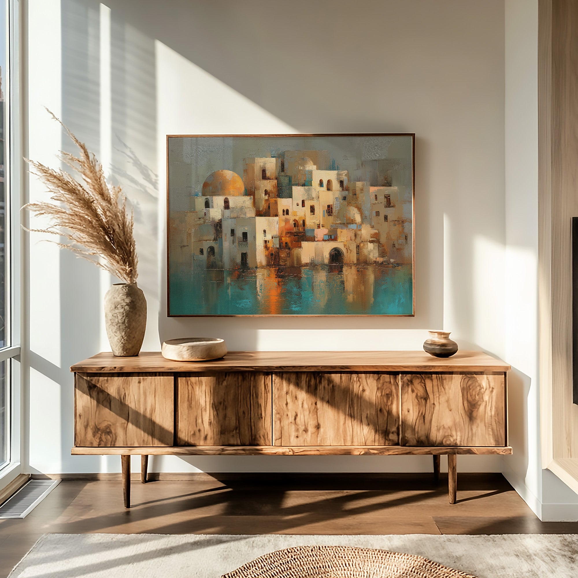 This captivating contemporary painting depicts a Mediterranean village with distinctive white cubic architecture and rounded domes, reminiscent of Santorini or coastal Middle Eastern settlements. The artist employs a warm palette of cream, terracotta, and soft oranges for the buildings, creating a sun-kissed effect against a muted sage background. Teal and turquoise waters reflect the clustered structures, suggesting a coastal setting. The impressionistic brushwork gives the scene a dreamlike quality, with textured impasto technique adding depth and dimension. The composition balances architectural geometry with organic forms, while the reflections in the water create a harmonious symmetry that draws viewers into this serene, timeless Mediterranean landscape.