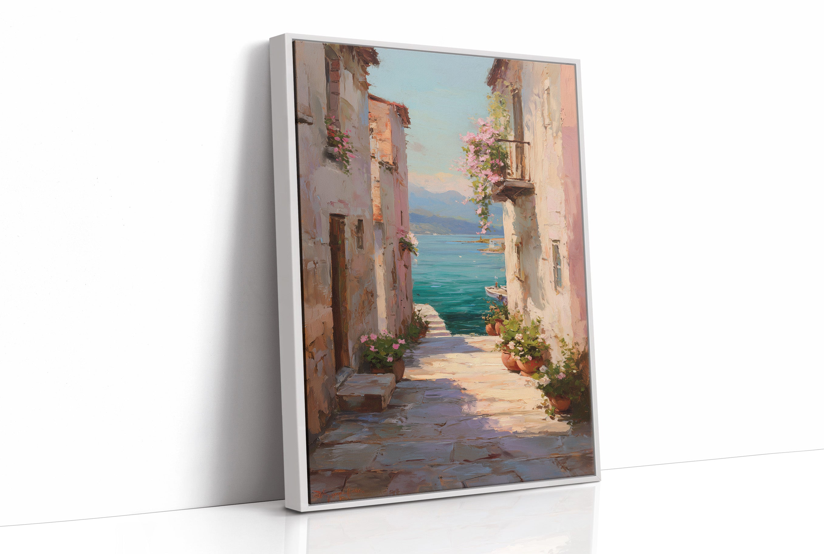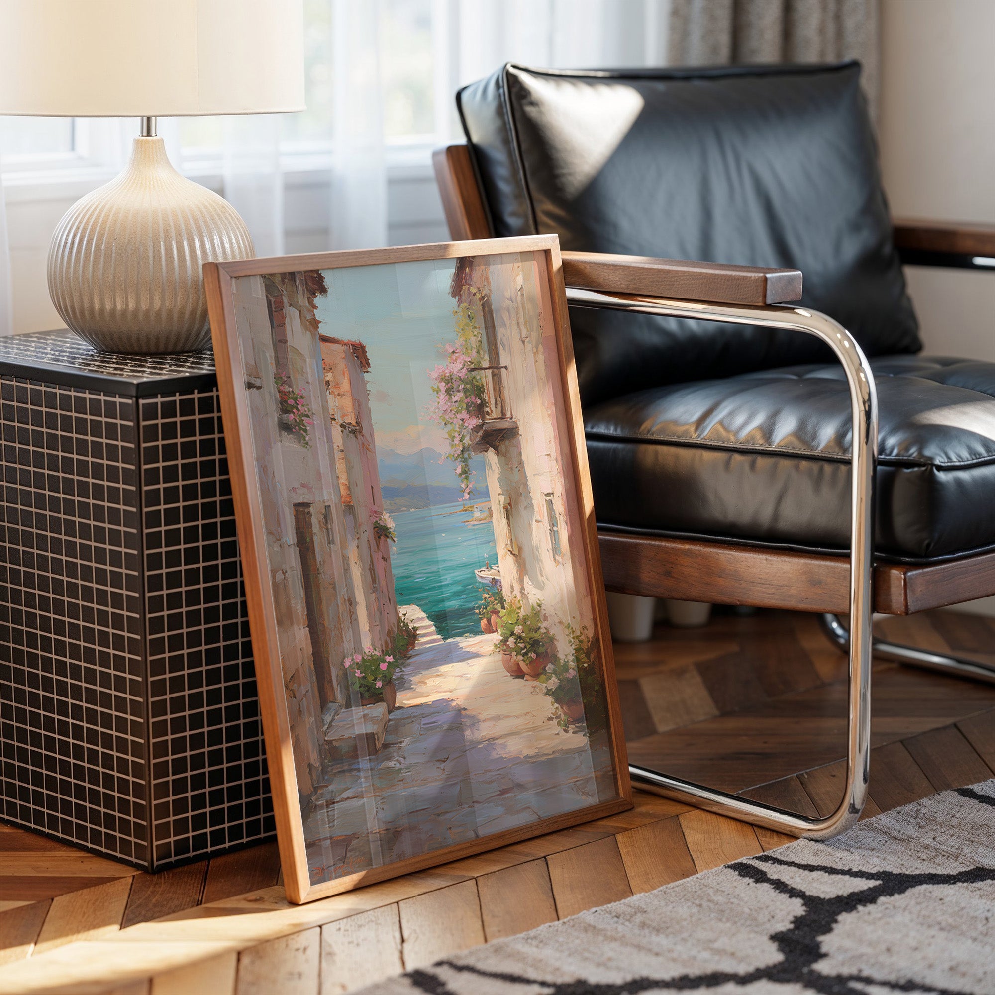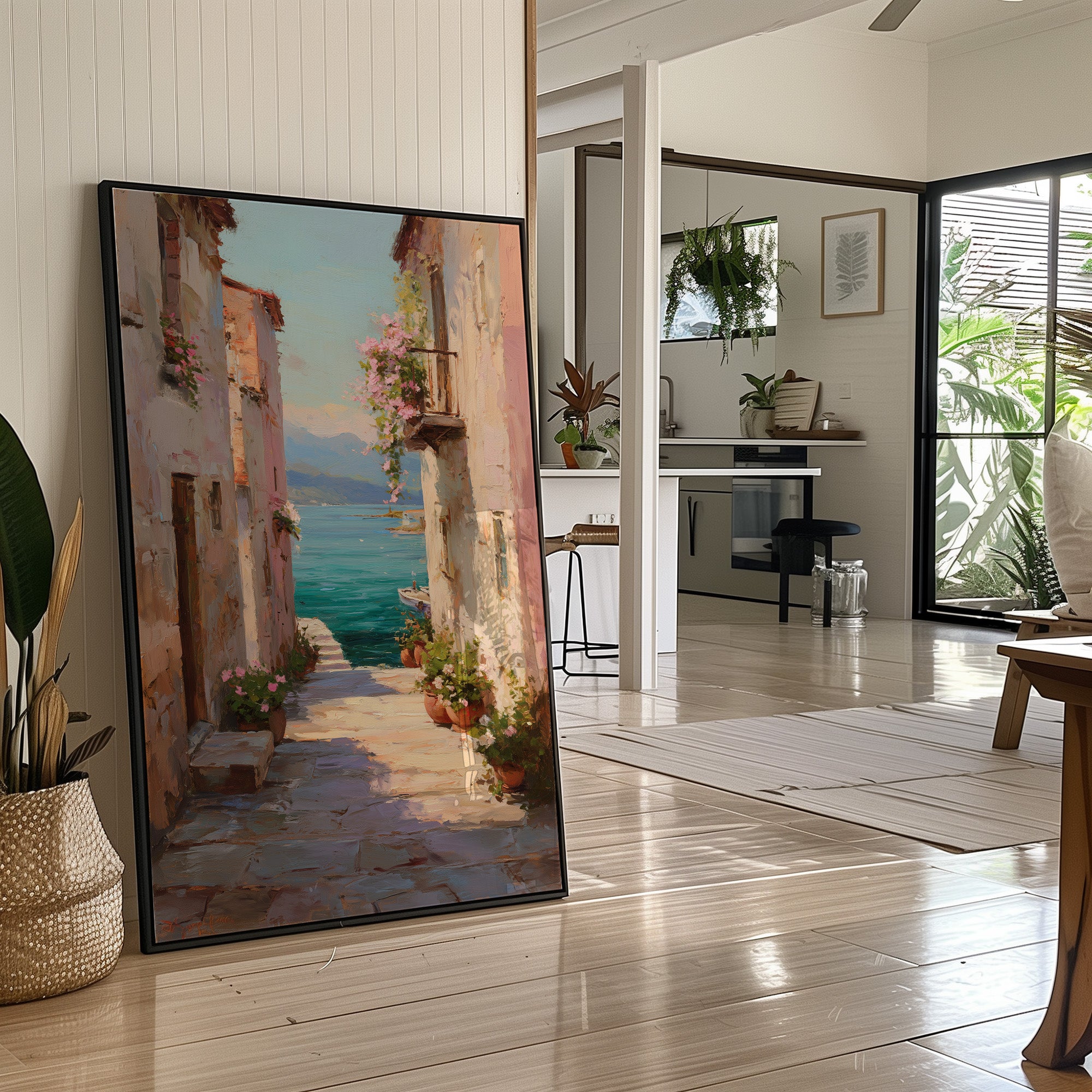 A captivating canvas painting against its wooden The narrow stone passage between blush-colored buildings leads the eye toward a brilliant turquoise sea. Climbing bougainvillea adorns balconies and walls, adding splashes of pink to the warm palette. Terracotta pots with flowering plants line the pathway, while distant mountains create a serene backdrop.