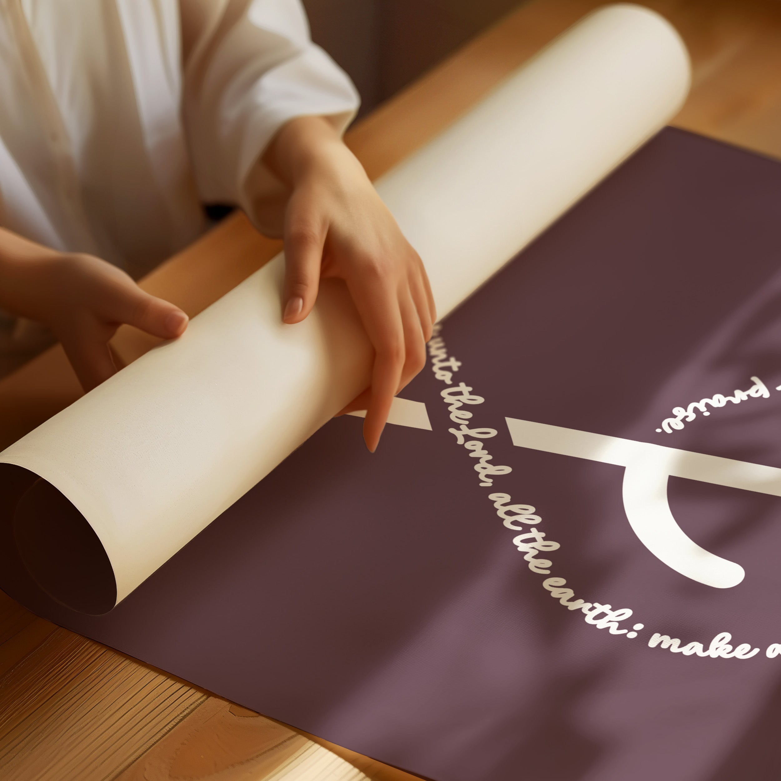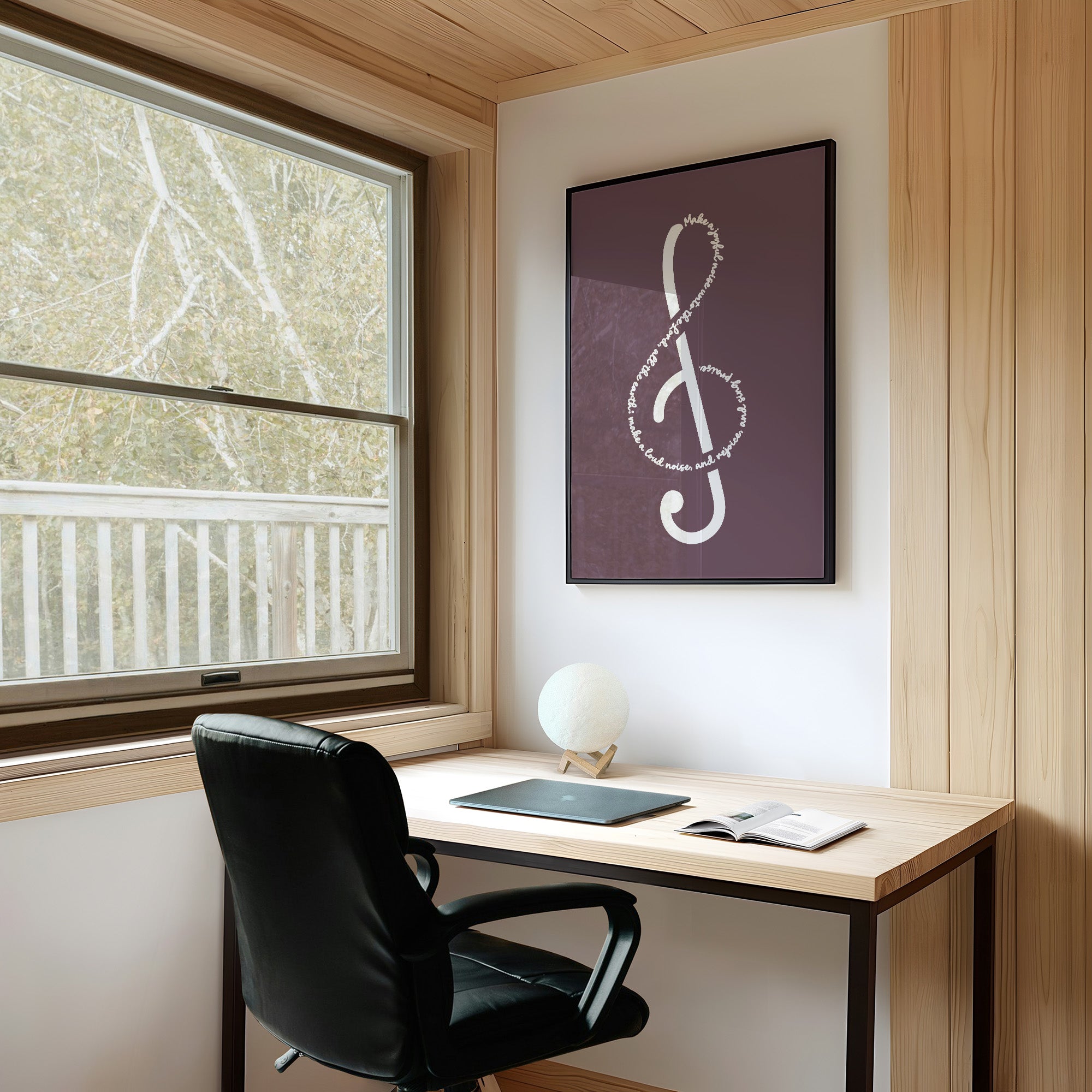 A musical note flows gracefully against a muted plum backdrop, carrying words of inspiration along its elegant curves. The white typography dances around the treble clef, inviting viewers to pause and consider the relationship between sound and meaning. The contrast of the crisp white against the rich purple creates a contemplative atmosphere that speaks to both musicians and dreamers alike. This piece would bring a thoughtful artistic touch to a music room, creative studio, or any space where inspiration is welcomed. Its minimalist design with profound meaning makes it a versatile addition to contemporary interiors.