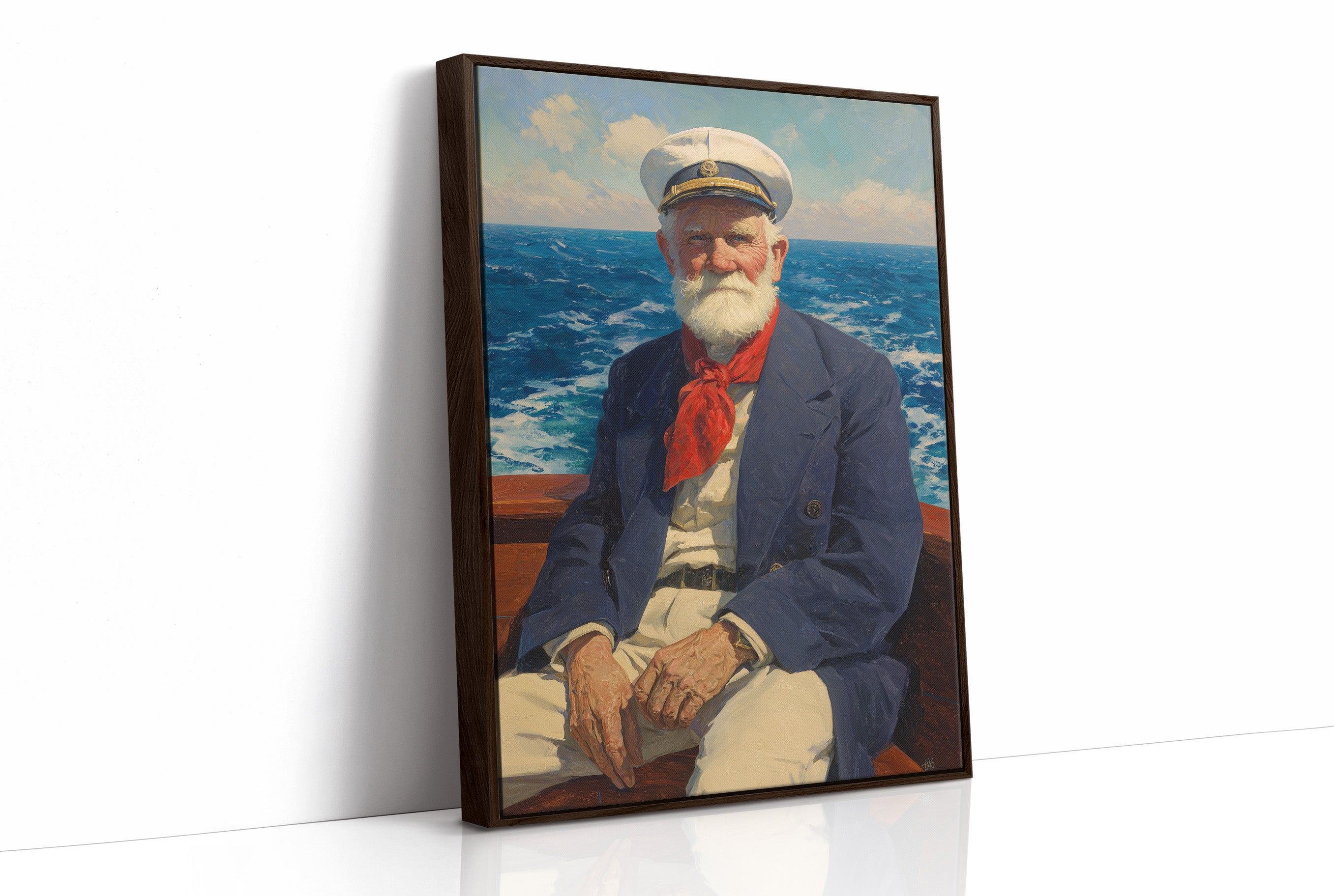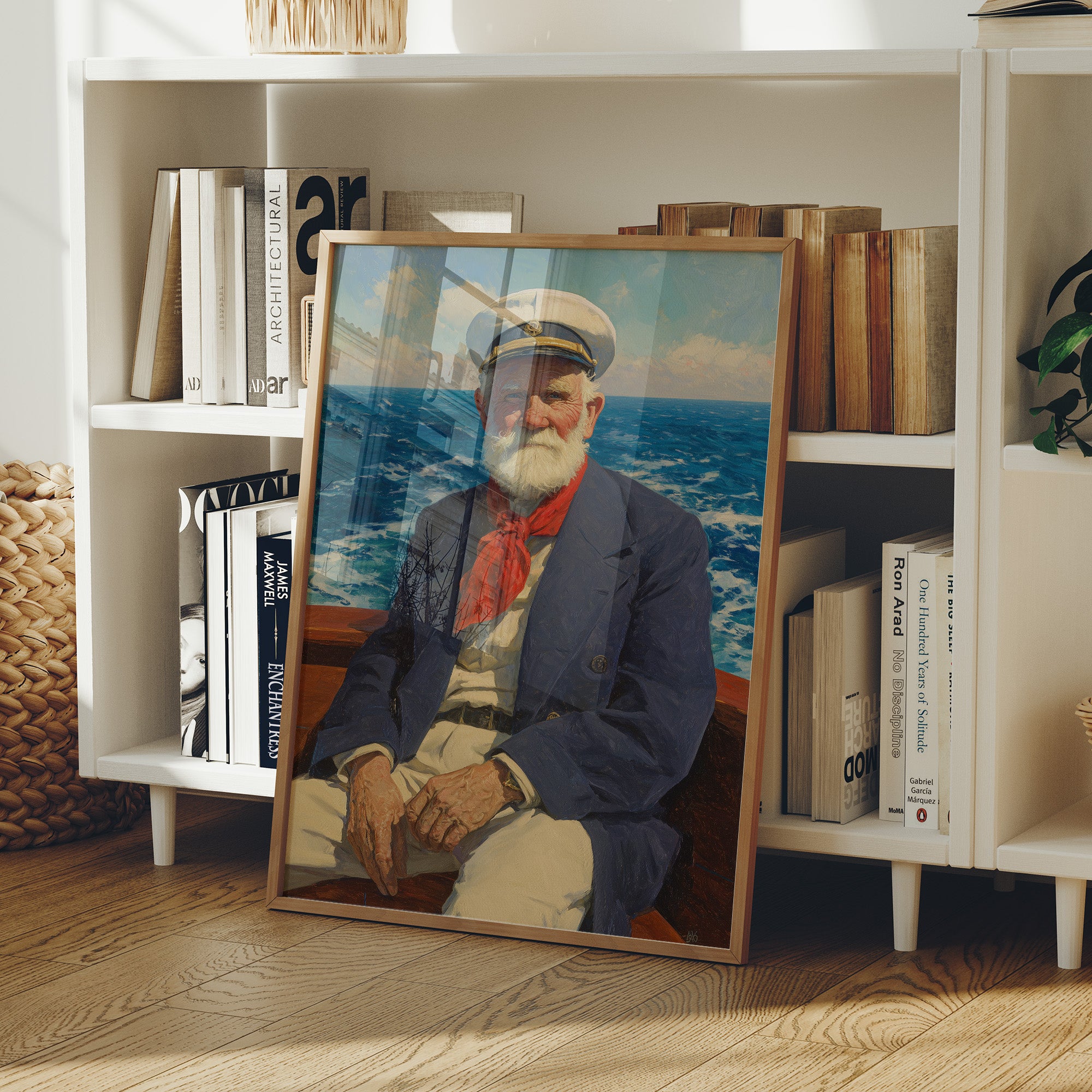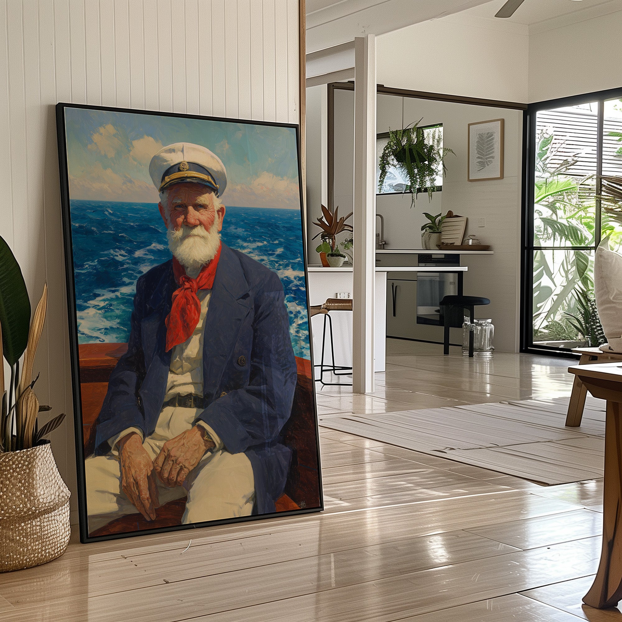 Sunlight streams across a modern living space, illuminating a nautical portrait that tells tales of distant horizons. The painting features a seasoned captain with weathered hands and a distinguished white beard, his navy uniform and bright red neckerchief standing in proud contrast against the azure sea behind him. The warm wooden frame complements the contemporary setting, where sleek leather meets natural textures.