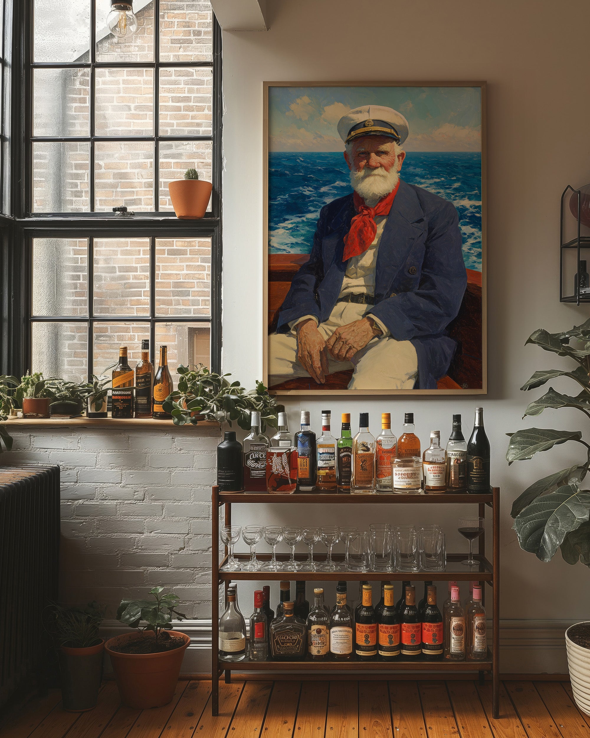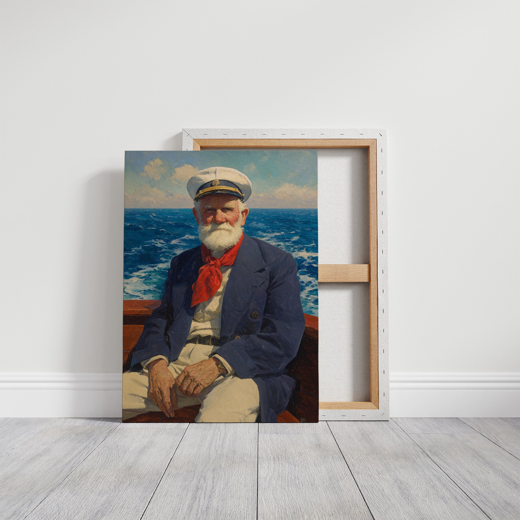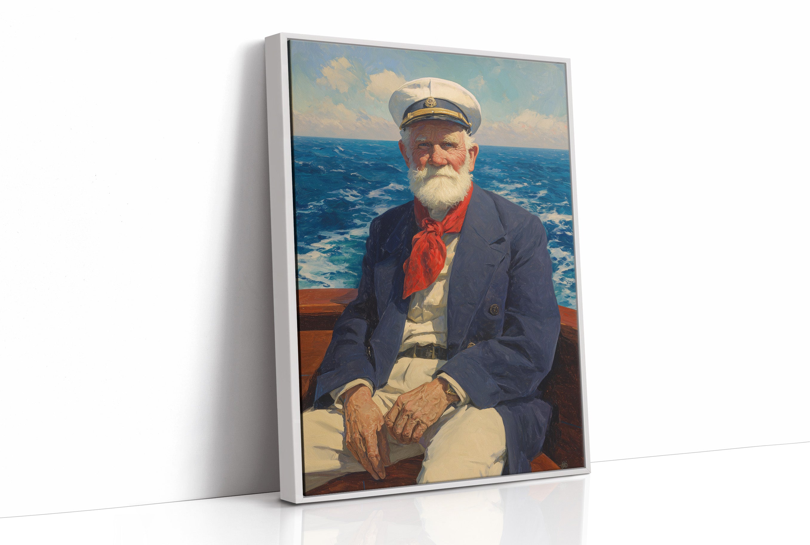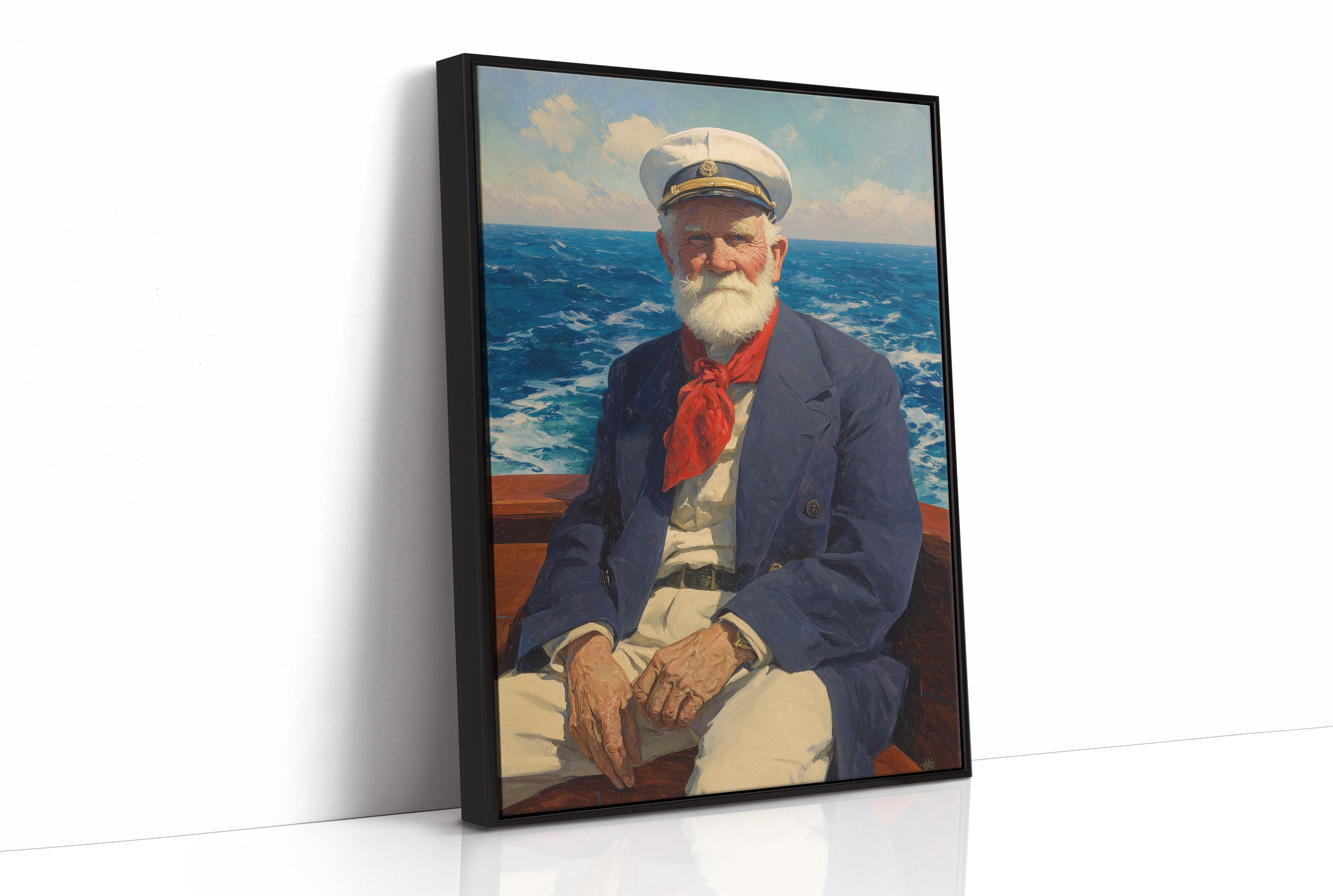 Sunlight streams across a modern living space, illuminating a nautical portrait that tells tales of distant horizons. The painting features a seasoned captain with weathered hands and a distinguished white beard, his navy uniform and bright red neckerchief standing in proud contrast against the azure sea behind him. The warm wooden frame complements the contemporary setting, where sleek leather meets natural textures.