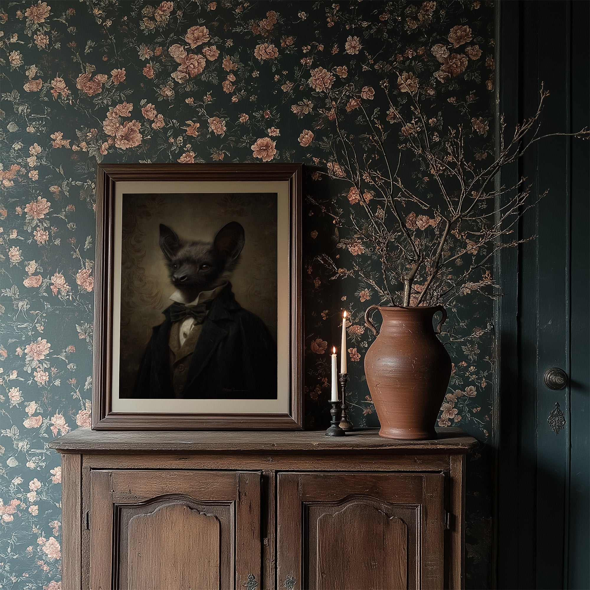 A haunting elegance emanates from this vintage-inspired portrait of a fox dressed in formal Victorian attire. The sepia tones and delicate brushwork create an aristocratic presence against the textured background, merging wilderness with refinement through the contrast of sharp ears and tailored bow tie. This sophisticated piece of anthropomorphic art stands boldly against a dramatic black wall, casting subtle shadows across herringbone floors.