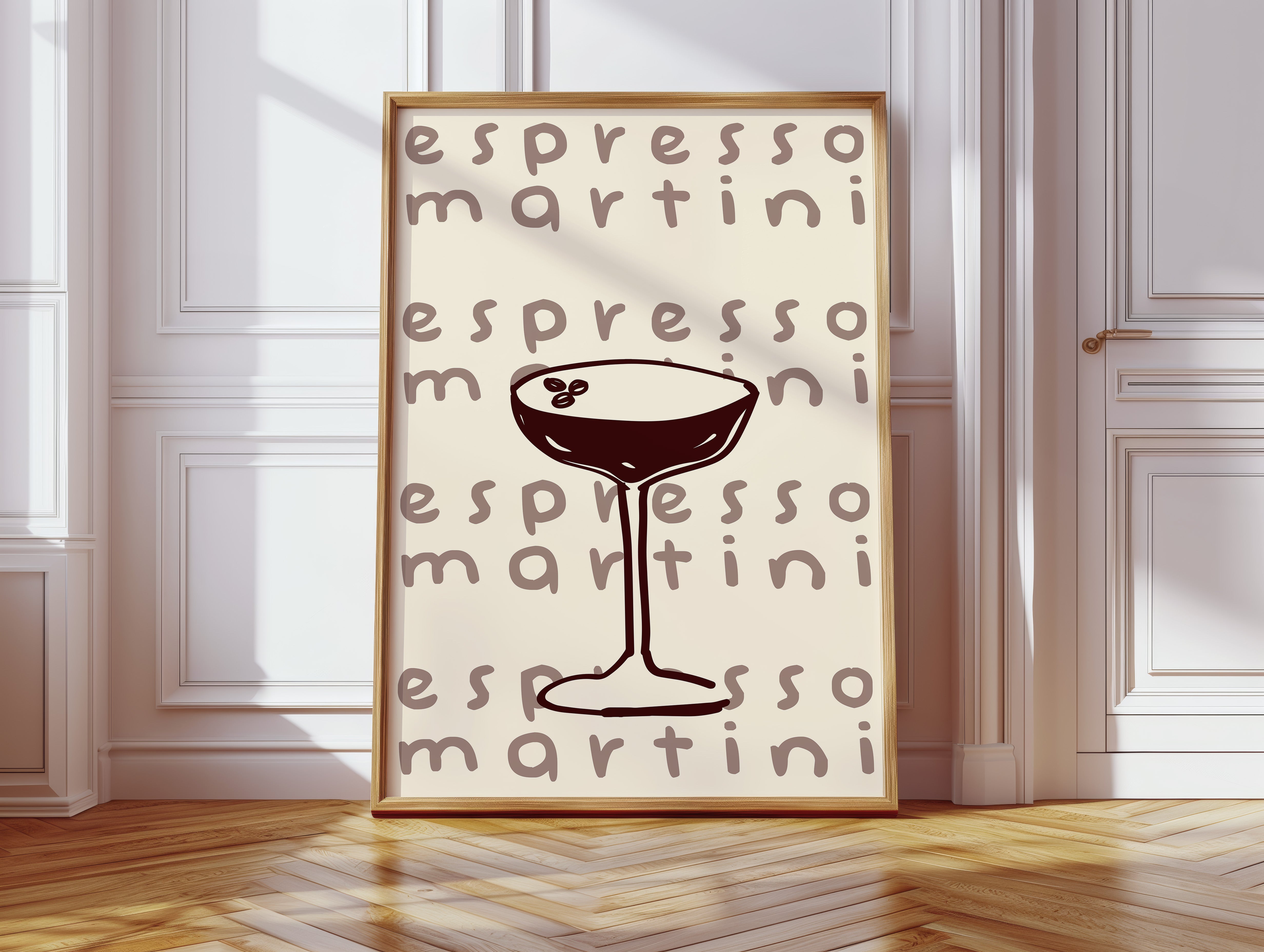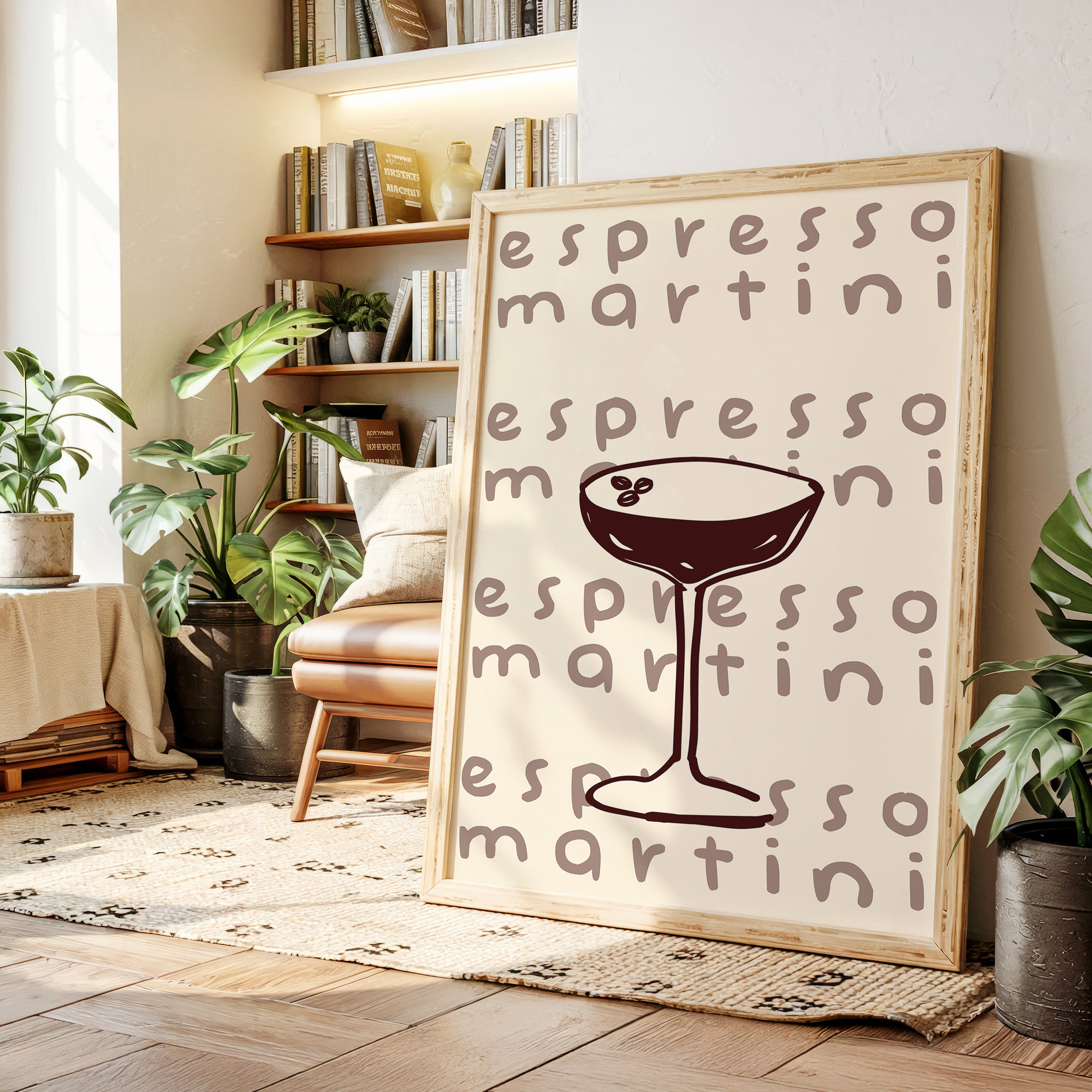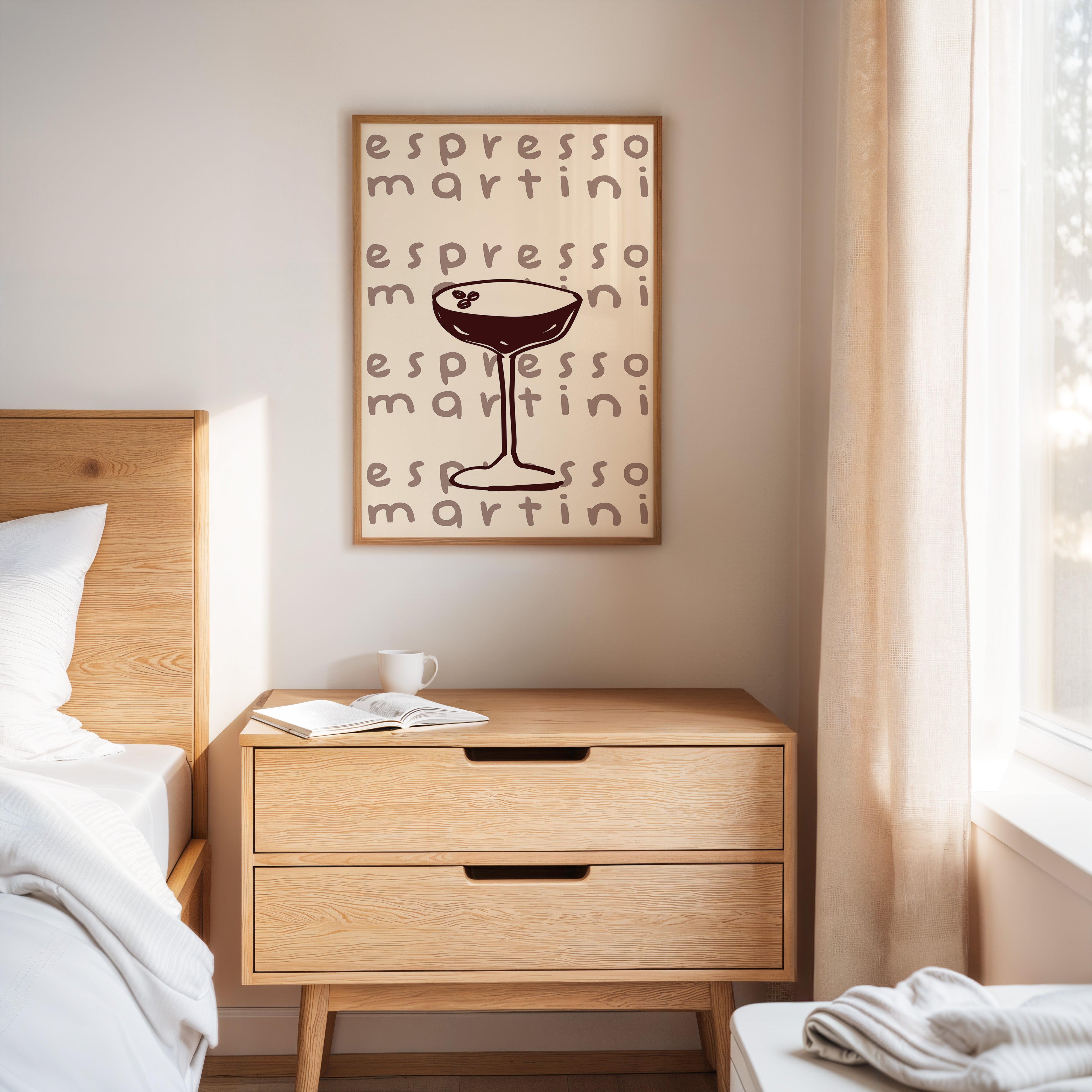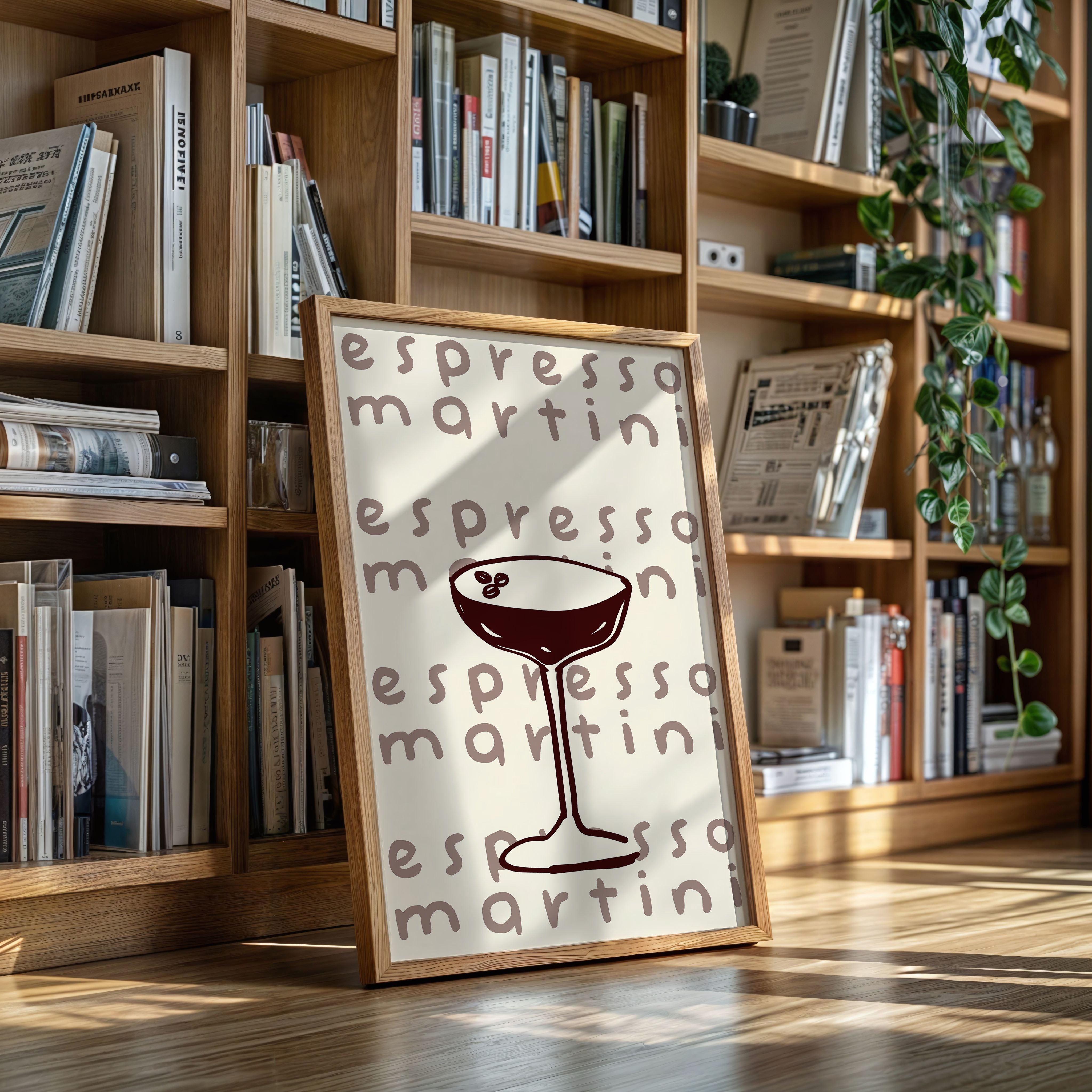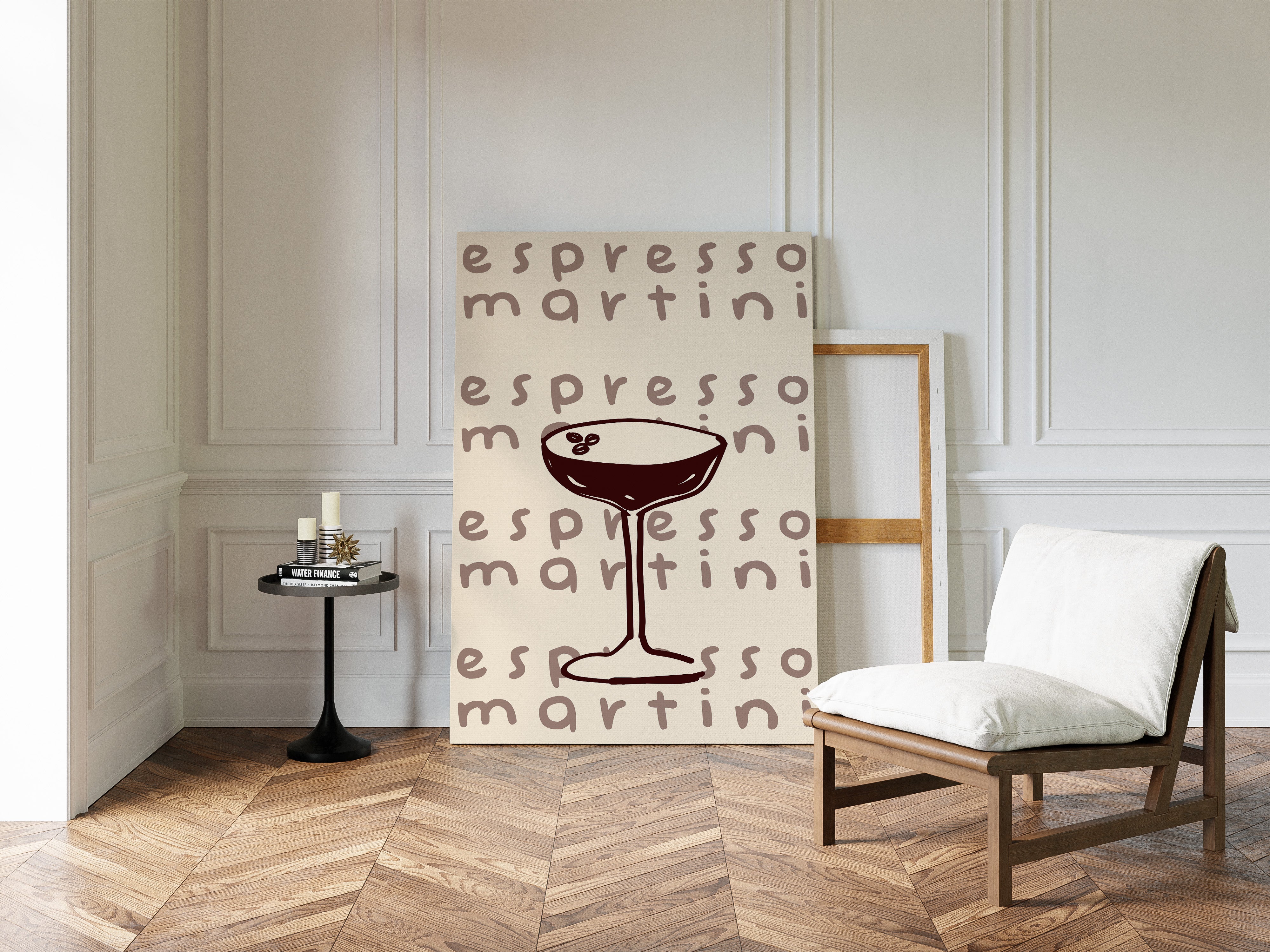 The elegant simplicity of coffee meets cocktail culture in this playful fusion of caffeine and sophistication. Part of our Contemporary collection, this piece celebrates the artful intersection of day and night rituals. The clean lines of the martini glass cradle floating espresso beans against a backdrop of repeating text, creating a rhythmic pattern that speaks to both the buzz of a cafe and the hum of an evening lounge. Warm mocha tones and creamy neutrals blend in perfect harmony, suggesting both comfort and refinement. This piece brings character to a modern kitchen, coffee nook, or home bar area where it can inspire both morning meditation and evening conversation.