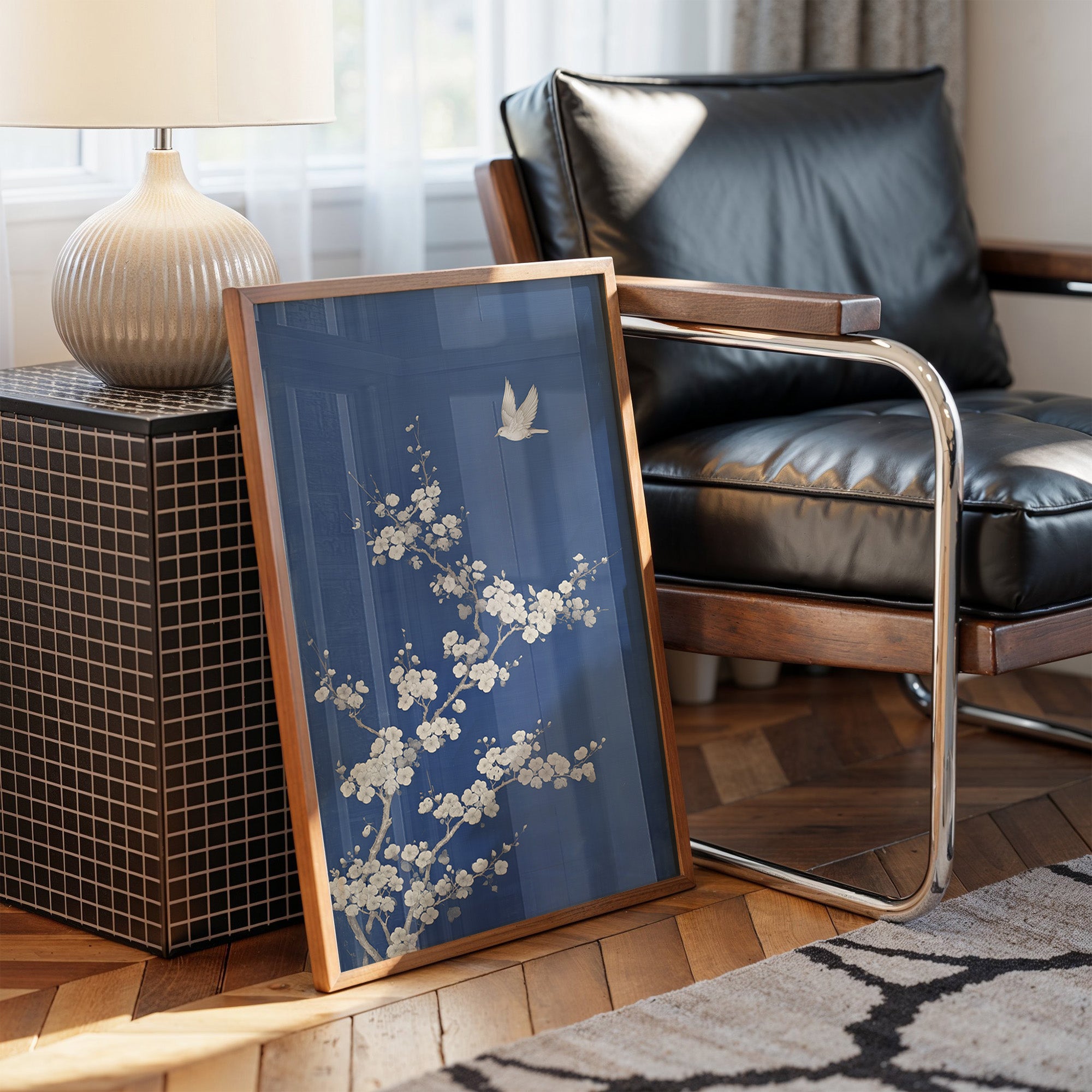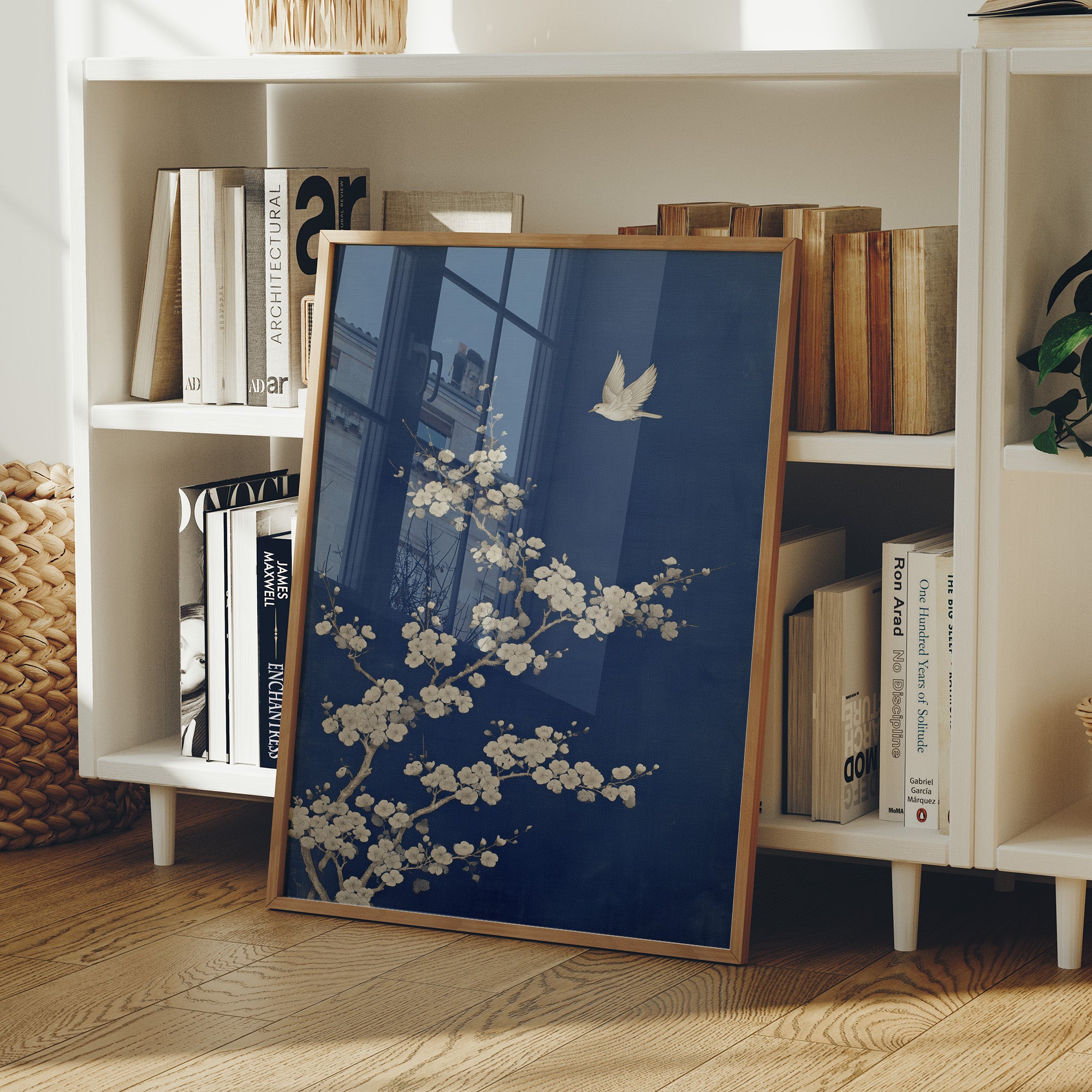 Against a deep indigo canvas, delicate cherry blossoms reach skyward like pale stars scattered across a winter night. The graceful branches create an ethereal dance with a white dove in flight, capturing a moment of perfect serenity in traditional Japanese aesthetics. The composition balances strength and delicacy through the interplay of light blooms against the rich navy background, creating a sophisticated meditation on nature's quiet poetry. This piece would bring serene elegance to a reading nook or meditation space, where its calming presence can inspire moments of peaceful contemplation.