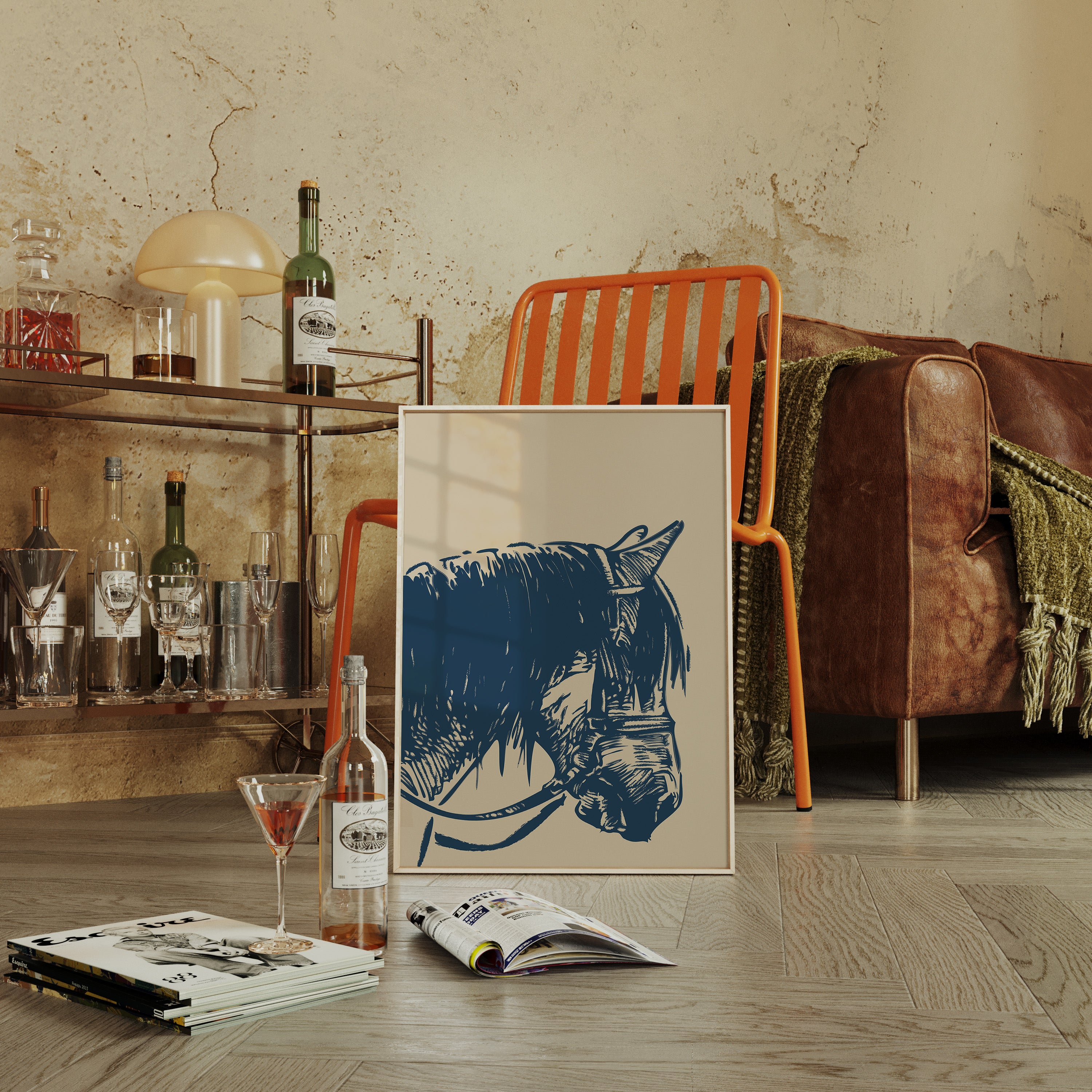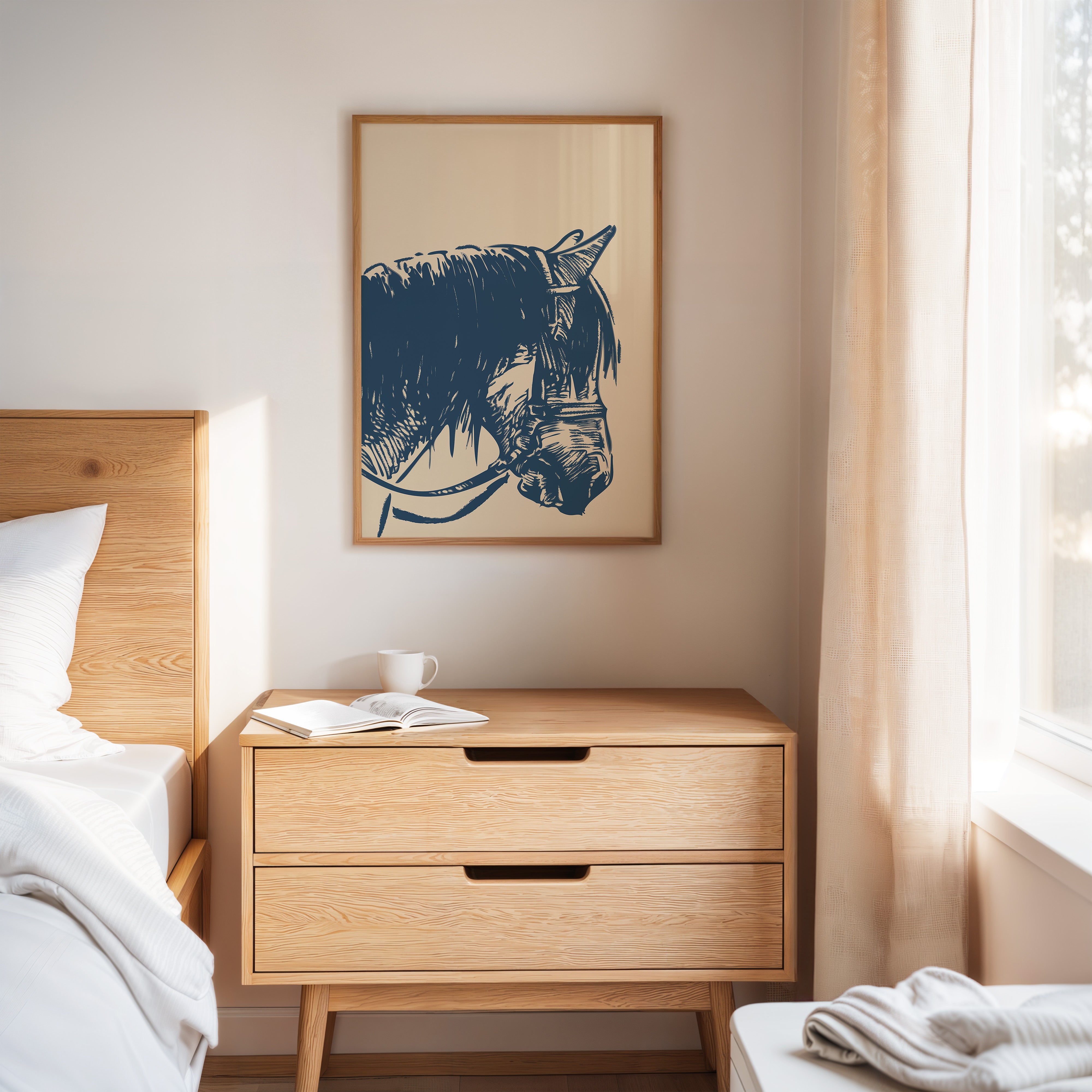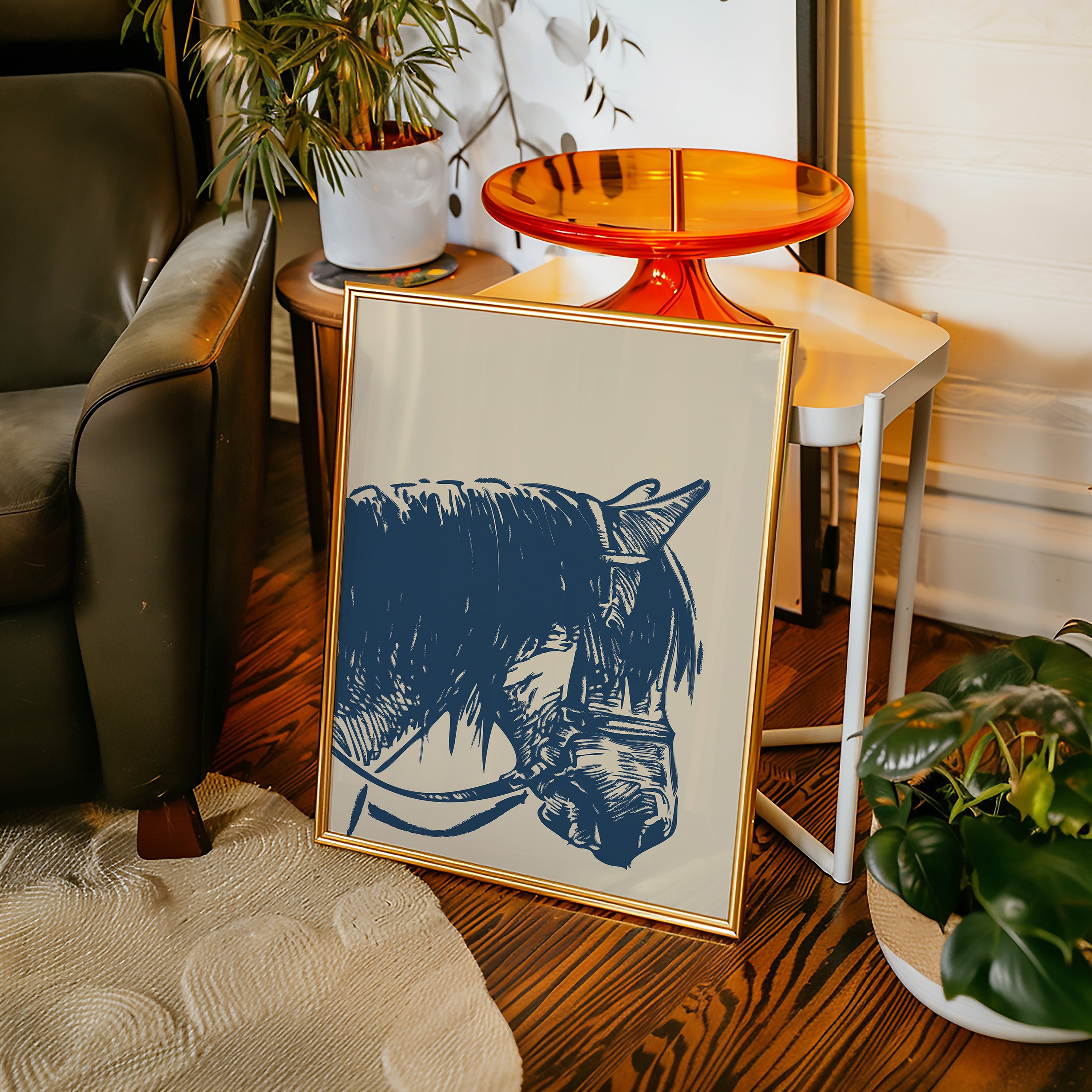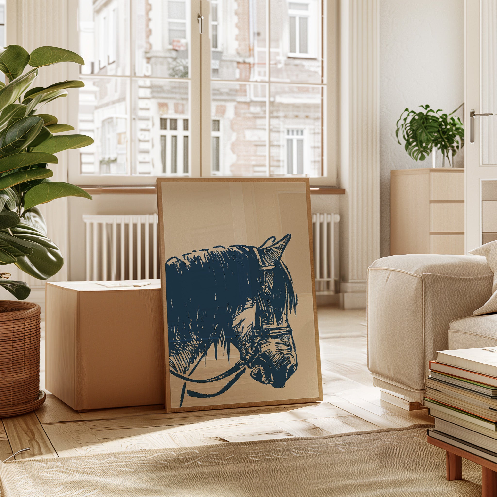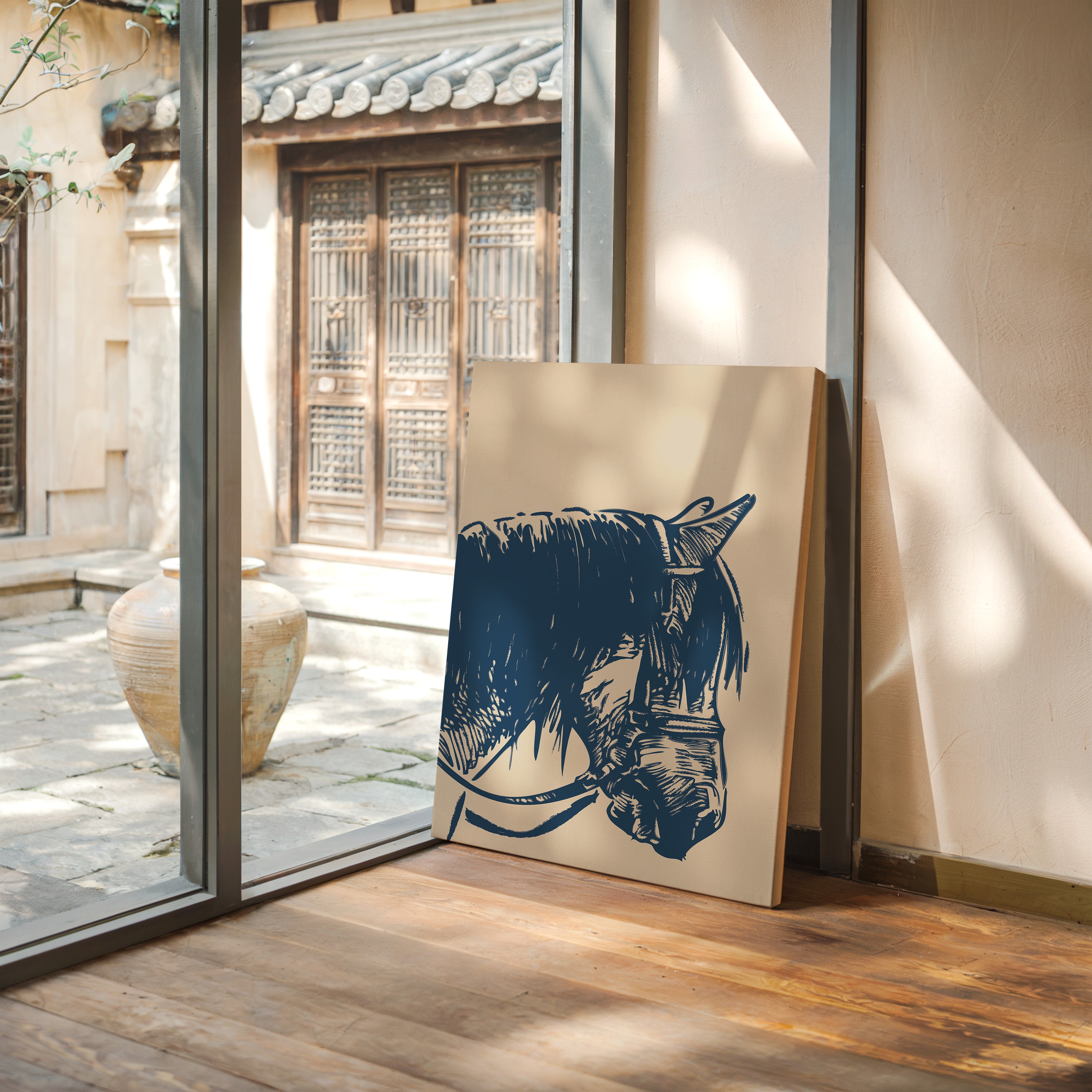 Morning light streams across weathered floorboards, illuminating a powerful equine portrait rendered in deep navy against cream. This striking piece from our Contemporary collection masterfully balances modern minimalism with timeless subject matter. The horse's profile emerges through bold brushstrokes and dynamic linework, capturing both strength and serenity in its simplified form. The interplay of light and shadow creates a contemplative atmosphere, while the monochromatic palette speaks to sophistication and restraint. Perfect for adding a touch of refined rusticity to a modern farmhouse living room or bringing equestrian elegance to a sophisticated study. The piece invites quiet moments of reflection while making a confident artistic statement.