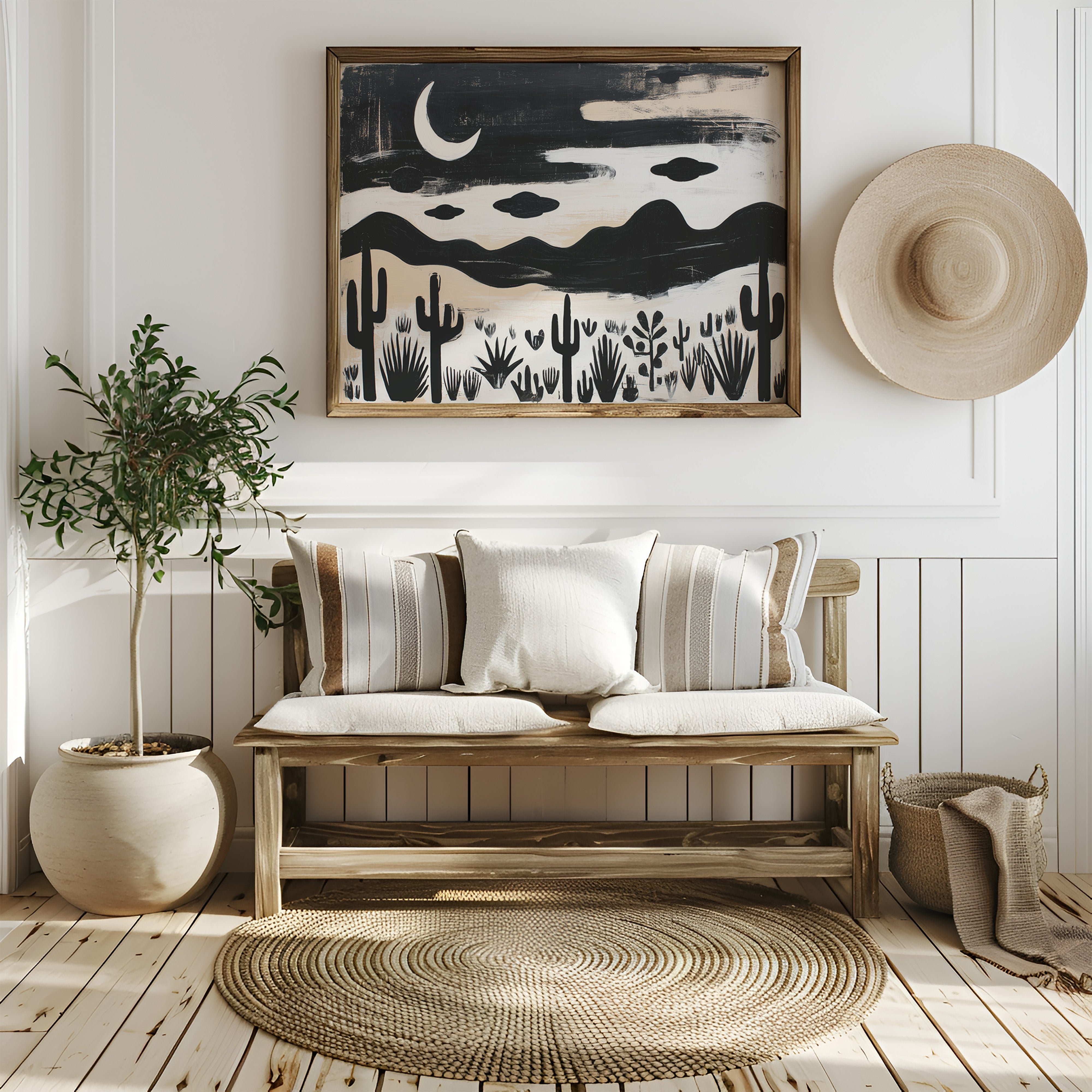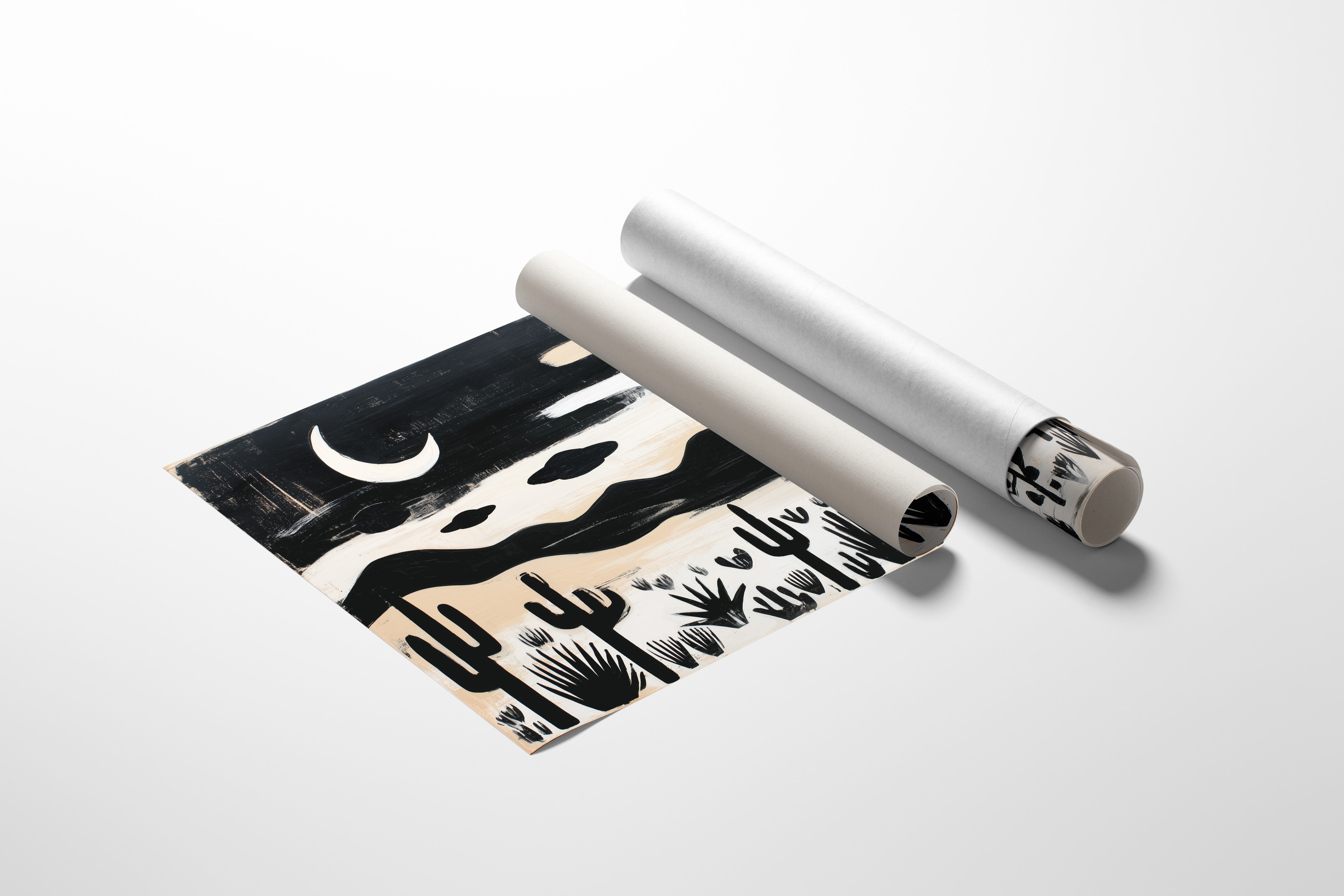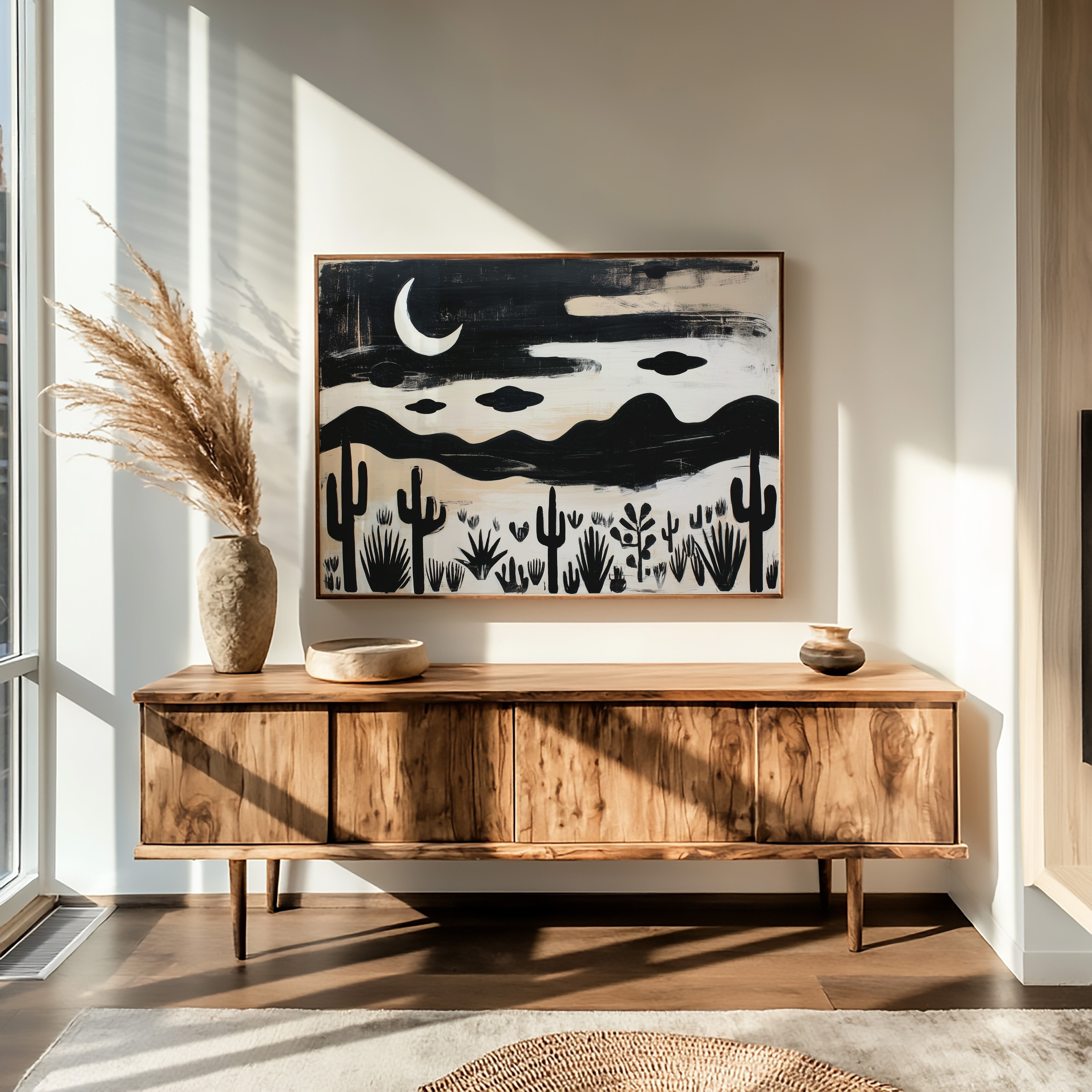 A crescent moon hangs like a silver pendant above a stark desert landscape rendered in dramatic black and white. Bold silhouettes of saguaro cacti and desert flora create a rhythmic pattern across the foreground, their forms reaching upward like nature's sentinels. The composition balances stark contrasts with gentle curves - from the sweeping mountain ranges to the scattered clouds drifting across the night sky. Perfect for modern spaces seeking to capture the mystical energy of the American Southwest.