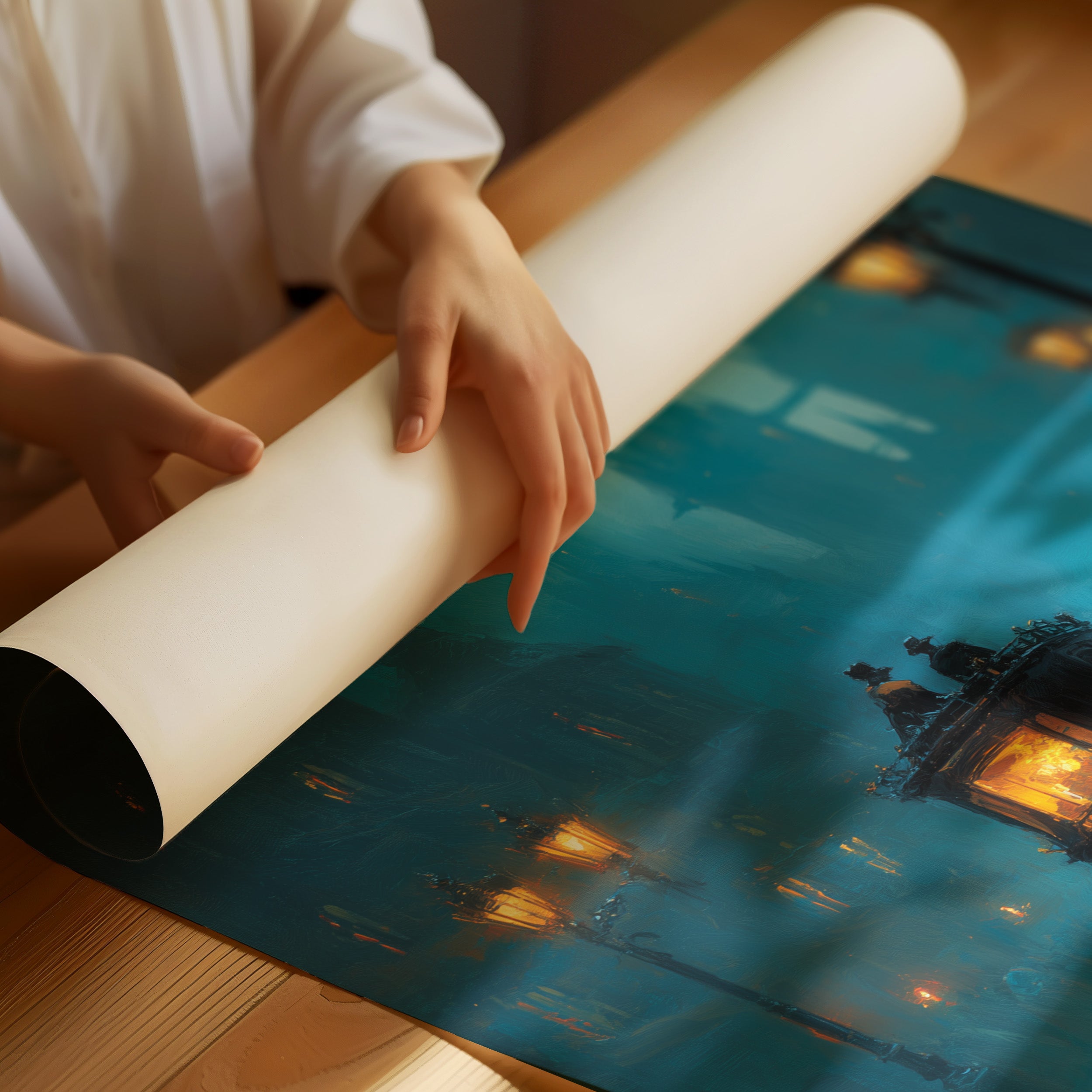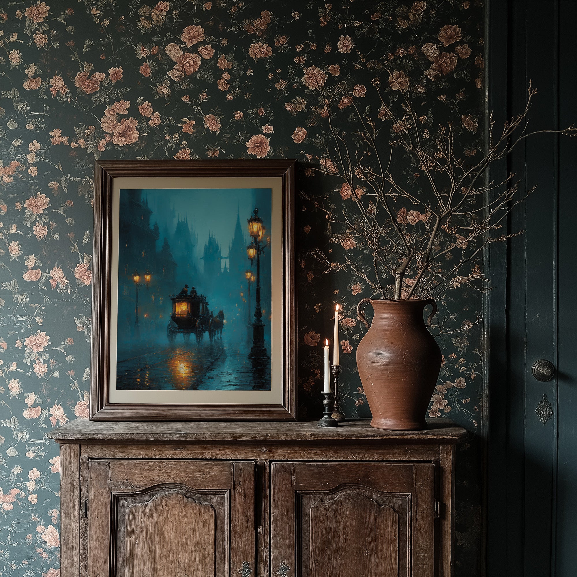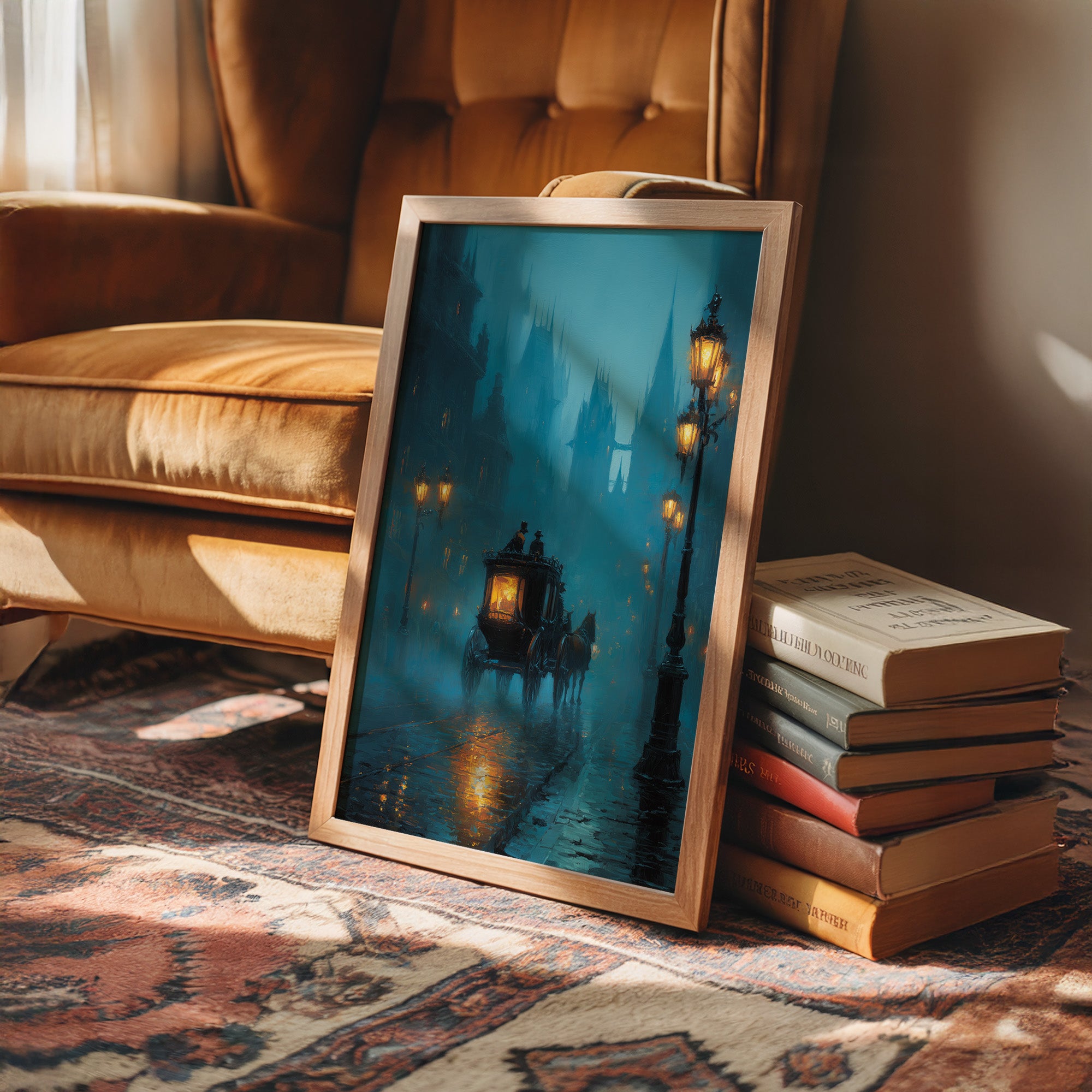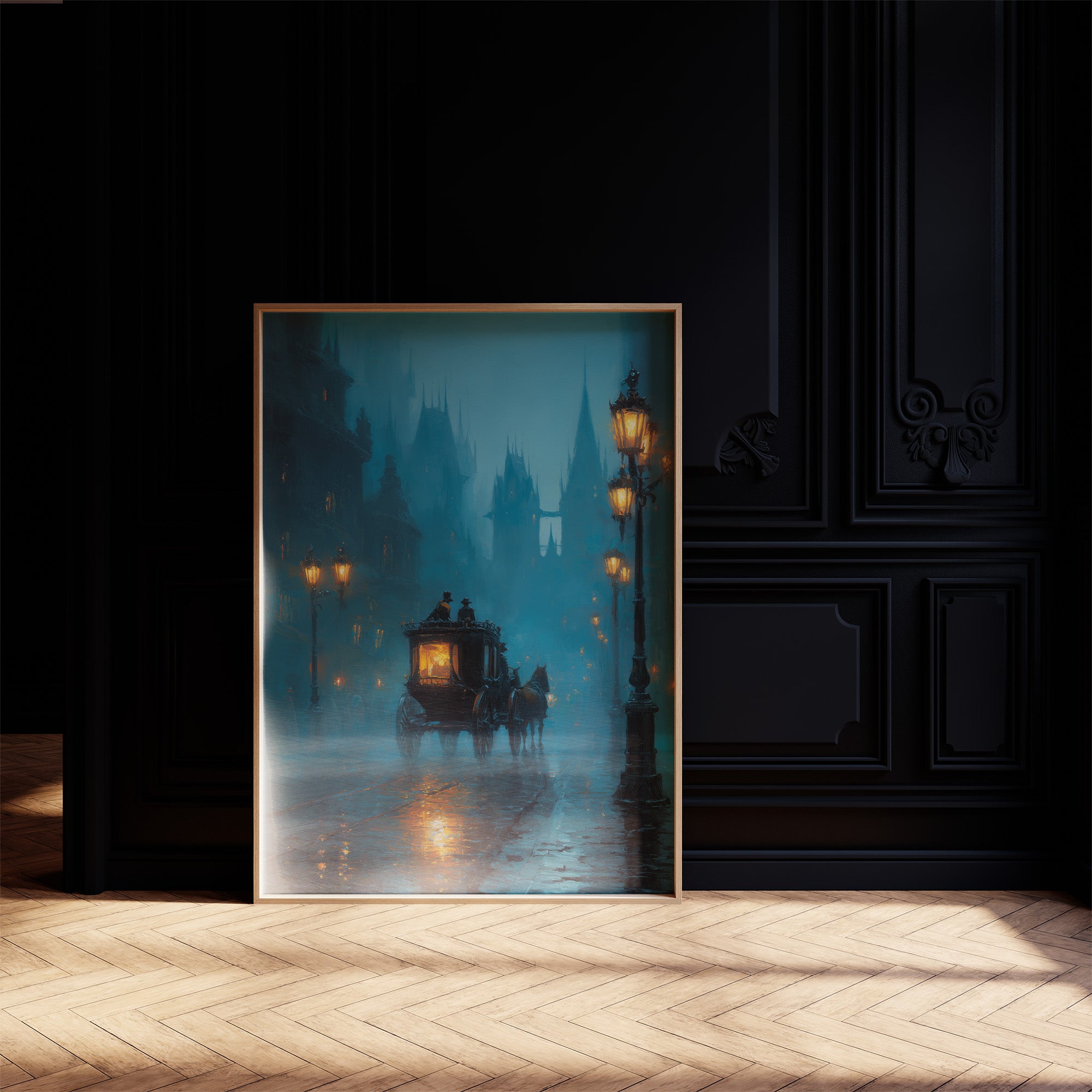 A solitary carriage emerges from the mist, its lanterns casting warm golden reflections across rain-slicked cobblestones. The teal-blue fog envelops gothic spires and distant architecture, creating a dreamlike boundary between the known and mysterious. Street lamps stand sentinel along the path, their amber glow punctuating the hazy atmosphere while silhouetted figures atop the carriage journey through this ethereal cityscape. This statement piece brings dramatic depth and storytelling to dining rooms or studies, where its moody palette can anchor a space with timeless intrigue.