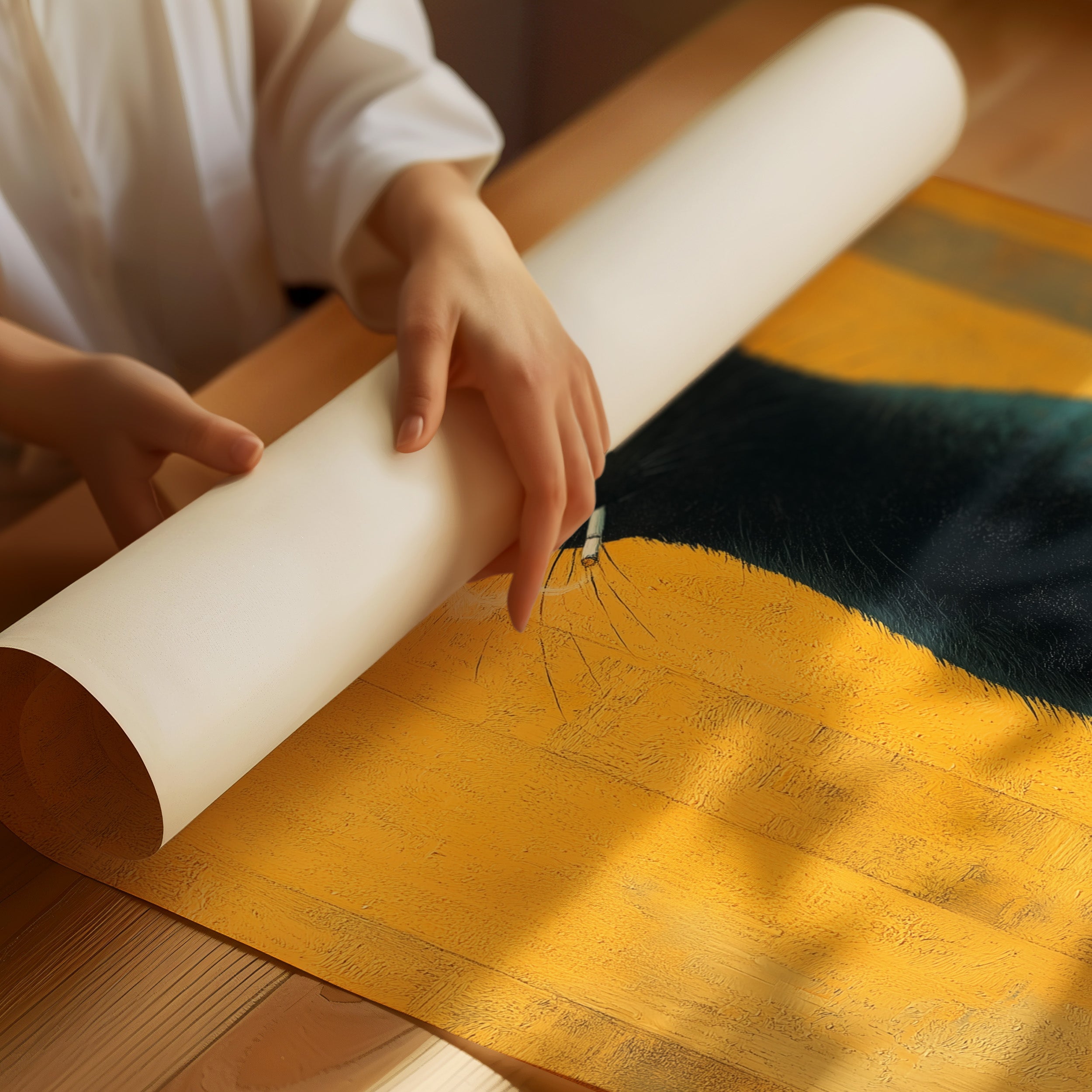 A sleek black cat commands attention against a luminous golden background, its piercing yellow eyes holding secrets of the night. The bold contrast between the cat's dark silhouette and the warm ochre backdrop creates a striking visual statement, while textured brushstrokes add depth and mystery. This contemporary interpretation merges Japanese artistic influence with modern minimalism, creating an atmosphere of quiet sophistication. Perfect for adding a touch of intrigue to a reading nook, home office, or any space where you want to create a conversation piece that balances both drama and serenity.