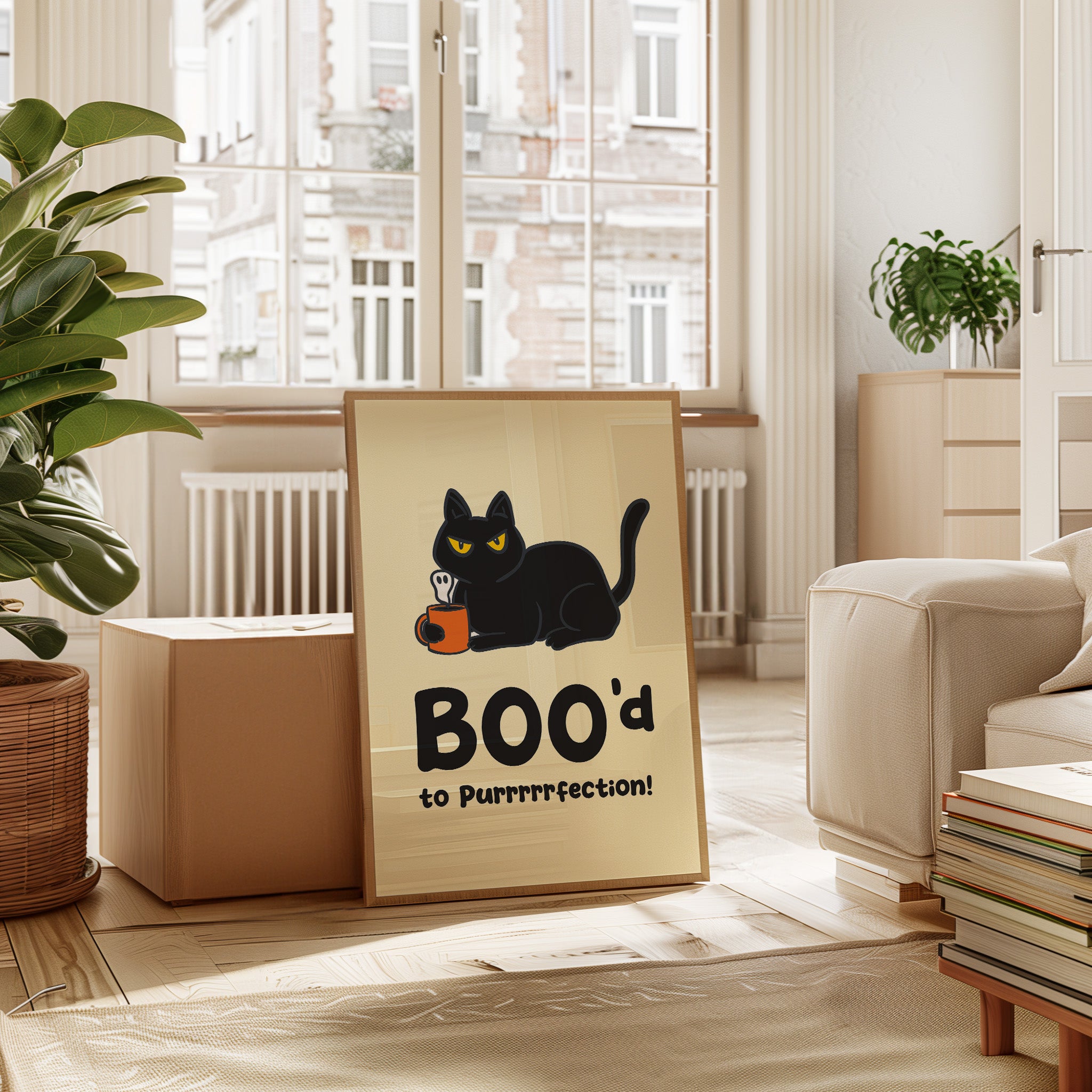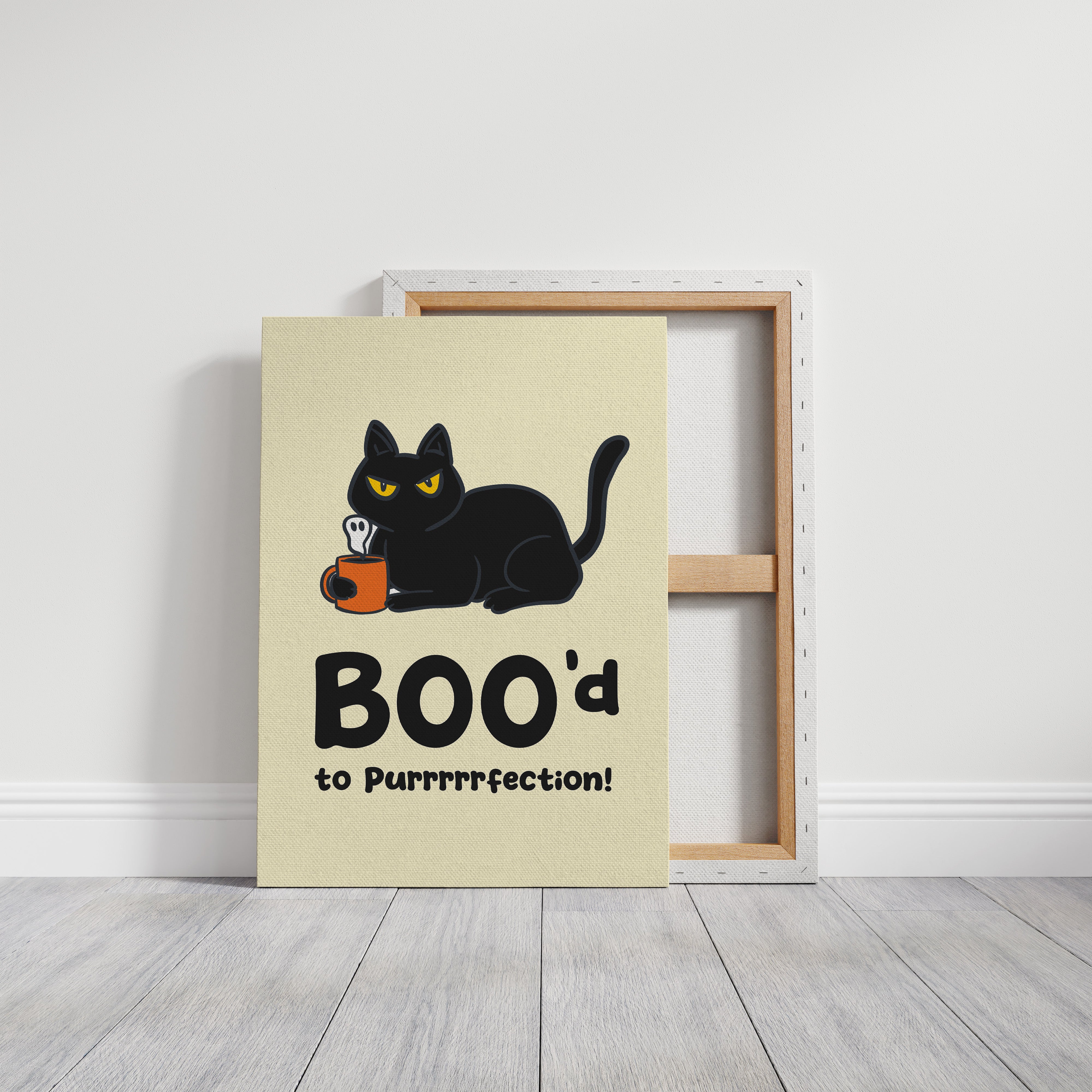 A sassy black cat lounges with an orange coffee mug, steam rising in ghostly wisps against a warm cream background. Part of our Contemporary Pop Culture collection, this piece blends whimsy with modern design sensibility. The bold typography and minimalist illustration style create a playful narrative, while the cat's piercing yellow eyes and confident pose add personality to the scene. Rich black shapes contrast beautifully with the orange accent, creating a striking yet balanced composition. This charming piece brings character to a kitchen nook, coffee station, or any space needing a touch of clever humor.
