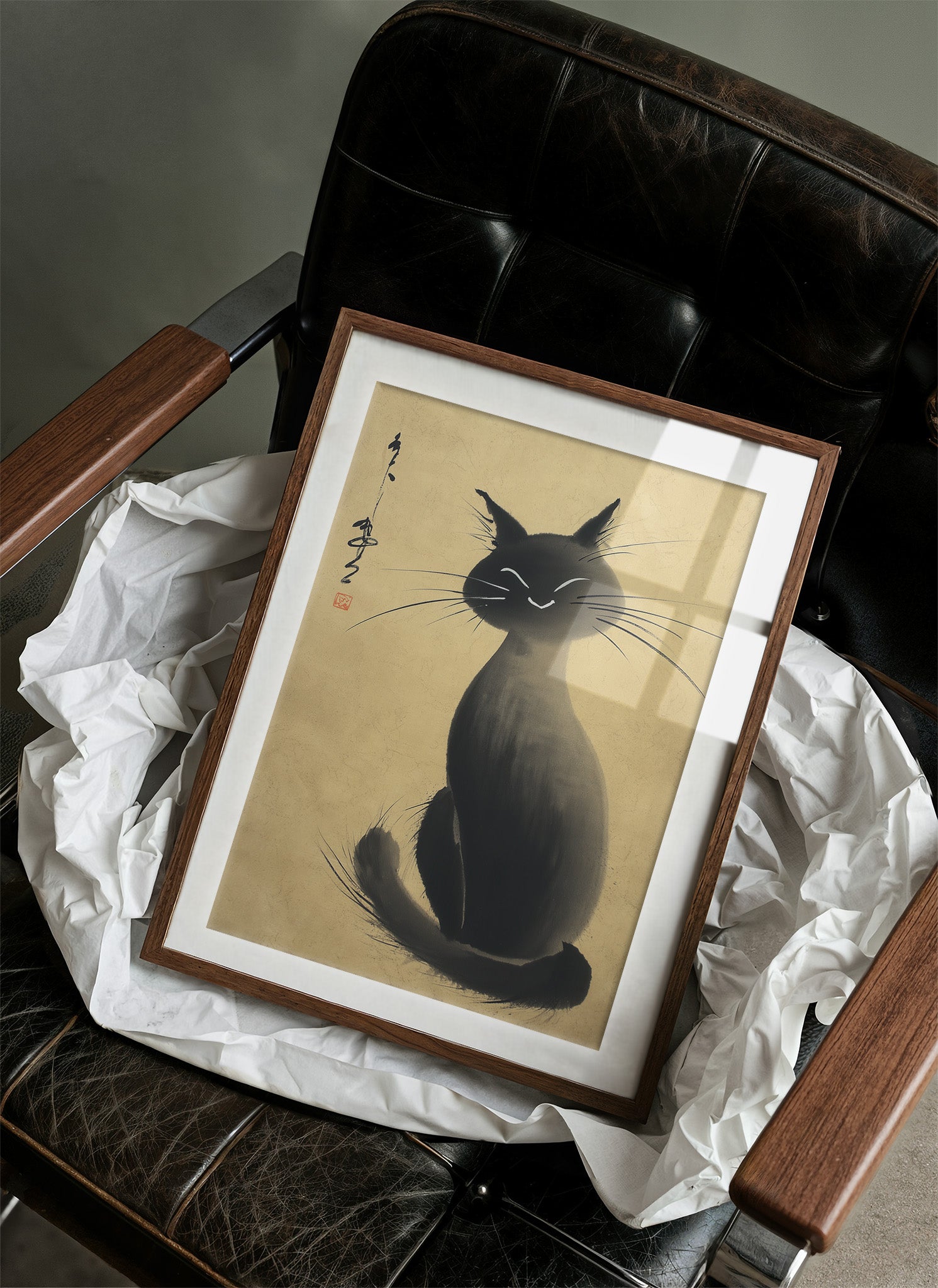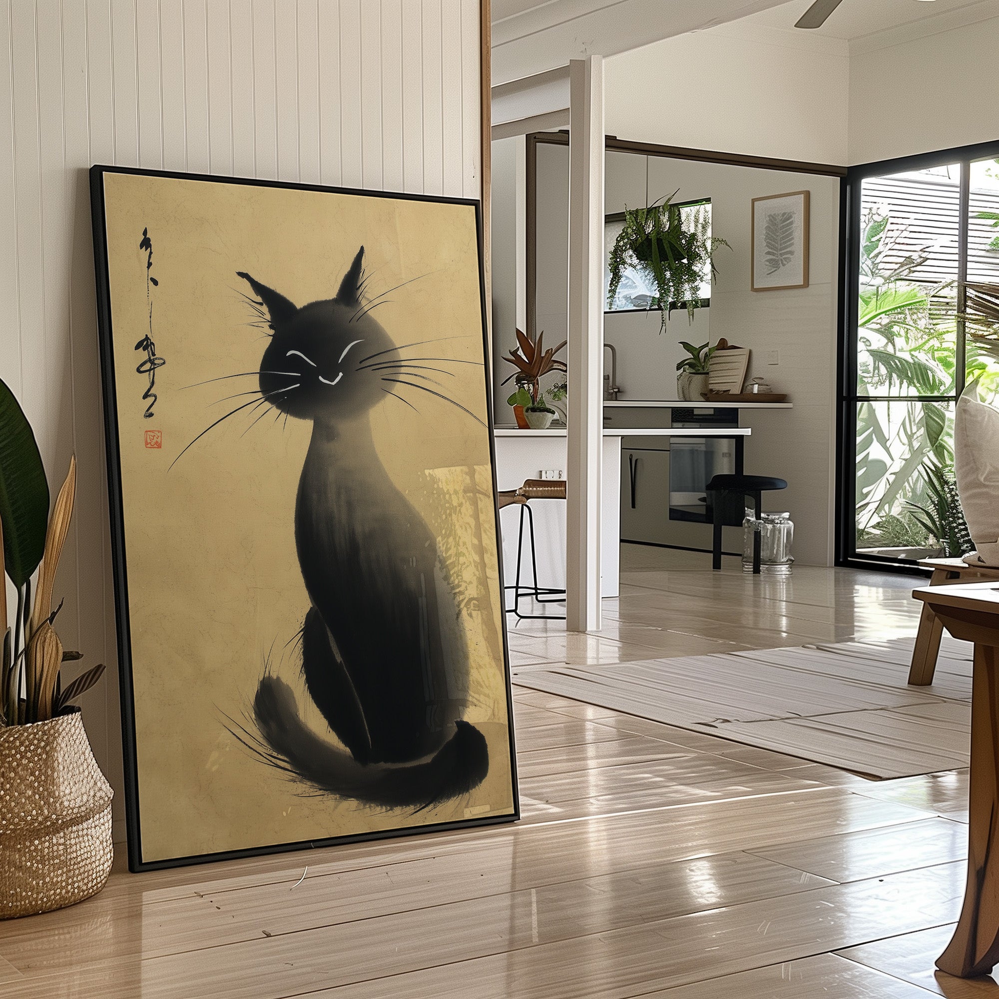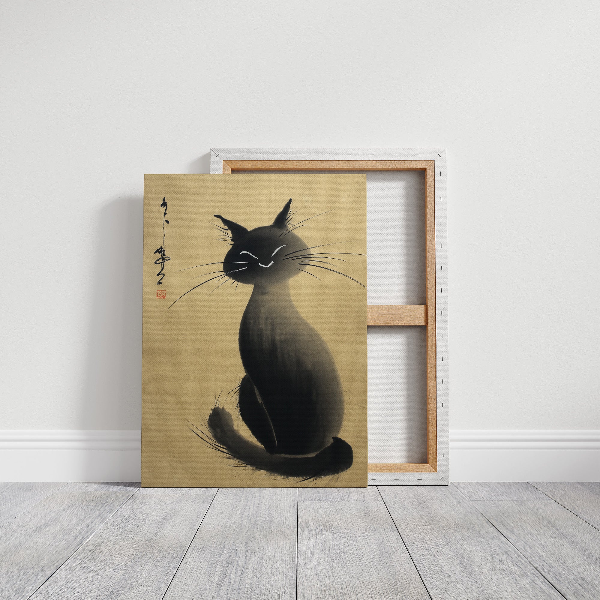 A serene moment captures the essence of feline grace in bold, minimalist strokes. The black cat's silhouette emerges from a warm golden background, its playful smile and distinctive whiskers creating an air of zen-like contentment. Traditional Asian brushwork meets contemporary design, with delicate calligraphy adding authentic character while the stark contrast creates dramatic impact. This piece would bring a perfect balance of whimsy and sophistication to a modern living room or meditation space.