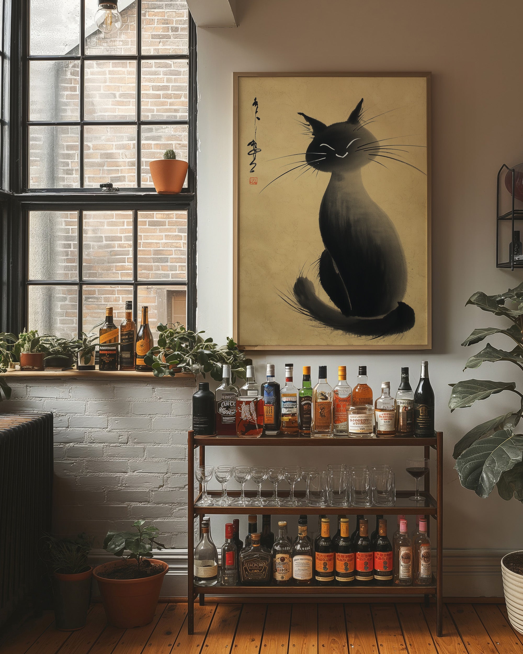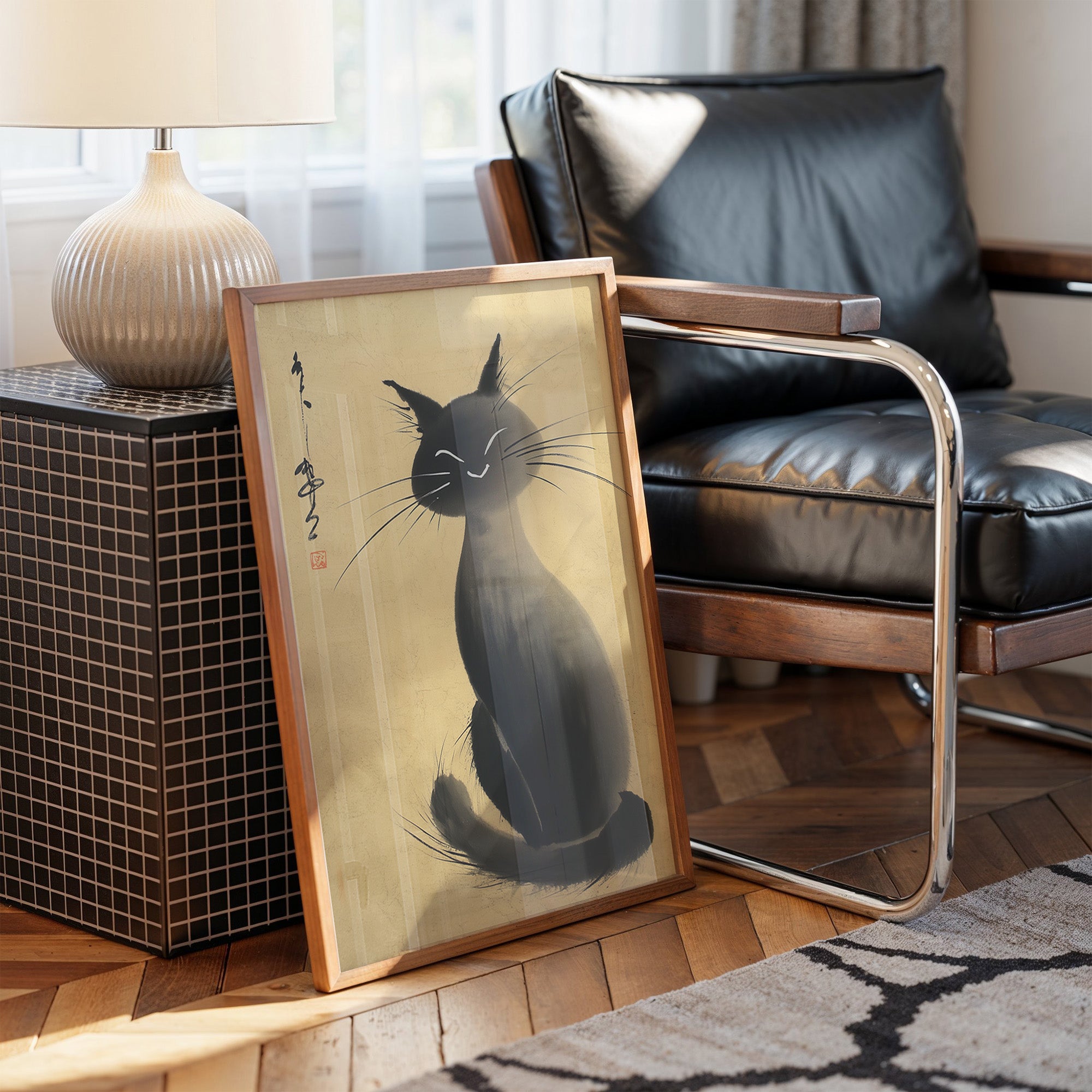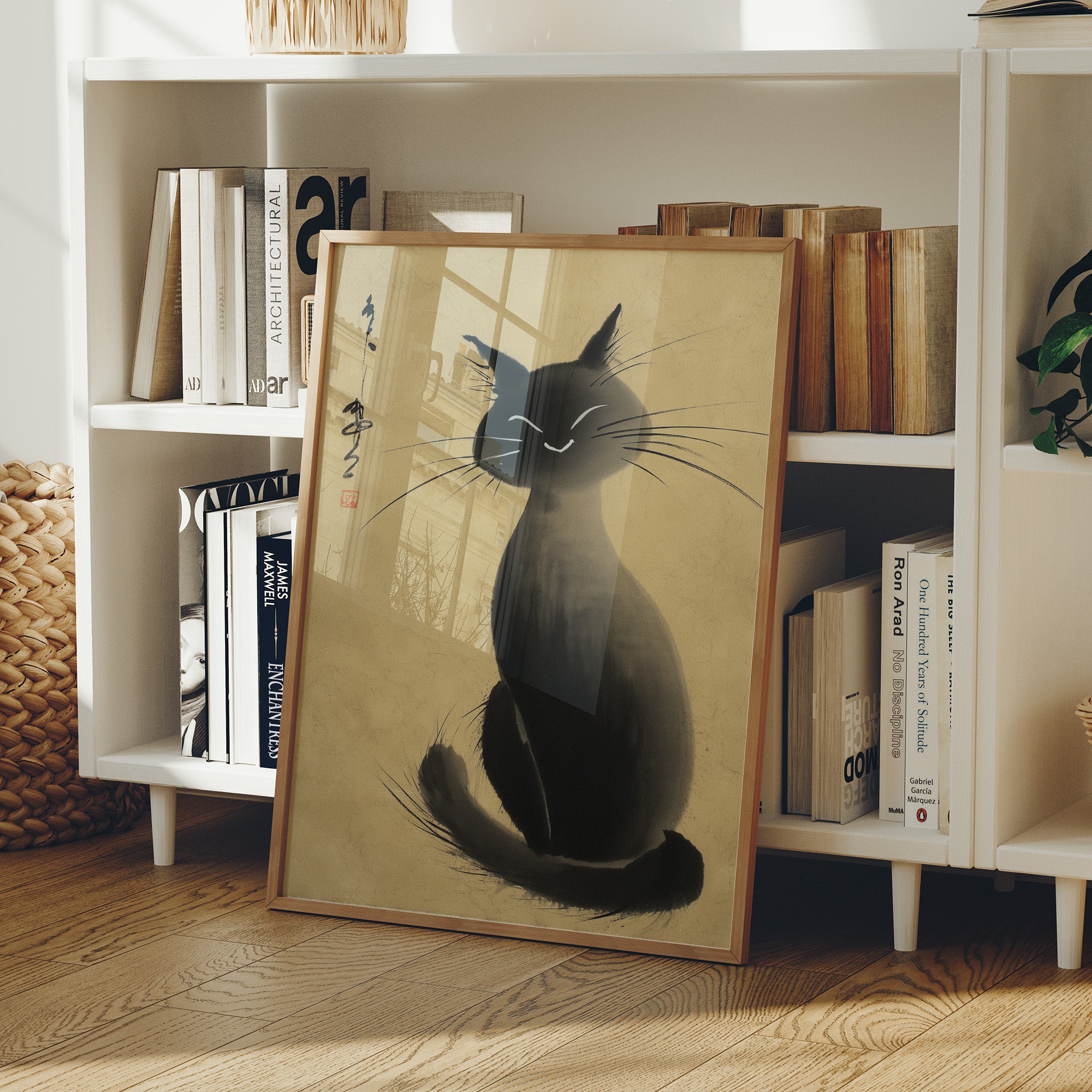 A serene moment captures the essence of feline grace in bold, minimalist strokes. The black cat's silhouette emerges from a warm golden background, its playful smile and distinctive whiskers creating an air of zen-like contentment. Traditional Asian brushwork meets contemporary design, with delicate calligraphy adding authentic character while the stark contrast creates dramatic impact. This piece would bring a perfect balance of whimsy and sophistication to a modern living room or meditation space.