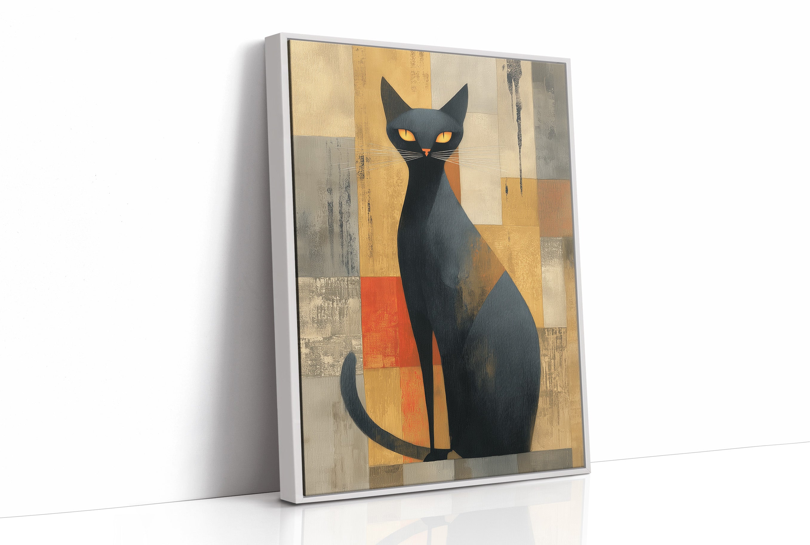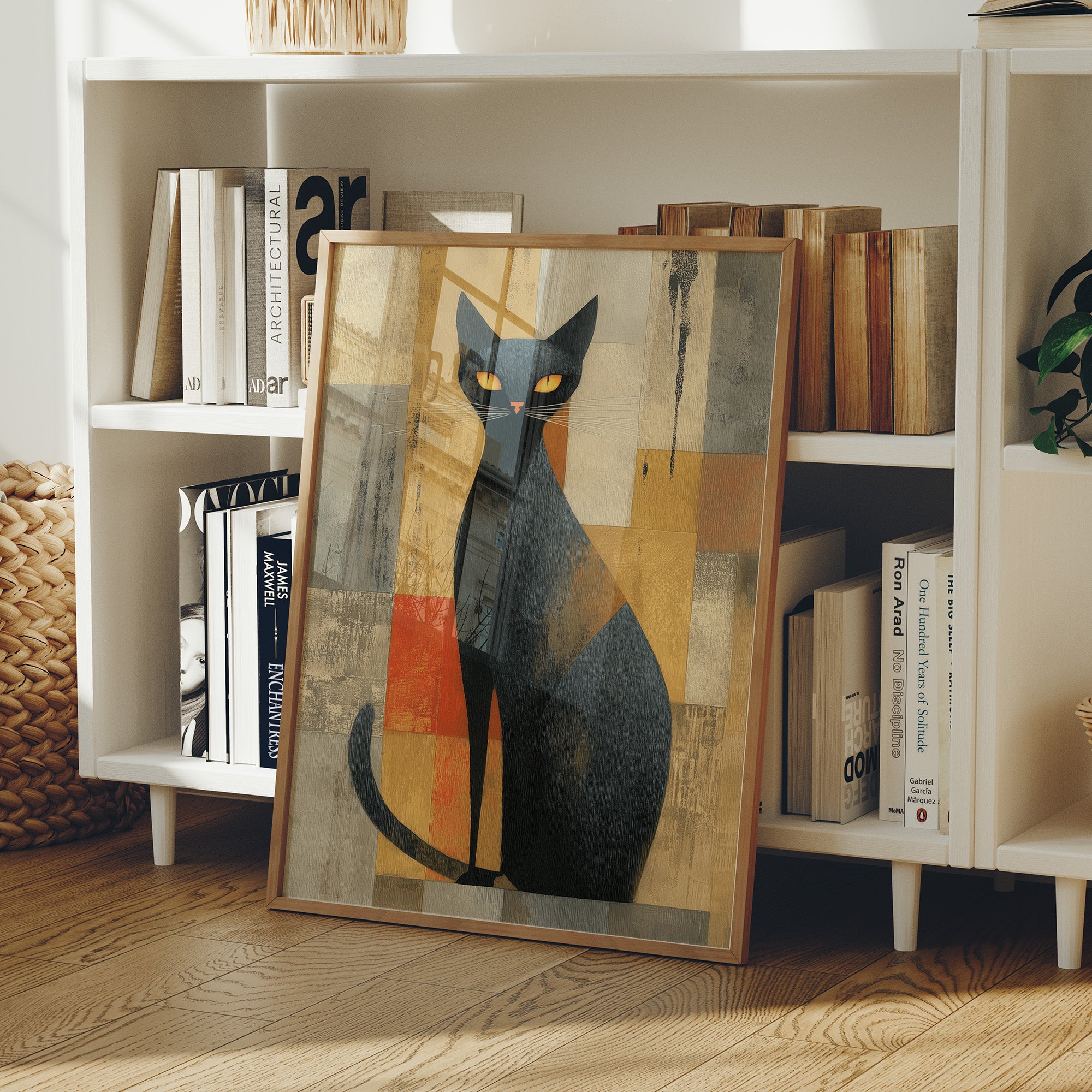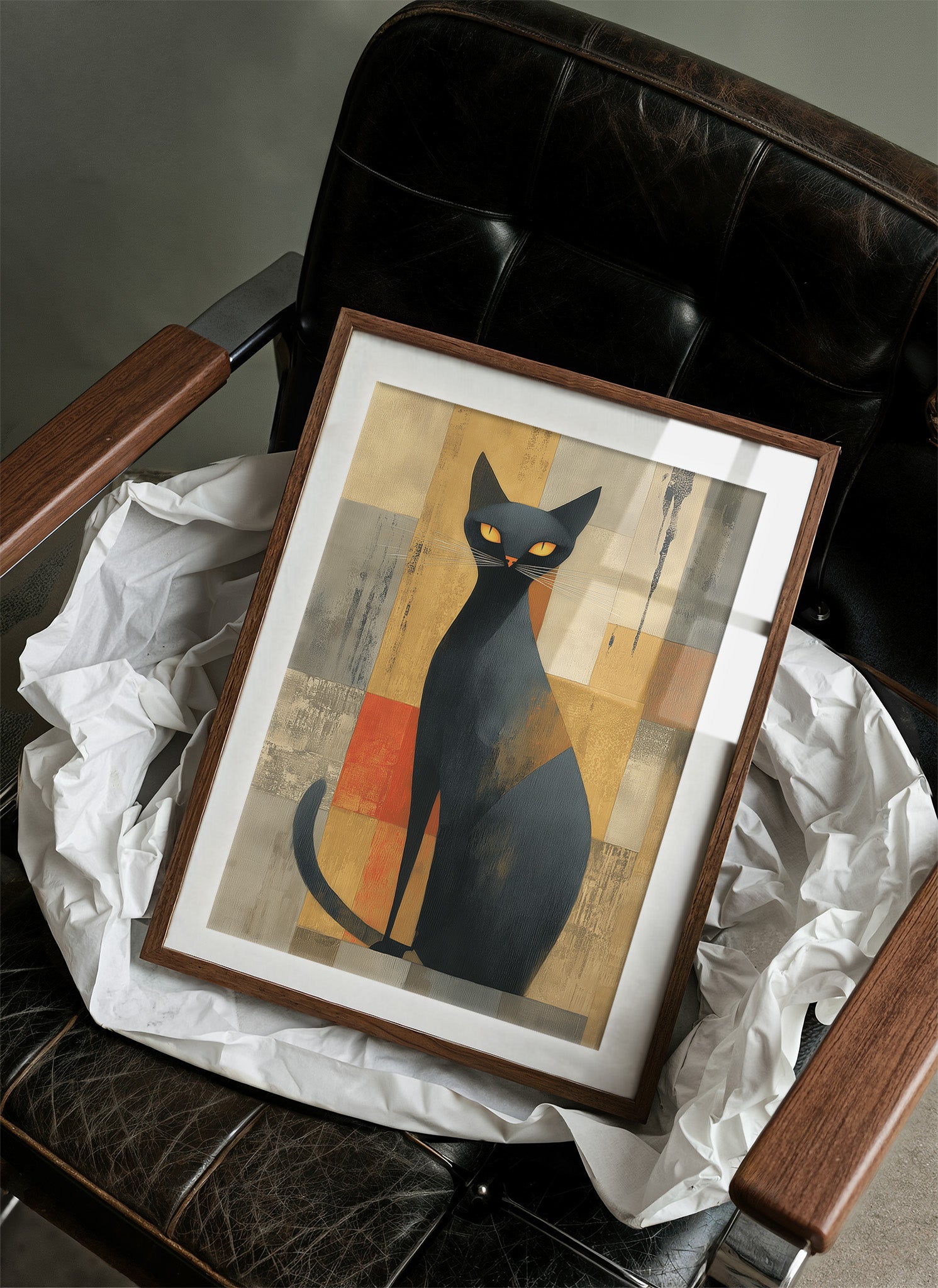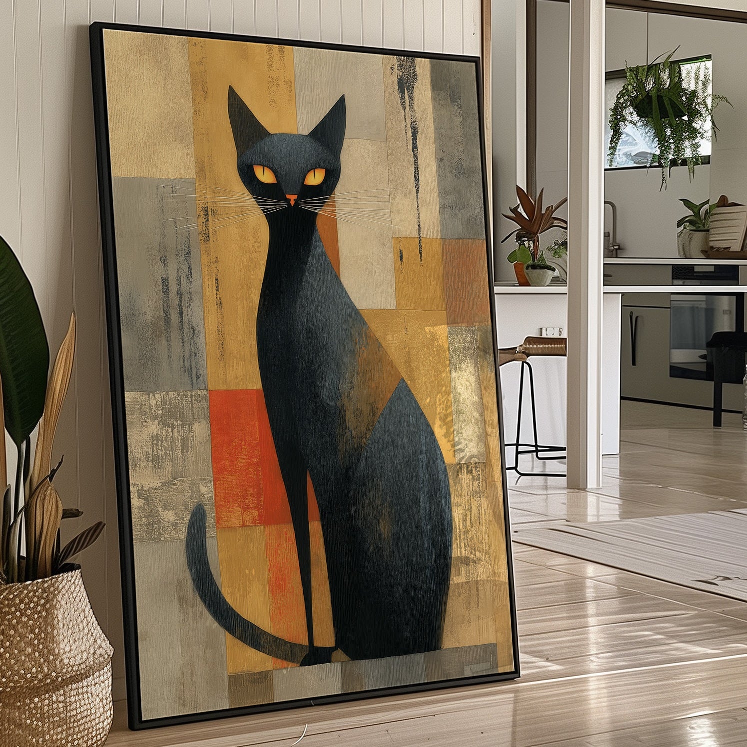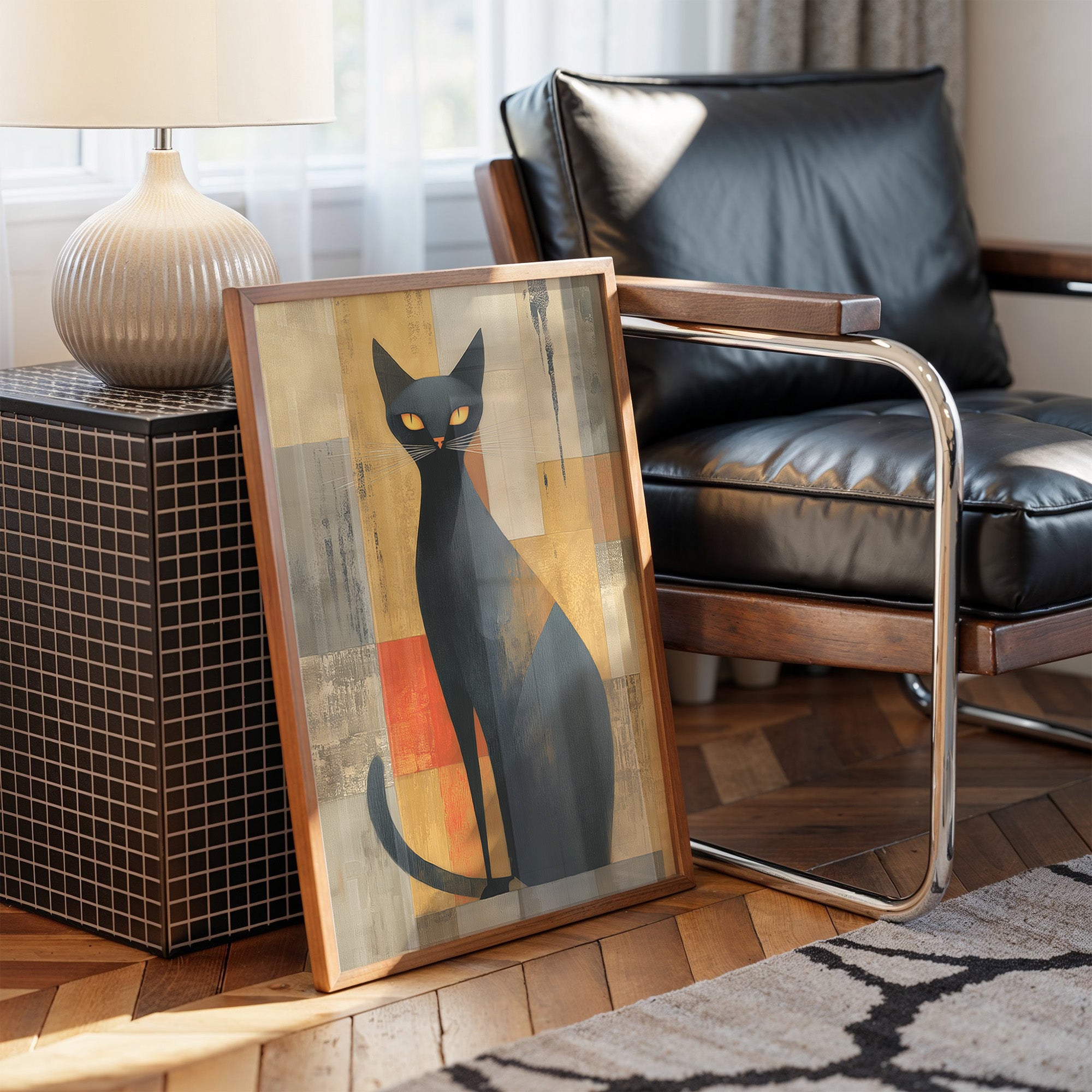 A sophisticated black cat commands attention against a backdrop of warm ochre and burnt orange geometric shapes. The modernist feline portrait, rendered with bold simplicity and striking yellow eyes, brings an air of mystery and elegance to this carefully curated home bar setting. Natural light streams through industrial windows, casting gentle shadows across the wooden floors and illuminating an impressive collection of spirits and glassware below. Perfect for adding a touch of artistic whimsy and mid-century charm to a home bar, dining room, or any space that celebrates both style and spirits.