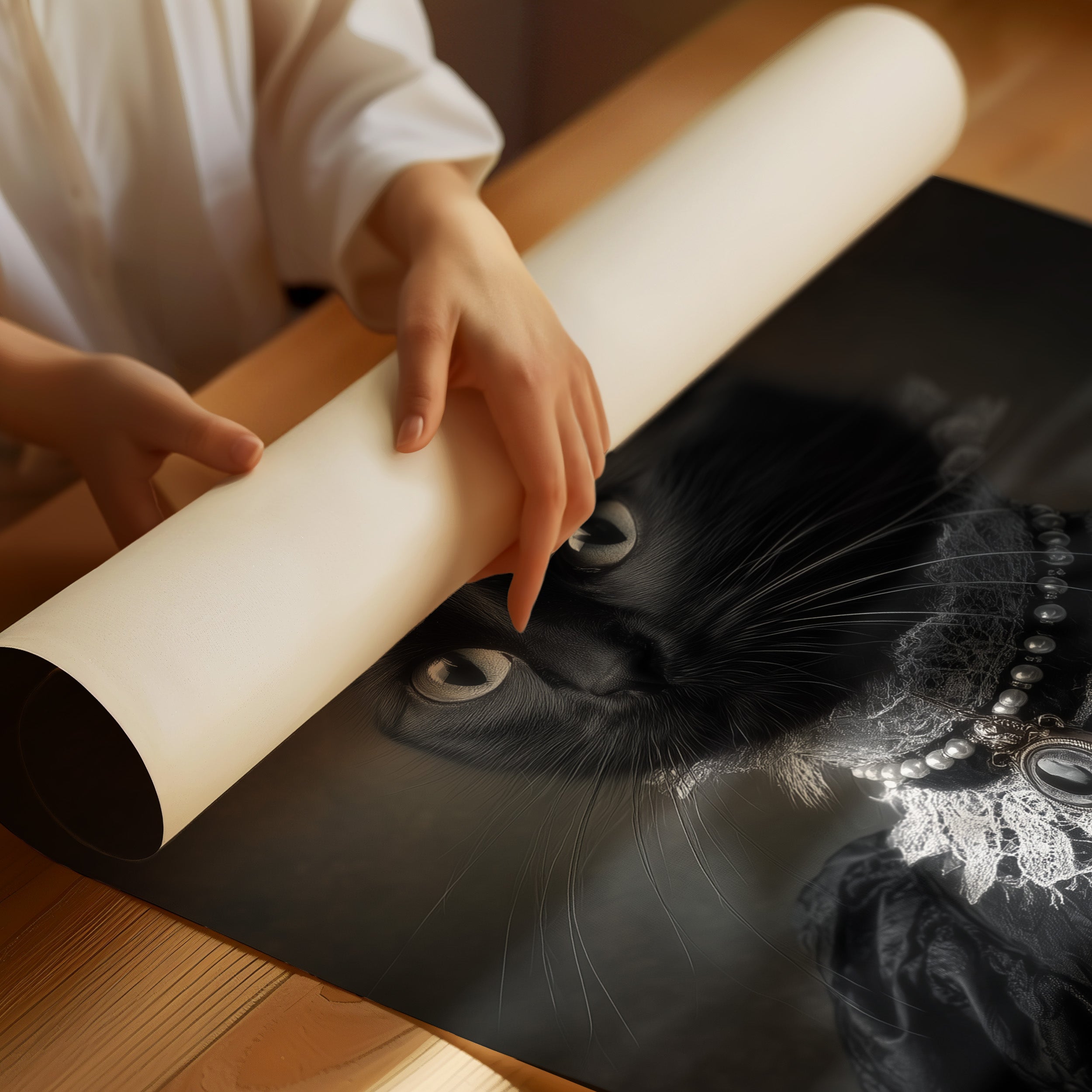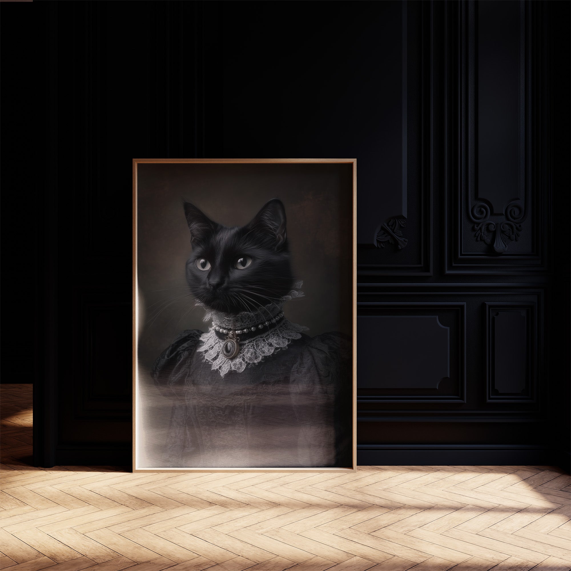 A regal black cat gazes out from a Victorian-era portrait, adorned in lace collar and pearls against a somber backdrop. The contrast between the feline's luminous eyes and the dark tones creates an air of mysterious nobility, blending whimsy with classical portraiture. This elegant anthropomorphic artwork stands against a dramatic black wall, casting subtle shadows across herringbone floors.