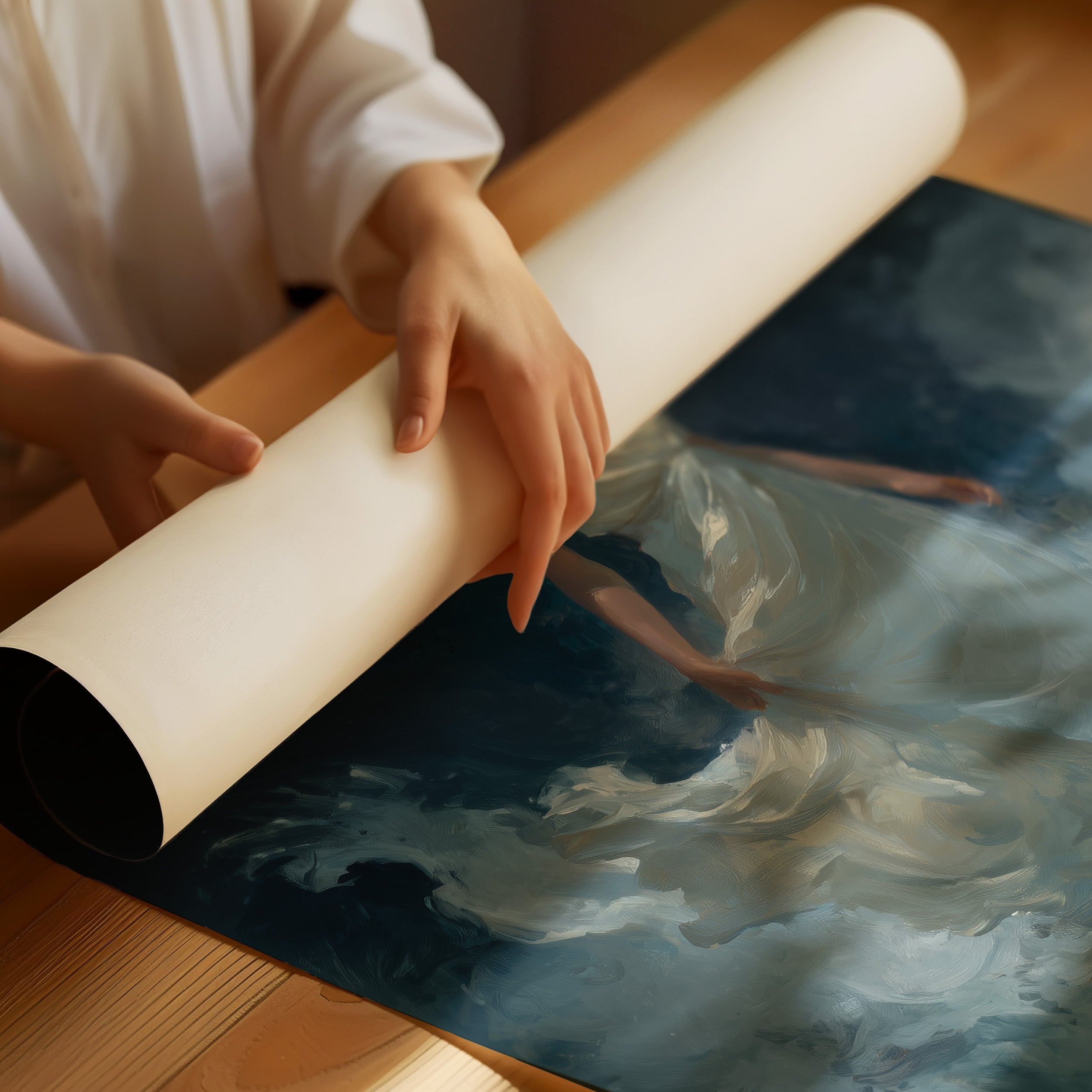 A moment suspended between reality and dream, where flowing white fabric becomes one with misty waves. The figure emerges from swirling brushstrokes of blue and gray, her graceful form caught in an eternal moment of transcendence. The painting captures that liminal space where movement becomes emotion, where the boundaries between body and nature dissolve into something hauntingly beautiful. This striking portrait creates a dramatic focal point against the dark elegance of a minimalist room.