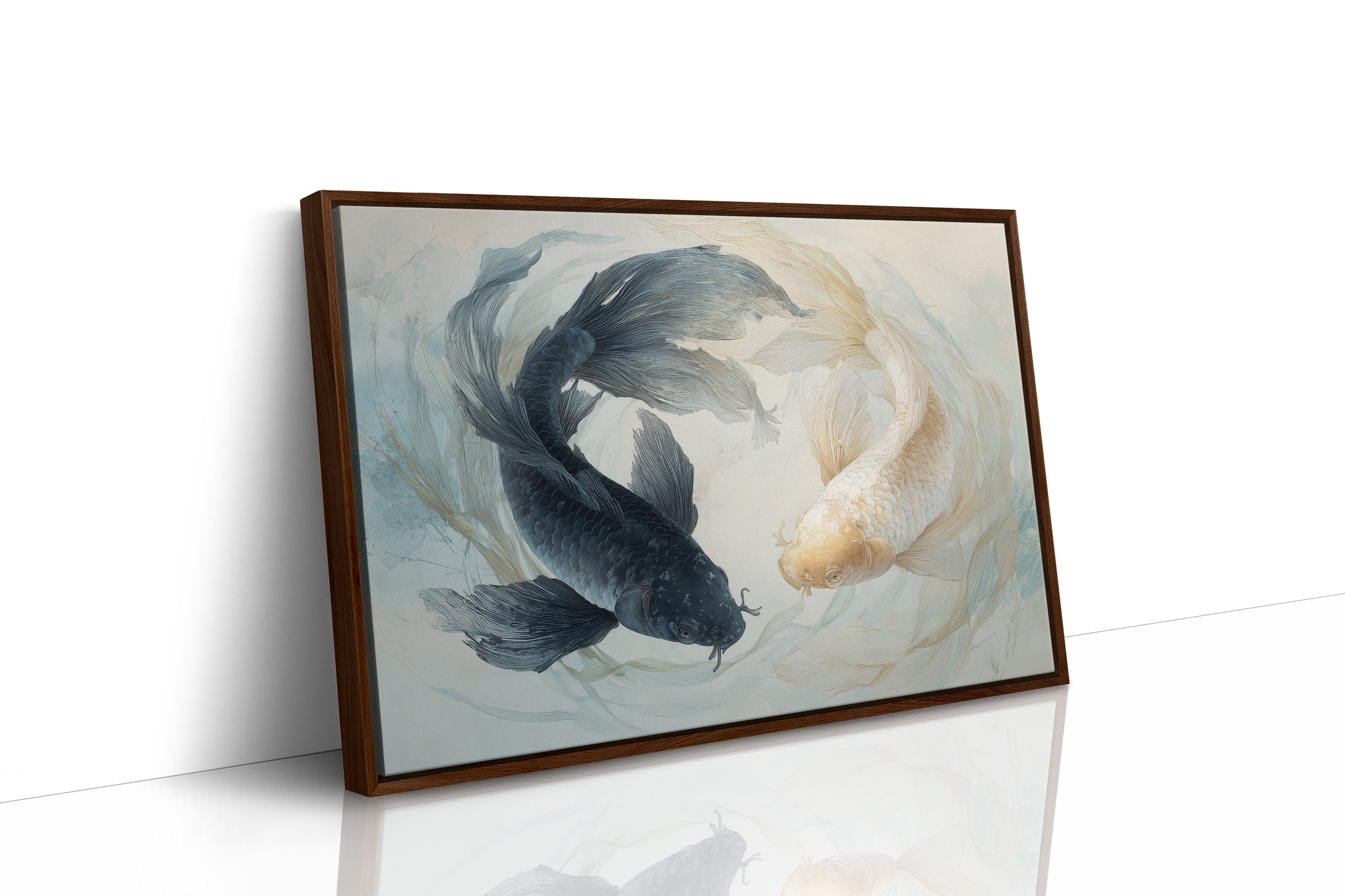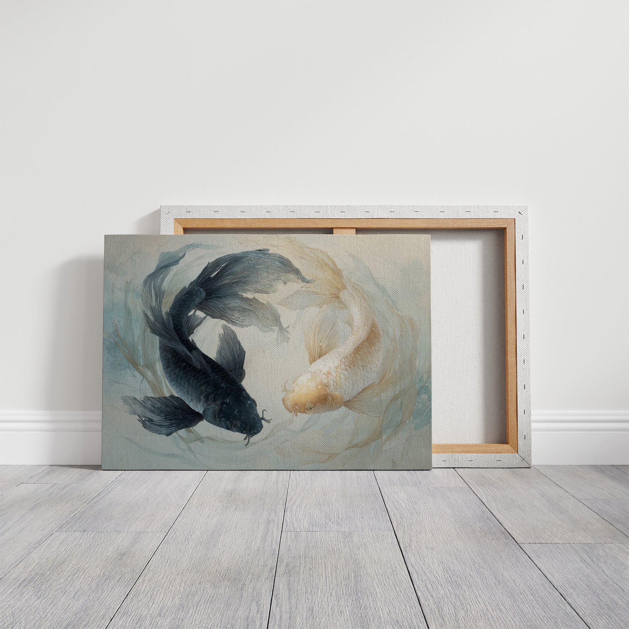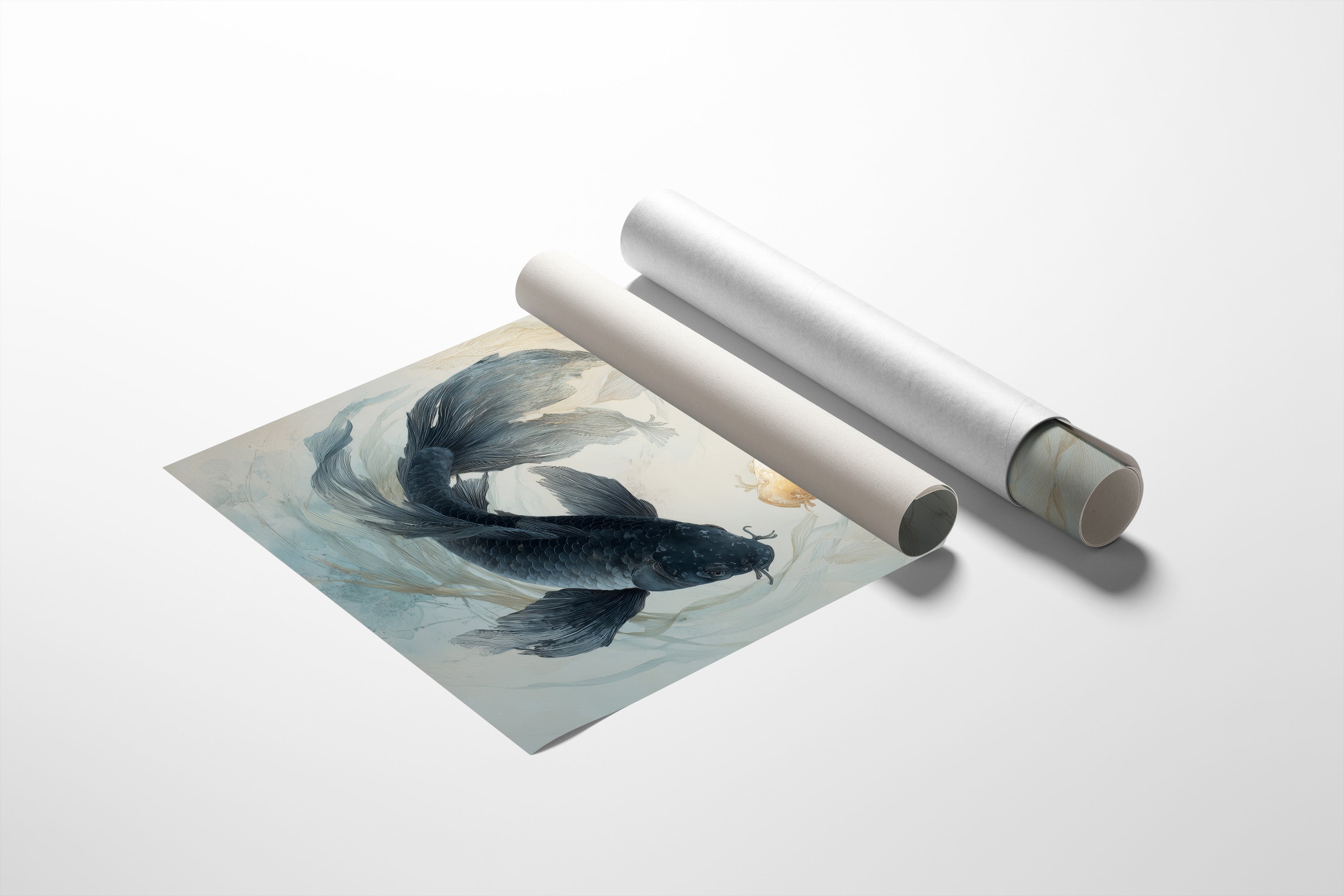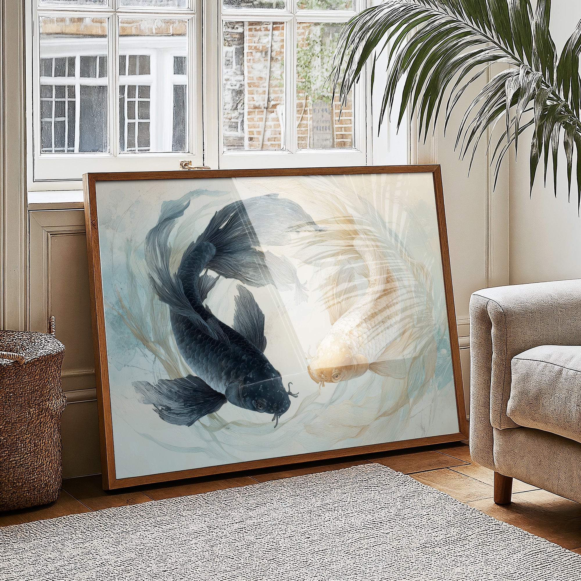 A mesmerizing ballet unfolds as two koi fish circle each other in an ethereal underwater waltz. The deep indigo fish with flowing fins contrasts dramatically against its golden partner, their graceful movements captured in translucent brushstrokes that suggest both motion and tranquility. The painting's muted palette of blues, blacks, and warm amber tones creates a sense of depth and mystery, as if viewing these elegant creatures through the rippling surface of a moonlit pond.