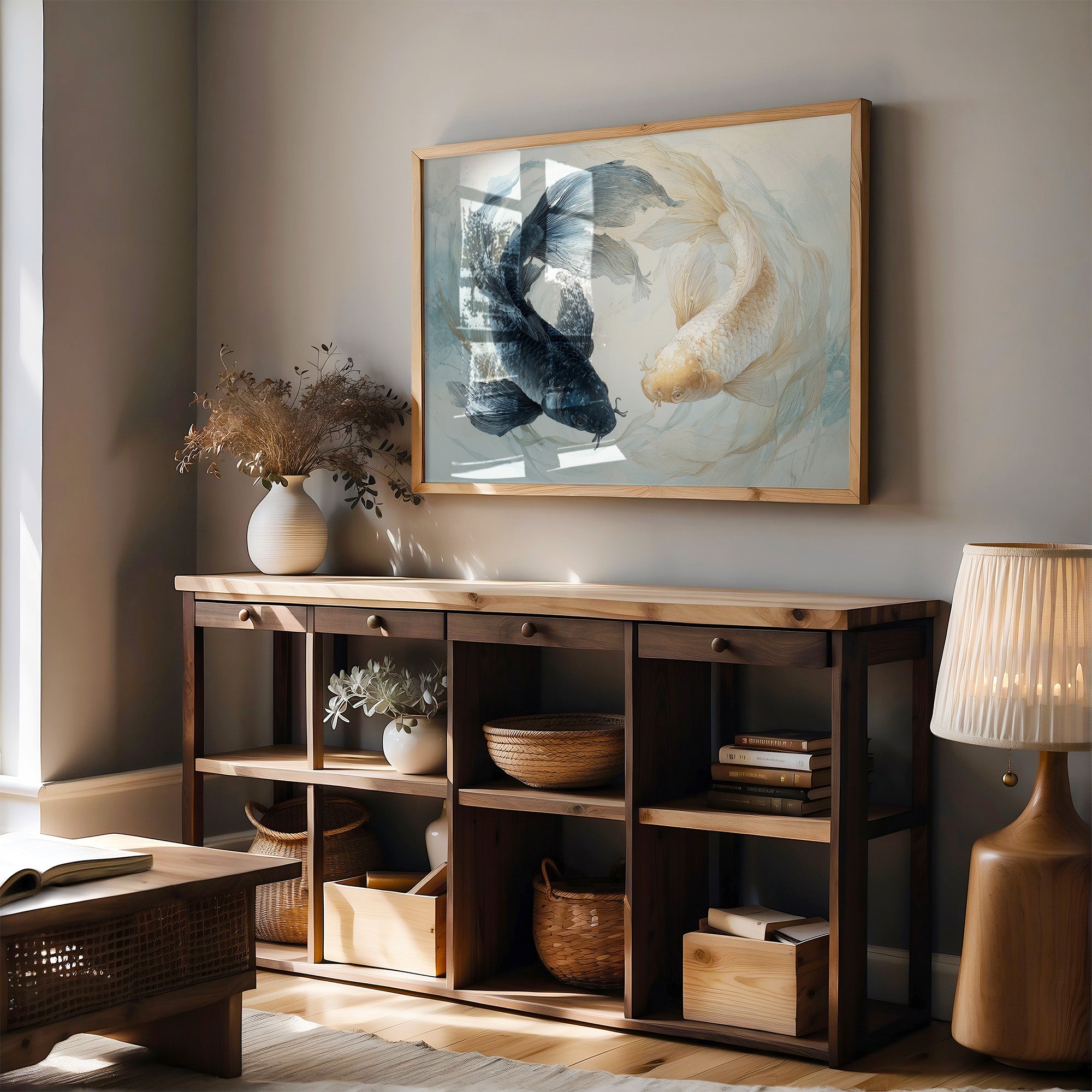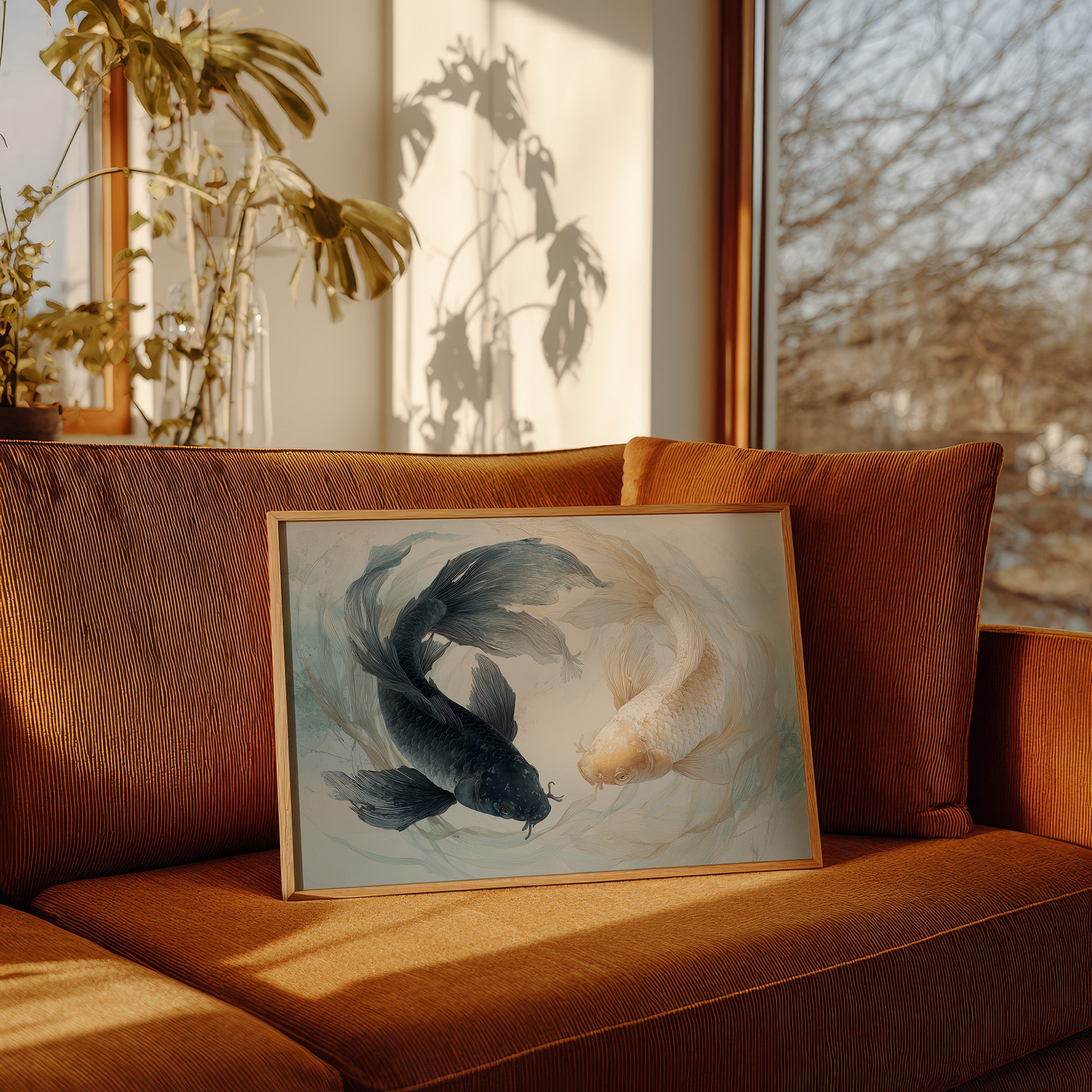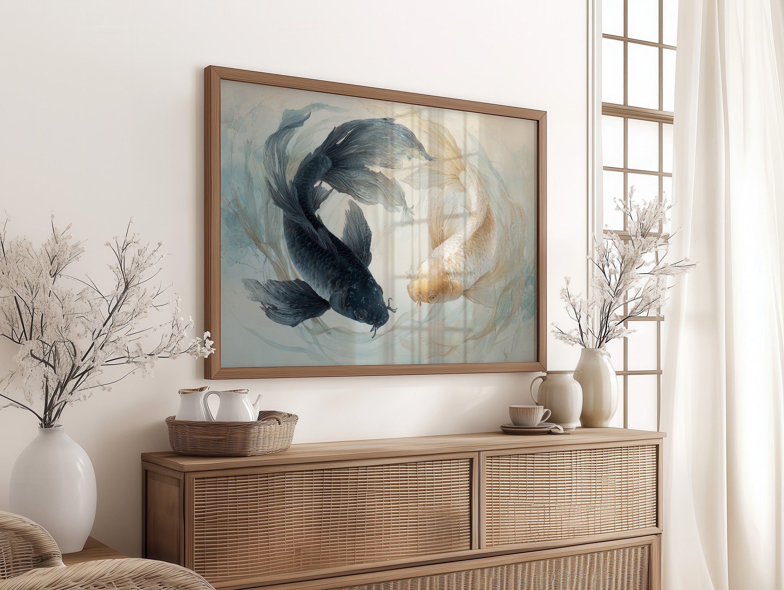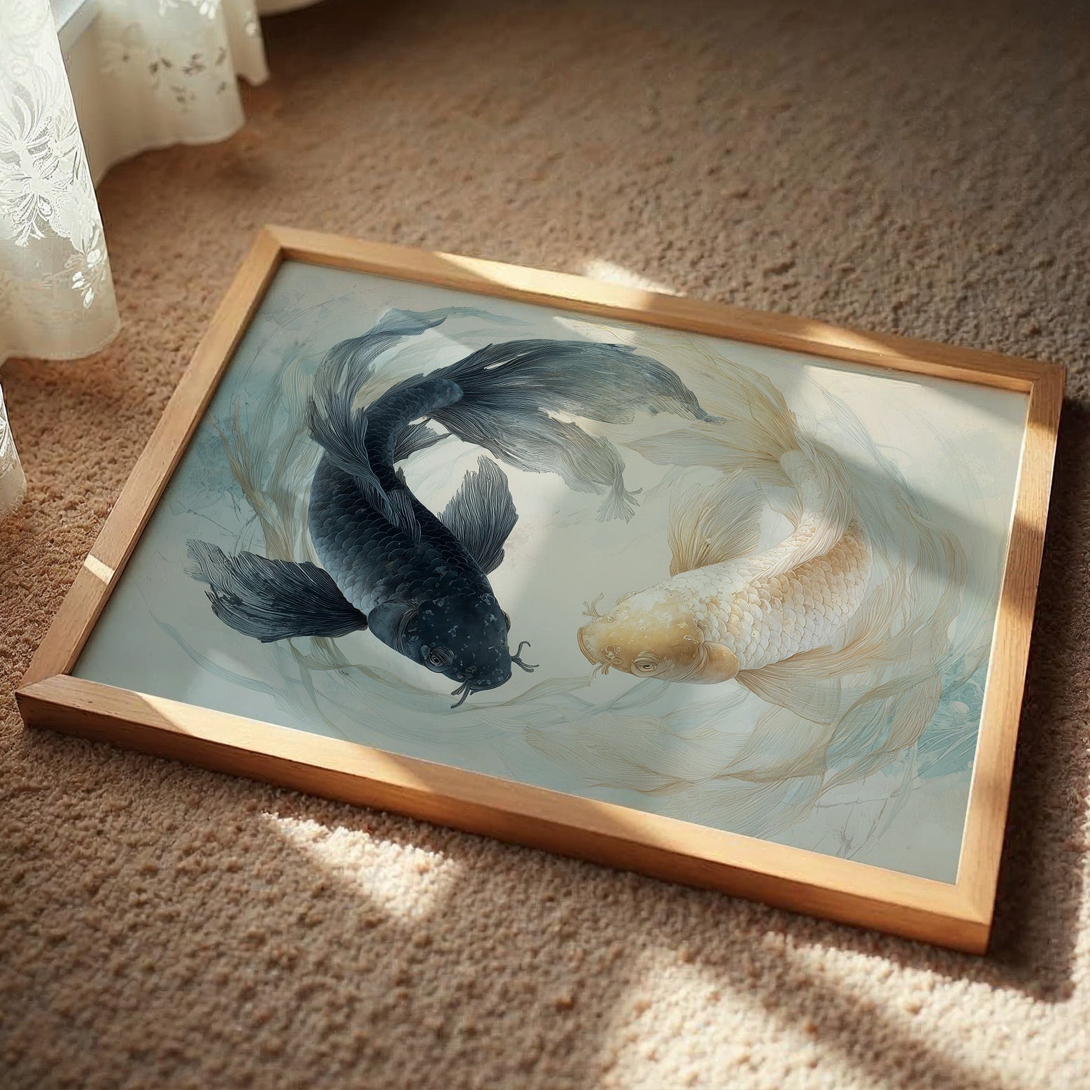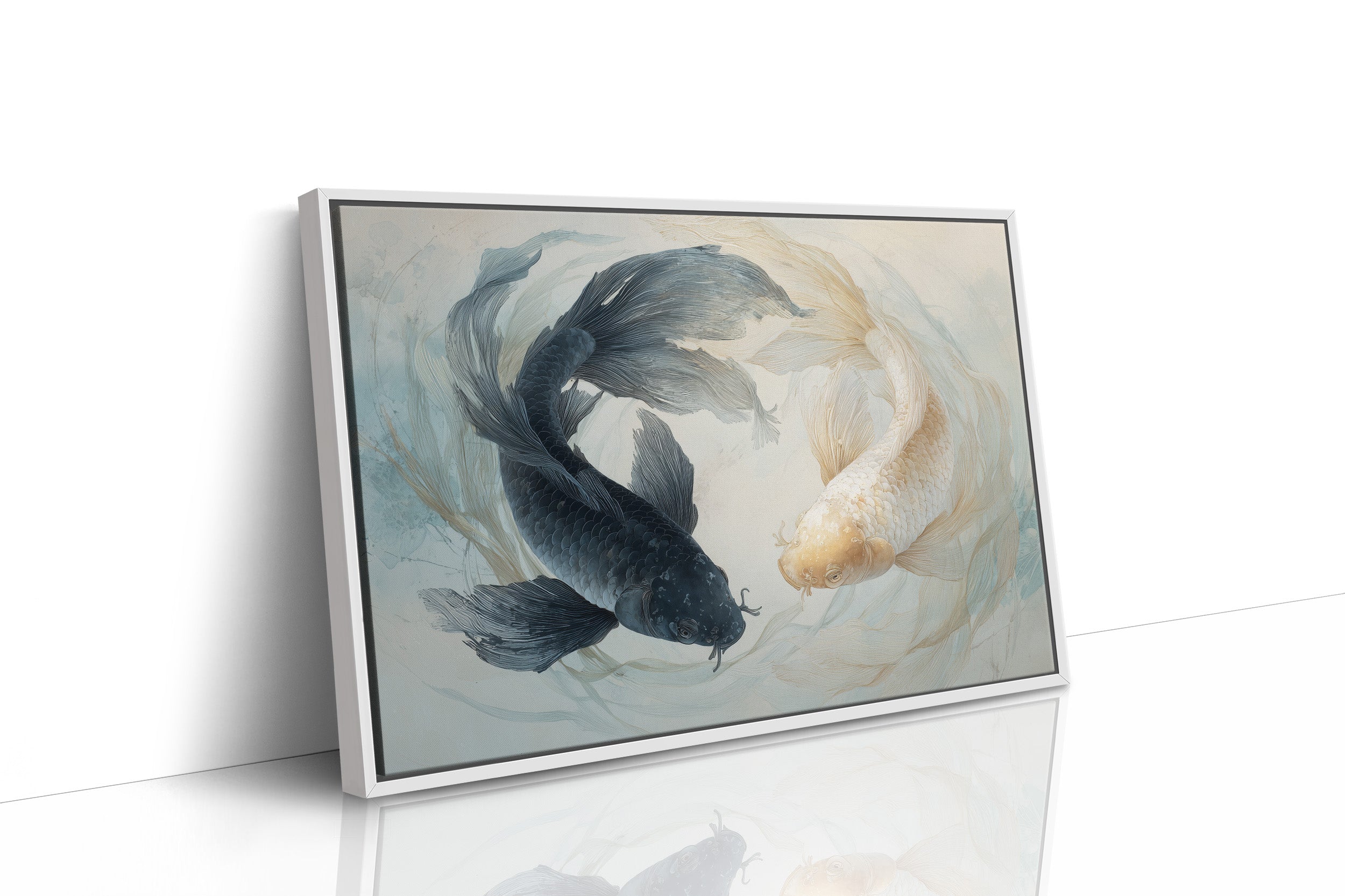 A mesmerizing ballet unfolds as two koi fish circle each other in an ethereal underwater waltz. The deep indigo fish with flowing fins contrasts dramatically against its golden partner, their graceful movements captured in translucent brushstrokes that suggest both motion and tranquility. The painting's muted palette of blues, blacks, and warm amber tones creates a sense of depth and mystery, as if viewing these elegant creatures through the rippling surface of a moonlit pond.