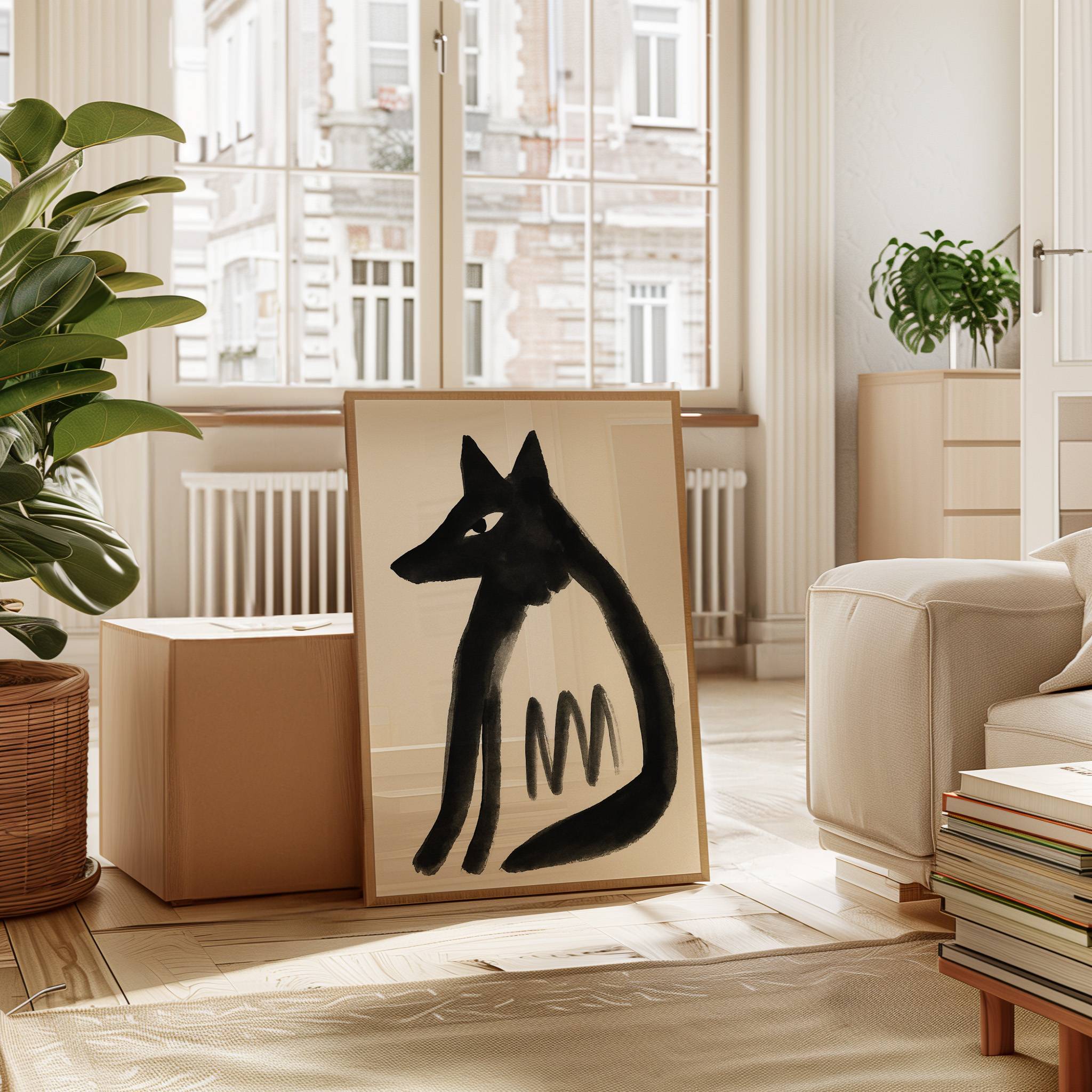 A bold silhouette emerges from cream-colored paper, commanding attention with stark simplicity. The fox's form, rendered in confident black brushstrokes, carries an air of mystique while geometric patterns dance along its body. The minimalist composition speaks to Japanese ink painting traditions while maintaining a distinctly contemporary edge.
