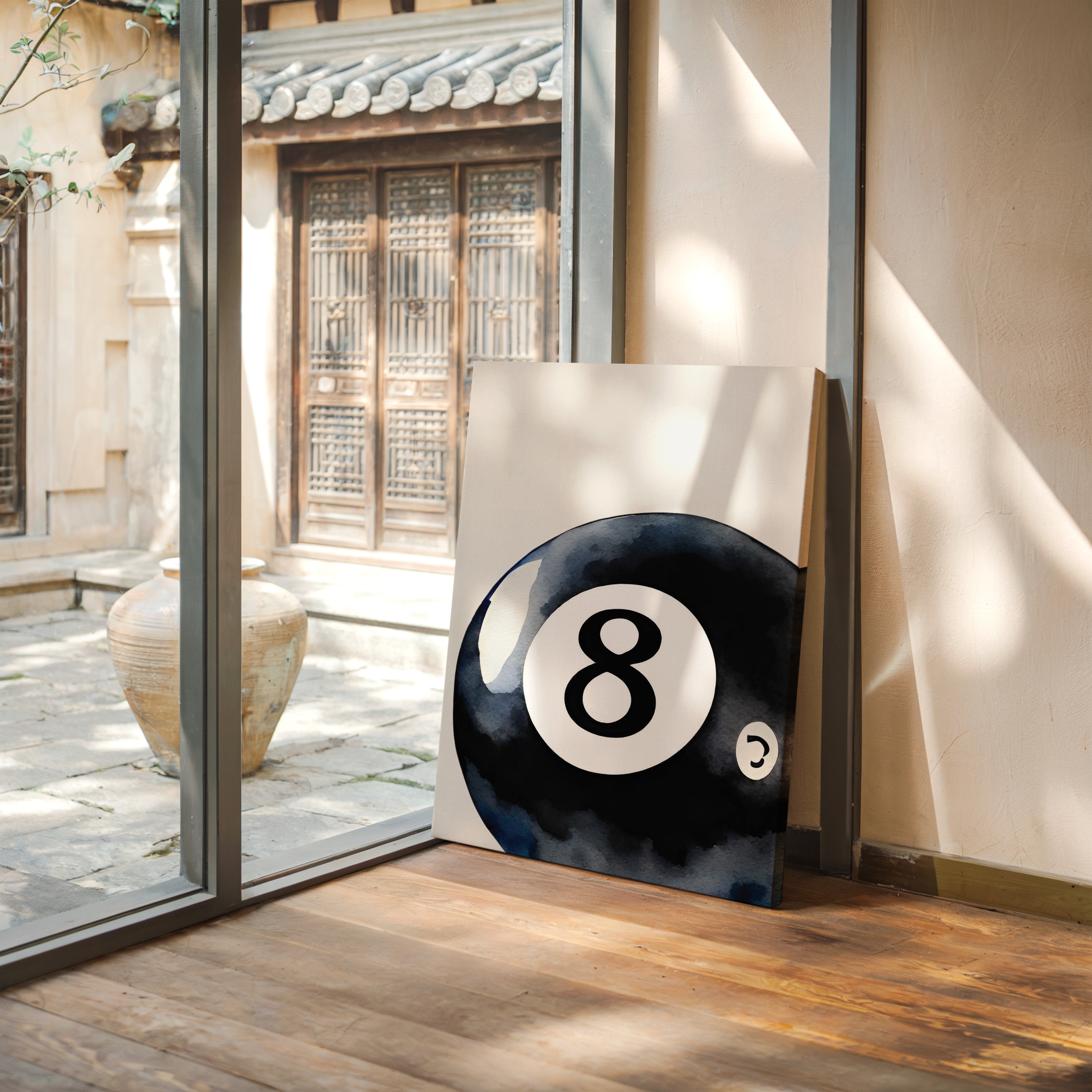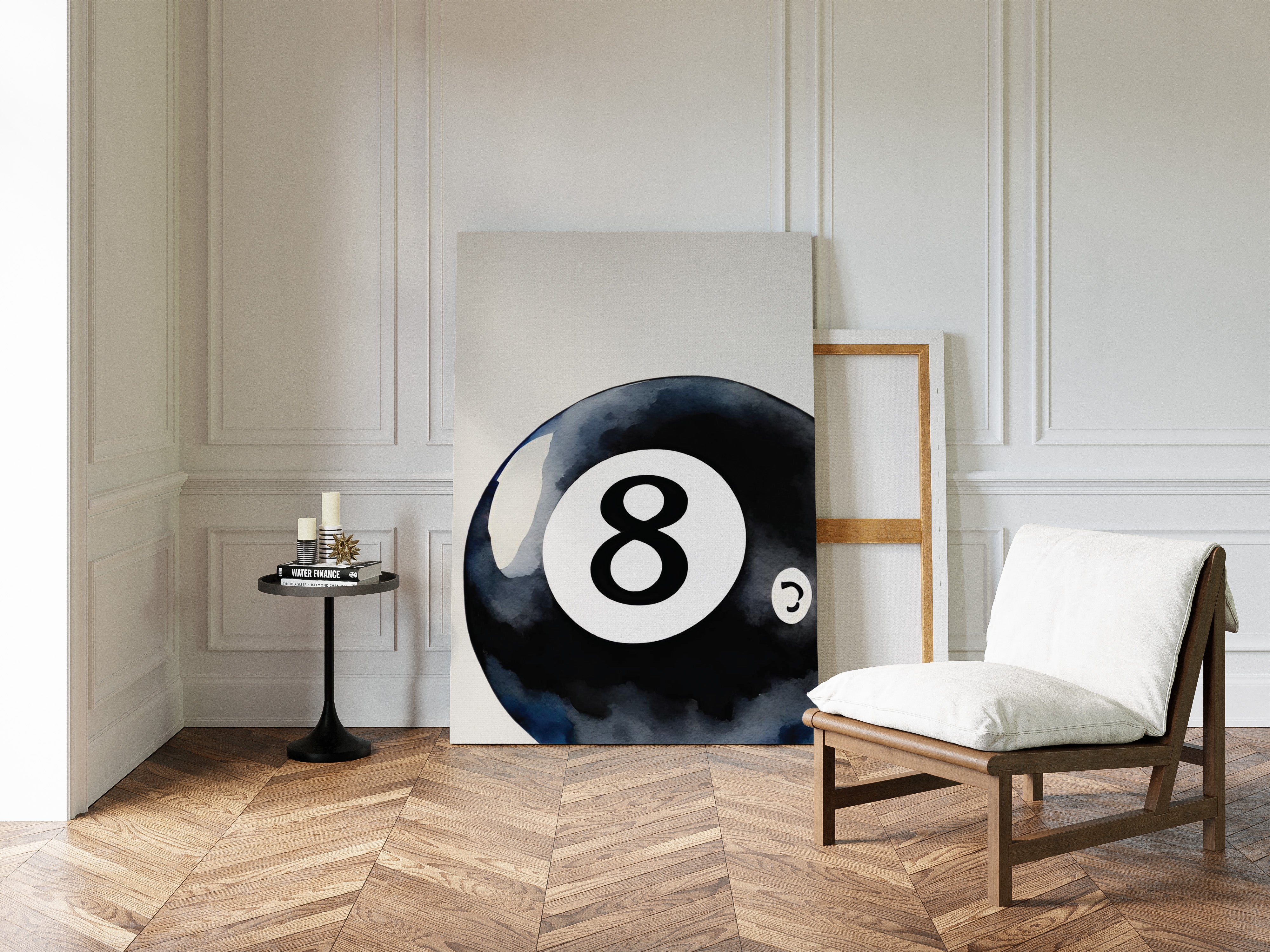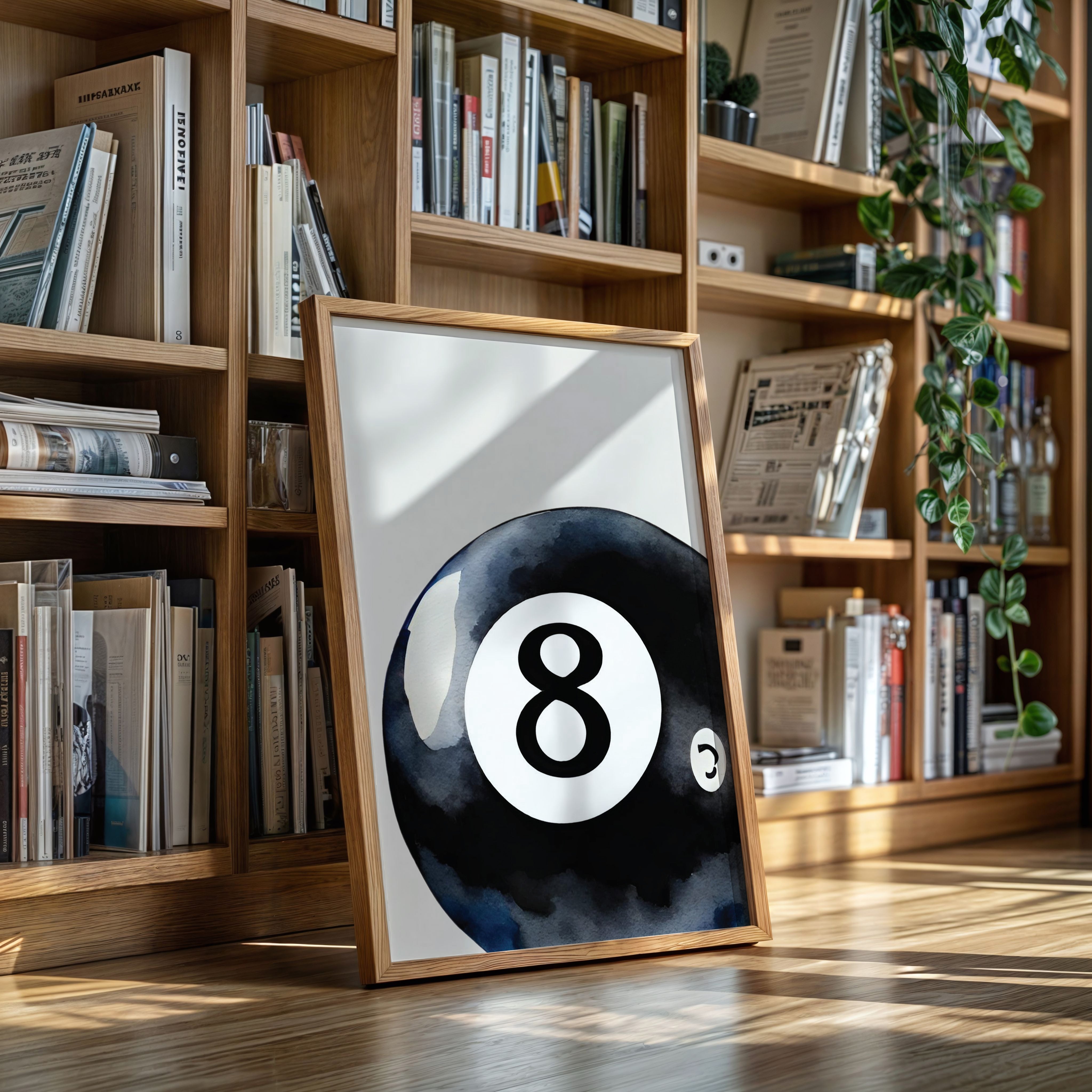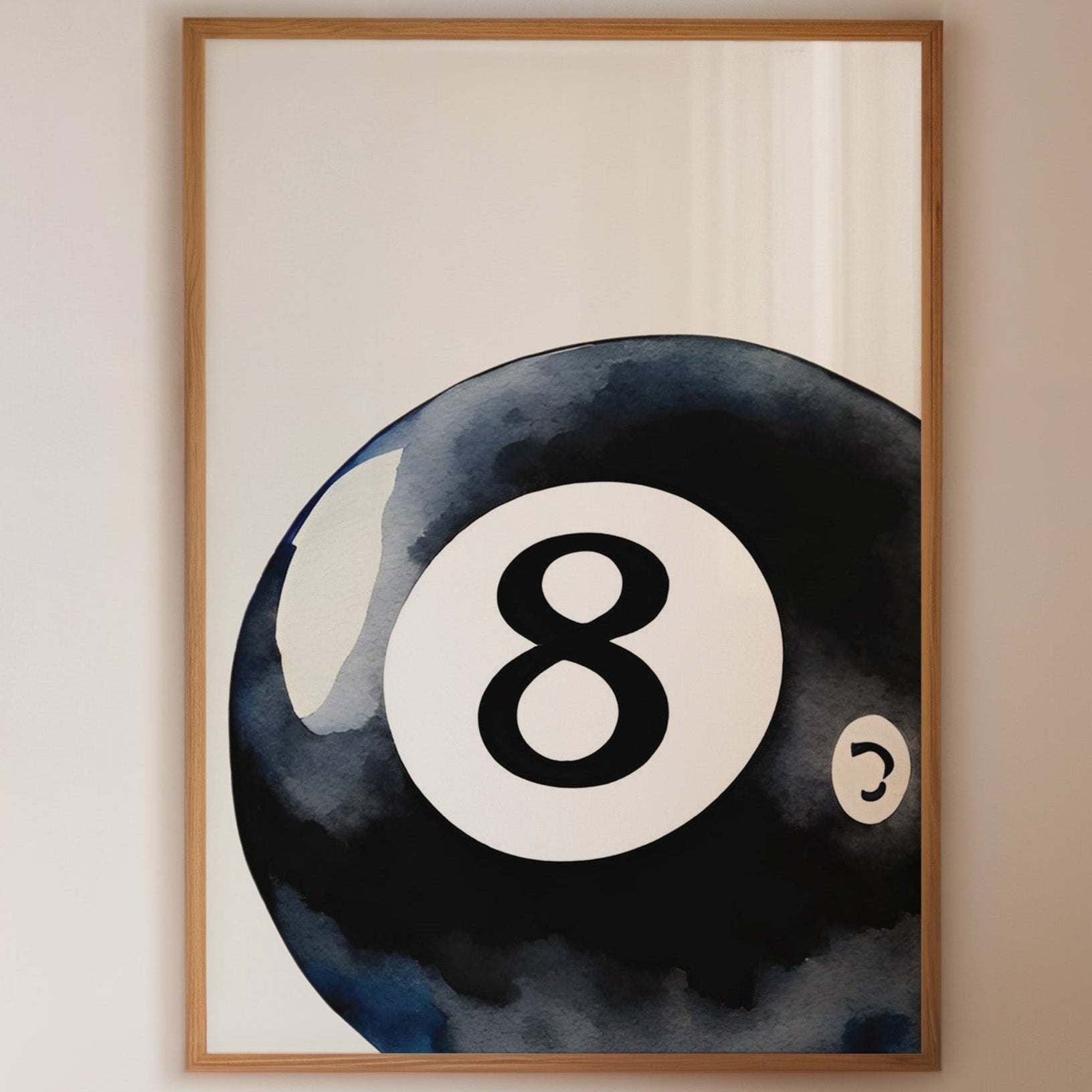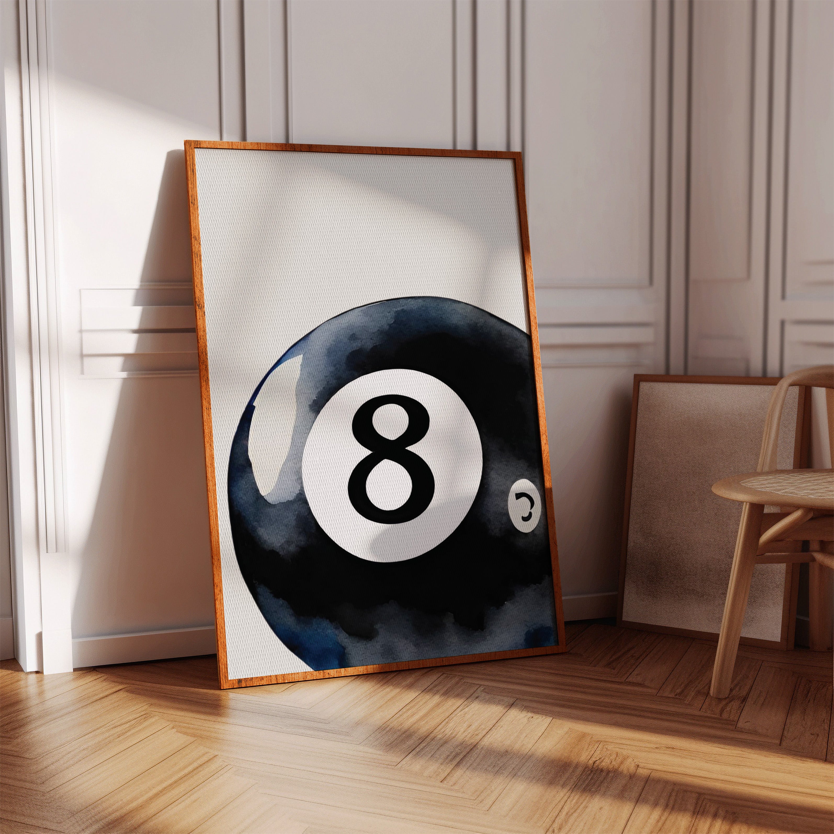 A sleek black sphere holds infinite possibilities within its glossy surface, catching light like liquid midnight. This piece exemplifies the bold simplicity of contemporary game room art. The iconic eight ball emerges from deep indigo shadows, its commanding presence both nostalgic and modernly sophisticated. The minimalist composition creates a powerful statement through the interplay of light and shadow, while subtle watercolor textures add depth to the classic motif. Perfect for elevating a game room, den, or modern living space with its timeless appeal. The piece brings both playful energy and refined artistic presence to any room.
