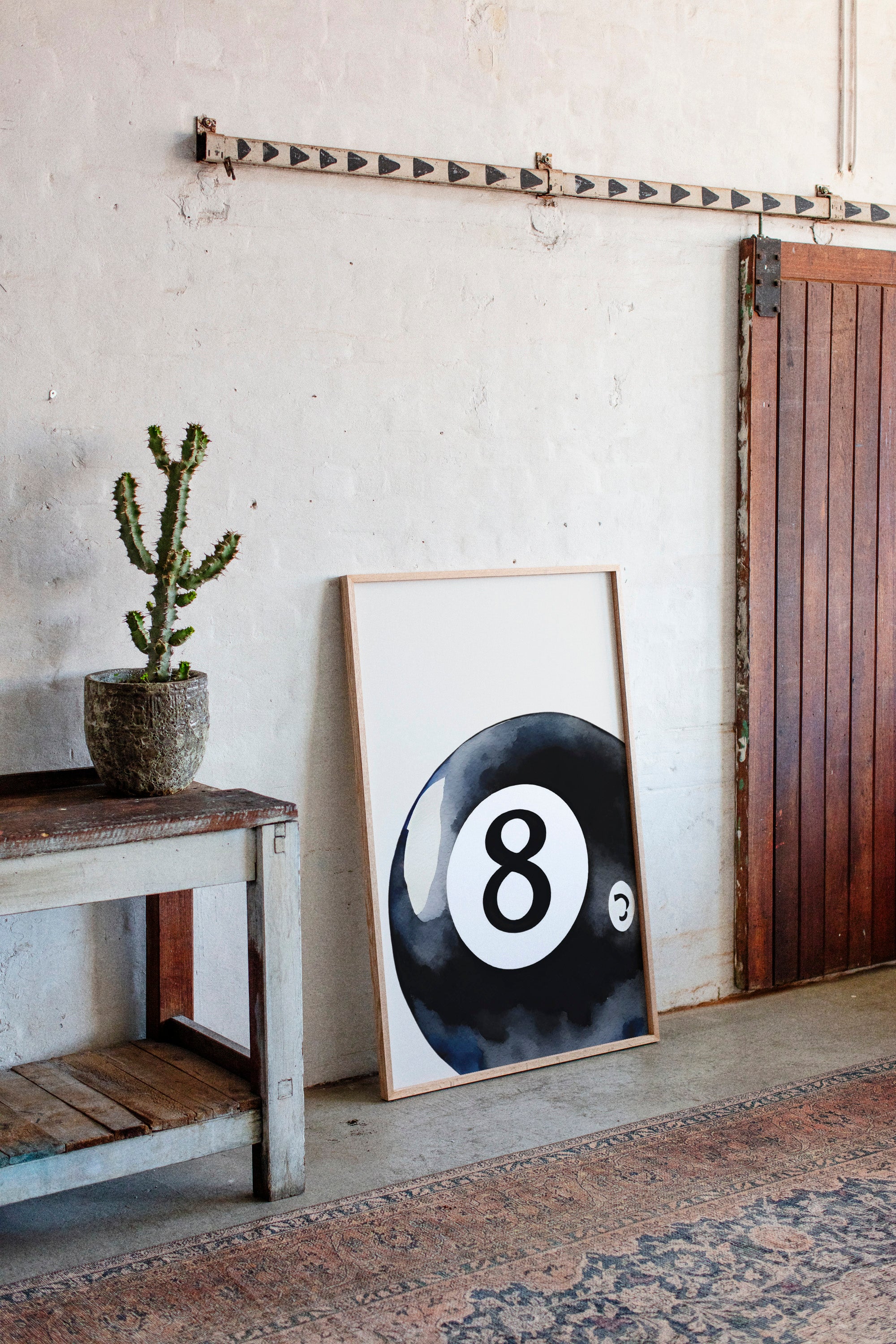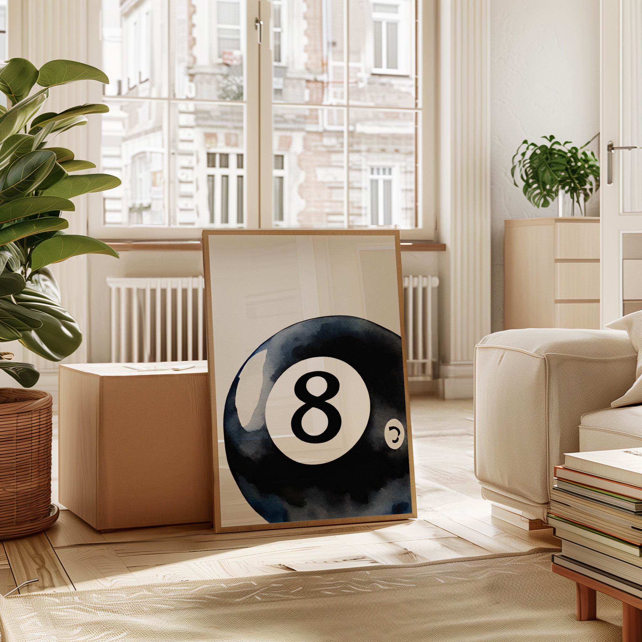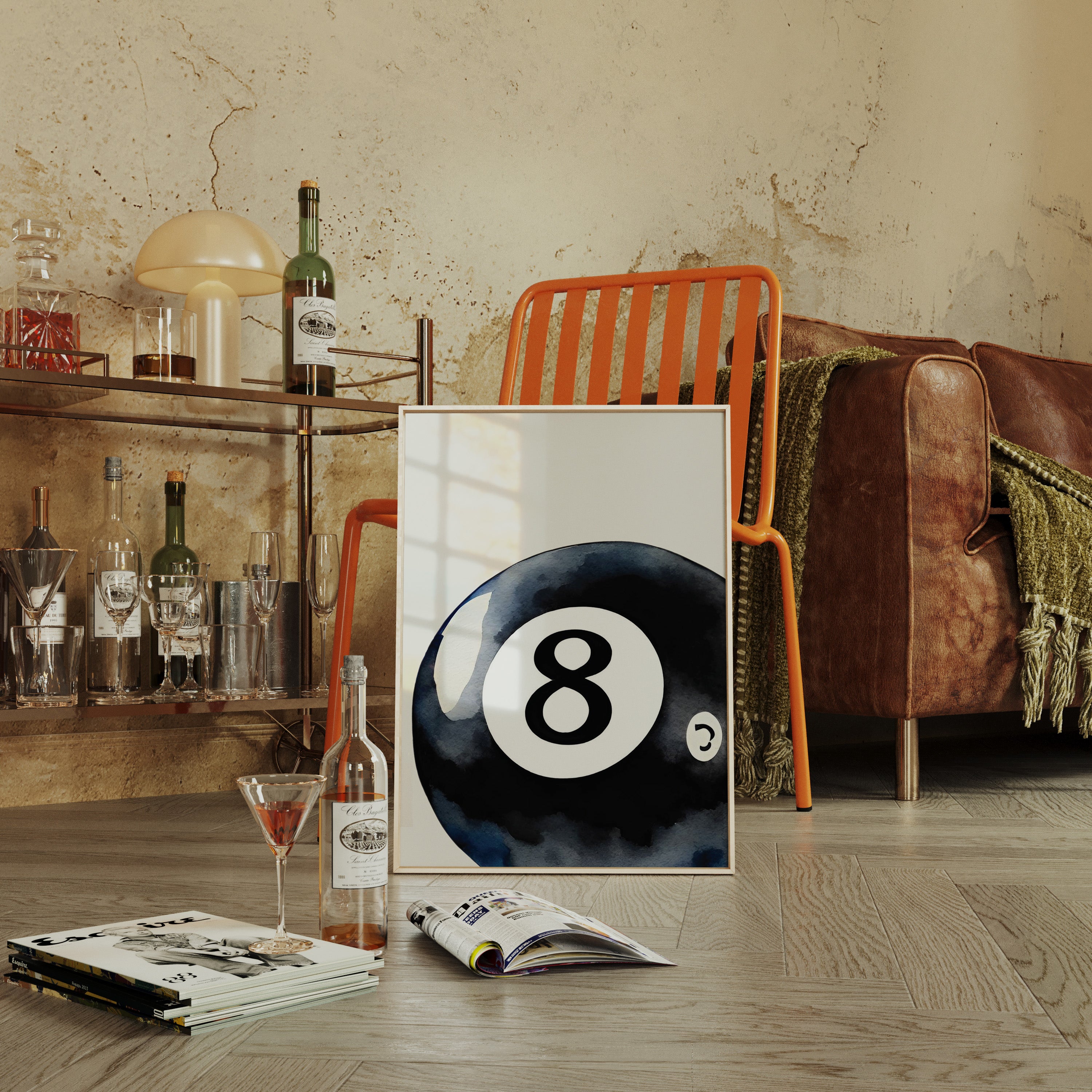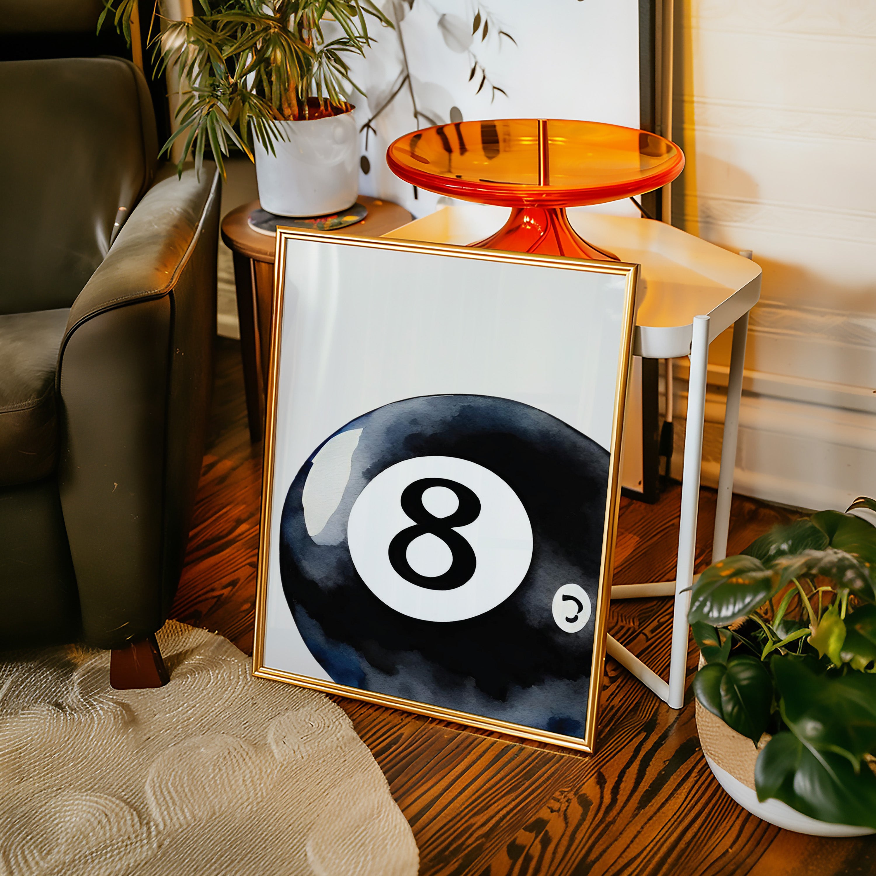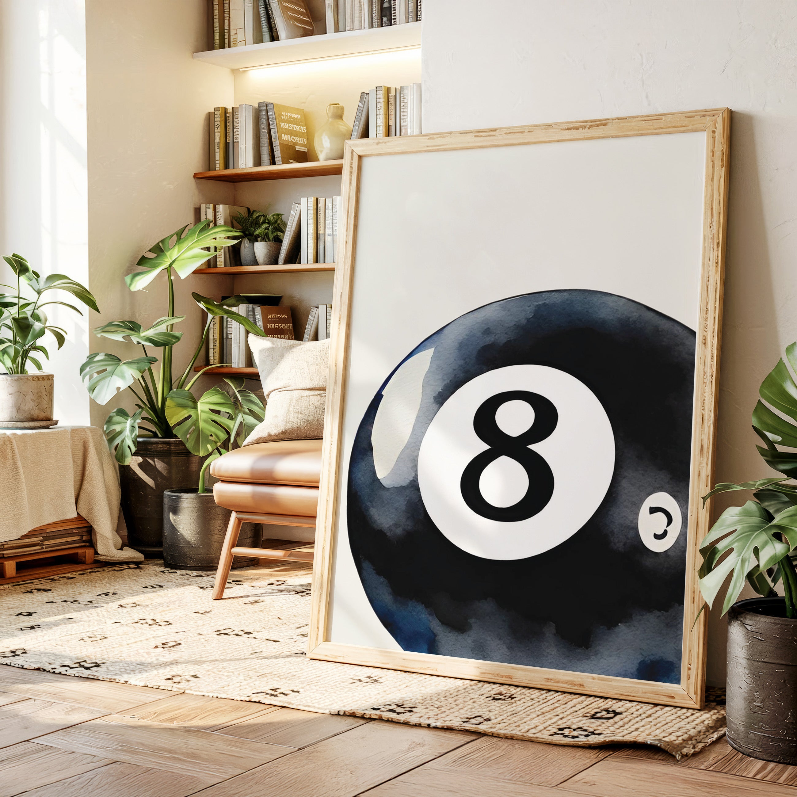 A sleek black sphere holds infinite possibilities within its glossy surface, catching light like liquid midnight. This piece exemplifies the bold simplicity of contemporary game room art. The iconic eight ball emerges from deep indigo shadows, its commanding presence both nostalgic and modernly sophisticated. The minimalist composition creates a powerful statement through the interplay of light and shadow, while subtle watercolor textures add depth to the classic motif. Perfect for elevating a game room, den, or modern living space with its timeless appeal. The piece brings both playful energy and refined artistic presence to any room.