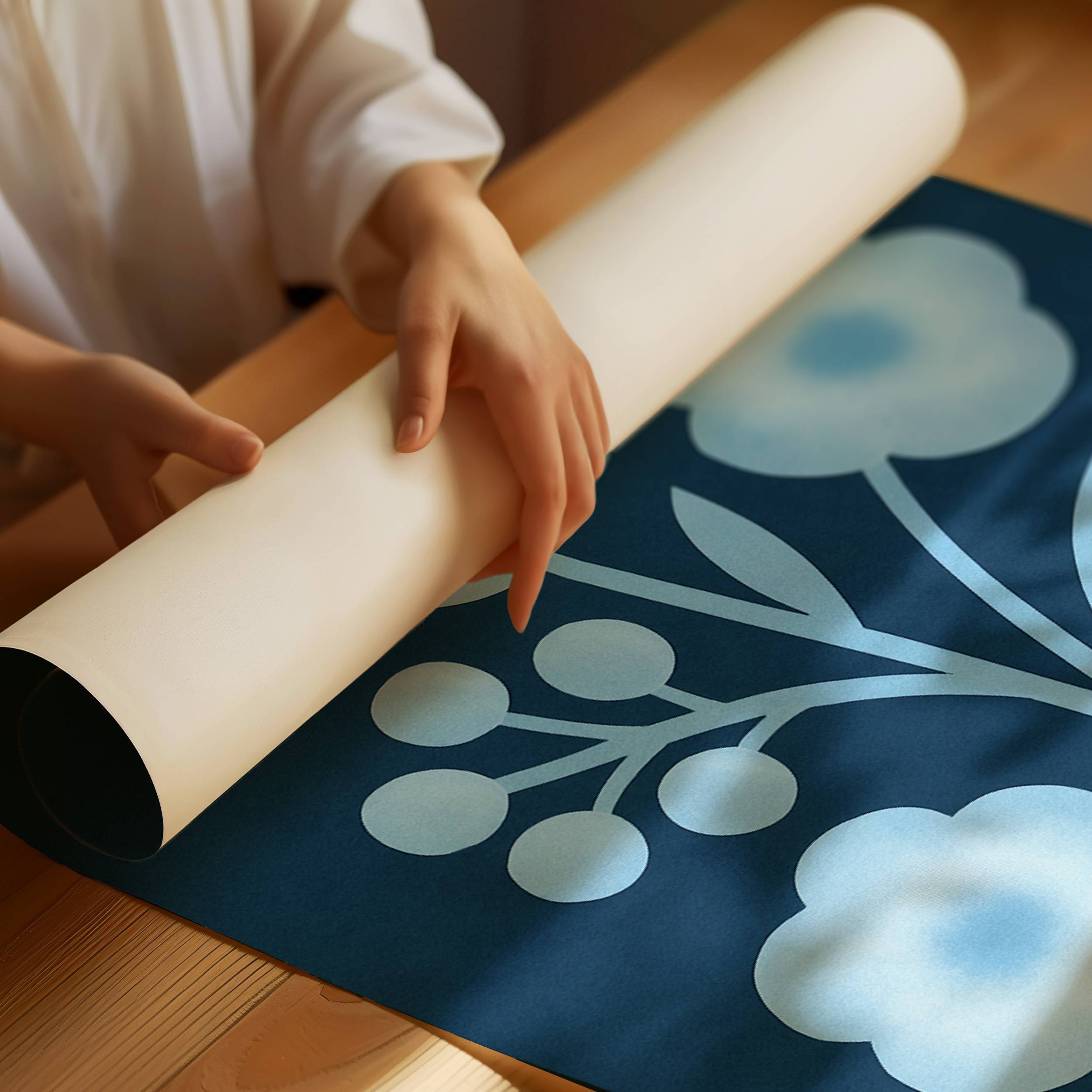Like frost-kissed petals caught in moonlight, delicate blue flowers float against a deep navy backdrop. The simple silhouette captures the essence of botanical beauty, with rounded blooms and berries creating a harmonious dance of shapes. The two-toned composition speaks to modern minimalism while maintaining the timeless appeal of floral artistry. Perfect for bringing a sense of calm sophistication to a contemporary bedroom or adding a touch of serenity to a minimalist home office space.