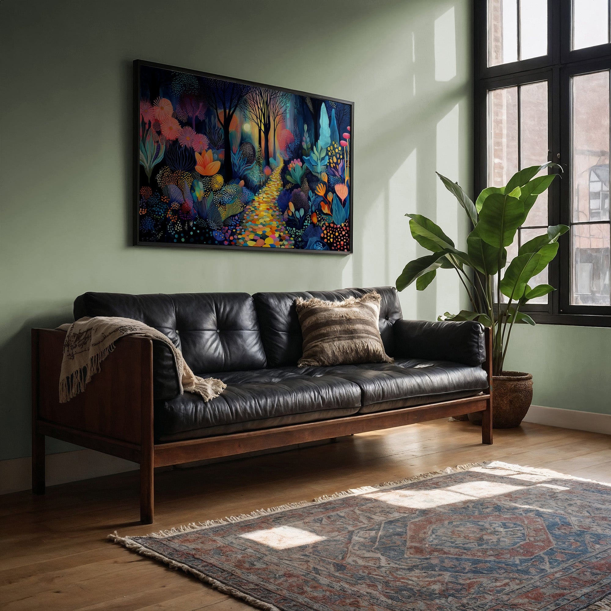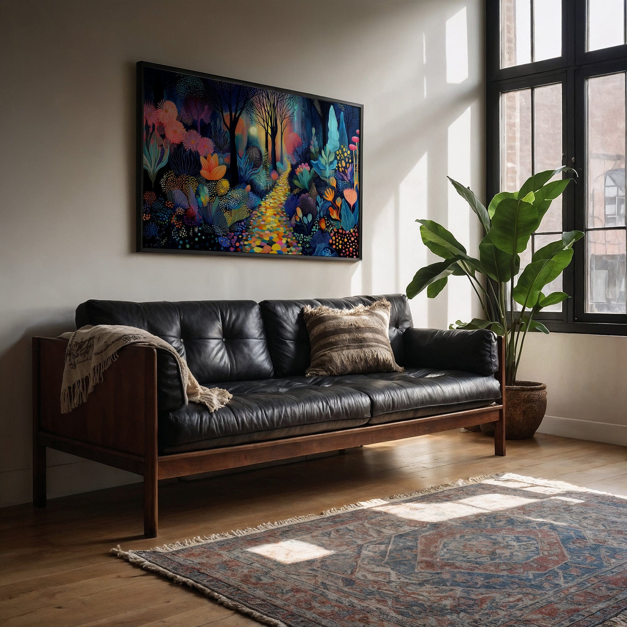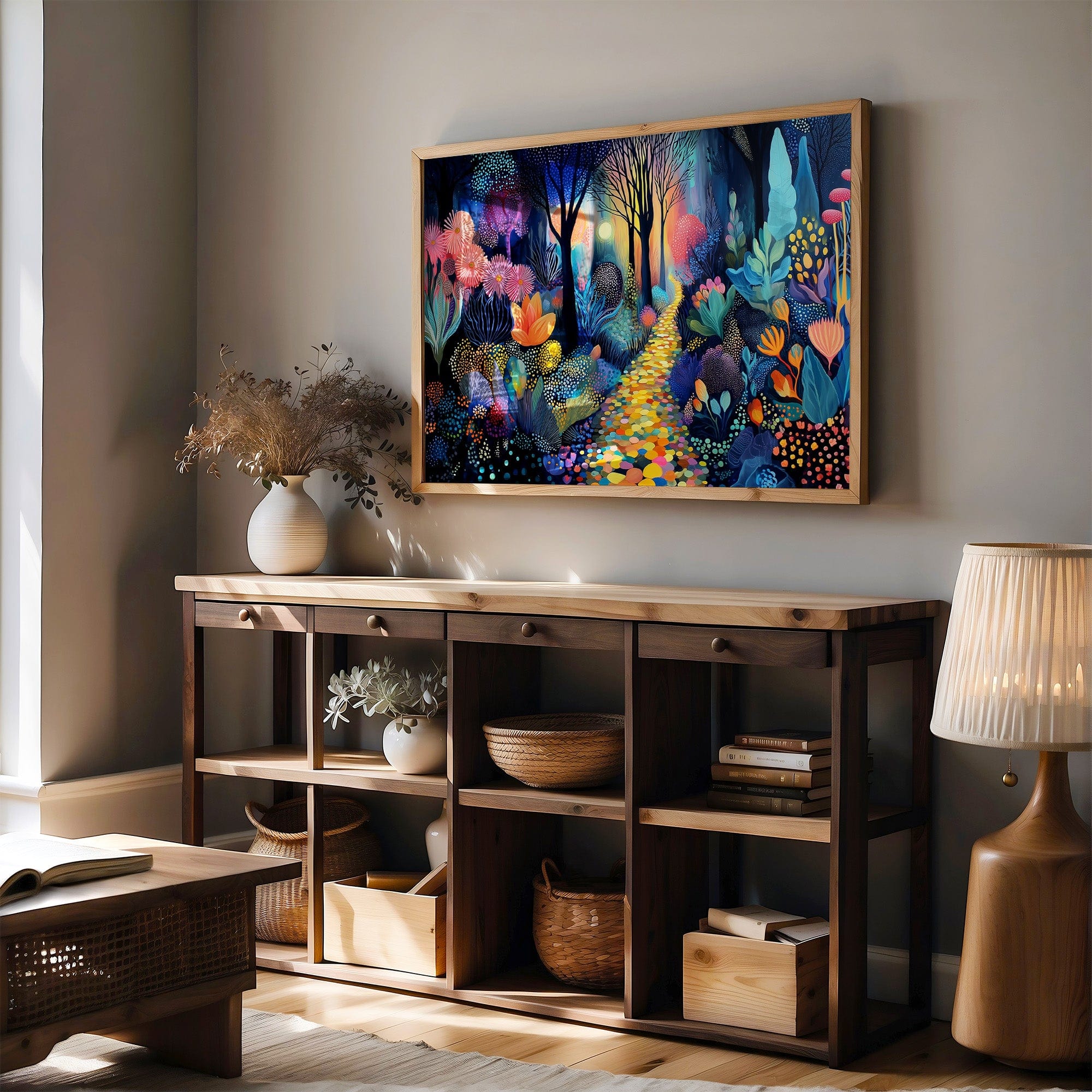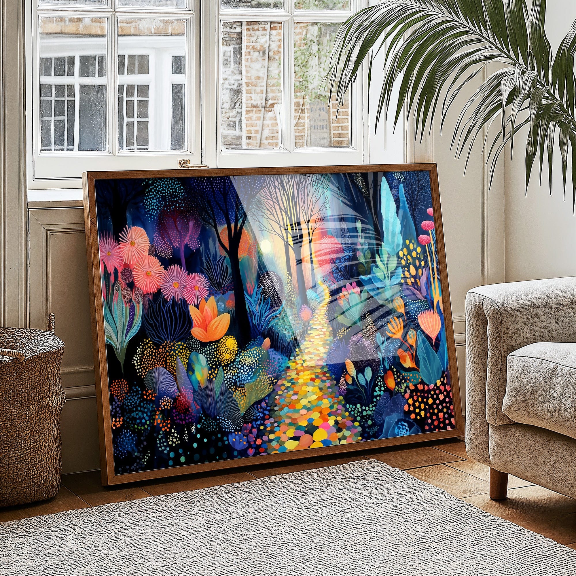 Warm afternoon light bathes a magical scene where luminous flowers bloom against an enchanted midnight backdrop. The artwork's vibrant path weaves through a fantastical garden, where coral blooms and turquoise leaves dance alongside dotted patterns that sparkle like starlight. Deep indigos and rich purples create a dreamy nocturnal atmosphere, while splashes of orange and yellow illuminate the winding trail like scattered fragments of sunset. This piece would transform a reading nook or meditation space into a portal of imagination, perfect for those seeking a daily dose of wonder in their sanctuary.