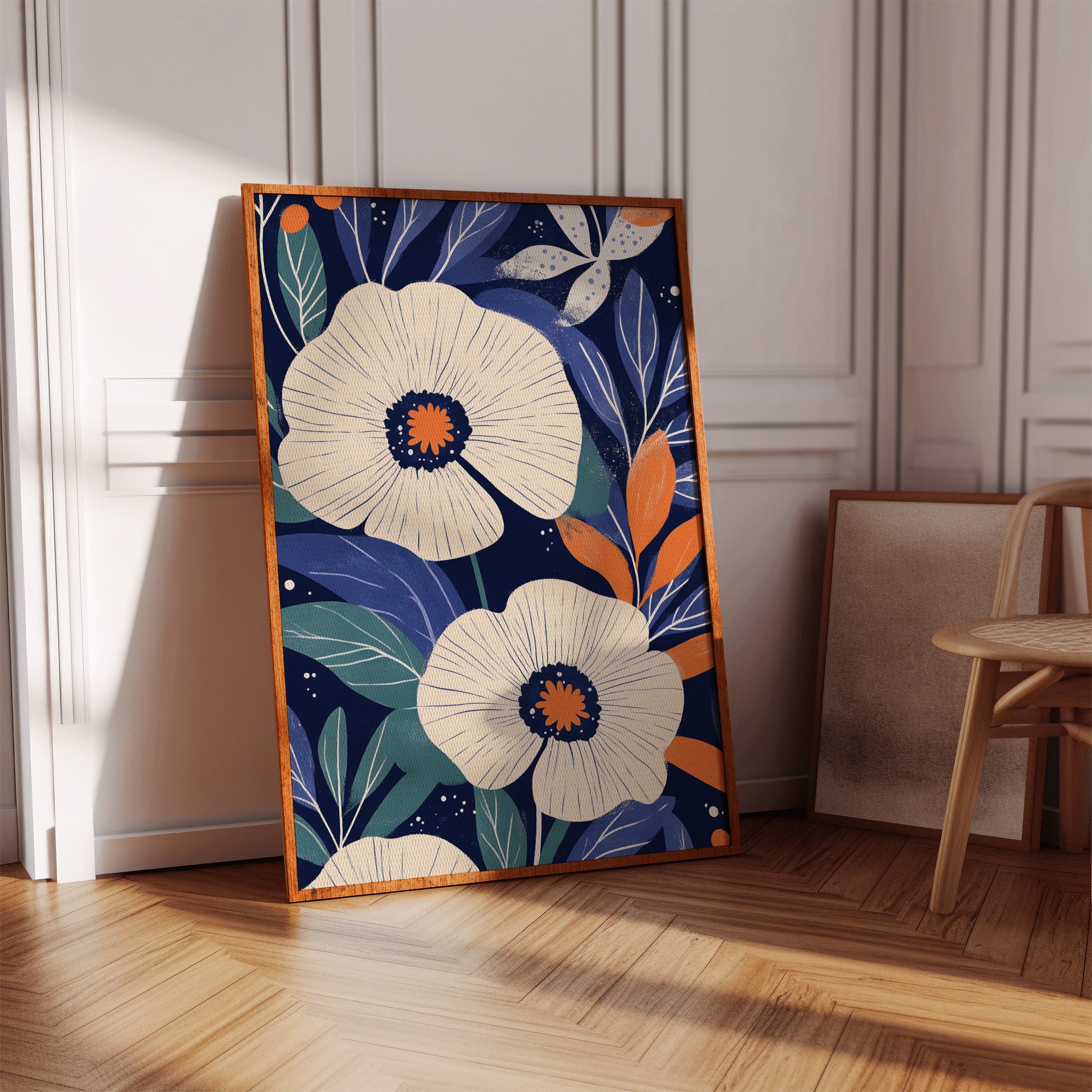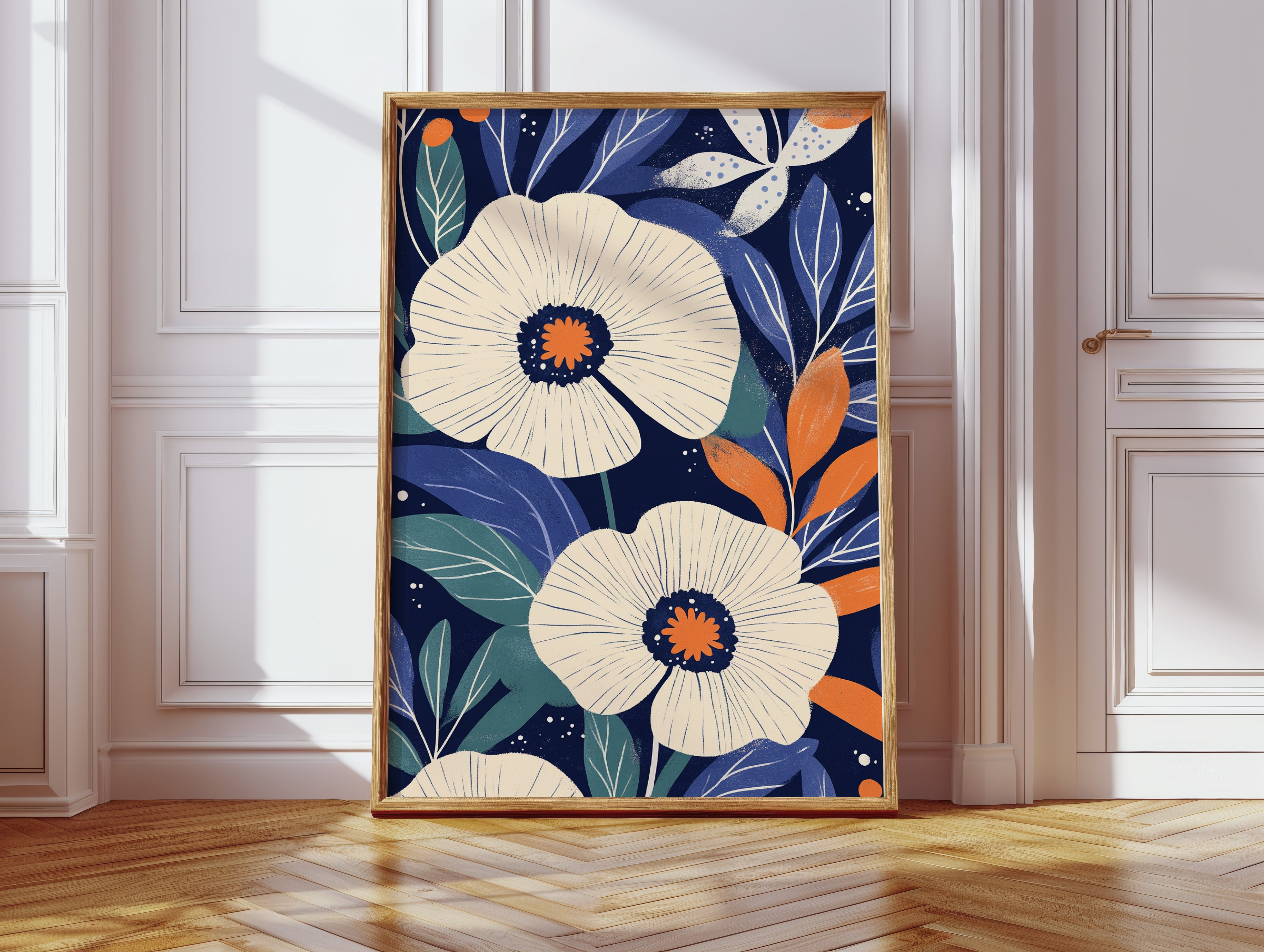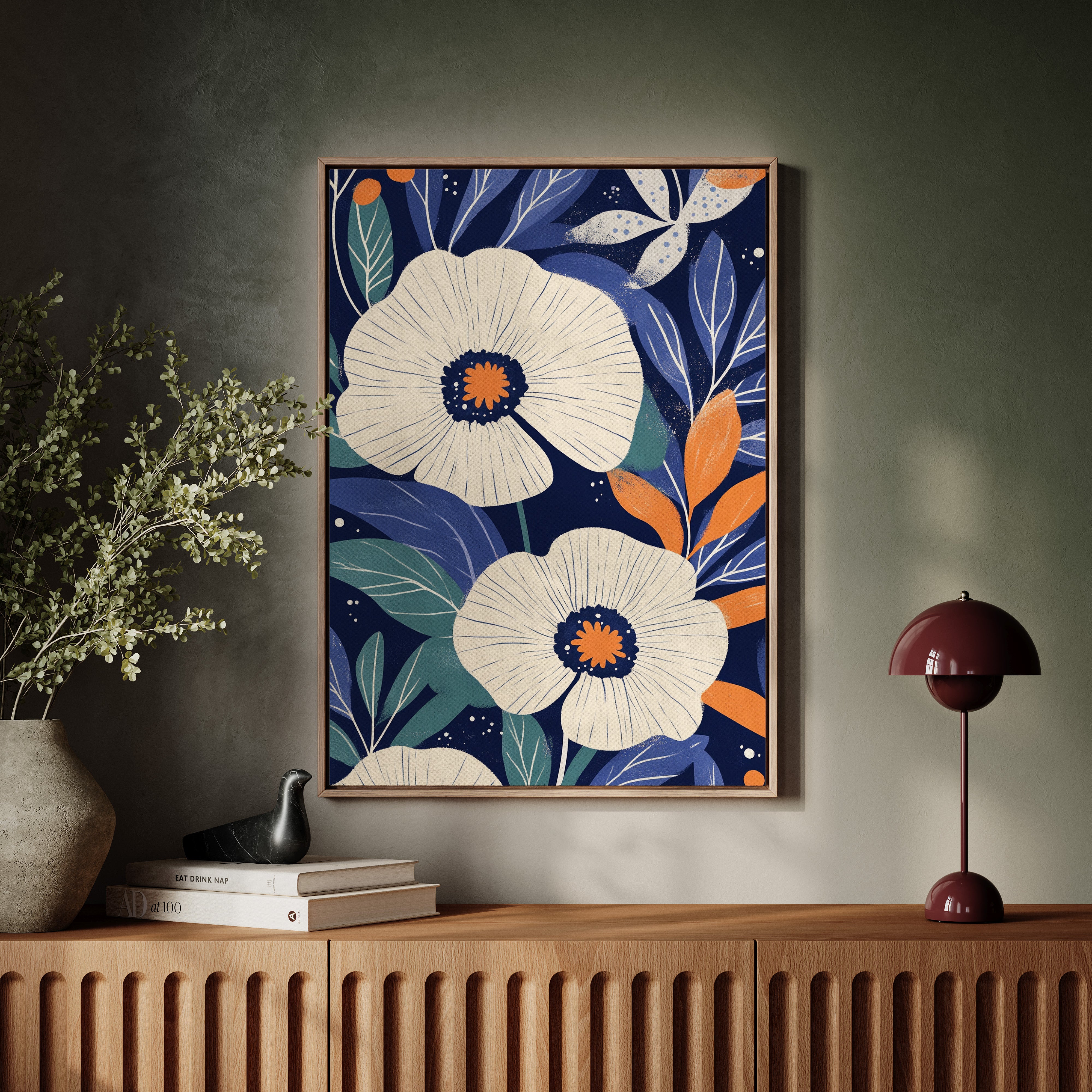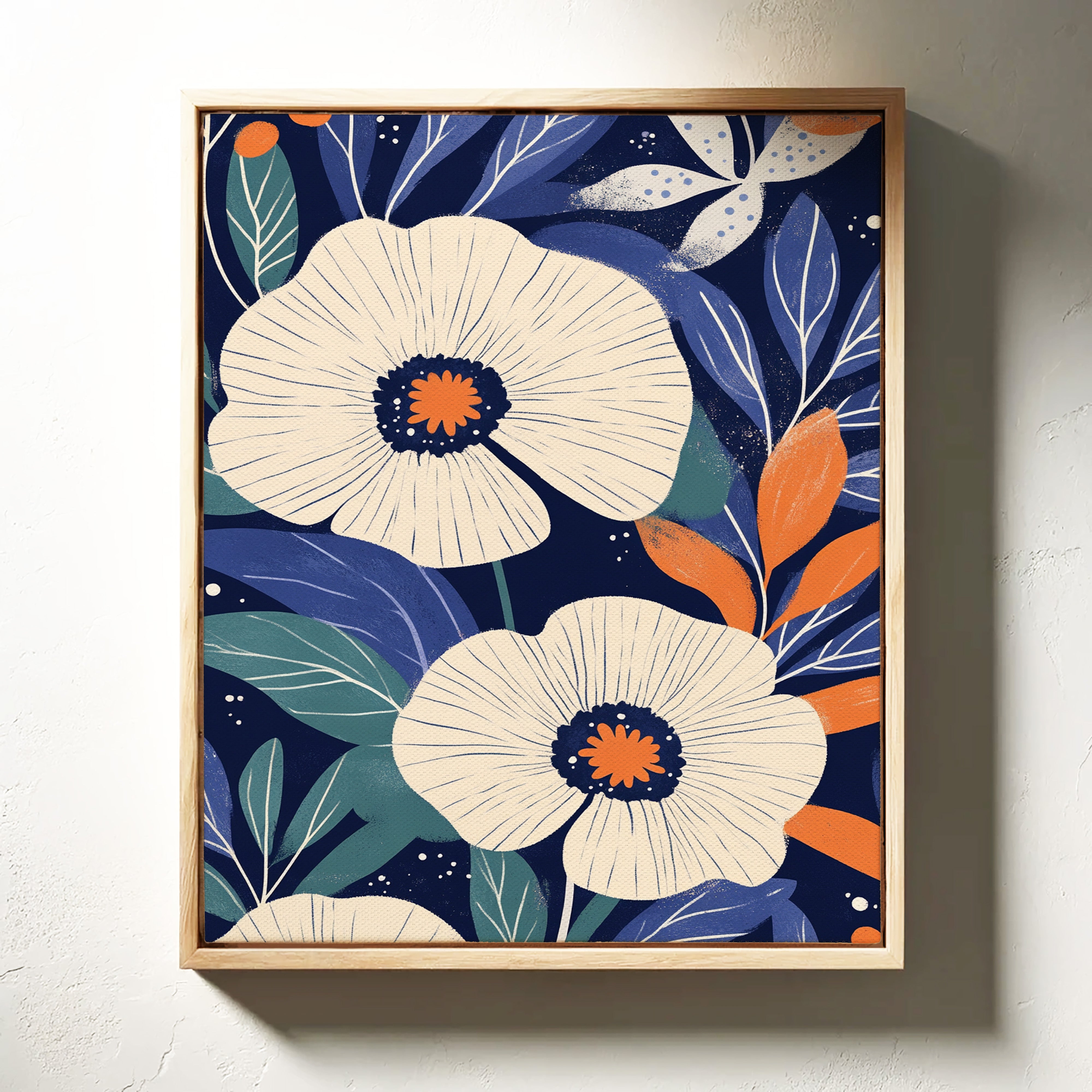 Delicate white blooms float against a deep navy canvas, their petals radiating like starbursts in the dark. Bold orange centers punctuate each flower, creating a rhythmic dance with scattered teal and indigo foliage. The contemporary illustration style brings a fresh perspective to botanical art, with textured details and precise linework that captures the essence of a moonlit garden. This piece would bring sophisticated charm to a modern dining room or create an inspiring focal point in a home office, its contrasting colors adding depth and visual interest to any space.
