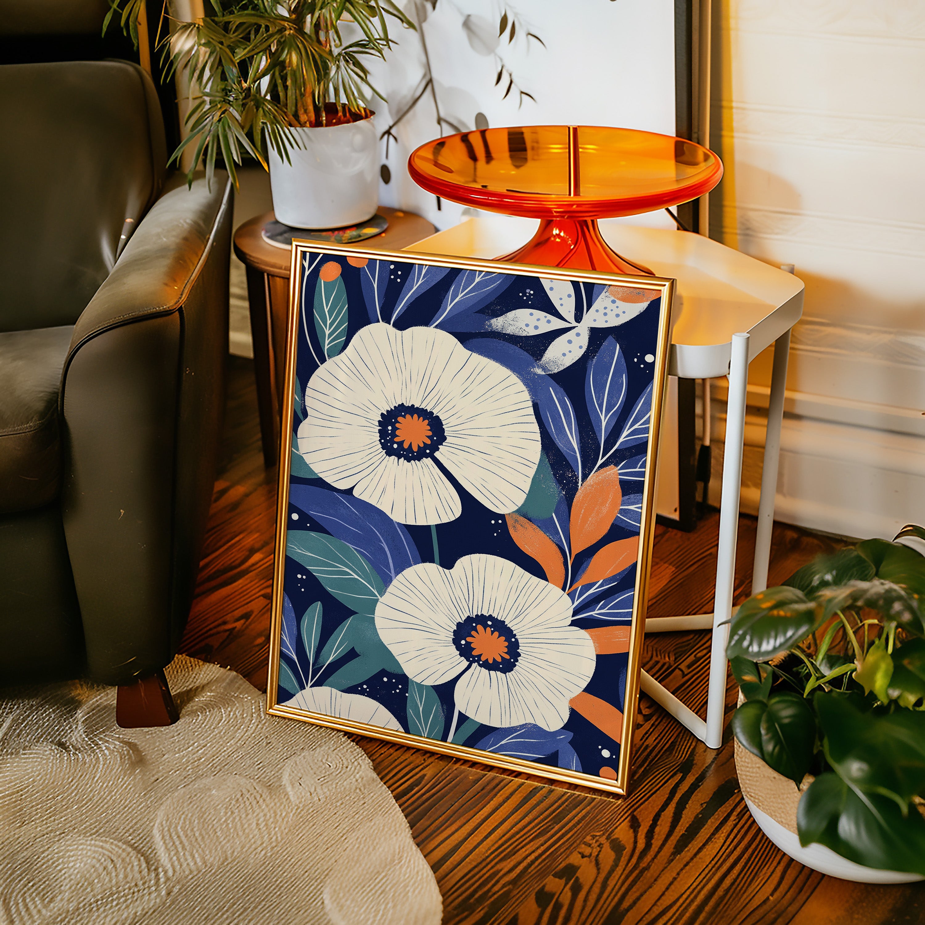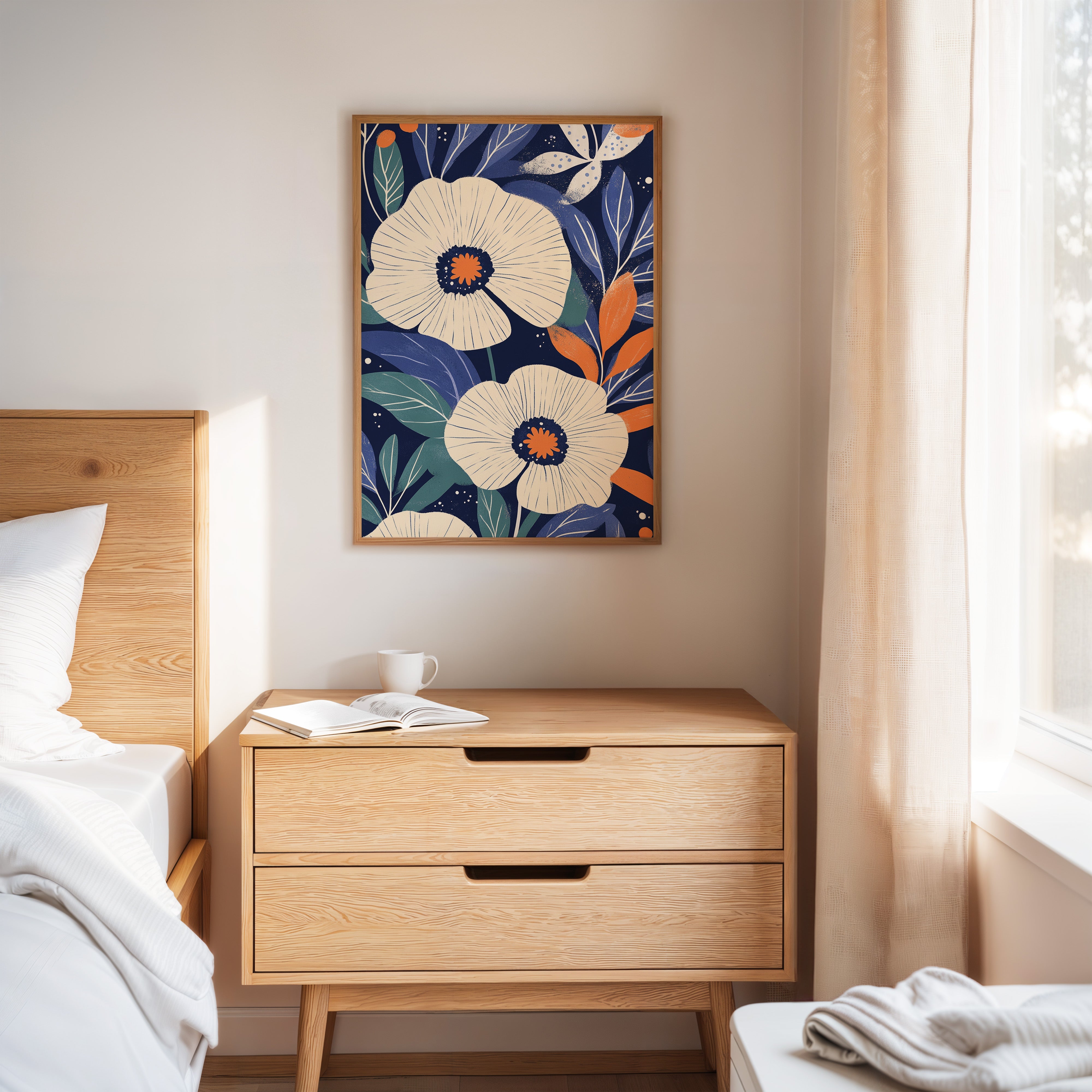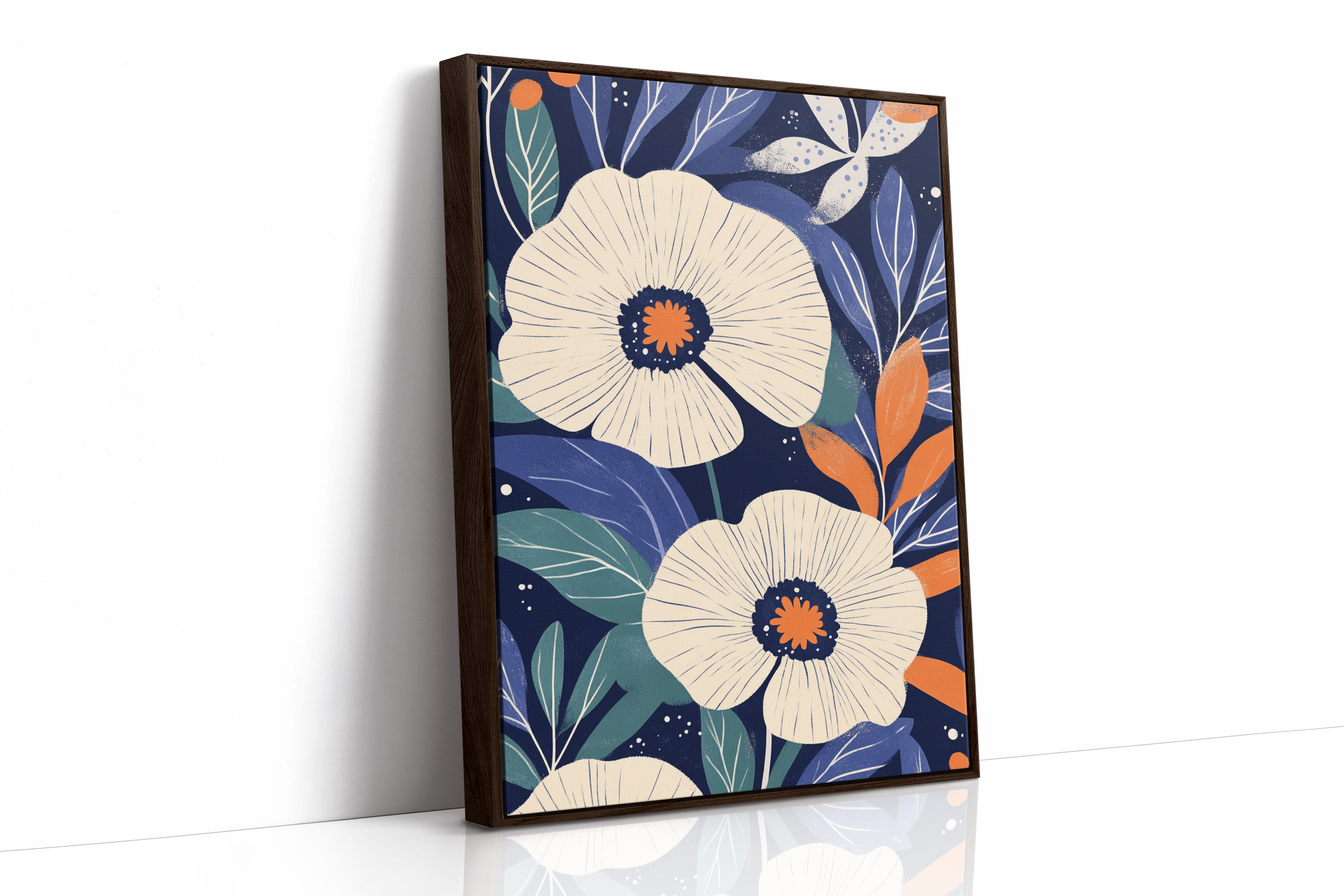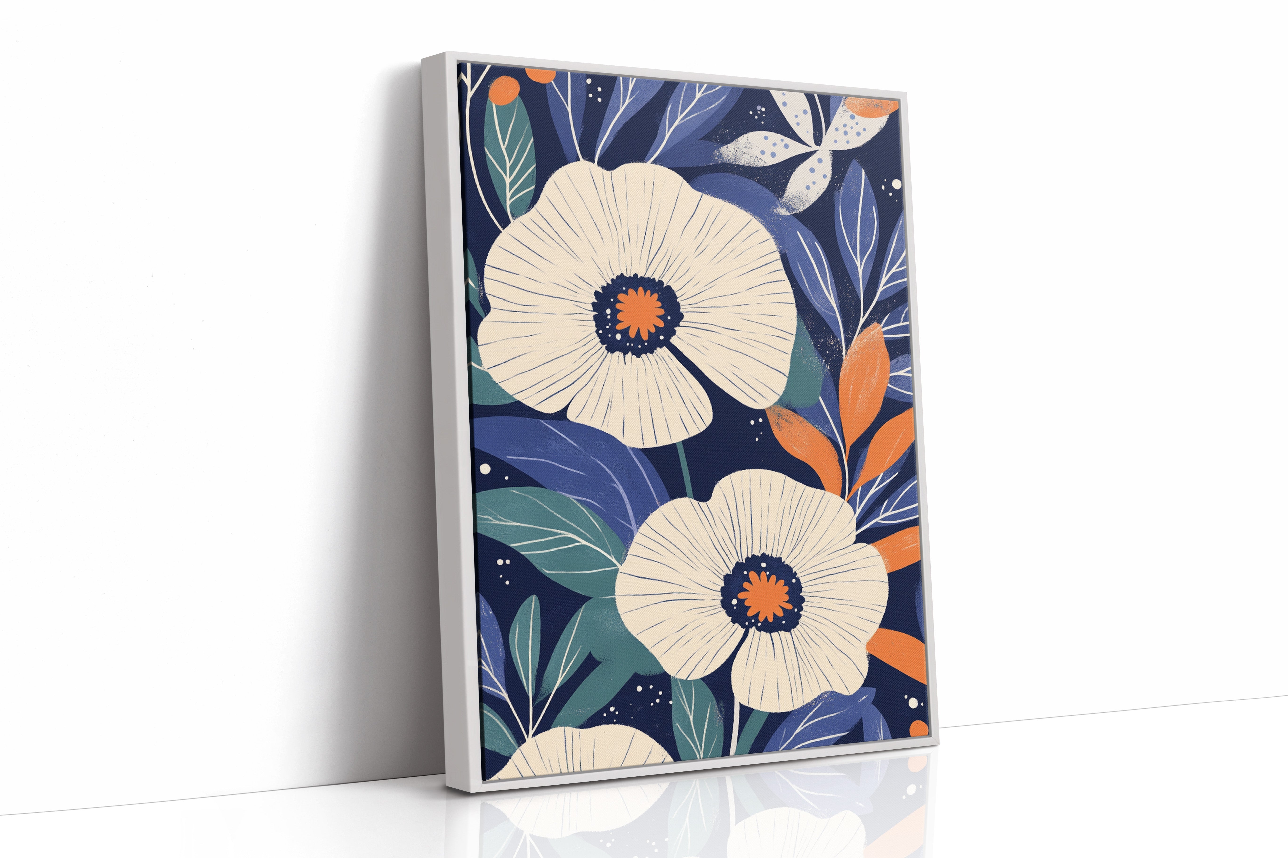 Delicate white blooms float against a deep navy canvas, their petals radiating like starbursts in the dark. Bold orange centers punctuate each flower, creating a rhythmic dance with scattered teal and indigo foliage. The contemporary illustration style brings a fresh perspective to botanical art, with textured details and precise linework that captures the essence of a moonlit garden. This piece would bring sophisticated charm to a modern dining room or create an inspiring focal point in a home office, its contrasting colors adding depth and visual interest to any space.