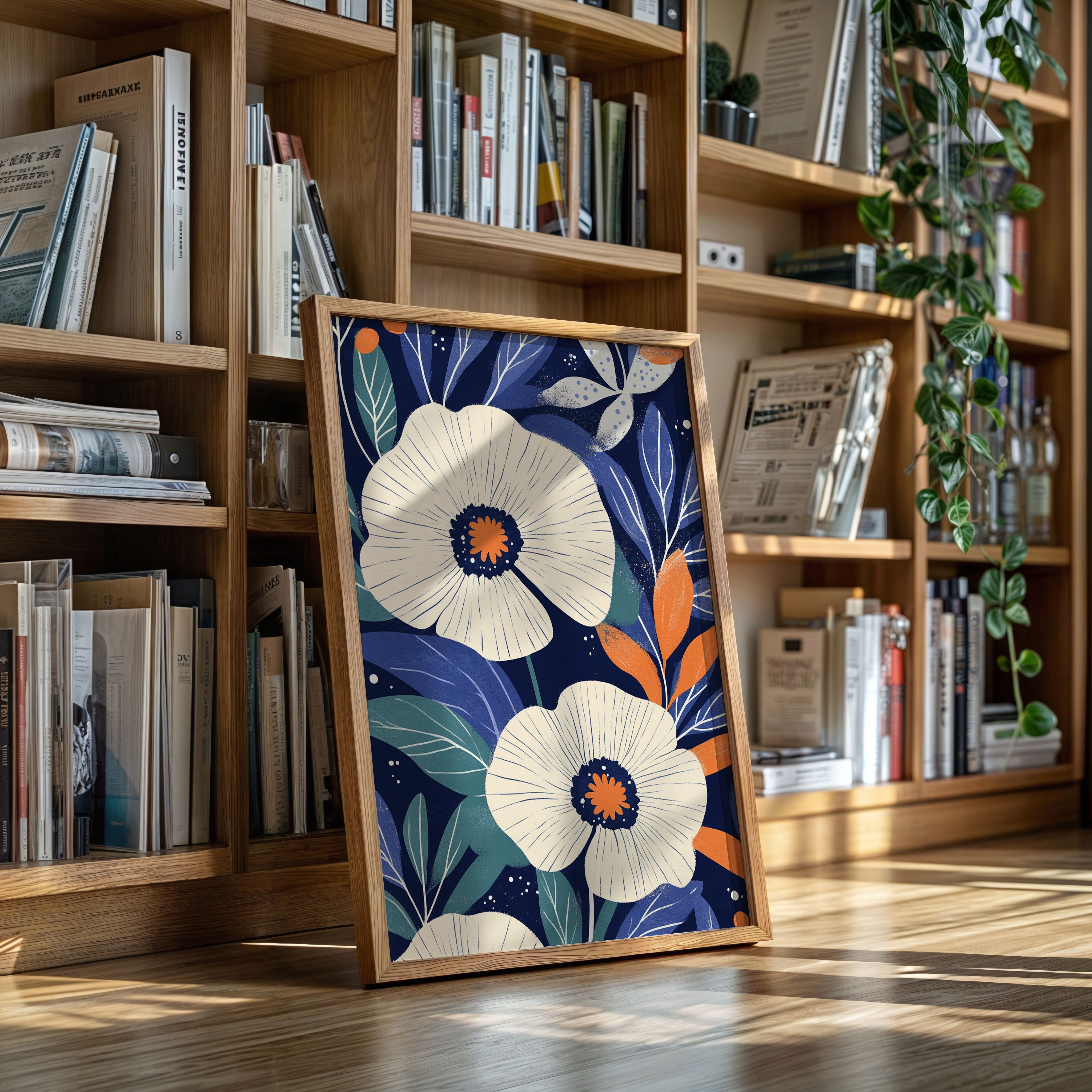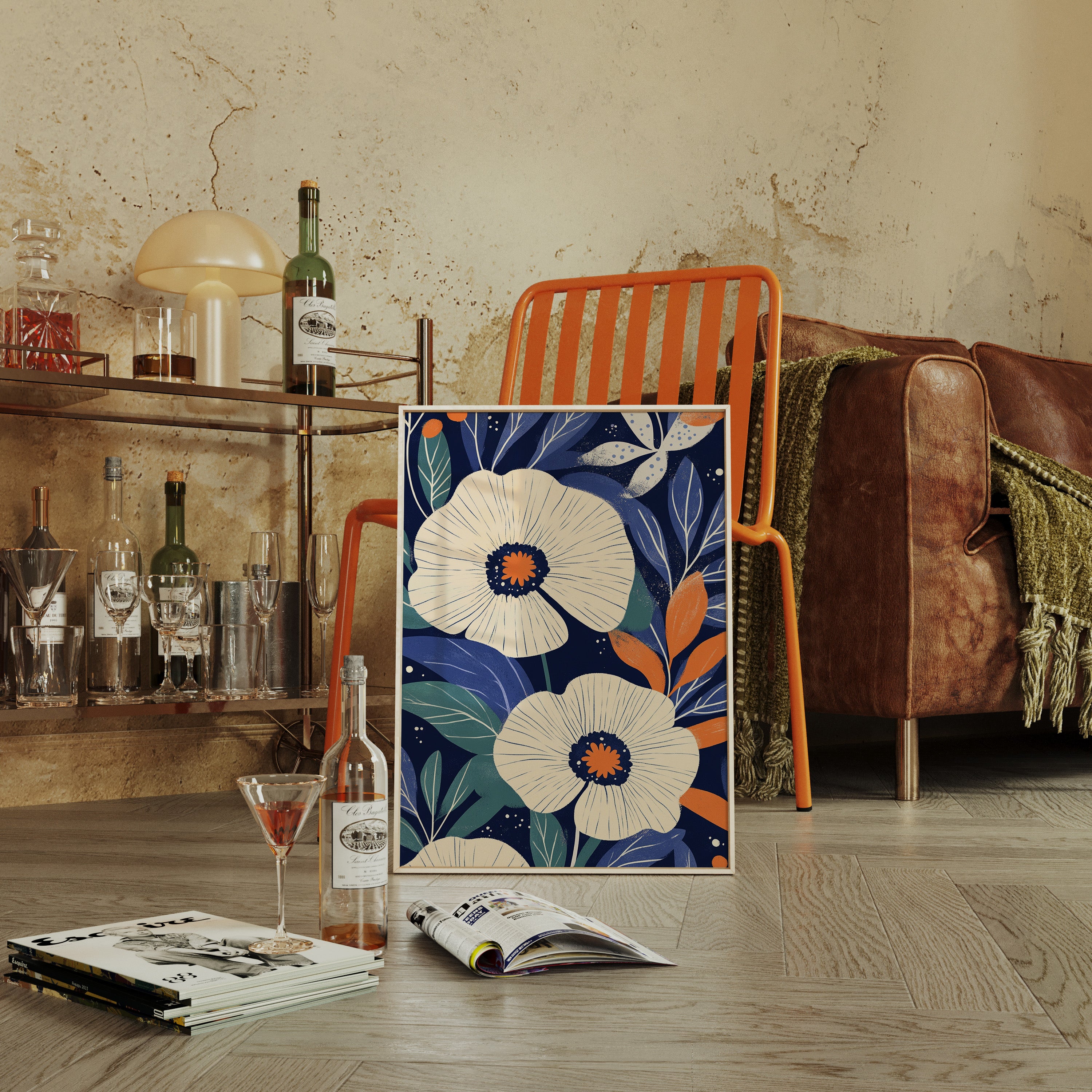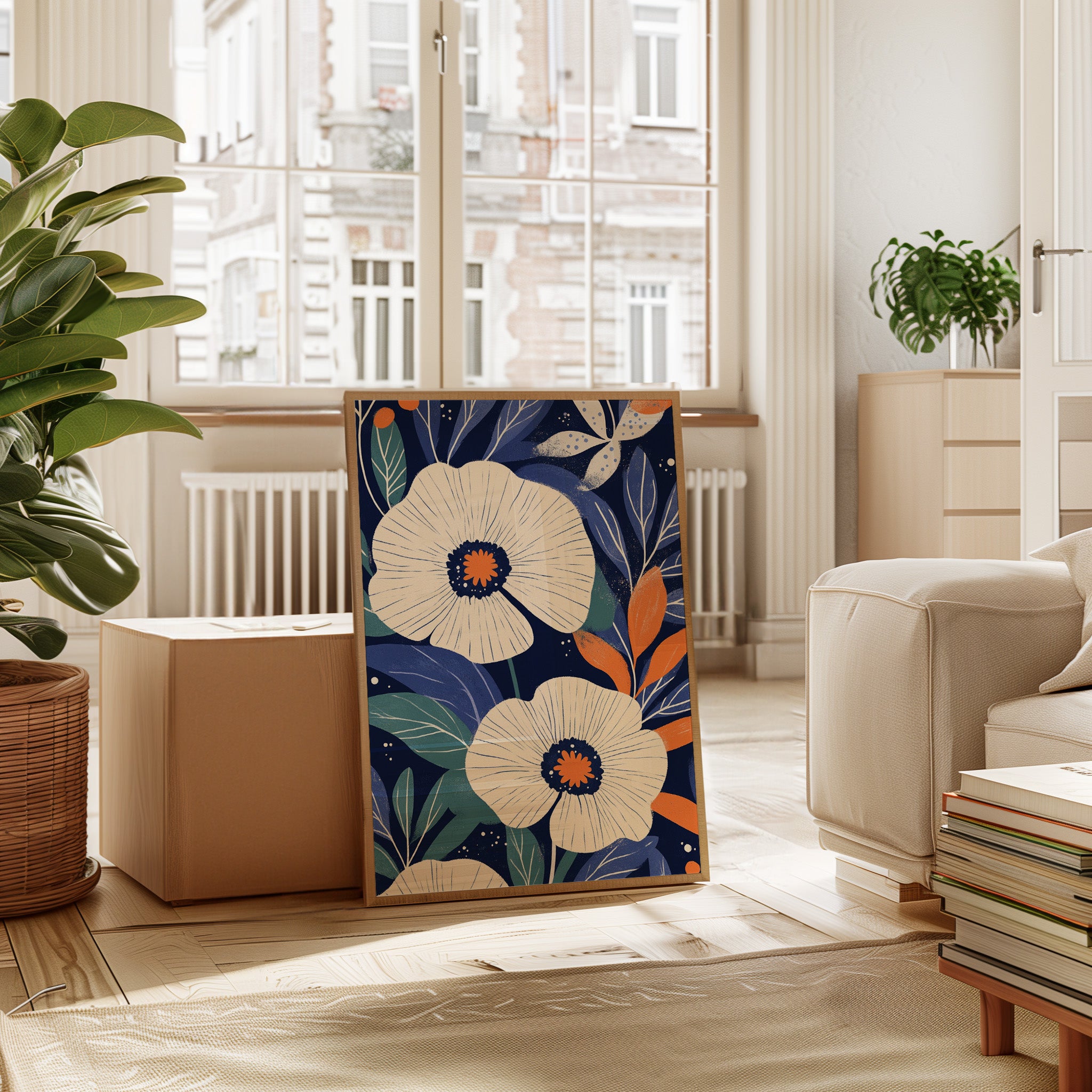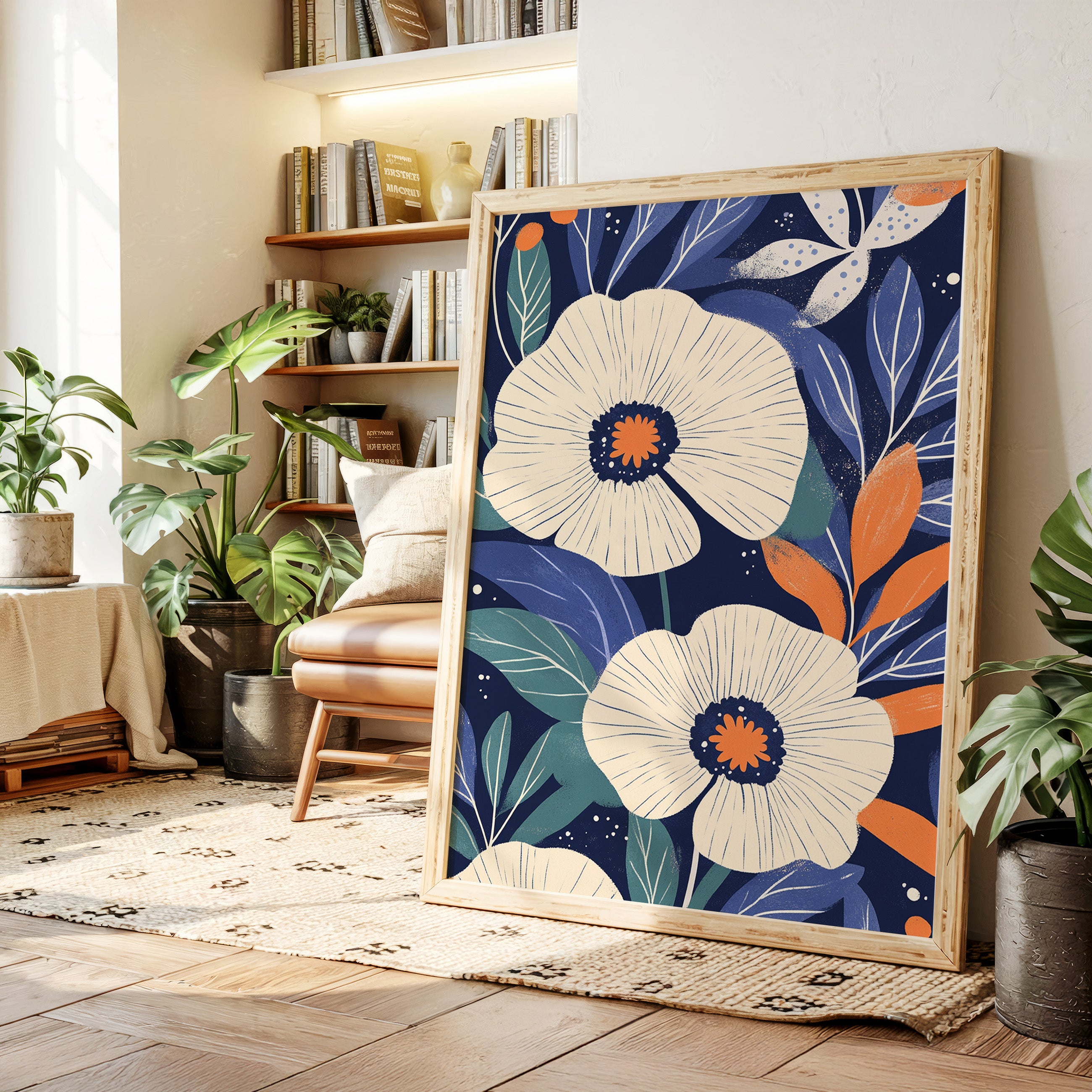 Delicate white blooms float against a deep navy canvas, their petals radiating like starbursts in the dark. Bold orange centers punctuate each flower, creating a rhythmic dance with scattered teal and indigo foliage. The contemporary illustration style brings a fresh perspective to botanical art, with textured details and precise linework that captures the essence of a moonlit garden. This piece would bring sophisticated charm to a modern dining room or create an inspiring focal point in a home office, its contrasting colors adding depth and visual interest to any space.