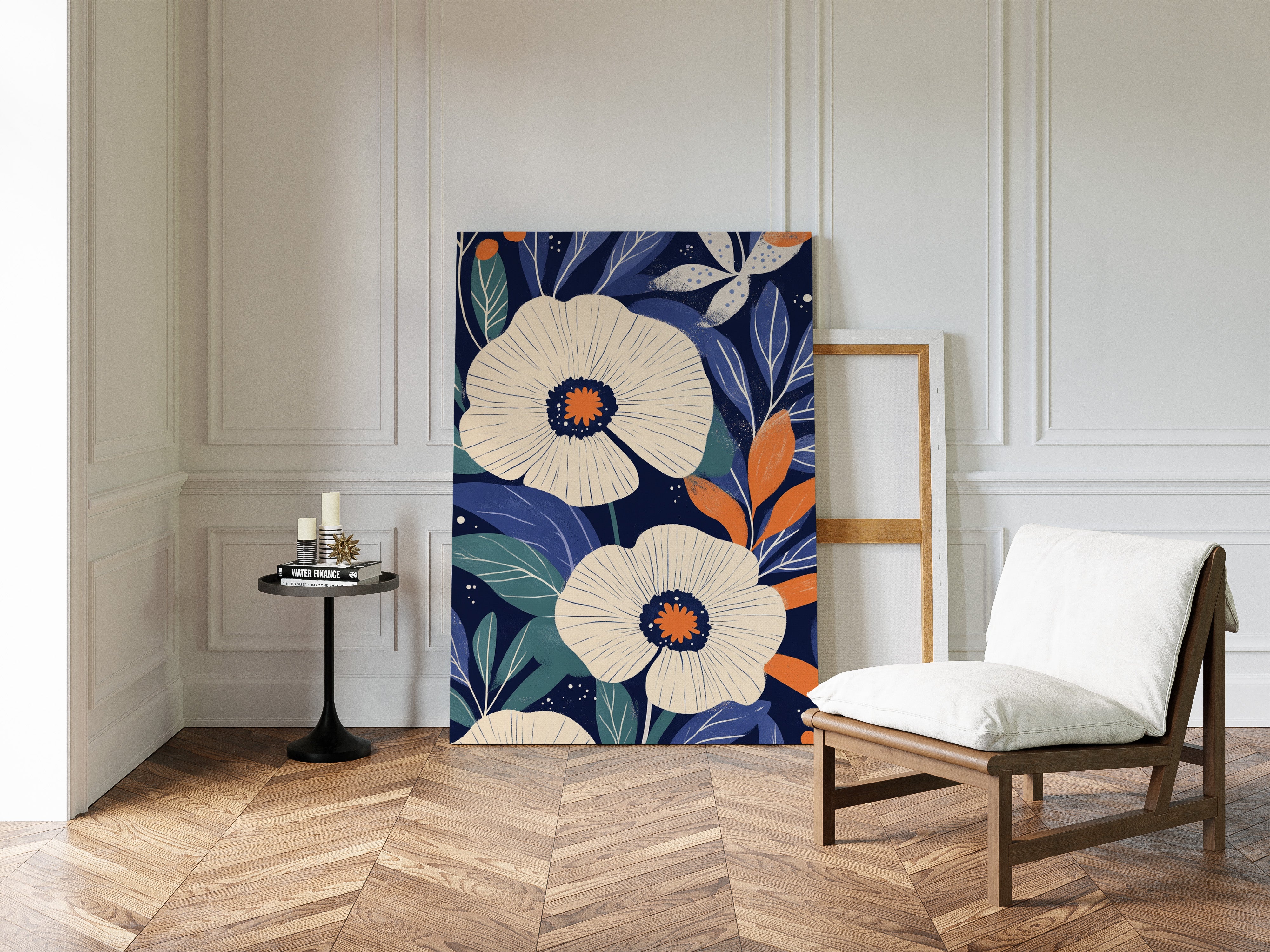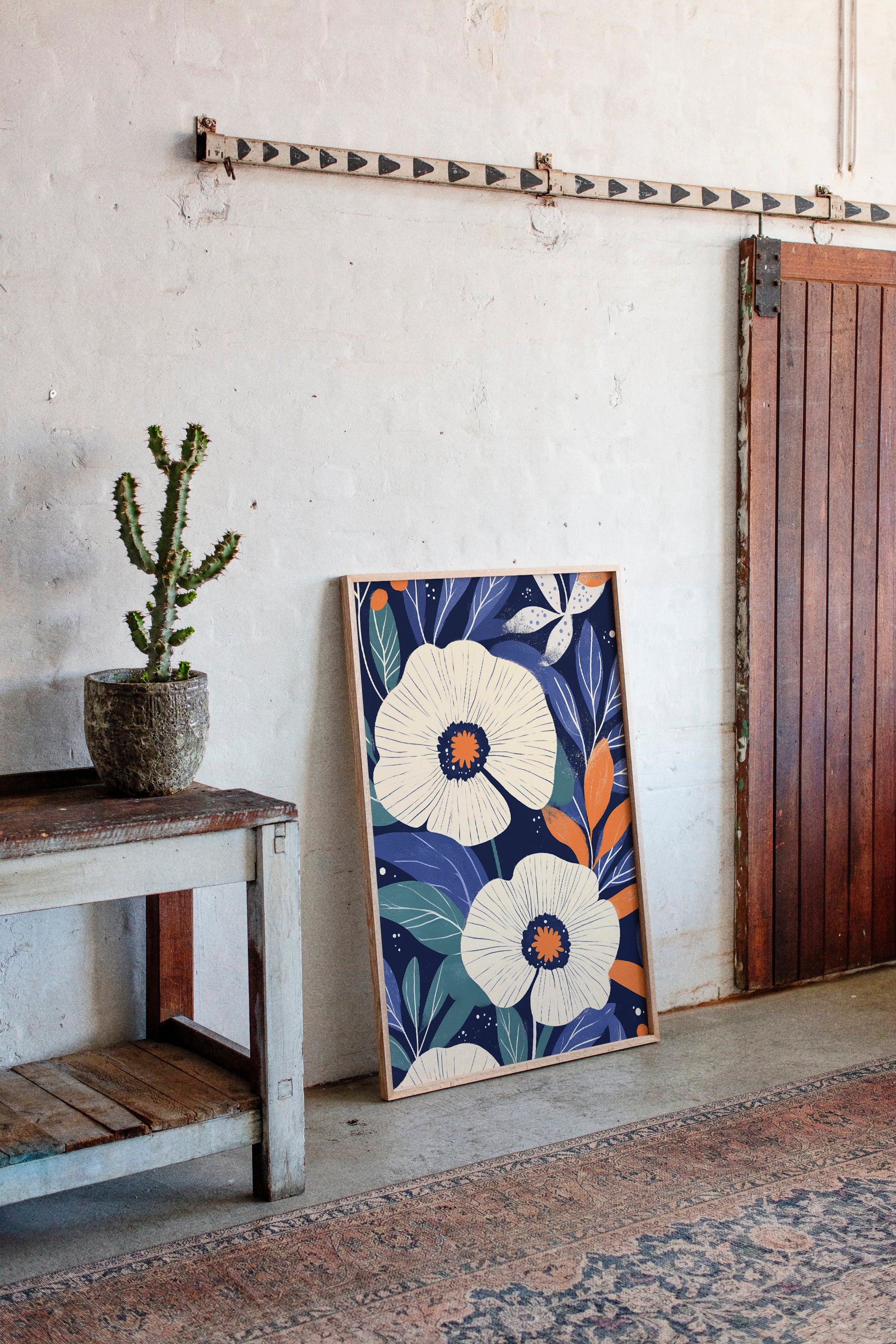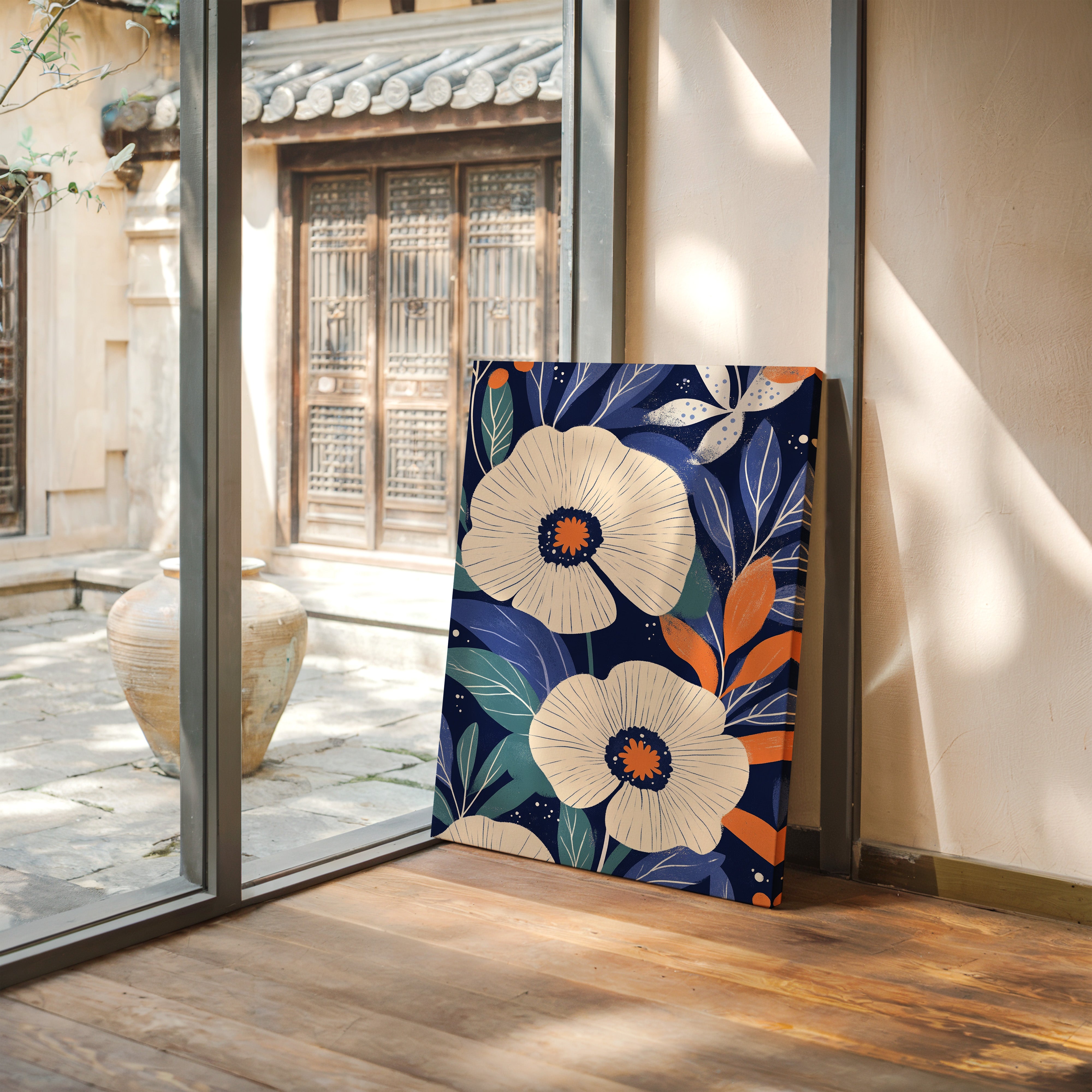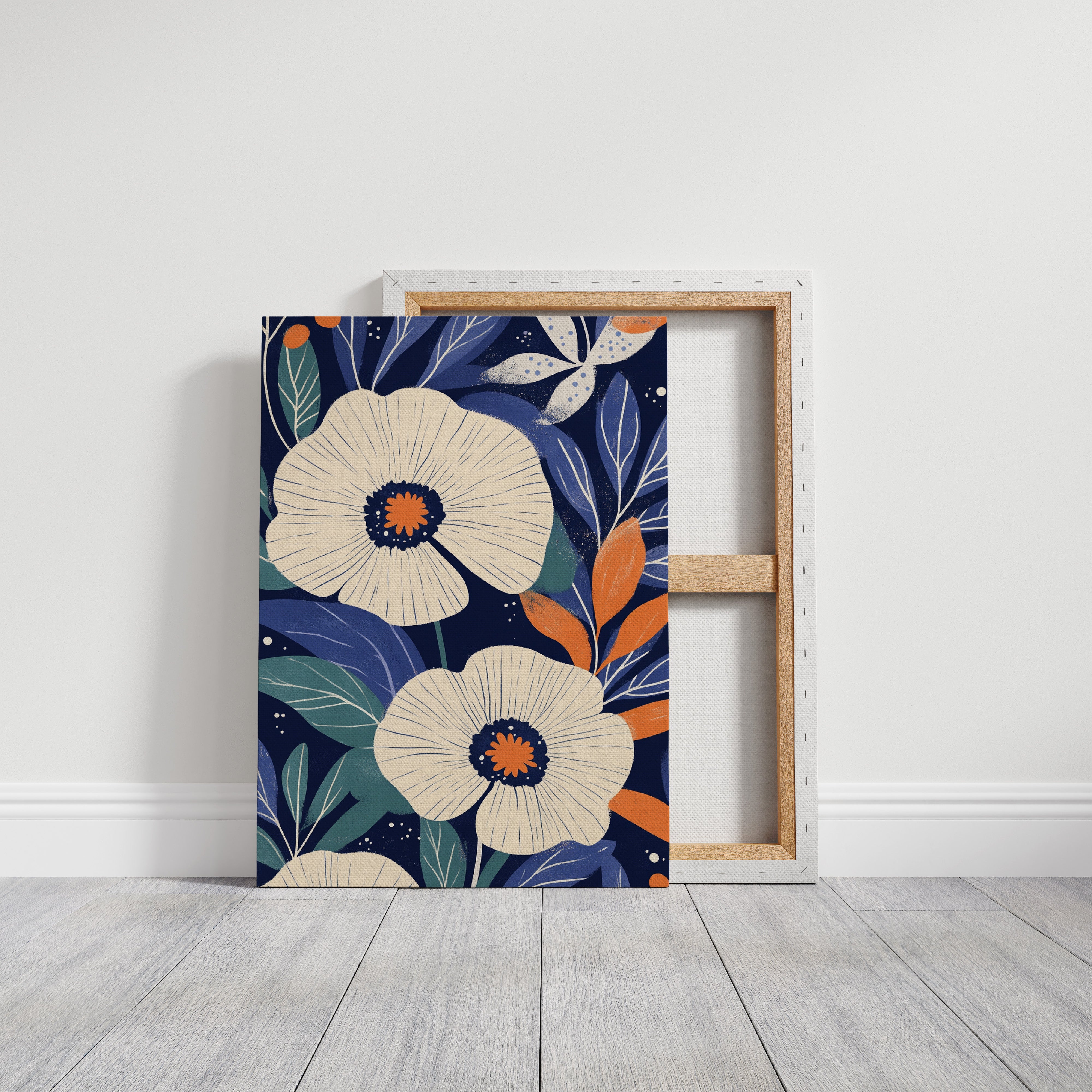 Delicate white blooms float against a deep navy canvas, their petals radiating like starbursts in the dark. Bold orange centers punctuate each flower, creating a rhythmic dance with scattered teal and indigo foliage. The contemporary illustration style brings a fresh perspective to botanical art, with textured details and precise linework that captures the essence of a moonlit garden. This piece would bring sophisticated charm to a modern dining room or create an inspiring focal point in a home office, its contrasting colors adding depth and visual interest to any space.