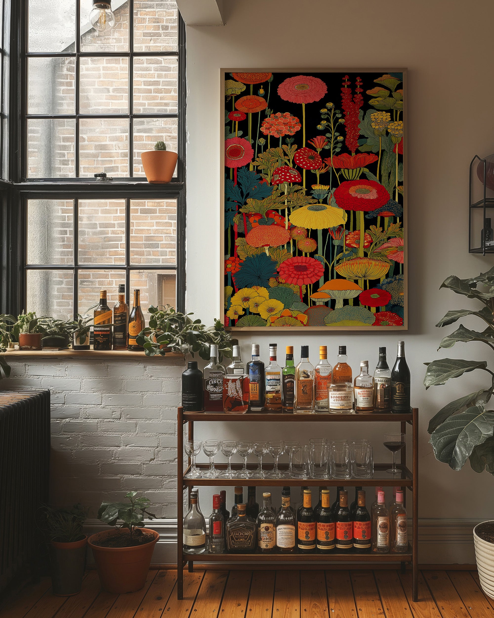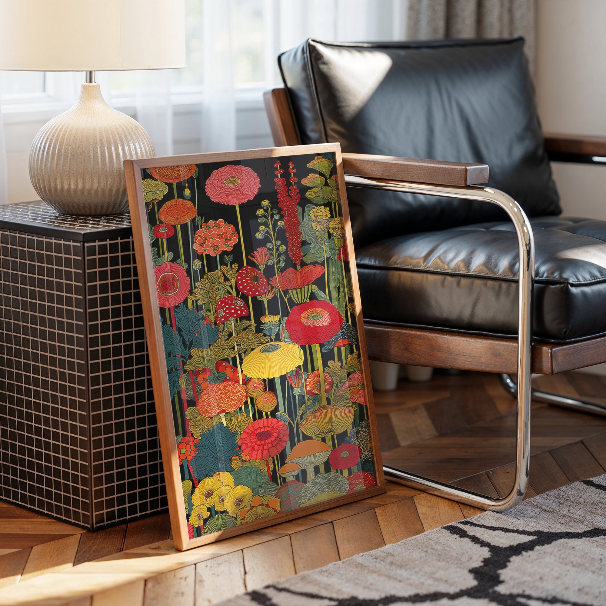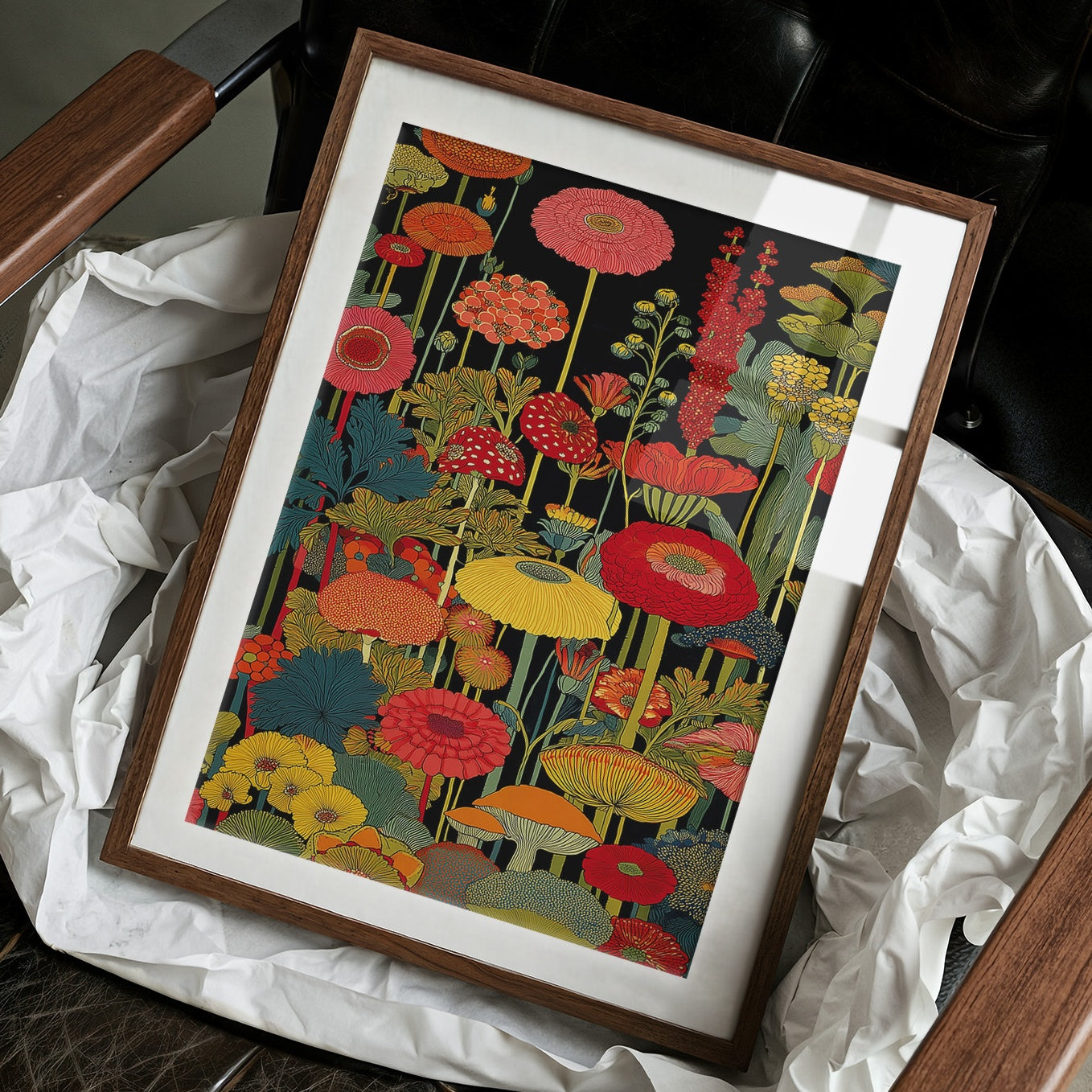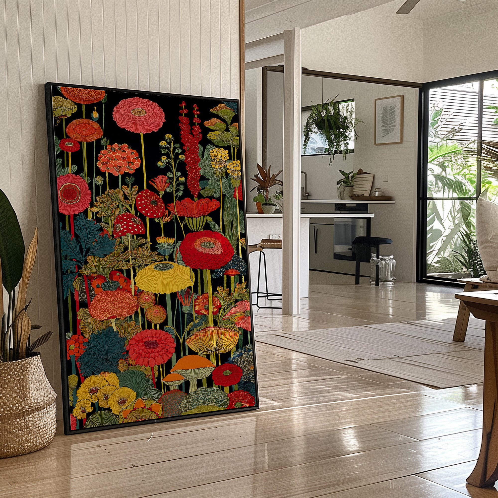 A vibrant botanical fantasy springs to life against an inky black backdrop, where coral poppies and golden mushrooms dance in an enchanted arrangement. The illustration captures a whimsical folk art spirit, with detailed patterns and layered blooms creating a magical woodland scene that feels both vintage and timelessly modern. This piece would bring a spark of joy and imagination to a reading nook, home office, or any space seeking a touch of botanical wonder.