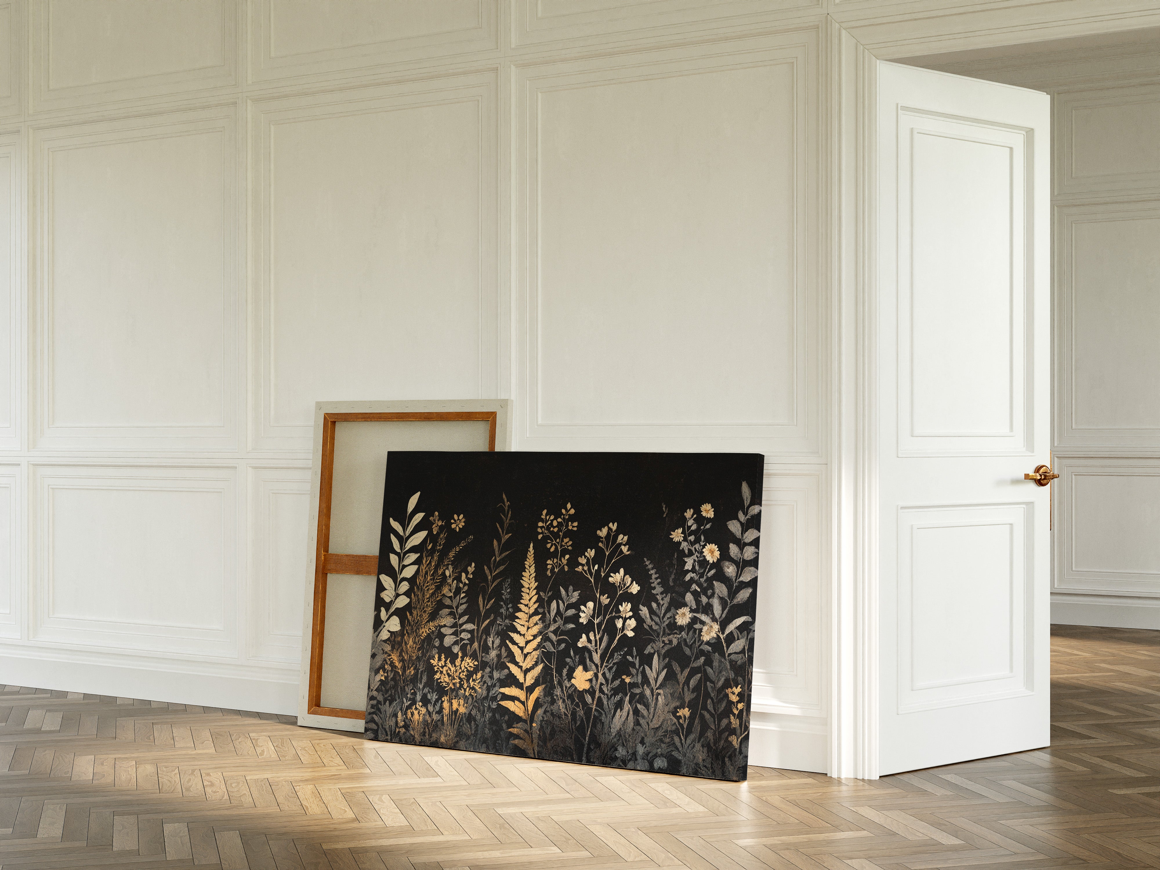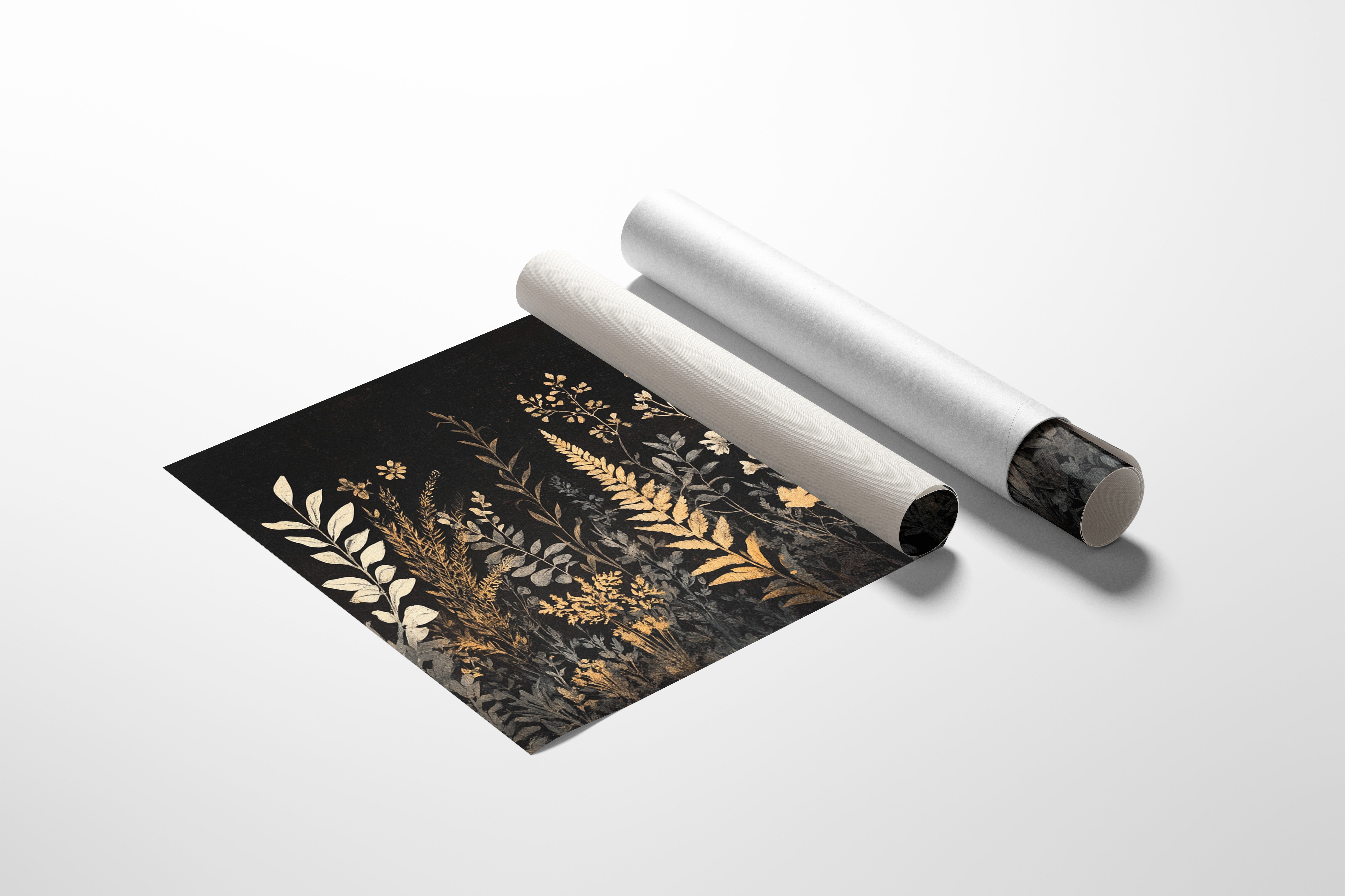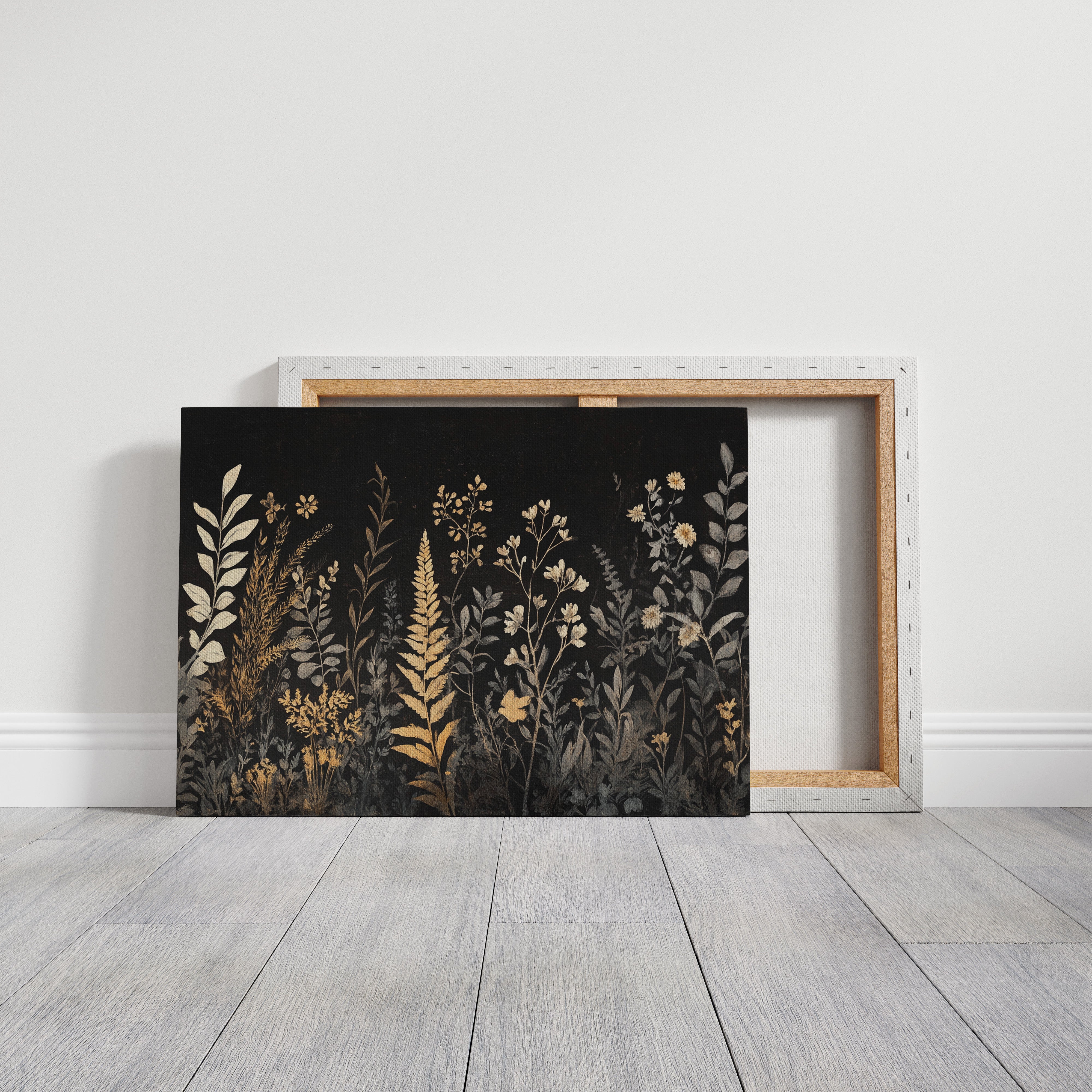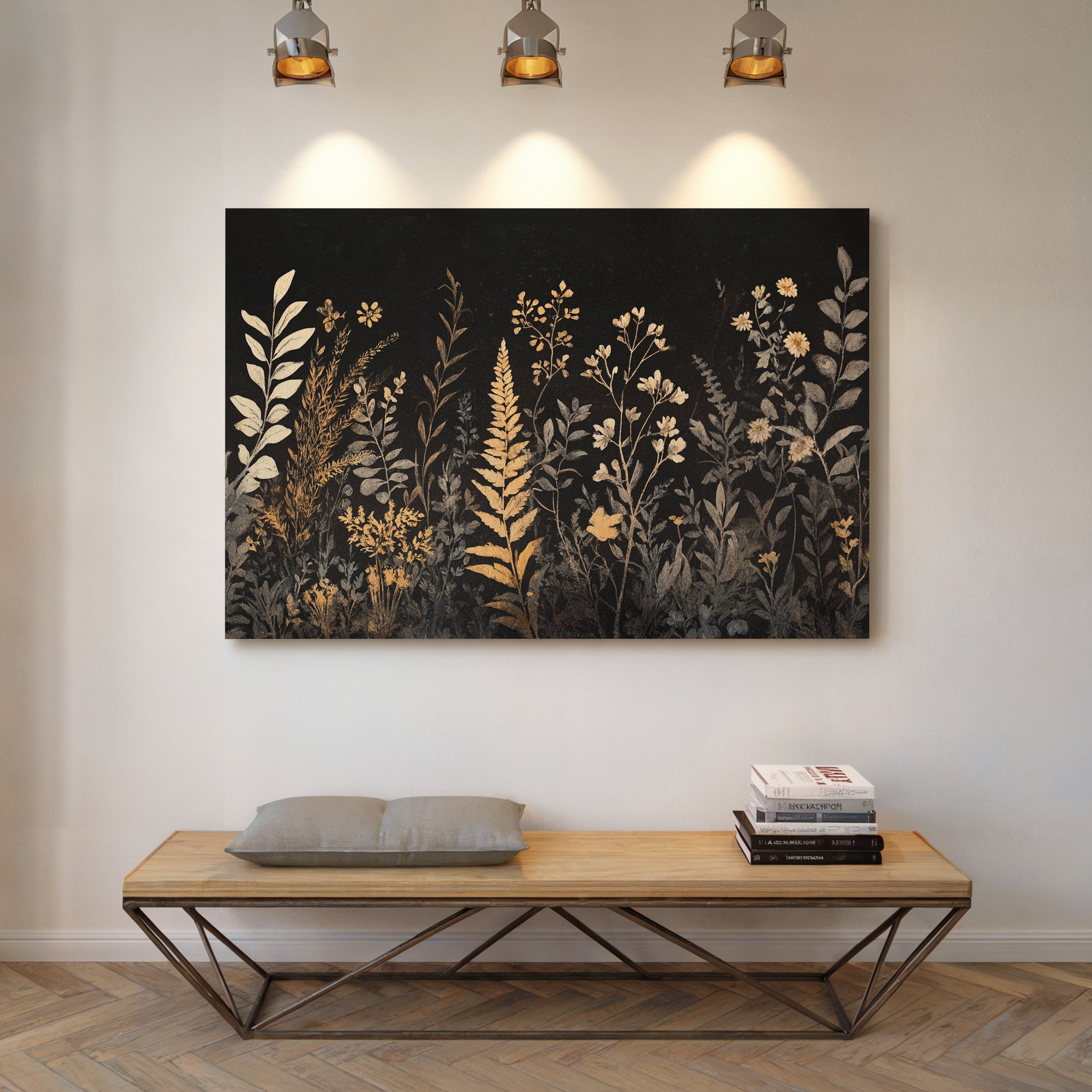 In the depths of darkness, delicate botanicals rise like remembered dreams, their golden forms illuminated against the velvet night. Silver-grey and burnished gold dance together in an elegant display of wild meadow flowers, ferns, and graceful stems reaching skyward. The composition weaves a tapestry of metallic warmth and cool shadows, creating a mysterious nocturnal garden where each plant seems to hold its own quiet story. This sophisticated botanical study brings an air of timeless elegance to any space, perfect for creating a focal point in a modern dining room or adding drama to a minimalist bedroom suite.