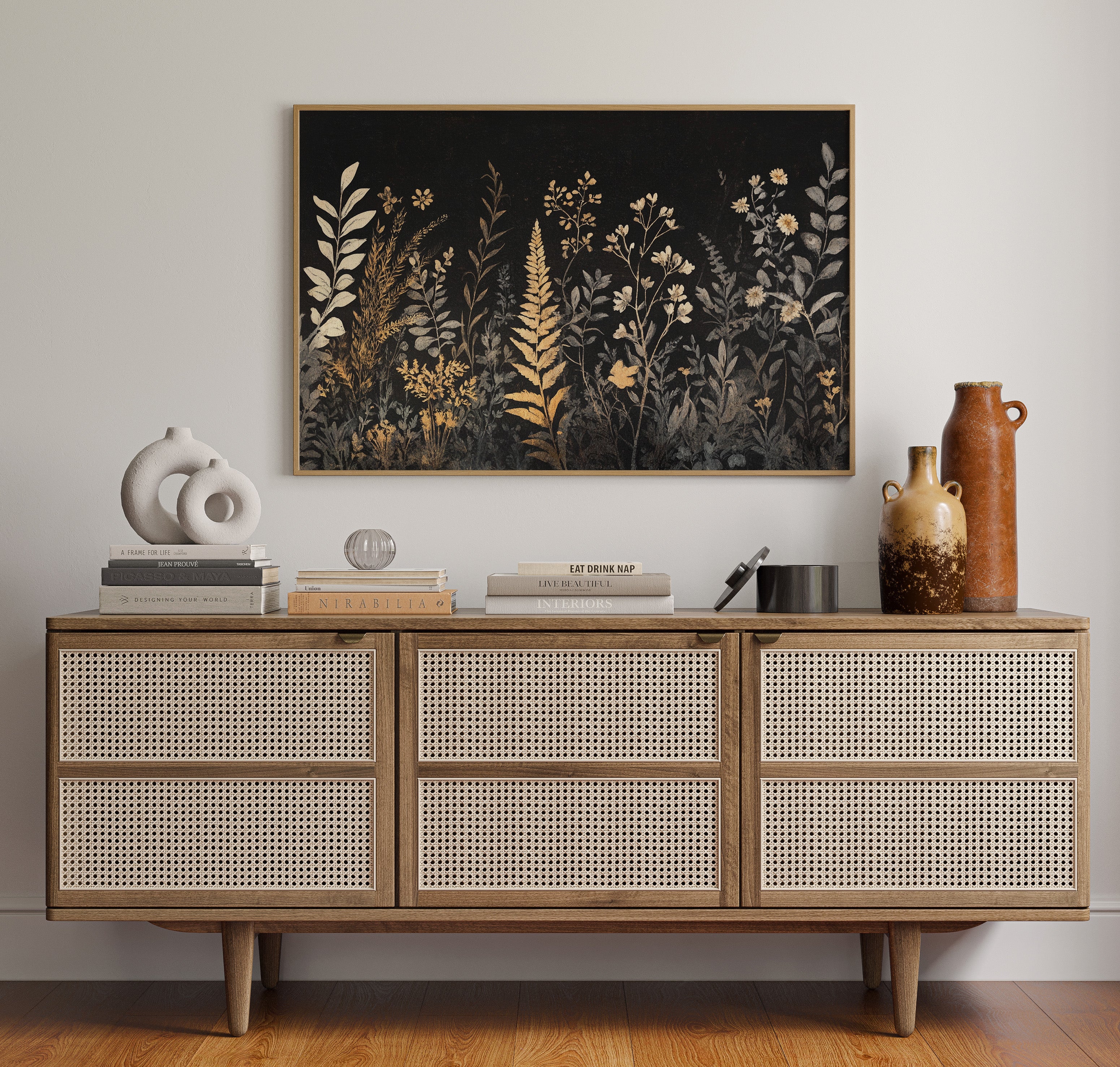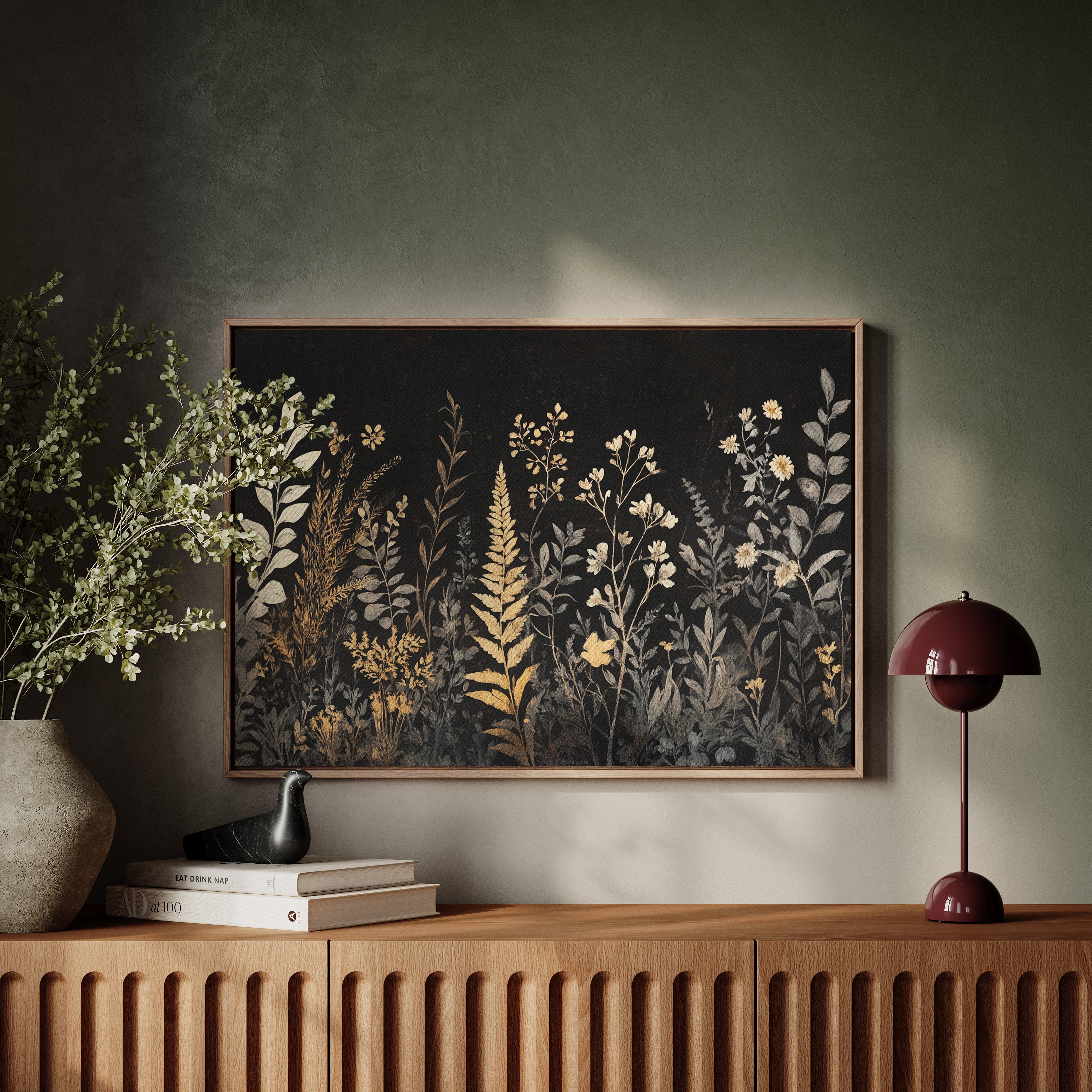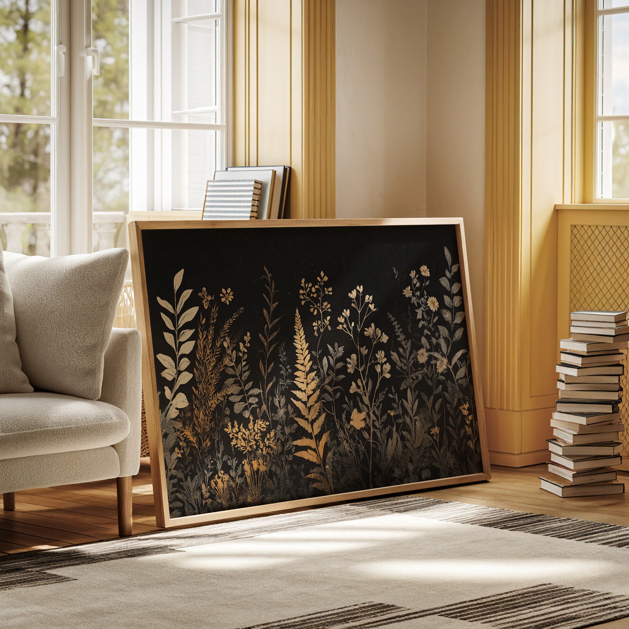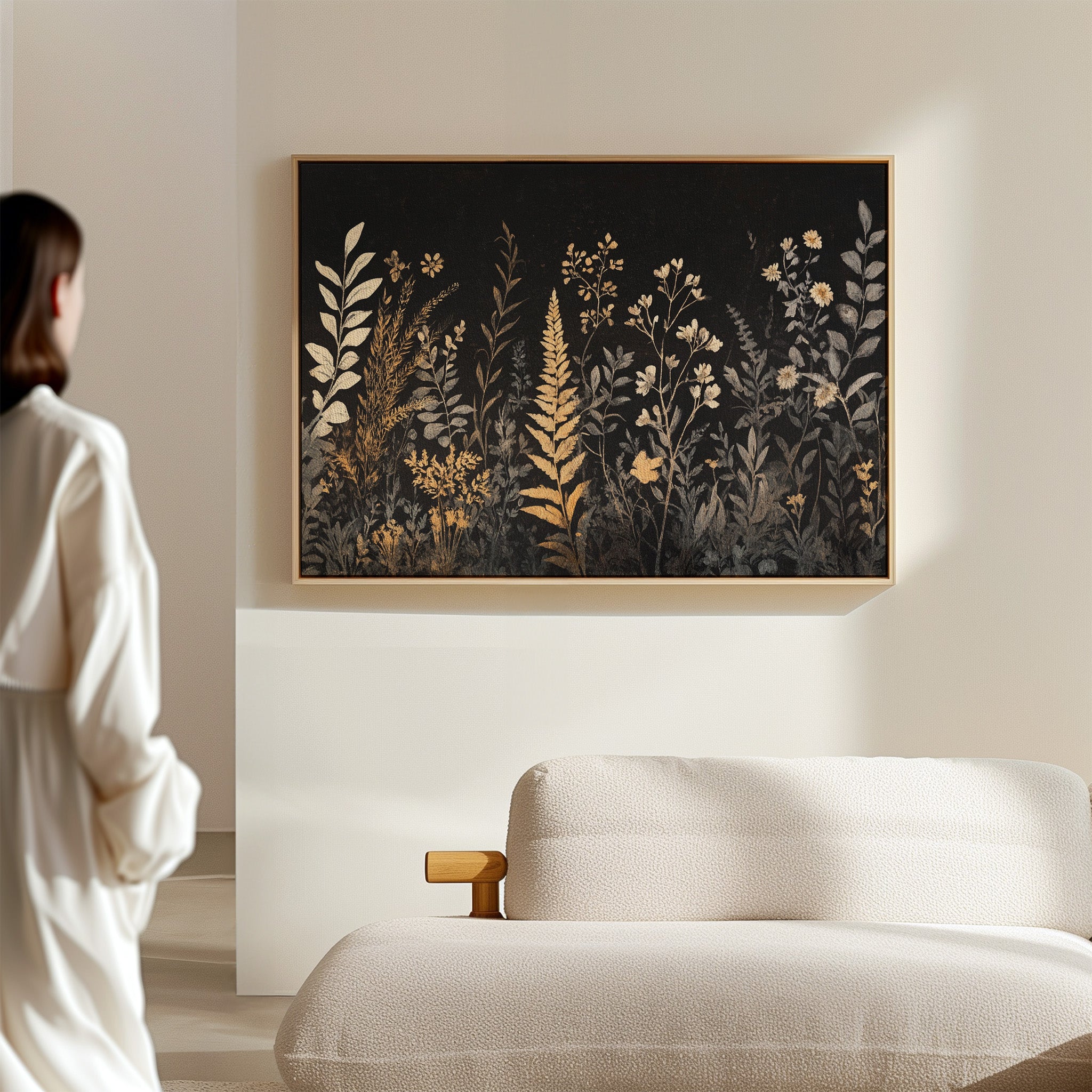 In the depths of darkness, delicate botanicals rise like remembered dreams, their golden forms illuminated against the velvet night. Silver-grey and burnished gold dance together in an elegant display of wild meadow flowers, ferns, and graceful stems reaching skyward. The composition weaves a tapestry of metallic warmth and cool shadows, creating a mysterious nocturnal garden where each plant seems to hold its own quiet story. This sophisticated botanical study brings an air of timeless elegance to any space, perfect for creating a focal point in a modern dining room or adding drama to a minimalist bedroom suite.