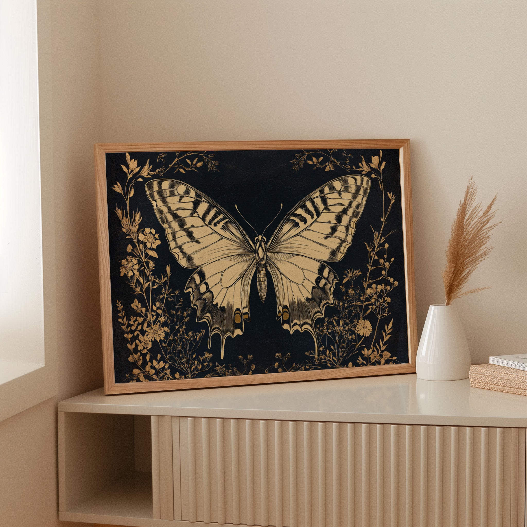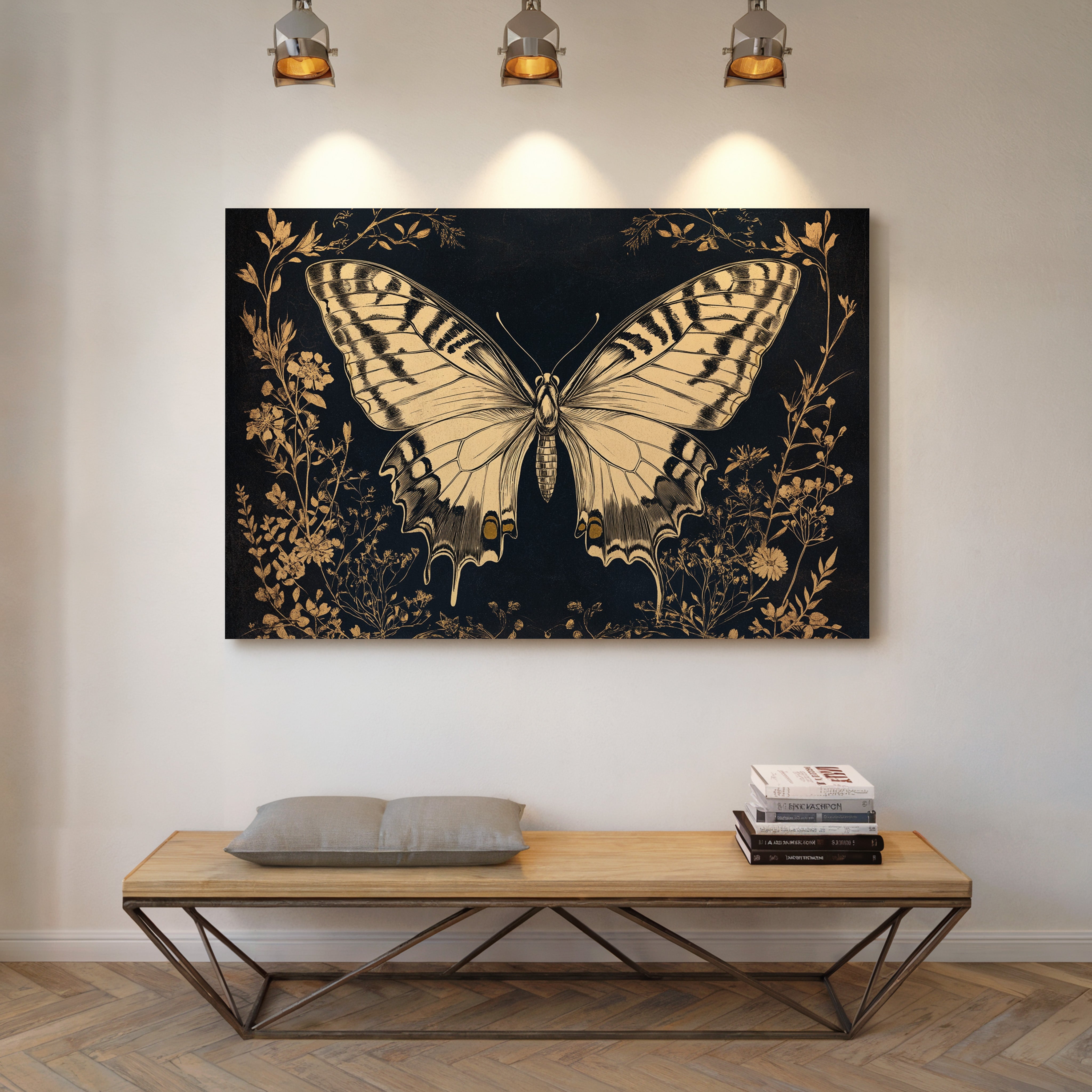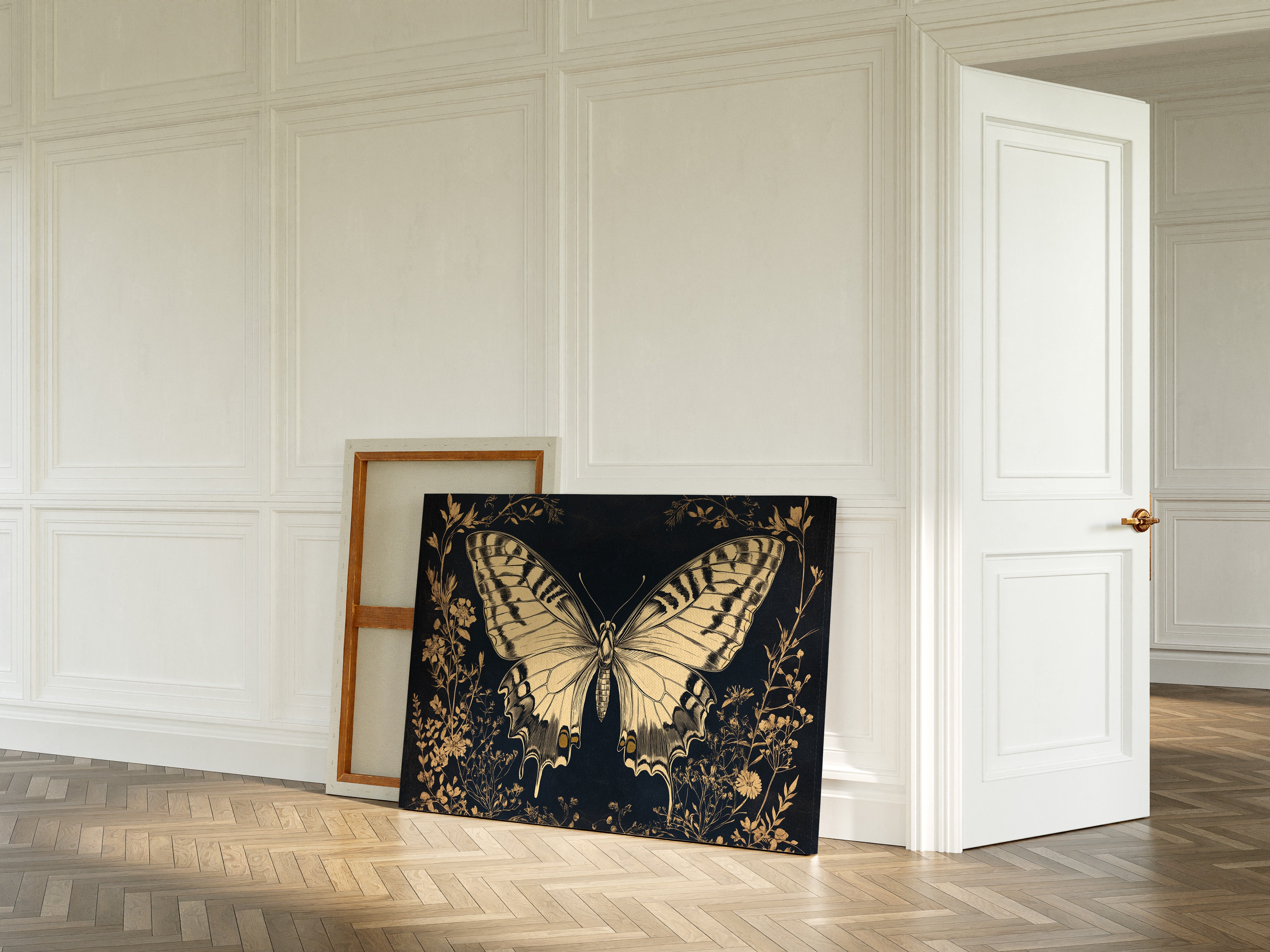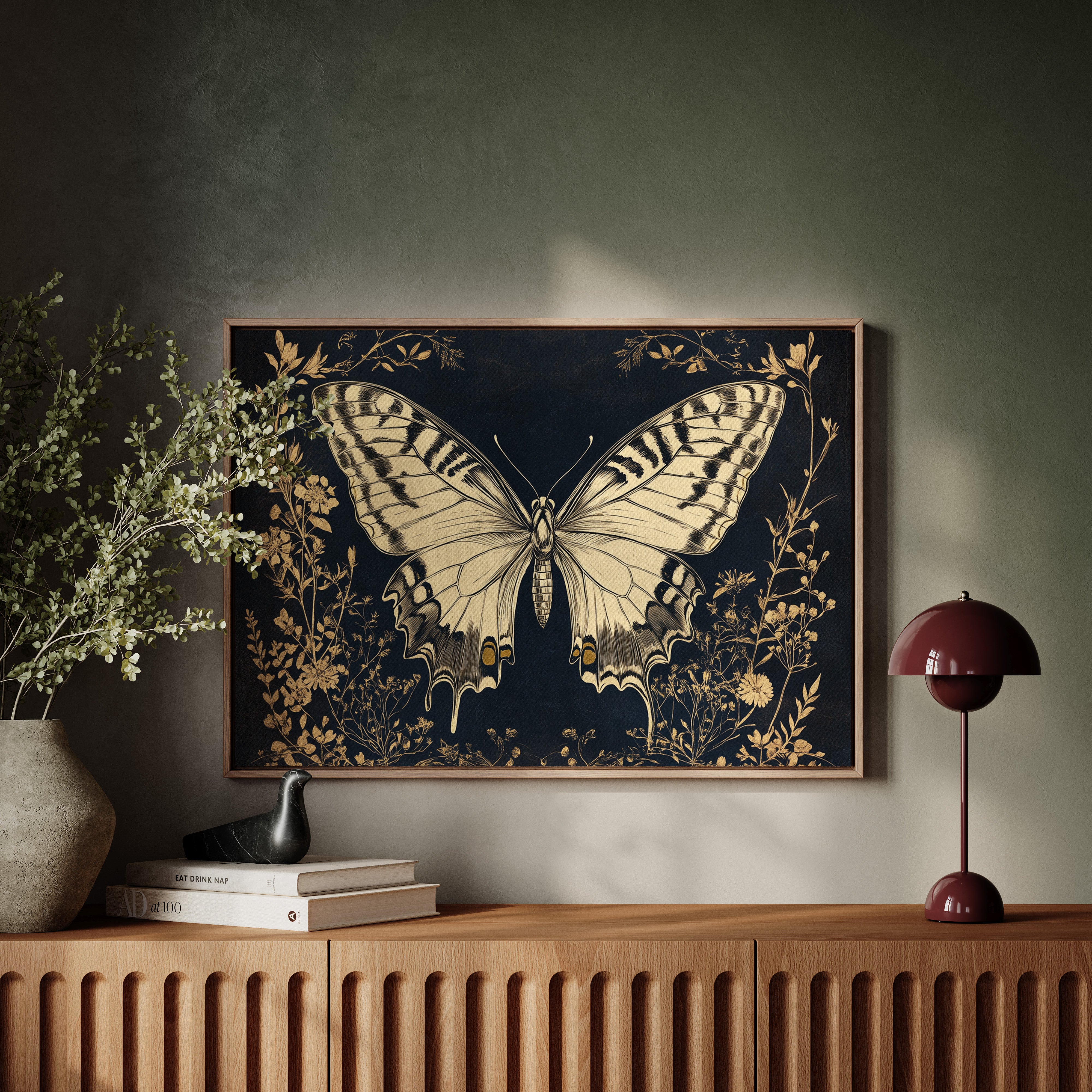 A majestic swallowtail butterfly commands attention against a deep midnight blue background, its wings rendered in luminous golden tones that seem to catch ethereal light. Delicate striations and patterns create a mesmerizing symmetry, while wild meadow flowers frame the scene in metallic splendor. The botanical elements dance along the edges, their golden petals and stems creating an intimate garden sanctuary. This piece would bring sophisticated drama to a study or reading nook, where its intricate details can be appreciated in moments of quiet contemplation.