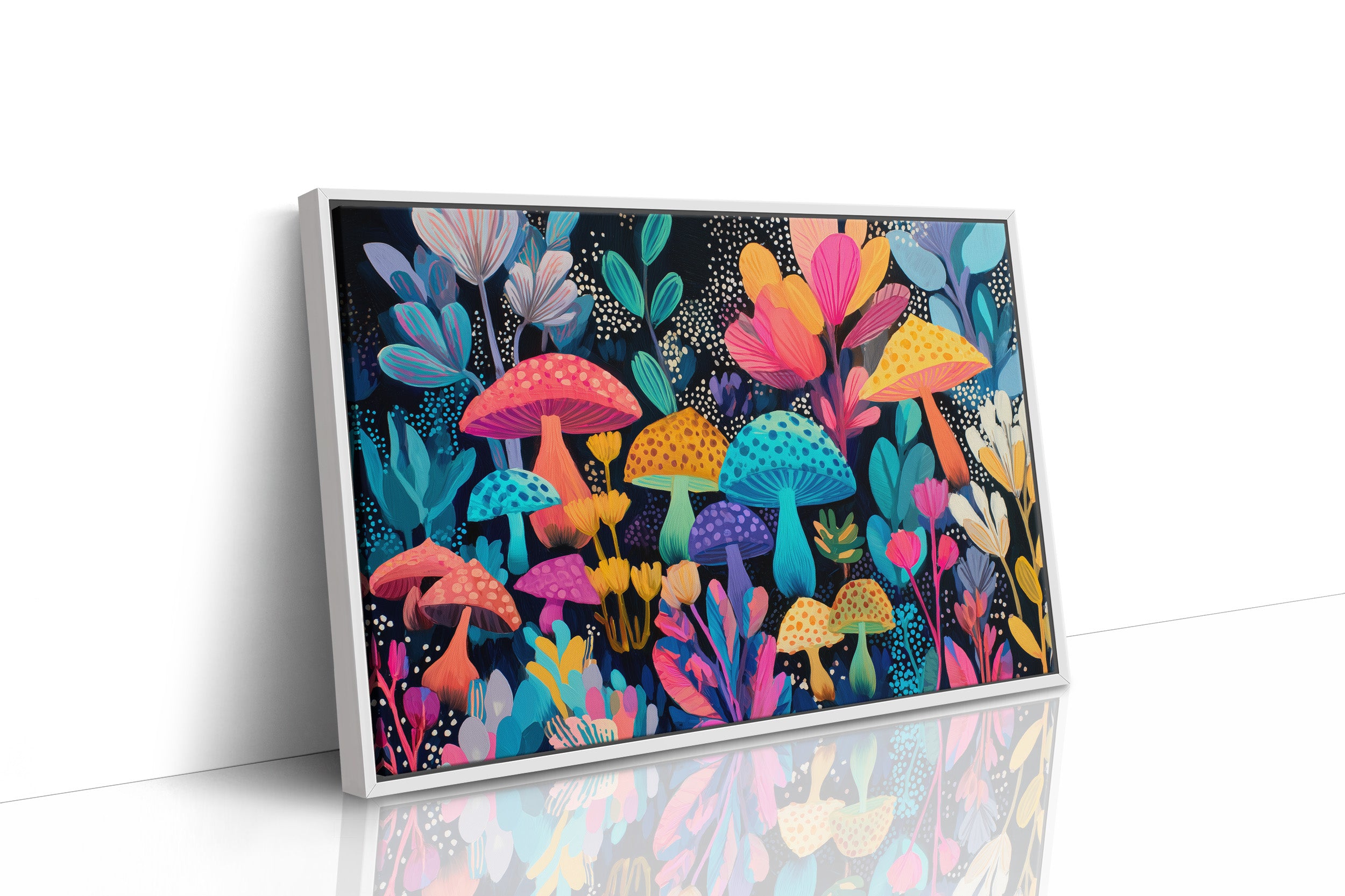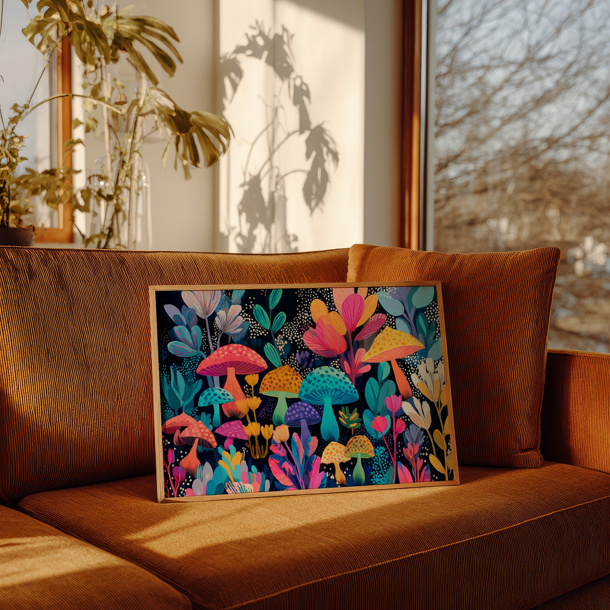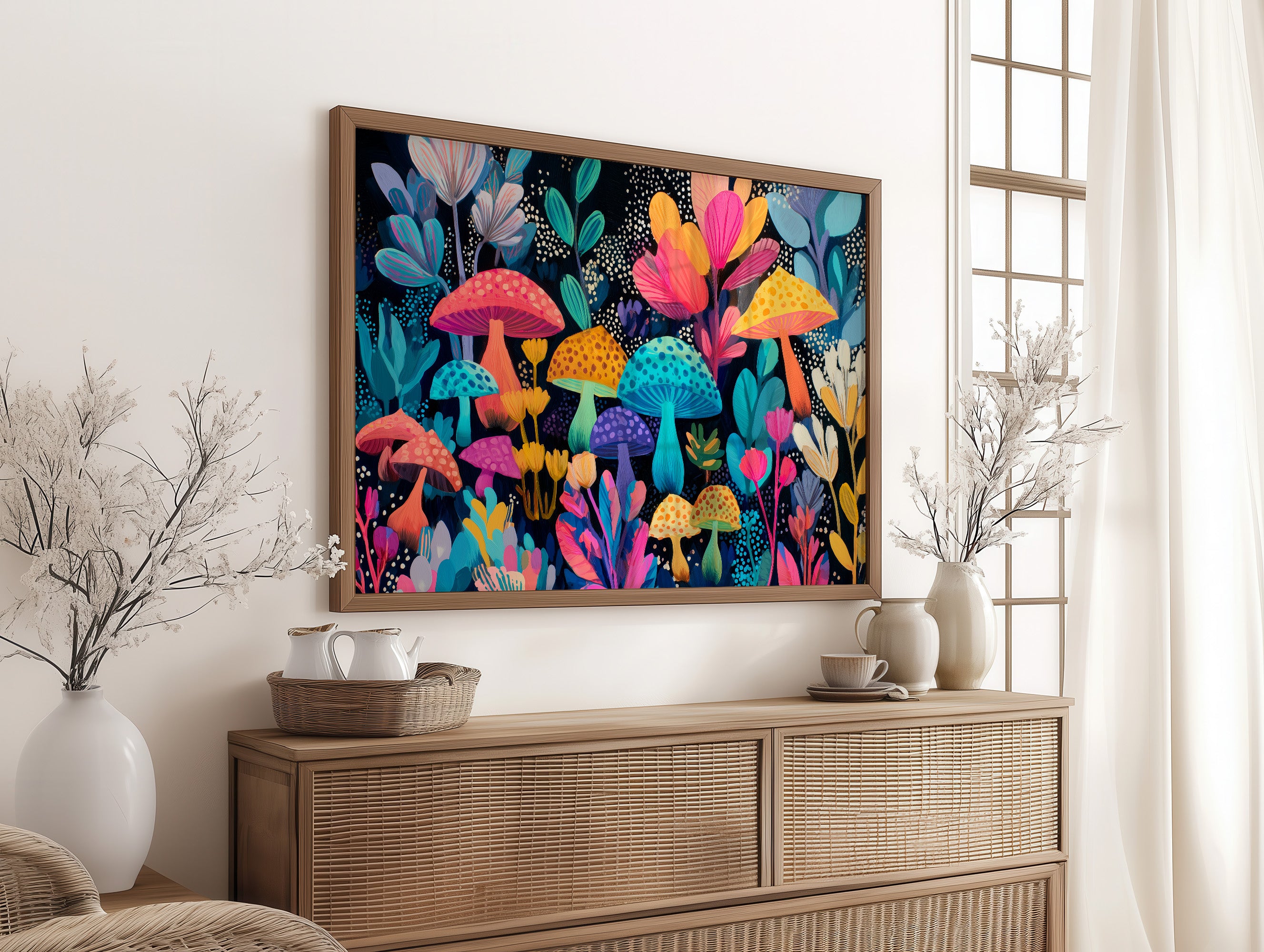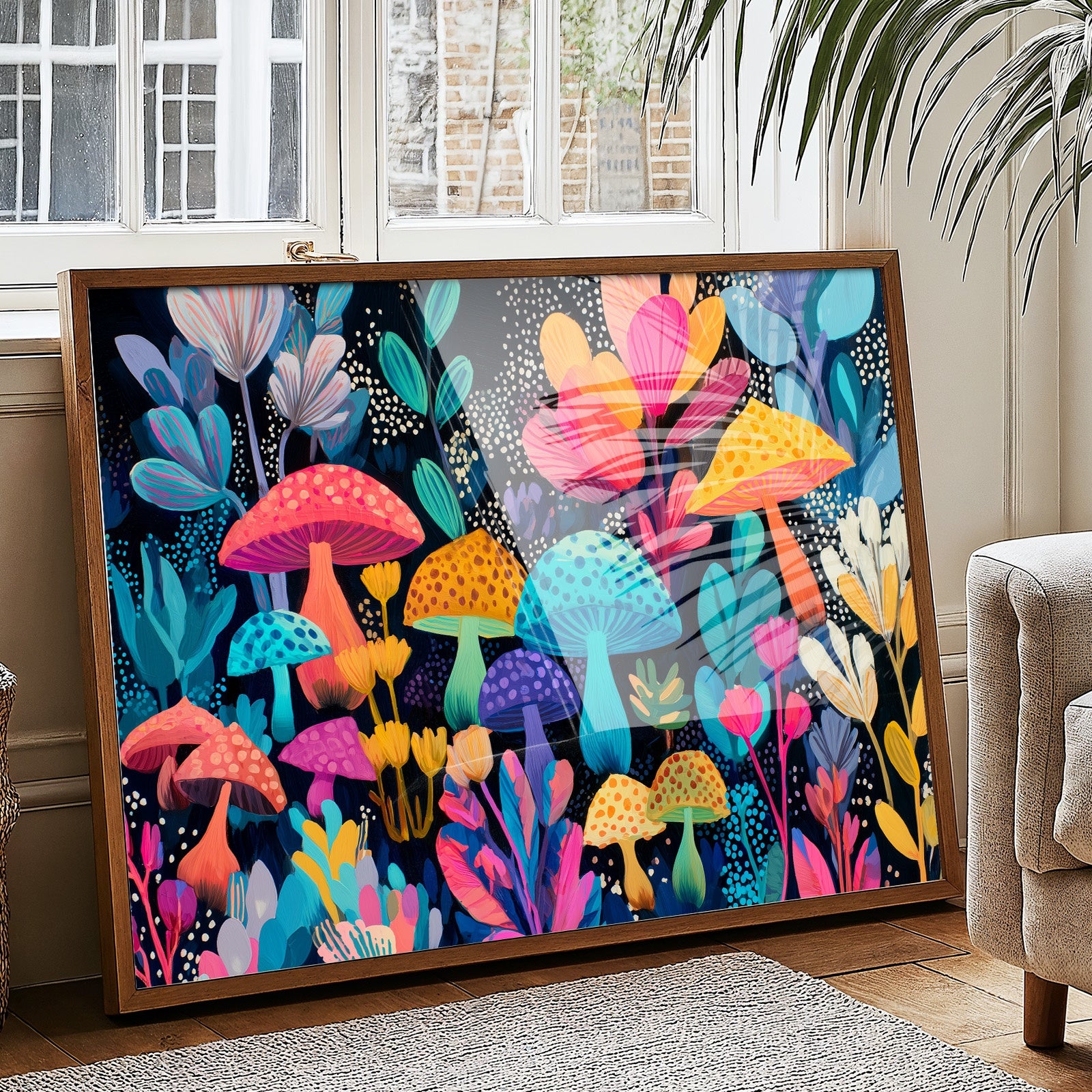A kaleidoscope of luminous mushrooms and flora dance against an inky black backdrop, creating a magical nighttime wonderland. Vibrant coral, turquoise, and fuchsia mushrooms stretch toward an unseen sky, while delicate flowers in electric hues weave between them like shooting stars. The playful dots scattered throughout evoke fireflies or stardust, adding a layer of whimsy to this enchanted forest scene. This statement piece brings a bold splash of contemporary charm to any room, perfect for creating a focal point in a modern dining room or adding an imaginative touch to a creative workspace.
