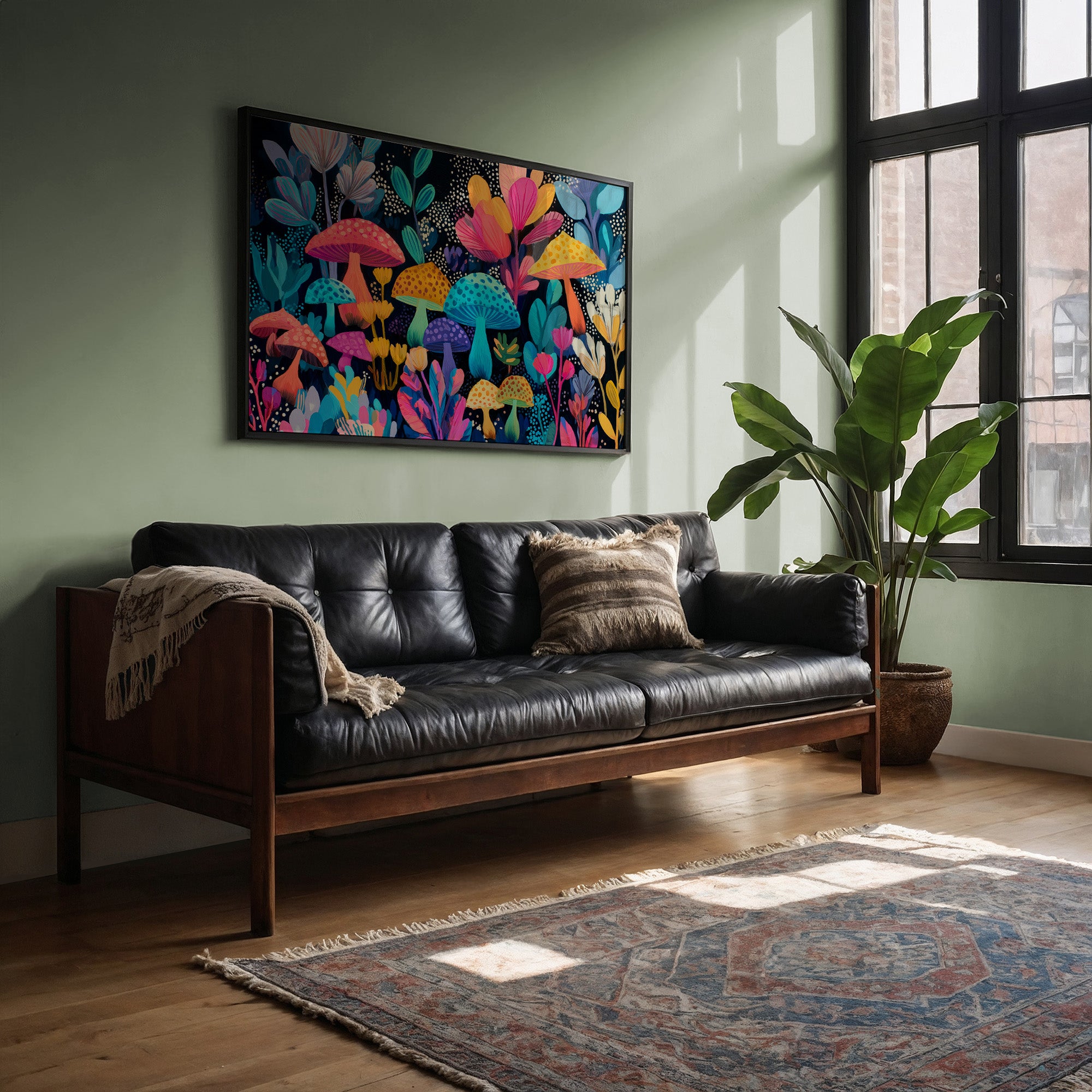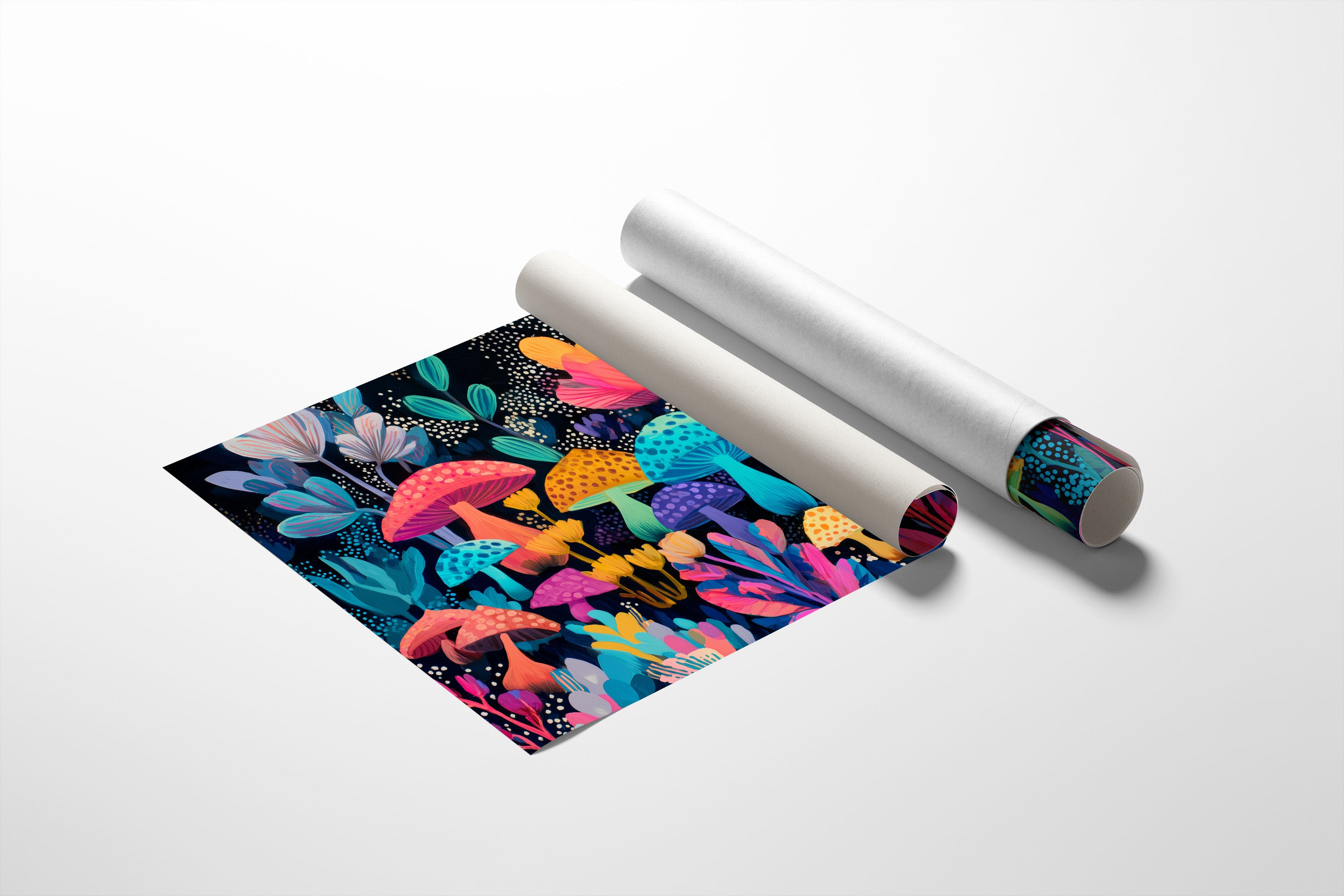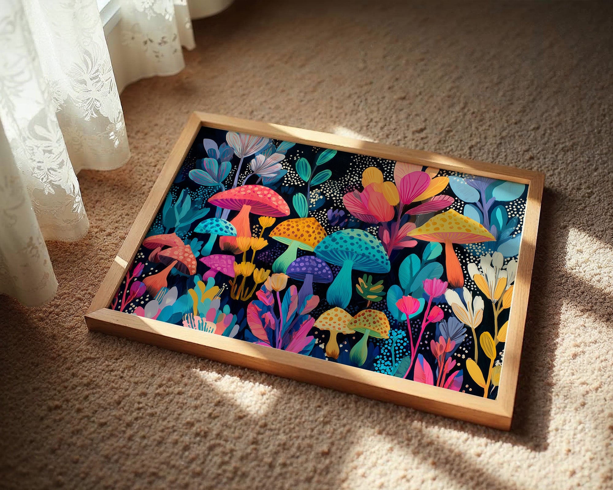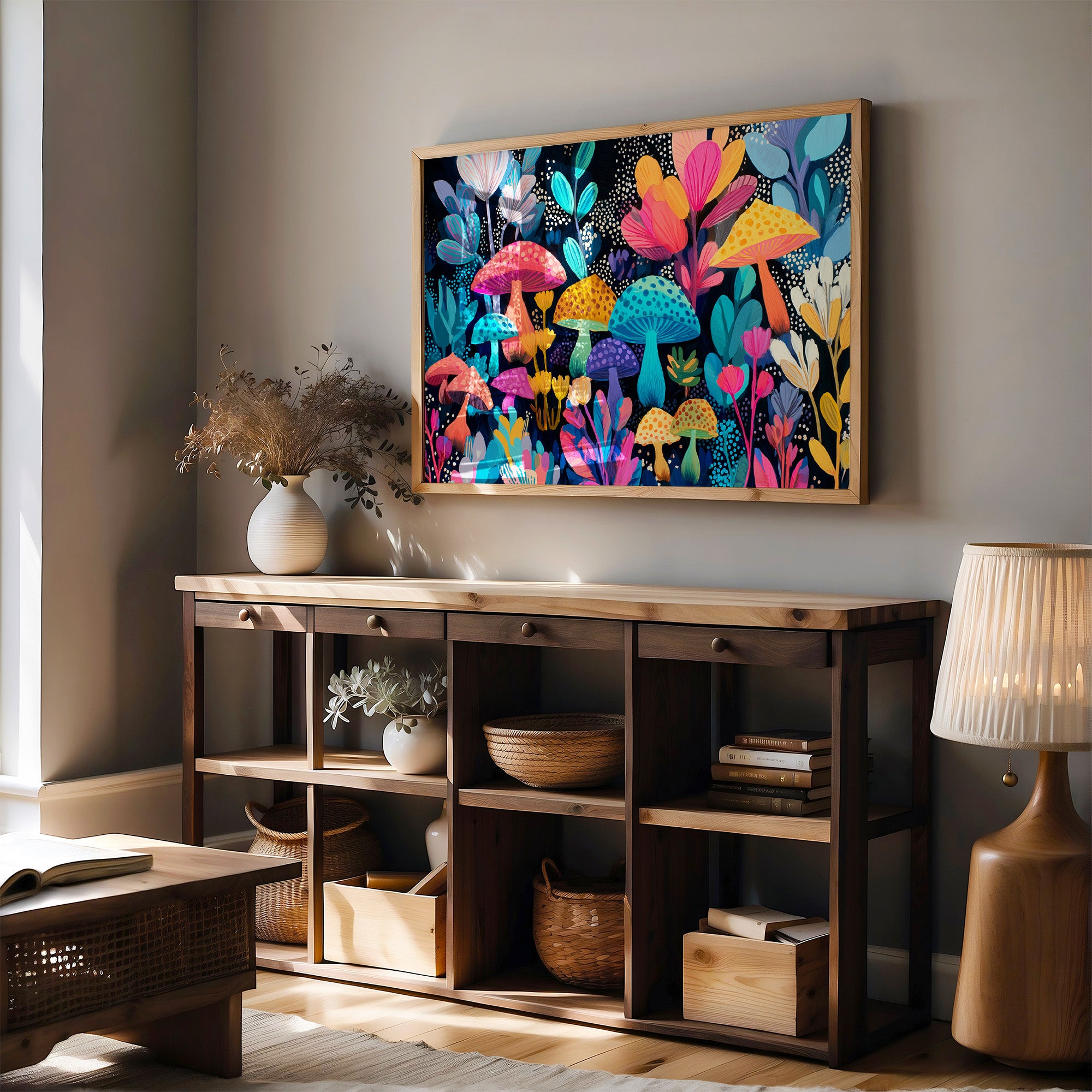 A kaleidoscope of luminous mushrooms and flora dance against an inky black backdrop, creating a magical nighttime wonderland. Vibrant coral, turquoise, and fuchsia mushrooms stretch toward an unseen sky, while delicate flowers in electric hues weave between them like shooting stars. The playful dots scattered throughout evoke fireflies or stardust, adding a layer of whimsy to this enchanted forest scene. This statement piece brings a bold splash of contemporary charm to any room, perfect for creating a focal point in a modern dining room or adding an imaginative touch to a creative workspace.