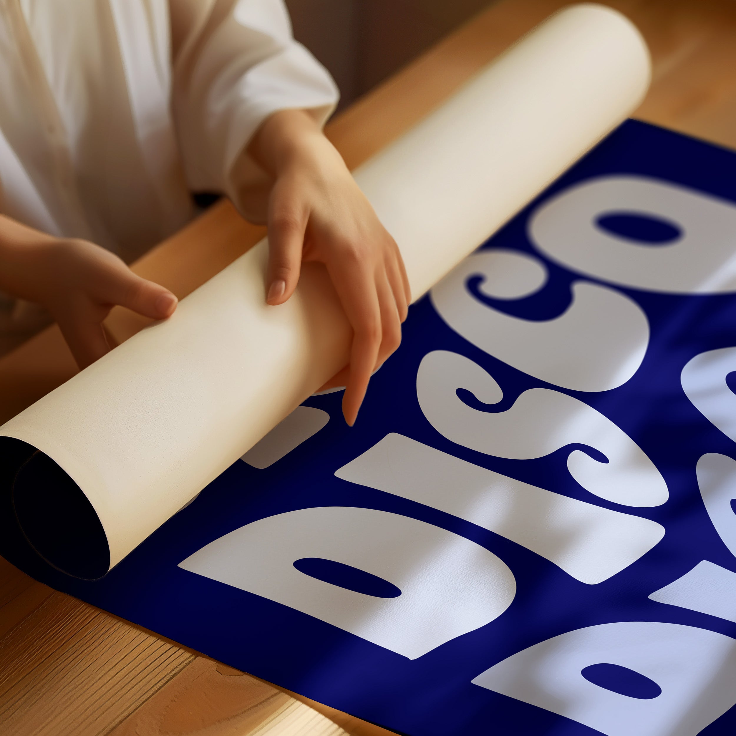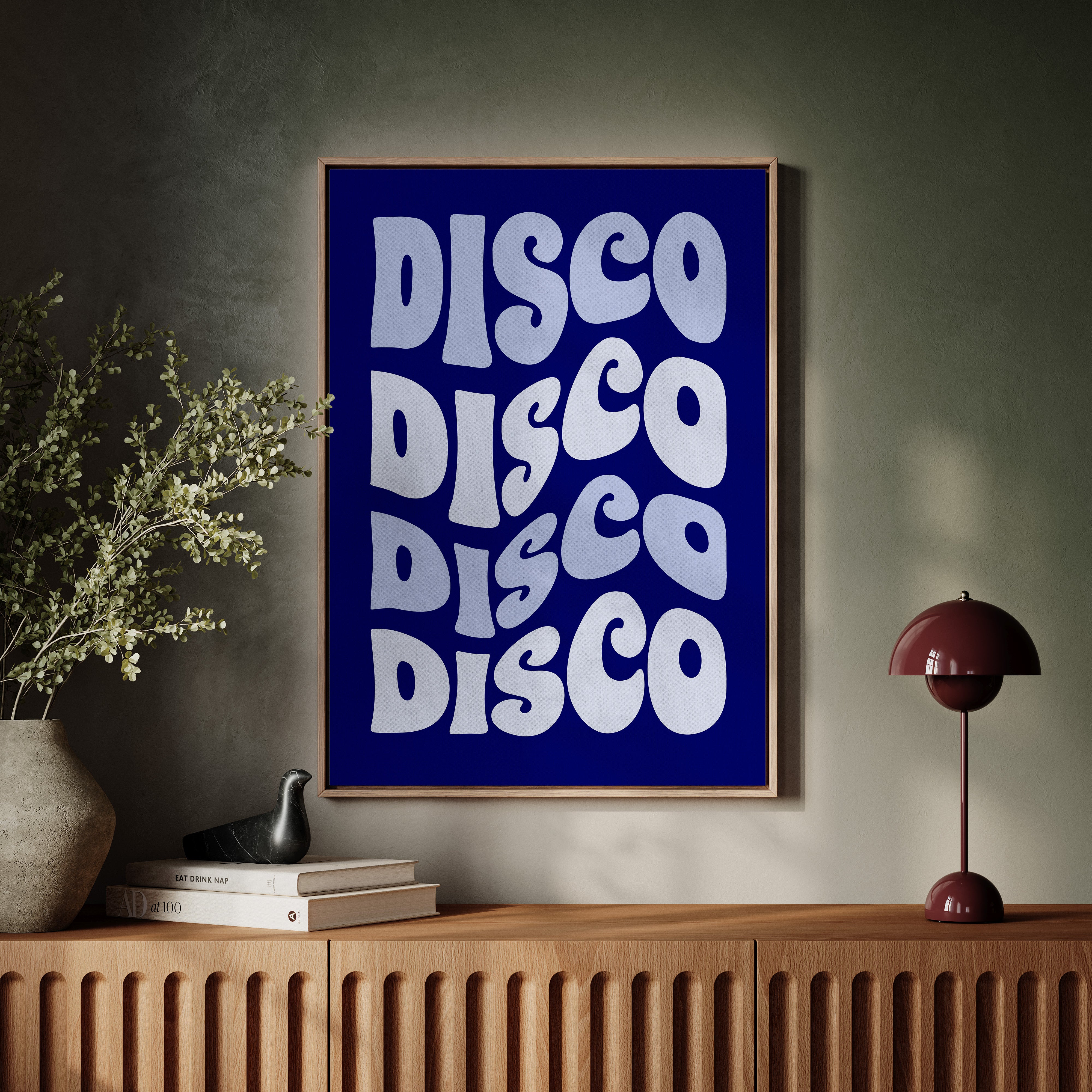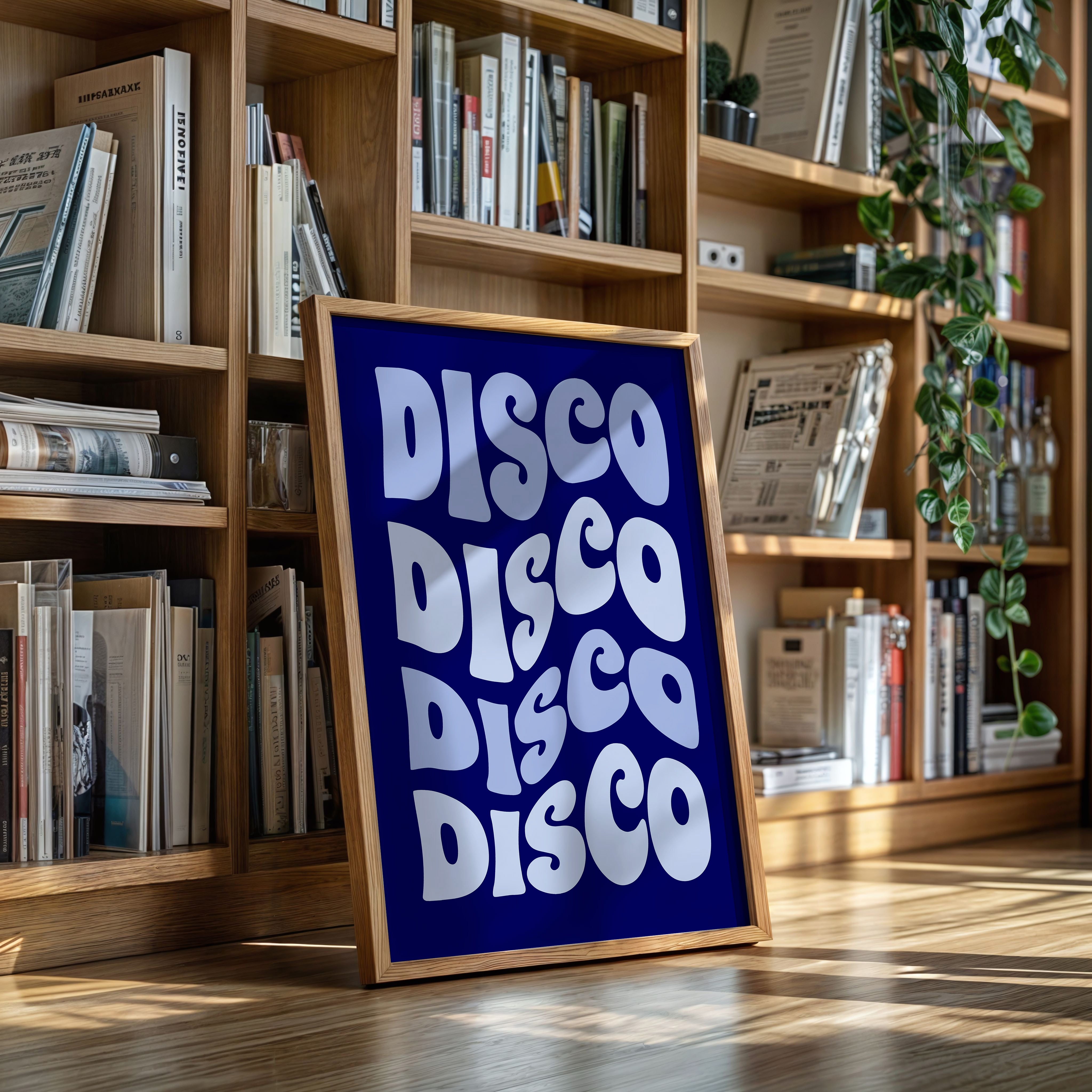 Retro curves ripple through deep navy space, each letter pulsing with the rhythm of Saturday night. This bold typographic piece from our Contemporary collection channels the infectious energy of disco's golden age. The flowing, organic letterforms create a hypnotic pattern against the midnight backdrop, each repetition building like a dance floor anthem reaching its crescendo. The contrast between the cool periwinkle text and rich navy background creates an electric atmosphere that commands attention. Perfect for energizing a modern living space or adding a touch of nostalgic funk to a music room. Let this piece be the conversation starter that gets the party started.