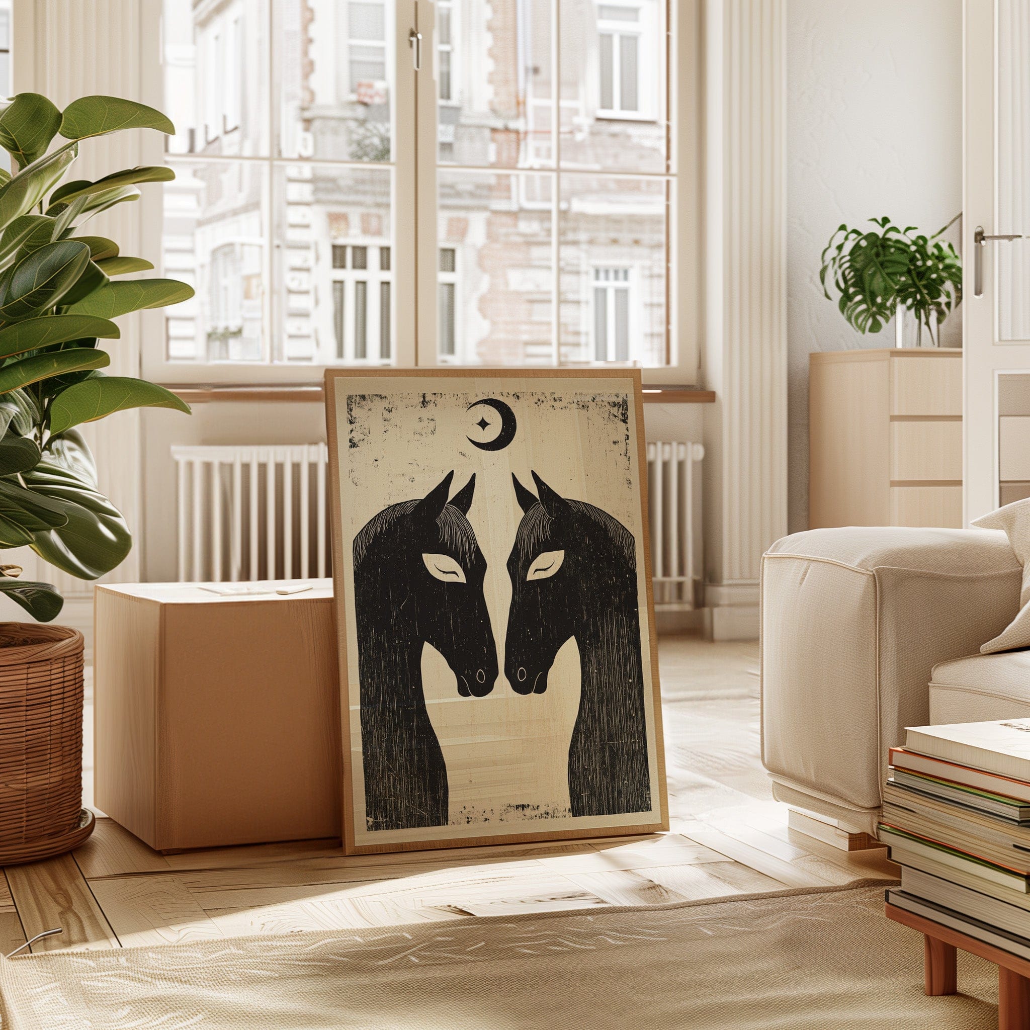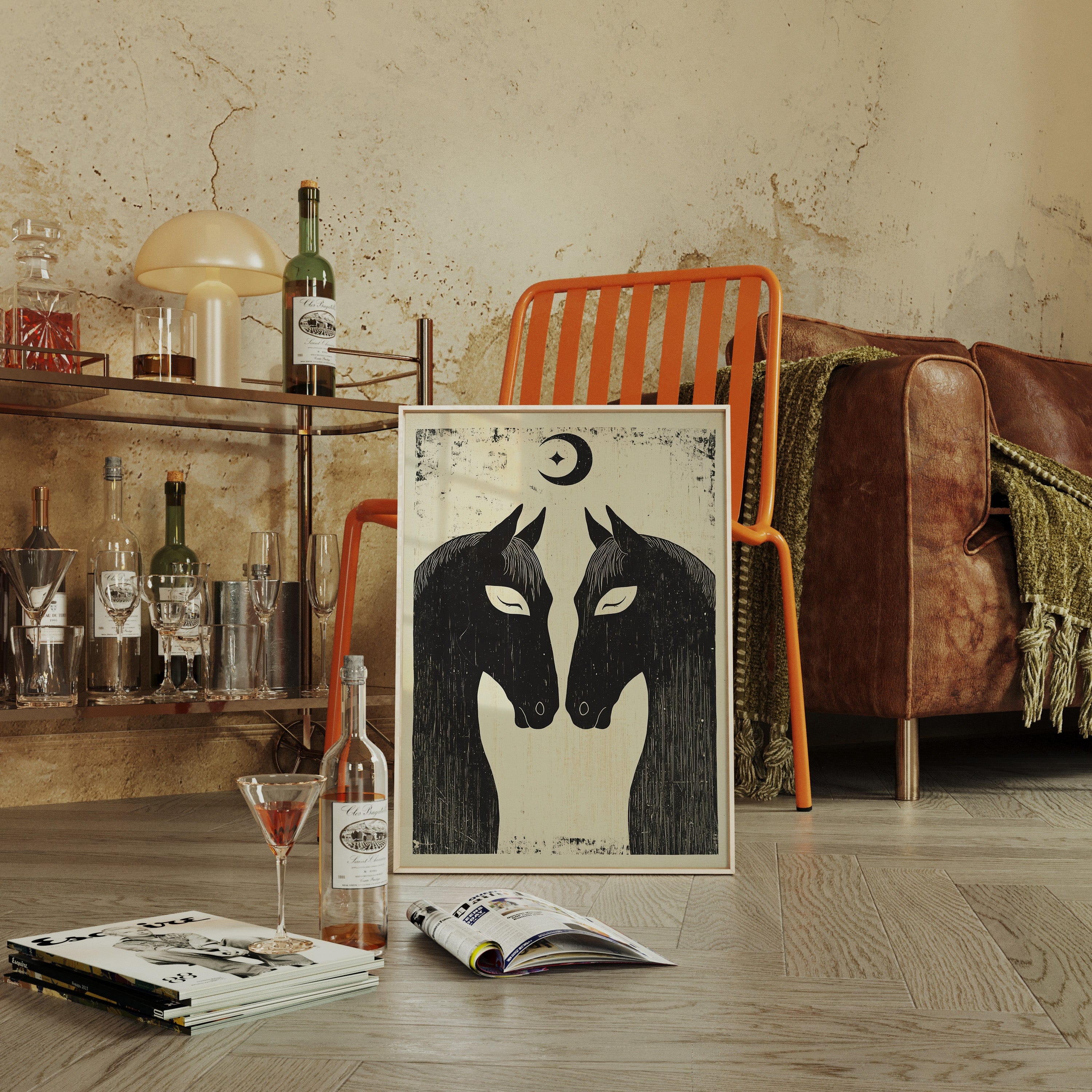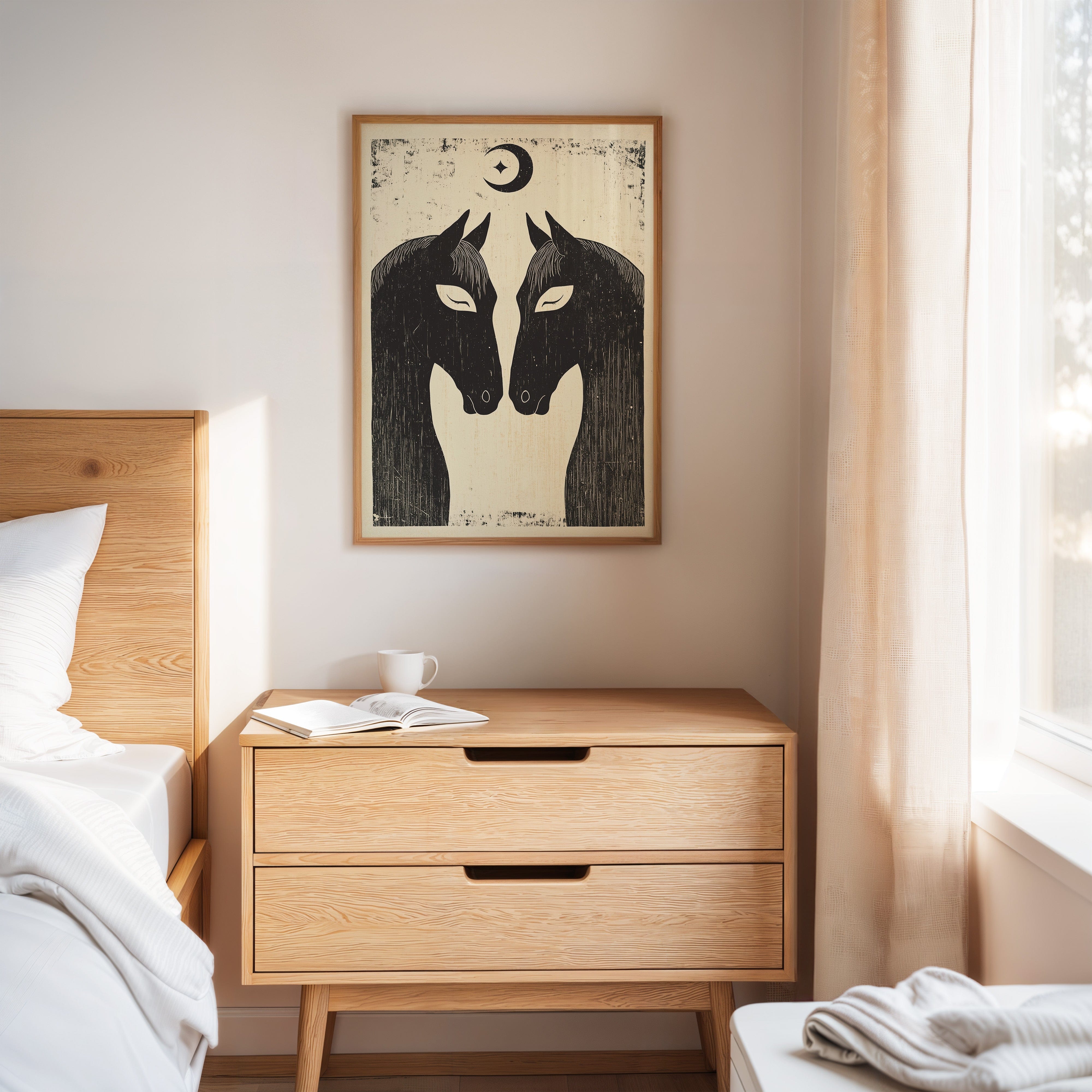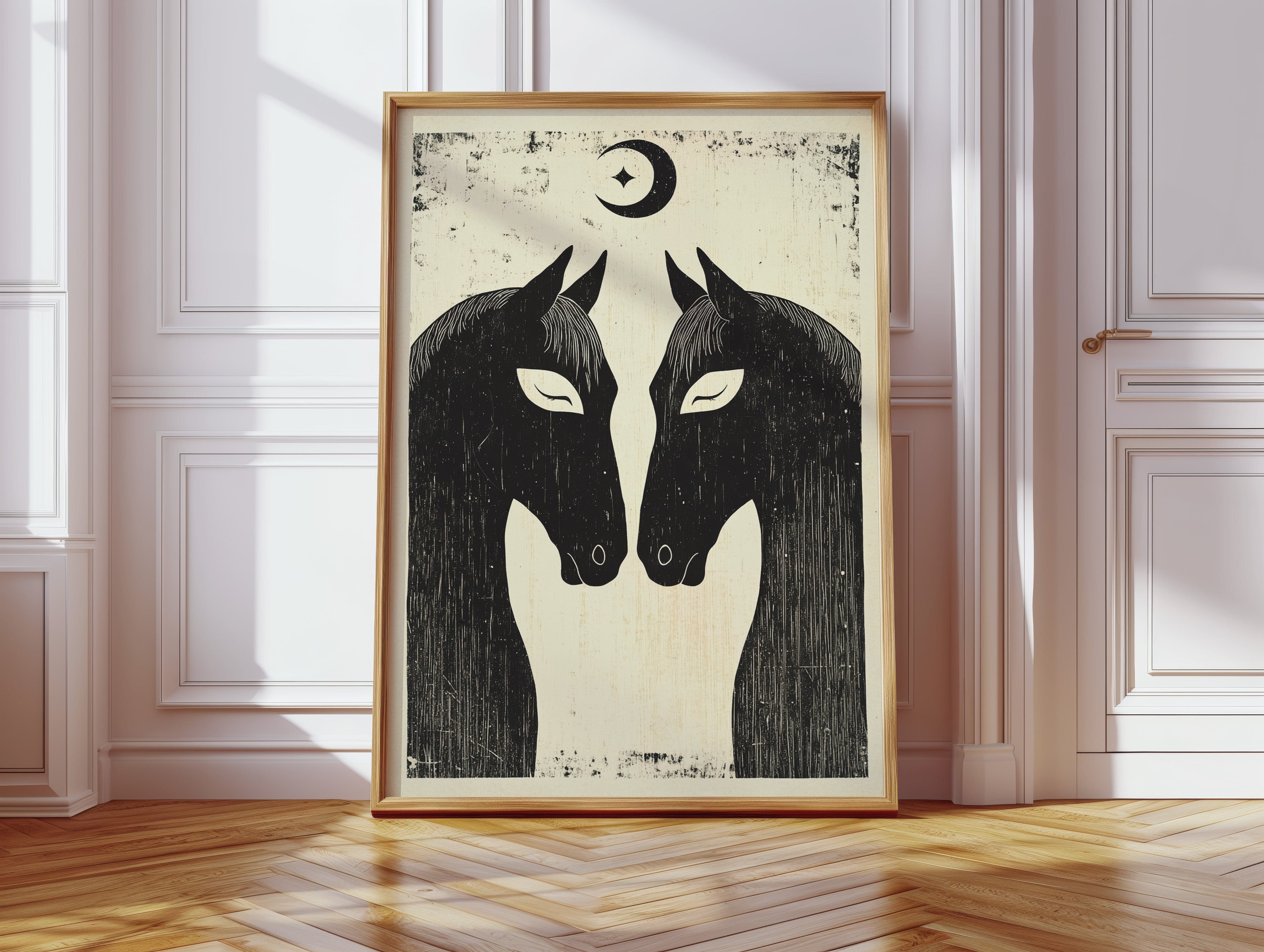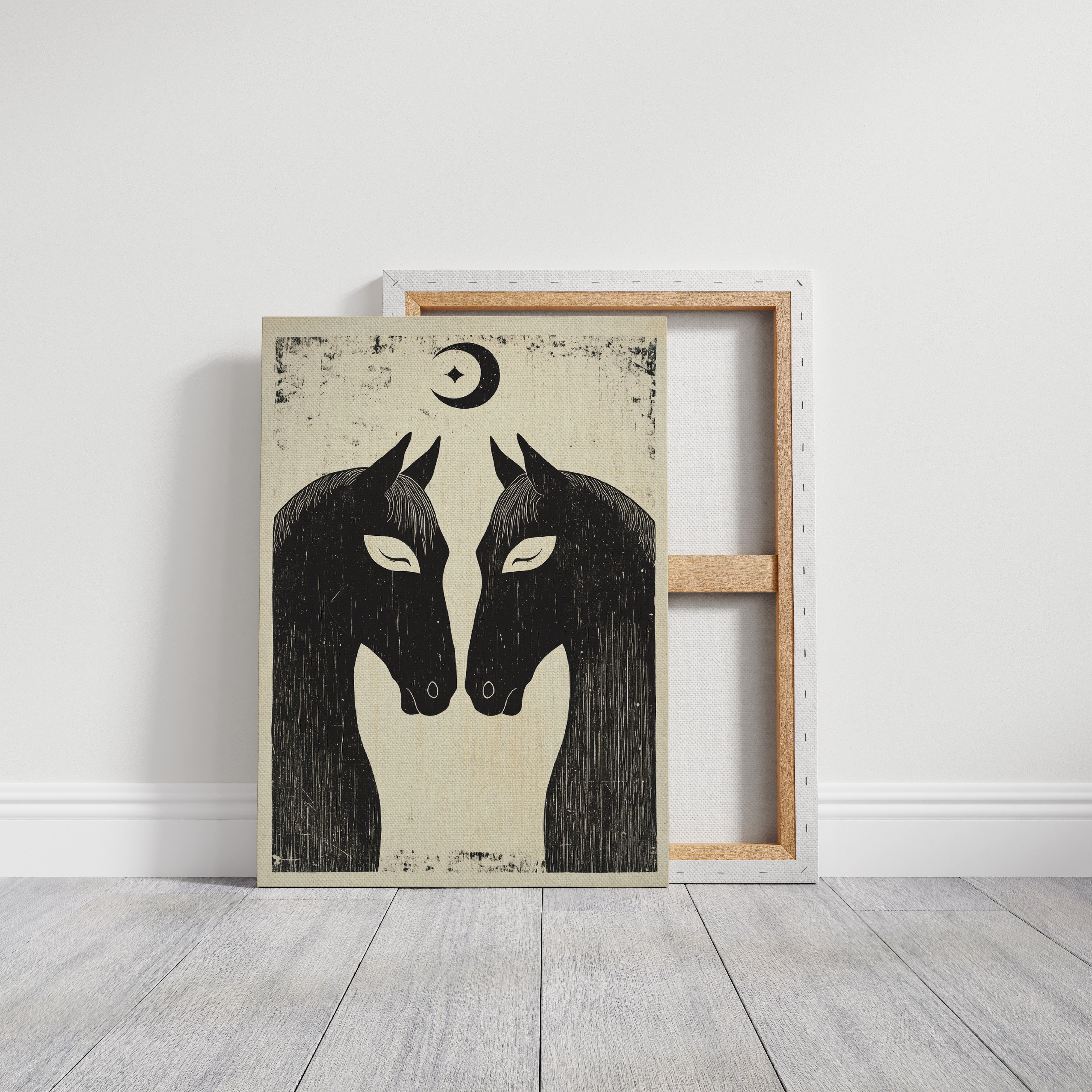 Two dark silhouettes merge in a mystical dance beneath a crescent moon. The stark contrast of black and cream creates a powerful narrative of connection and understanding between these noble creatures. Their gentle eyes and mirrored poses speak of shared wisdom, while the textured woodblock-style printing adds a raw, artistic depth that captures both strength and vulnerability. This piece would bring a bold, contemporary accent to a modern farmhouse study or add dramatic flair to a minimalist living space.