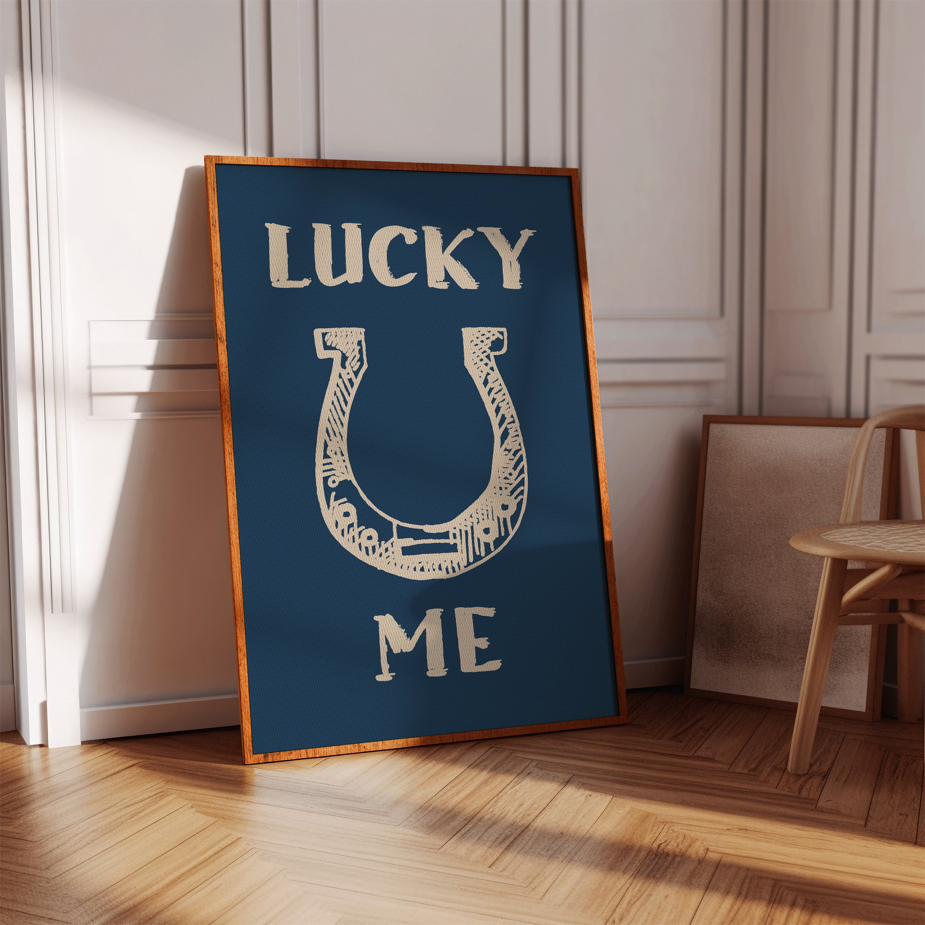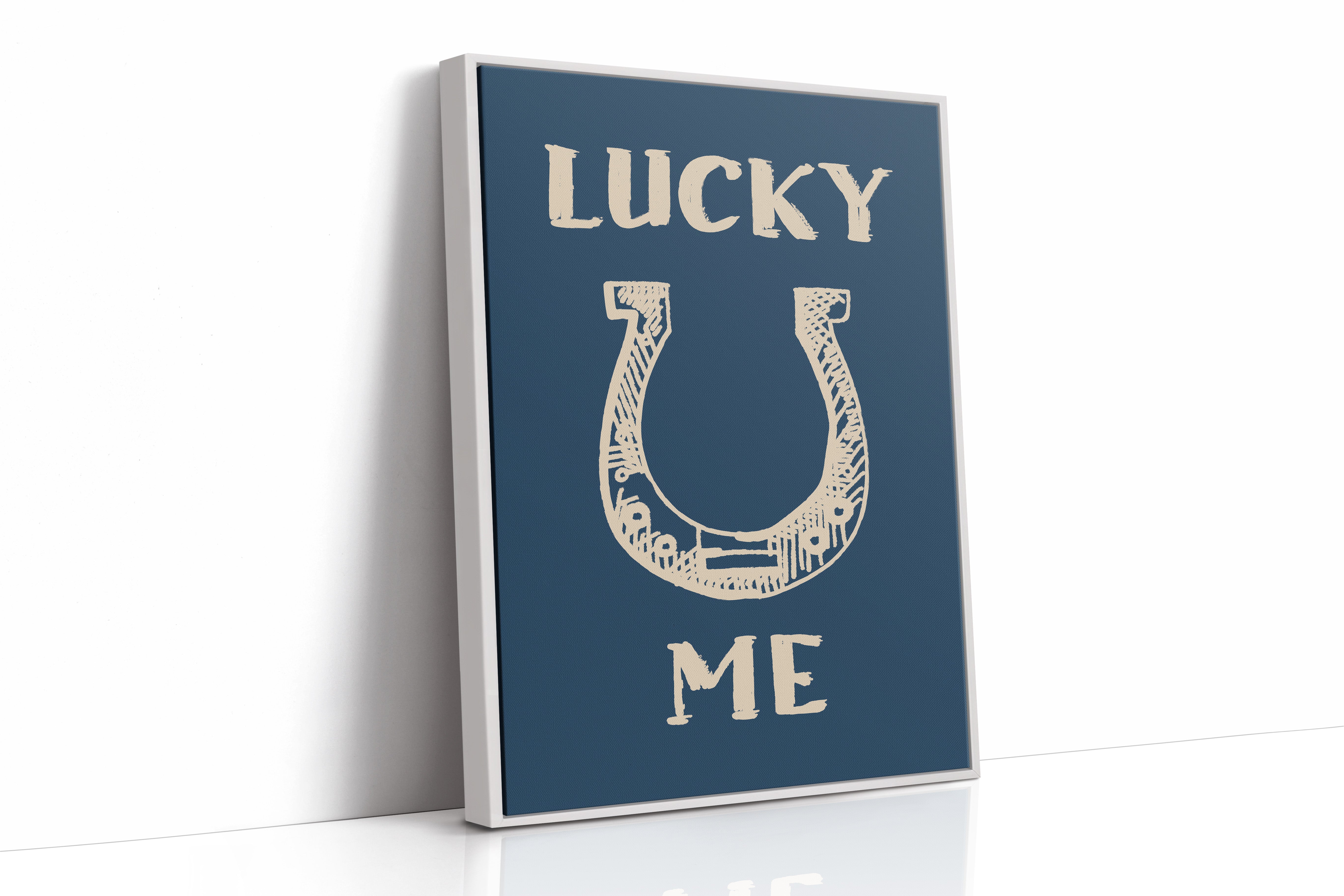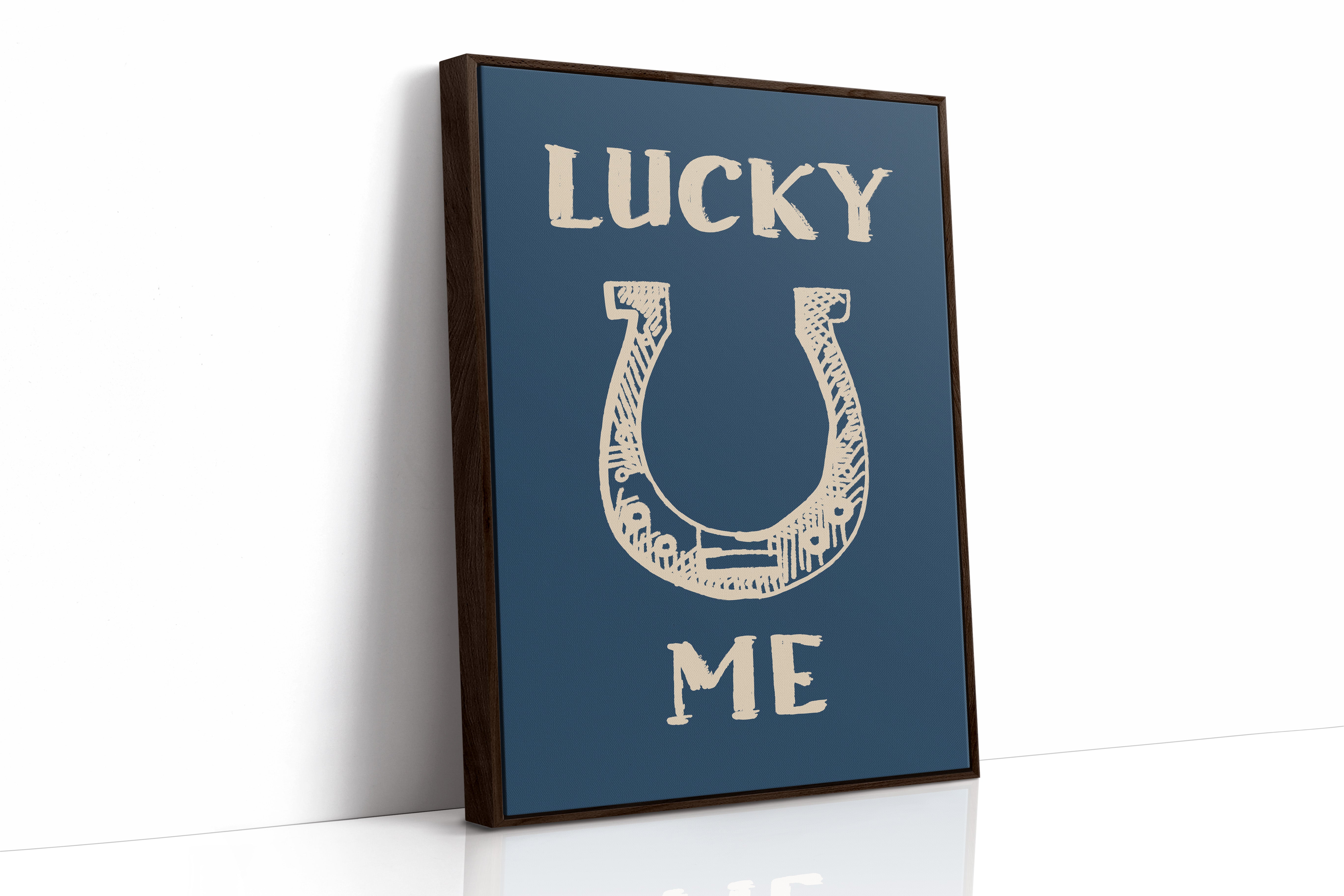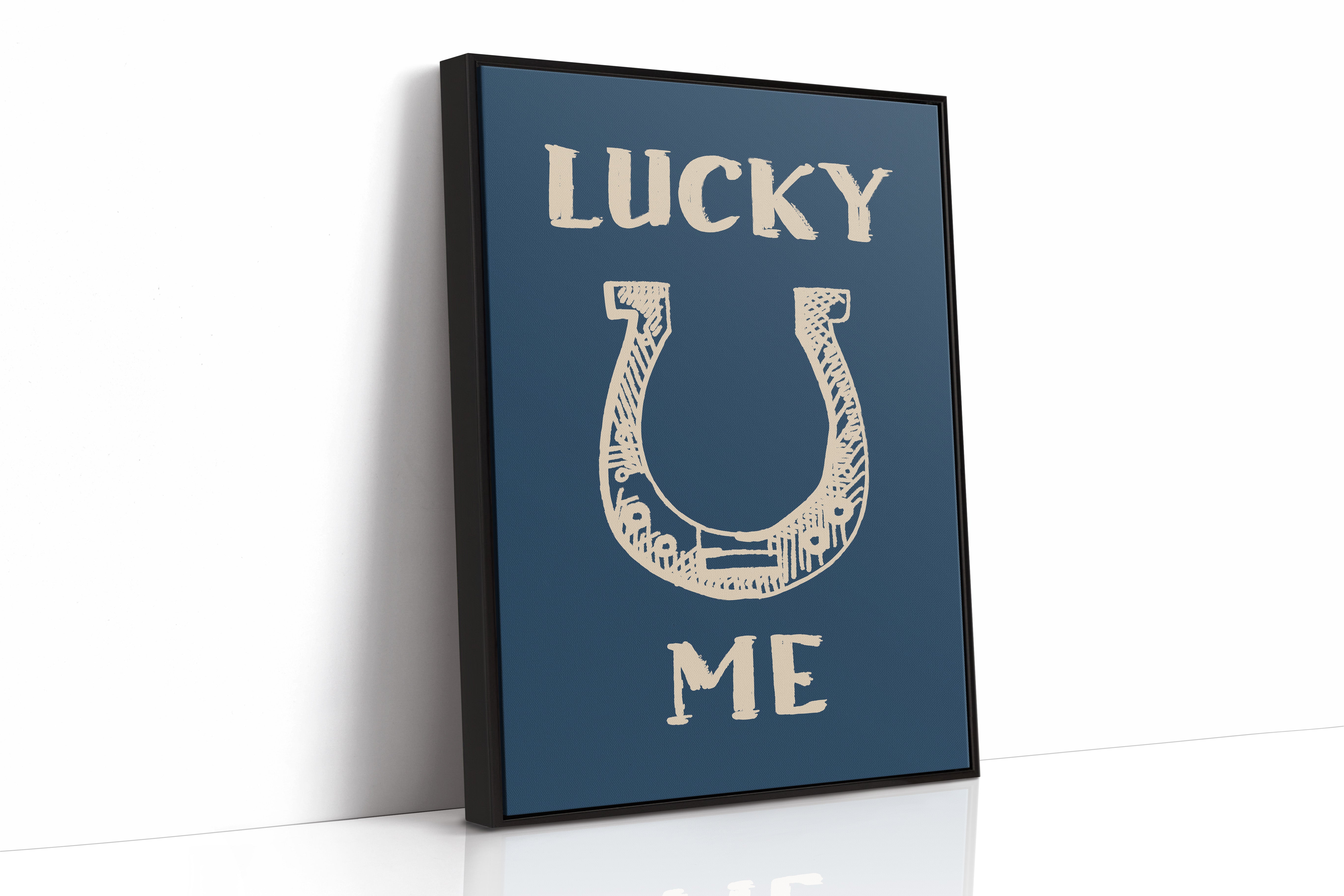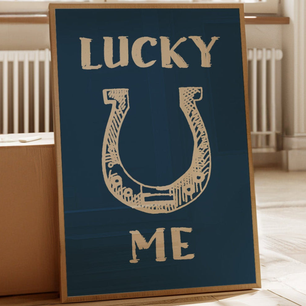 "Against a deep navy backdrop, a hand-drawn horseshoe radiates rustic charm and timeless superstition. This piece from our Contemporary collection merges traditional symbolism with modern minimalist design. The cream-colored illustration features delicate crosshatching and thoughtful details that bring personality to this symbol of fortune, while the bold typography creates a playful dialogue between text and image. Perfect for adding a touch of whimsy to a home office or bringing character to a modern farmhouse kitchen. The simplicity of the design allows it to seamlessly blend with both contemporary and traditional decor styles.