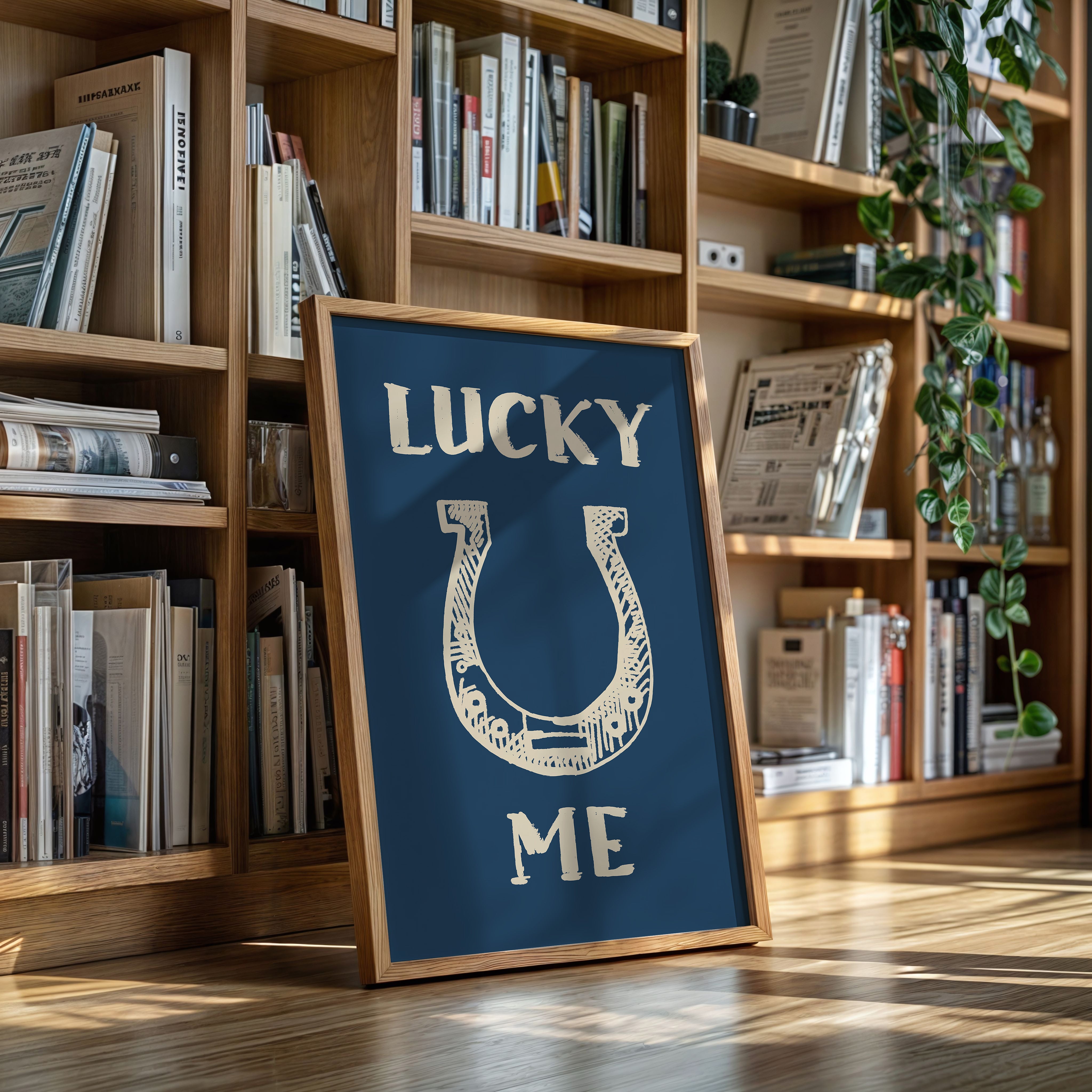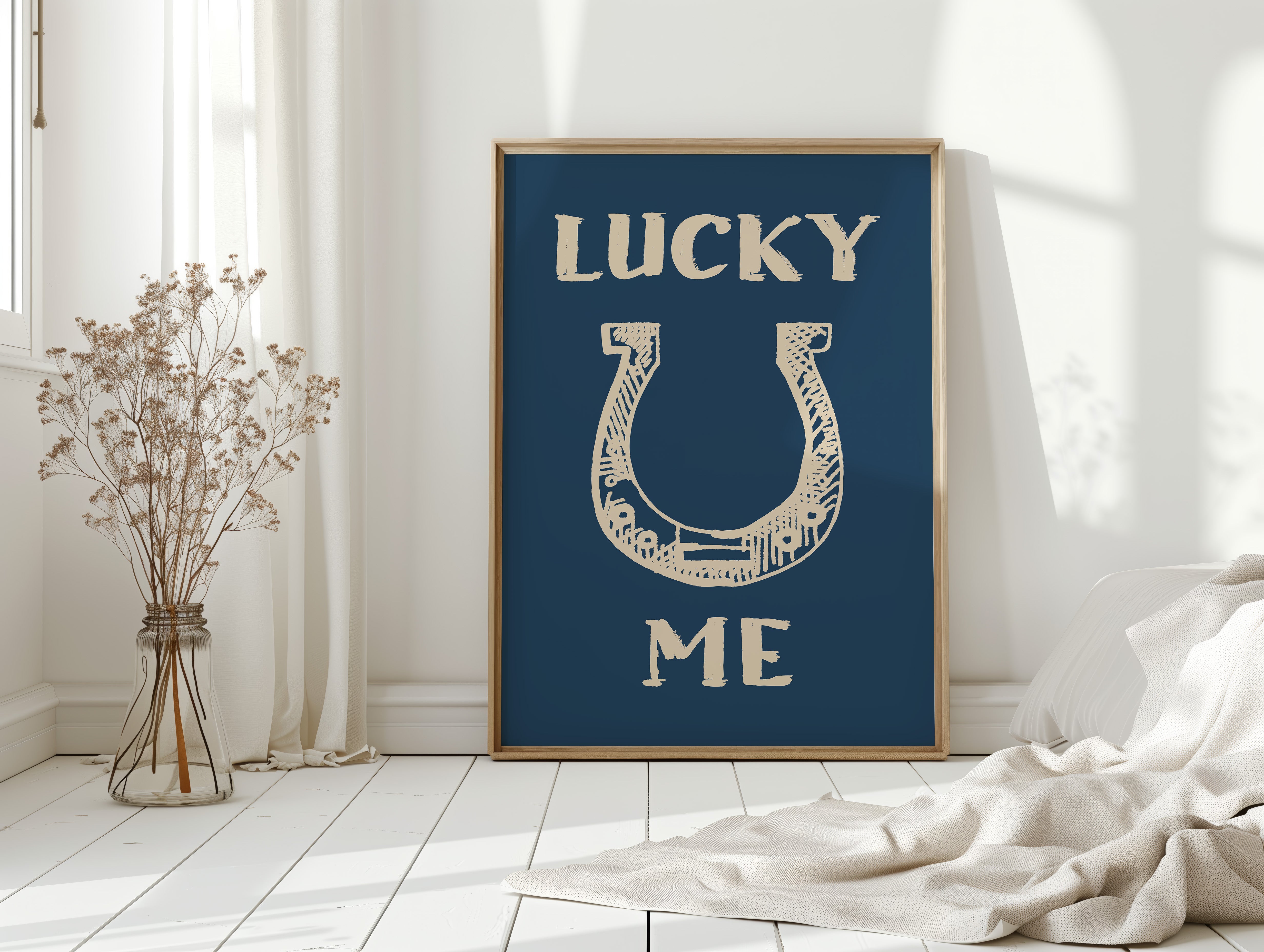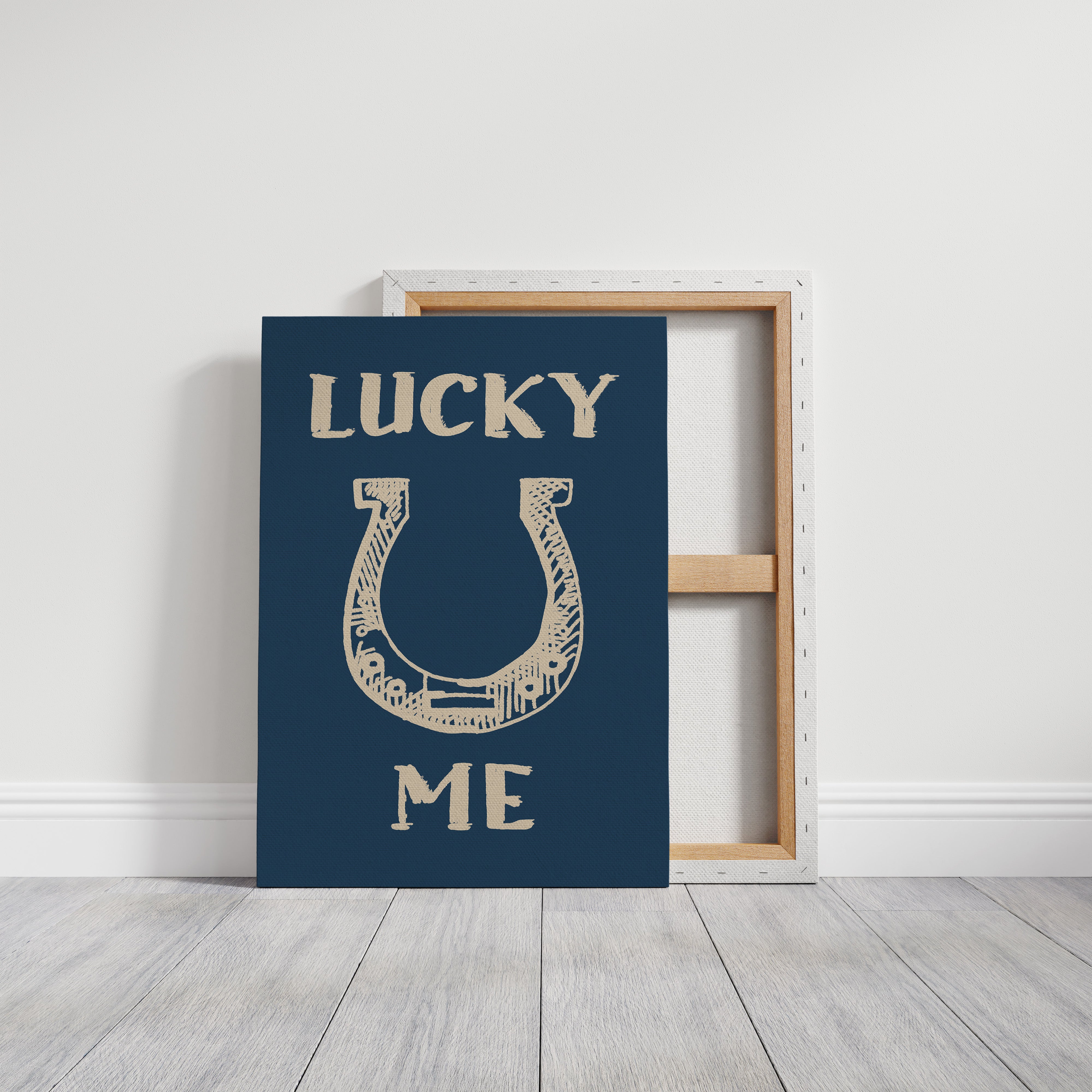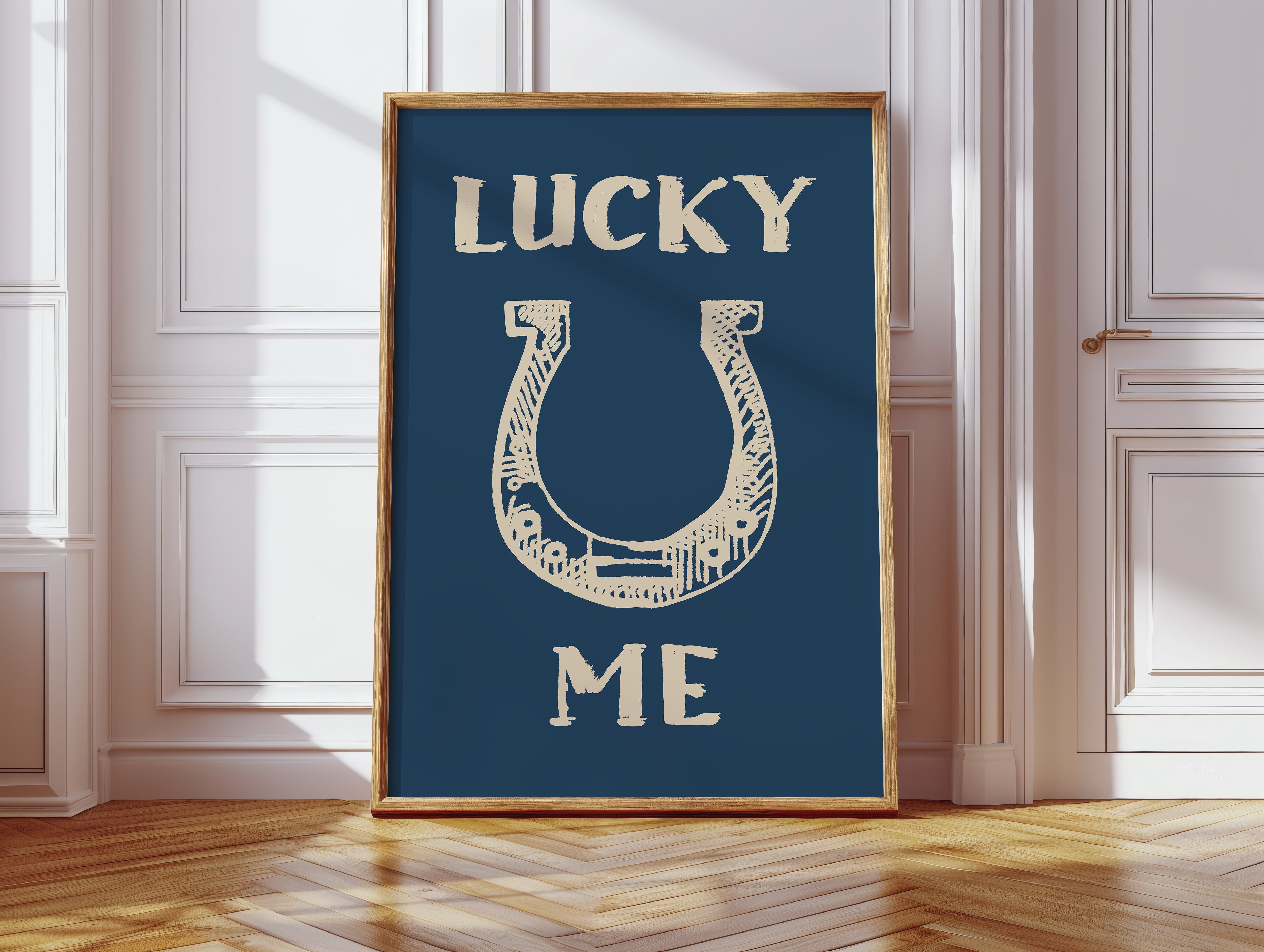 "Against a deep navy backdrop, a hand-drawn horseshoe radiates rustic charm and timeless superstition. This piece from our Contemporary collection merges traditional symbolism with modern minimalist design. The cream-colored illustration features delicate crosshatching and thoughtful details that bring personality to this symbol of fortune, while the bold typography creates a playful dialogue between text and image. Perfect for adding a touch of whimsy to a home office or bringing character to a modern farmhouse kitchen. The simplicity of the design allows it to seamlessly blend with both contemporary and traditional decor styles.