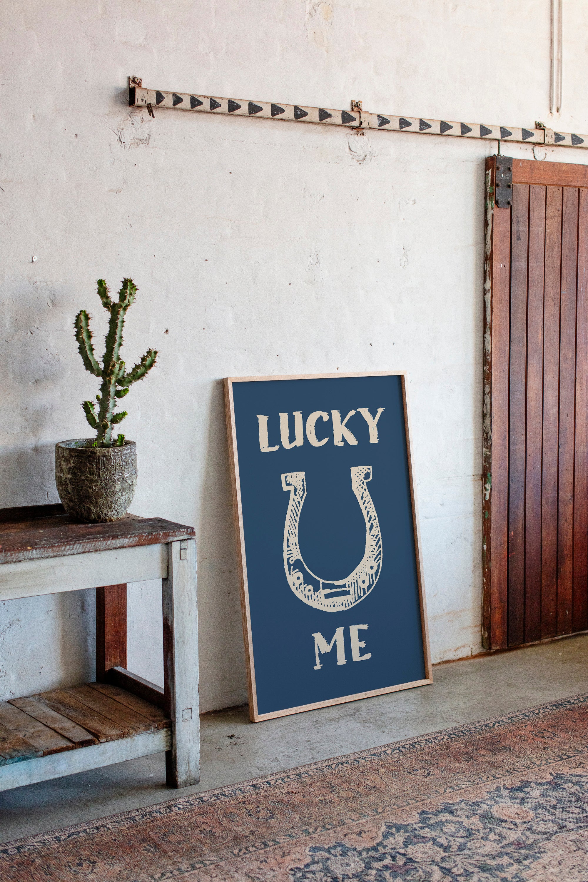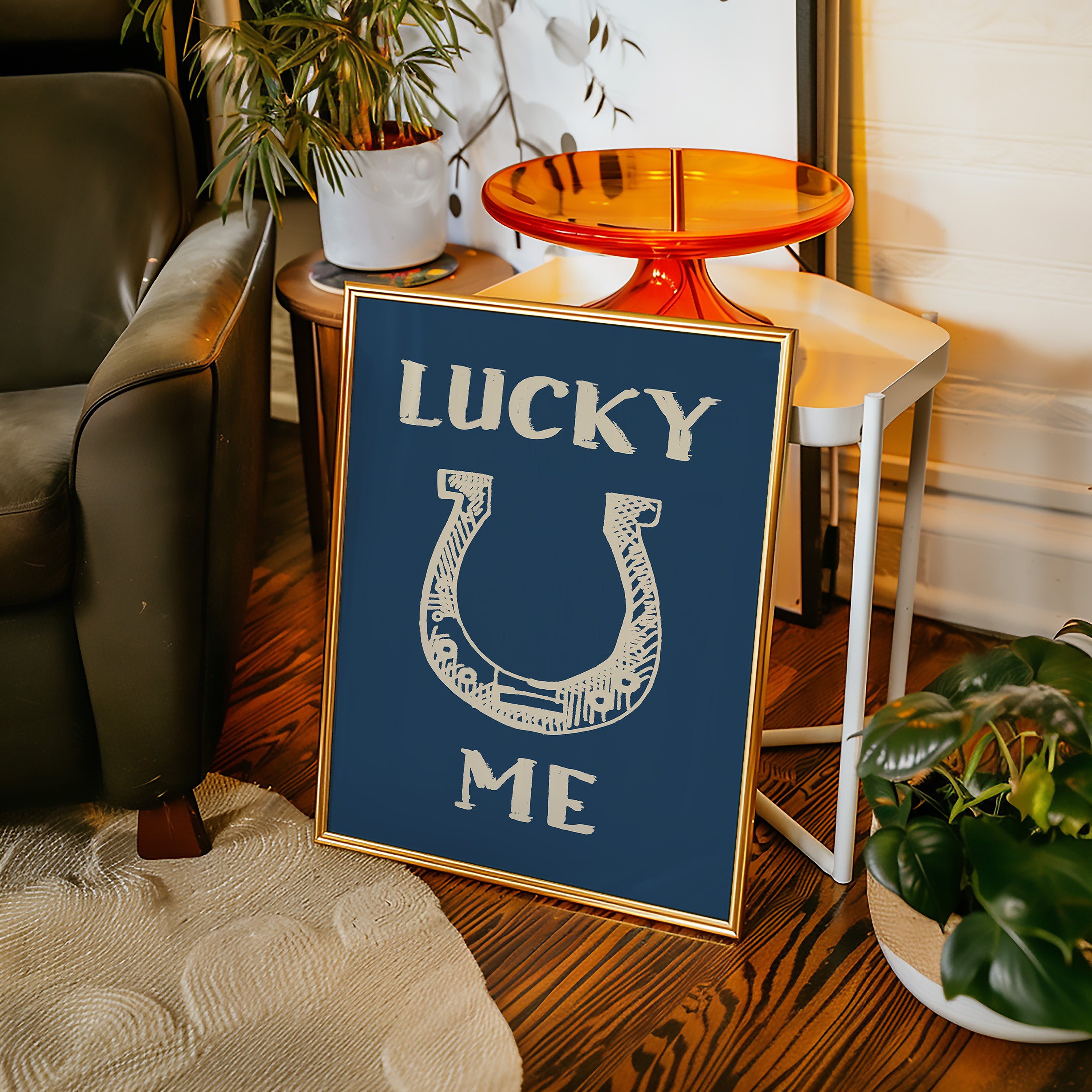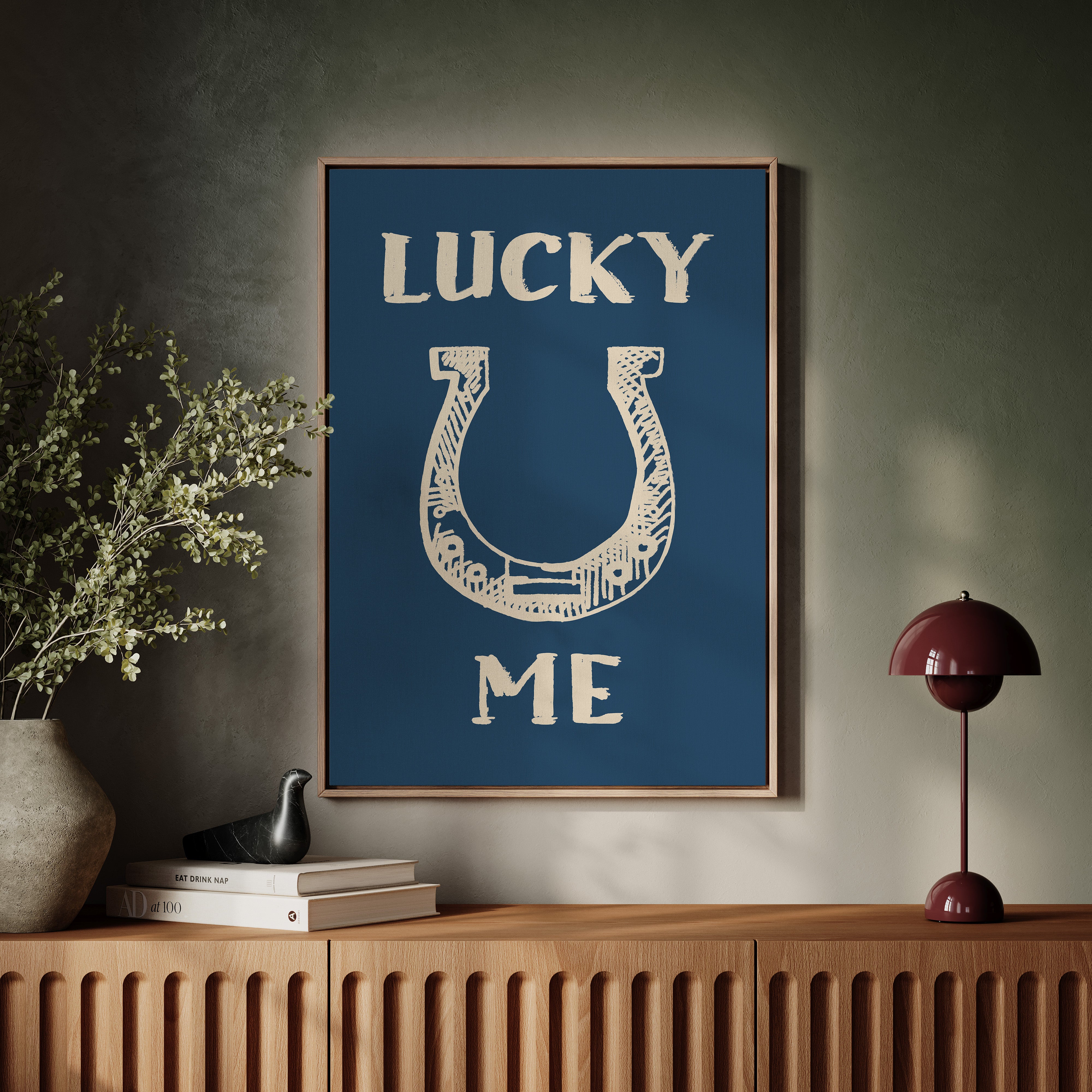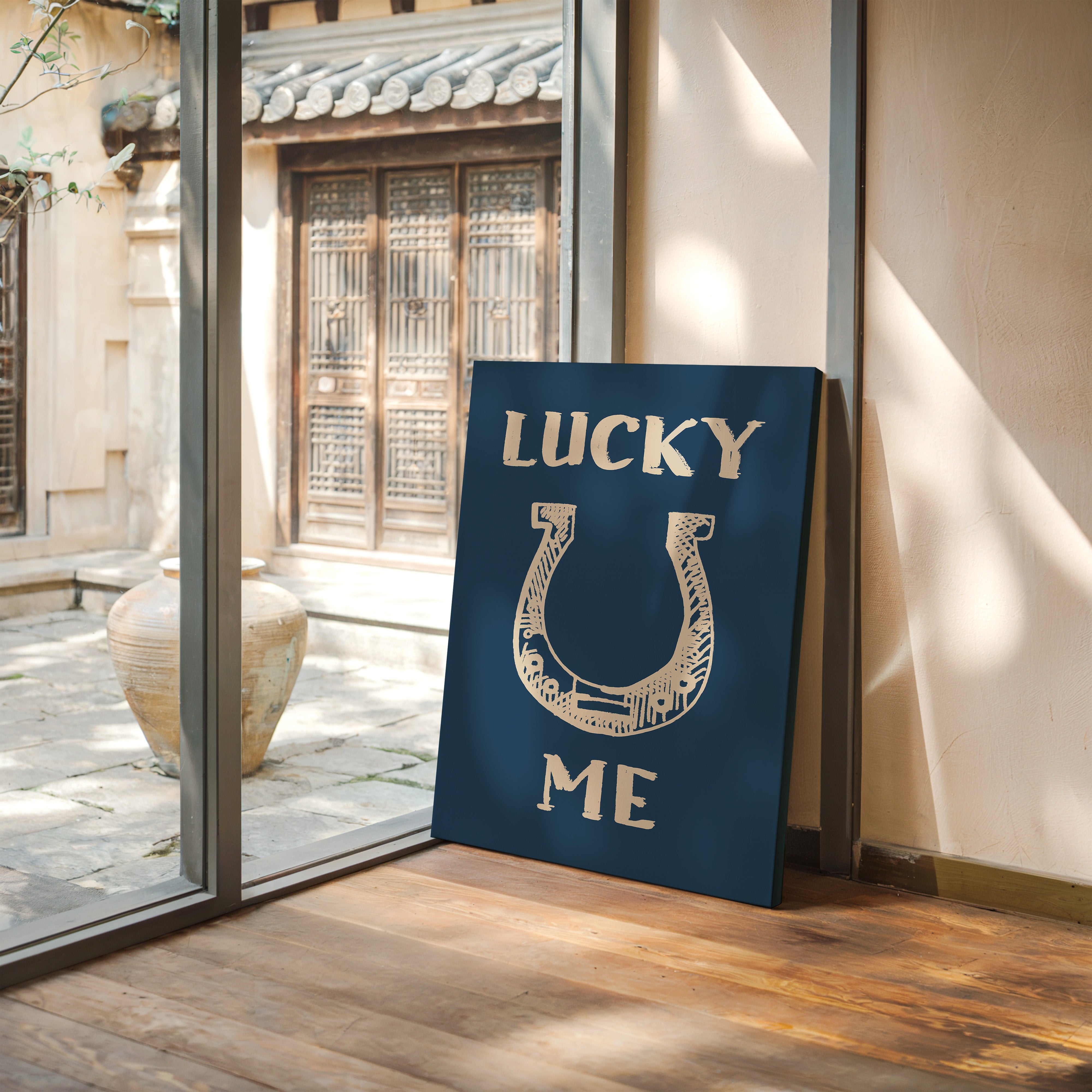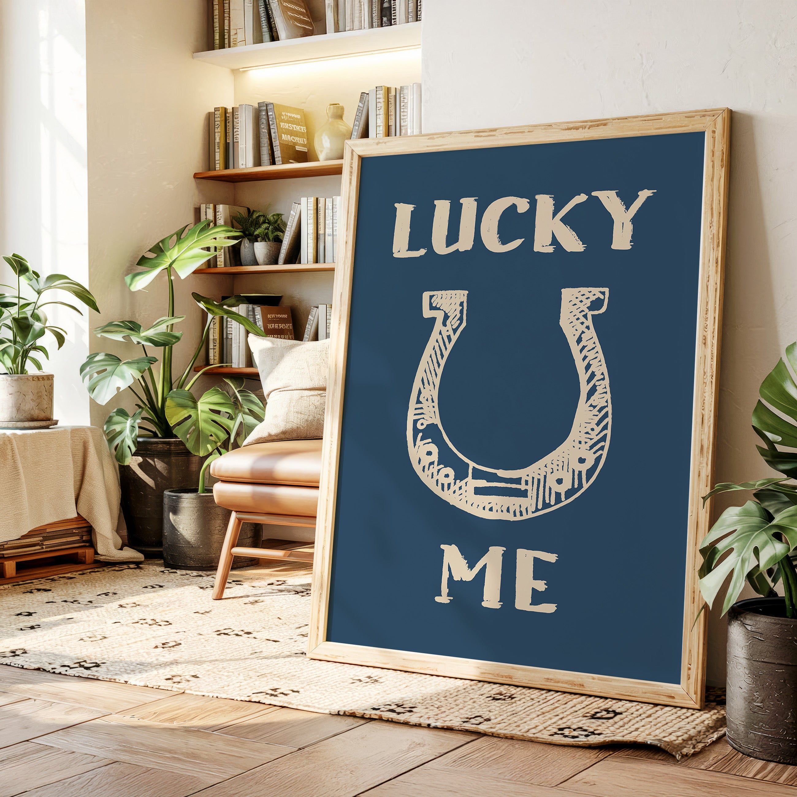 "Against a deep navy backdrop, a hand-drawn horseshoe radiates rustic charm and timeless superstition. This piece from our Contemporary collection merges traditional symbolism with modern minimalist design. The cream-colored illustration features delicate crosshatching and thoughtful details that bring personality to this symbol of fortune, while the bold typography creates a playful dialogue between text and image. Perfect for adding a touch of whimsy to a home office or bringing character to a modern farmhouse kitchen. The simplicity of the design allows it to seamlessly blend with both contemporary and traditional decor styles.