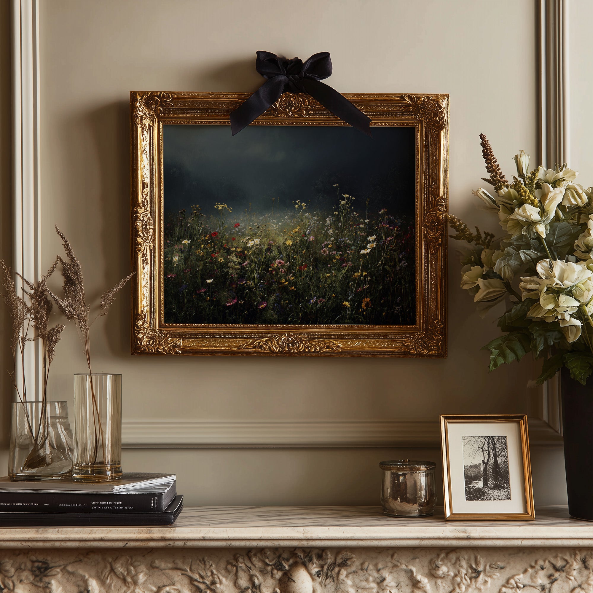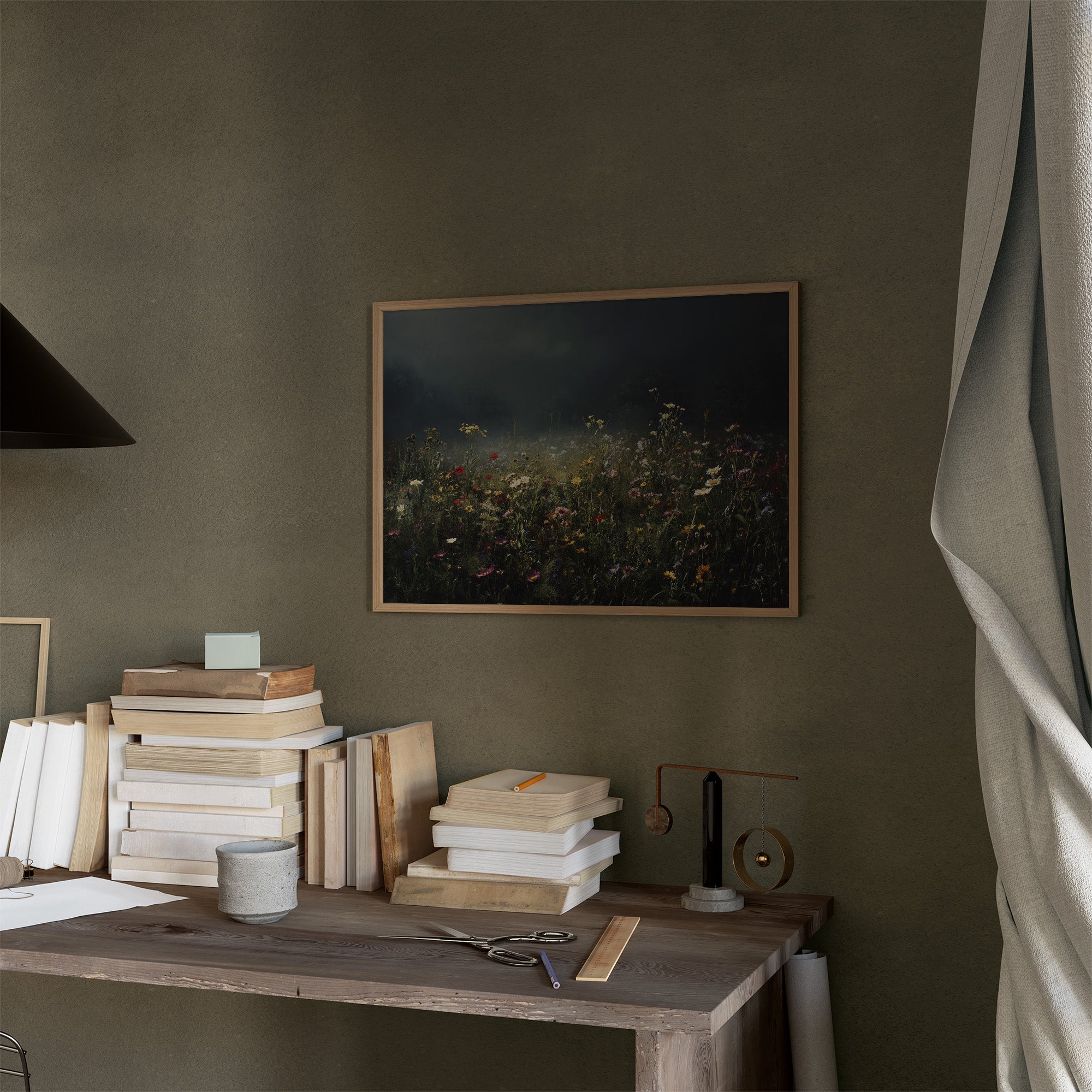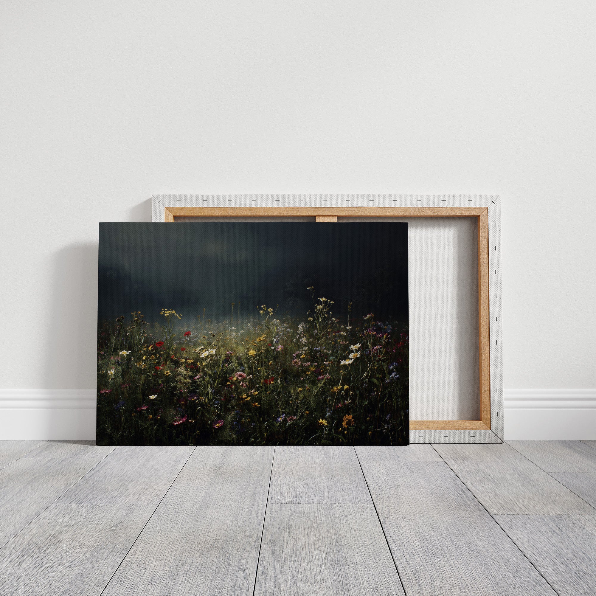 A tranquil painting of wildflowers emerges from darkness, capturing that magical moment when moonlight reveals a hidden field in bloom. Rich emerald stems reach upward through the night, supporting delicate petals in hues of white, yellow, and subtle crimson against a mysterious black backdrop. This contemplative piece finds perfect harmony in a library or reading nook, creating a window to nature's poetry amid collected volumes of human wisdom.