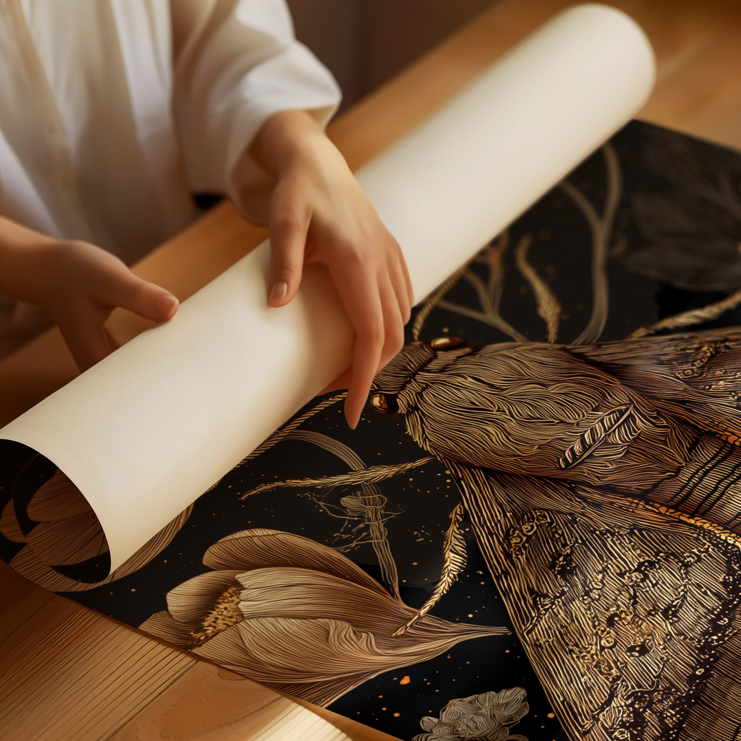 A delicate dance unfolds between creature and flora, suspended in velvet darkness. The intricately detailed moth, rendered in luminous golden-brown tones, hovers amidst blossoms that seem to glow with their own inner light against the midnight backdrop. Delicate linework traces every wing pattern and petal edge, creating a mysterious botanical world where nature's smallest wonders become magnificent. This sophisticated piece brings dramatic elegance to a study, library, or dining room where its moody luxury can be fully appreciated.