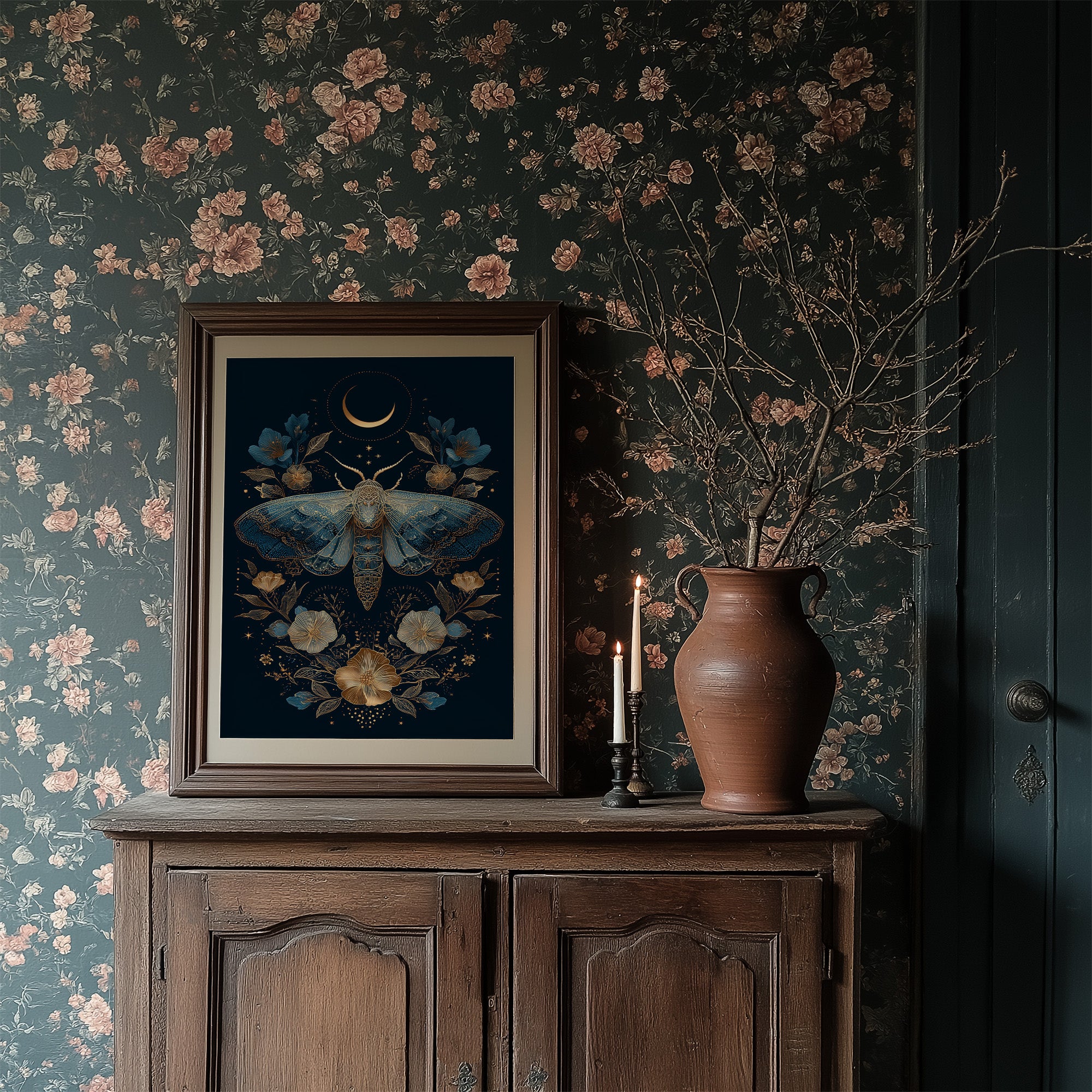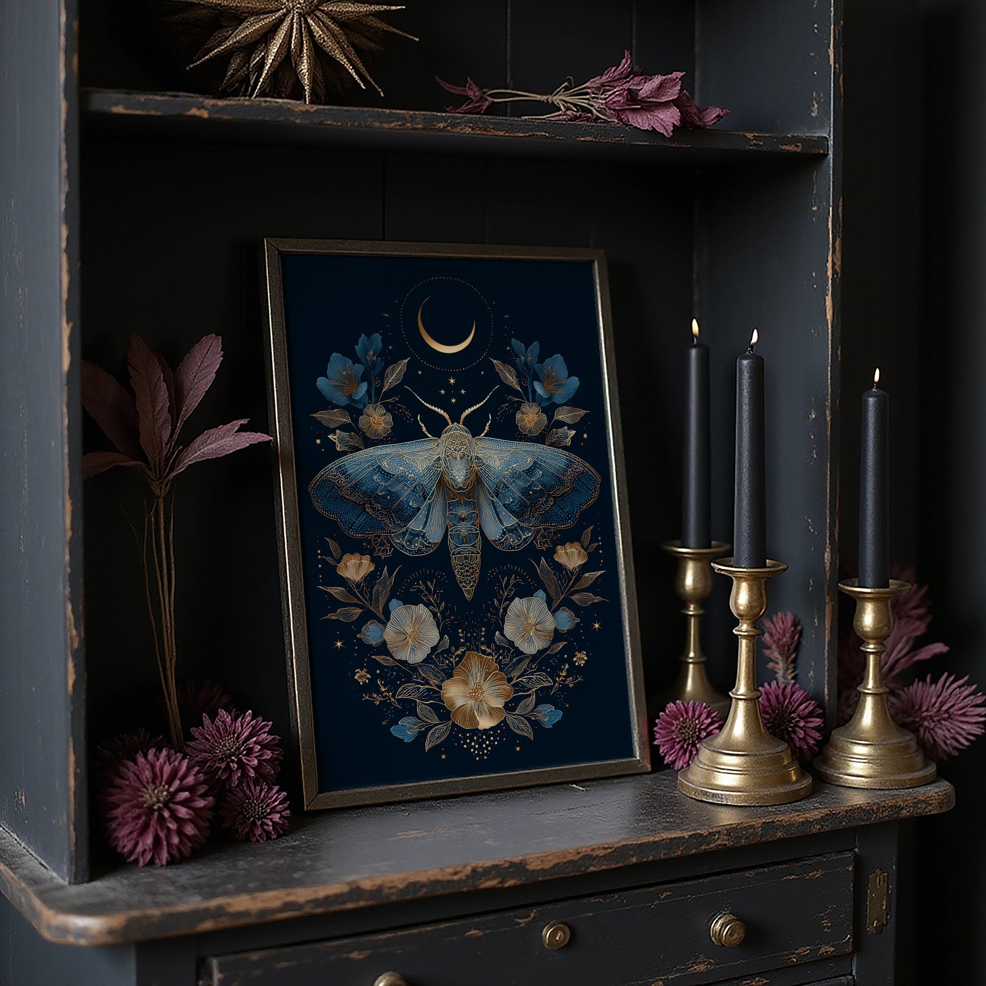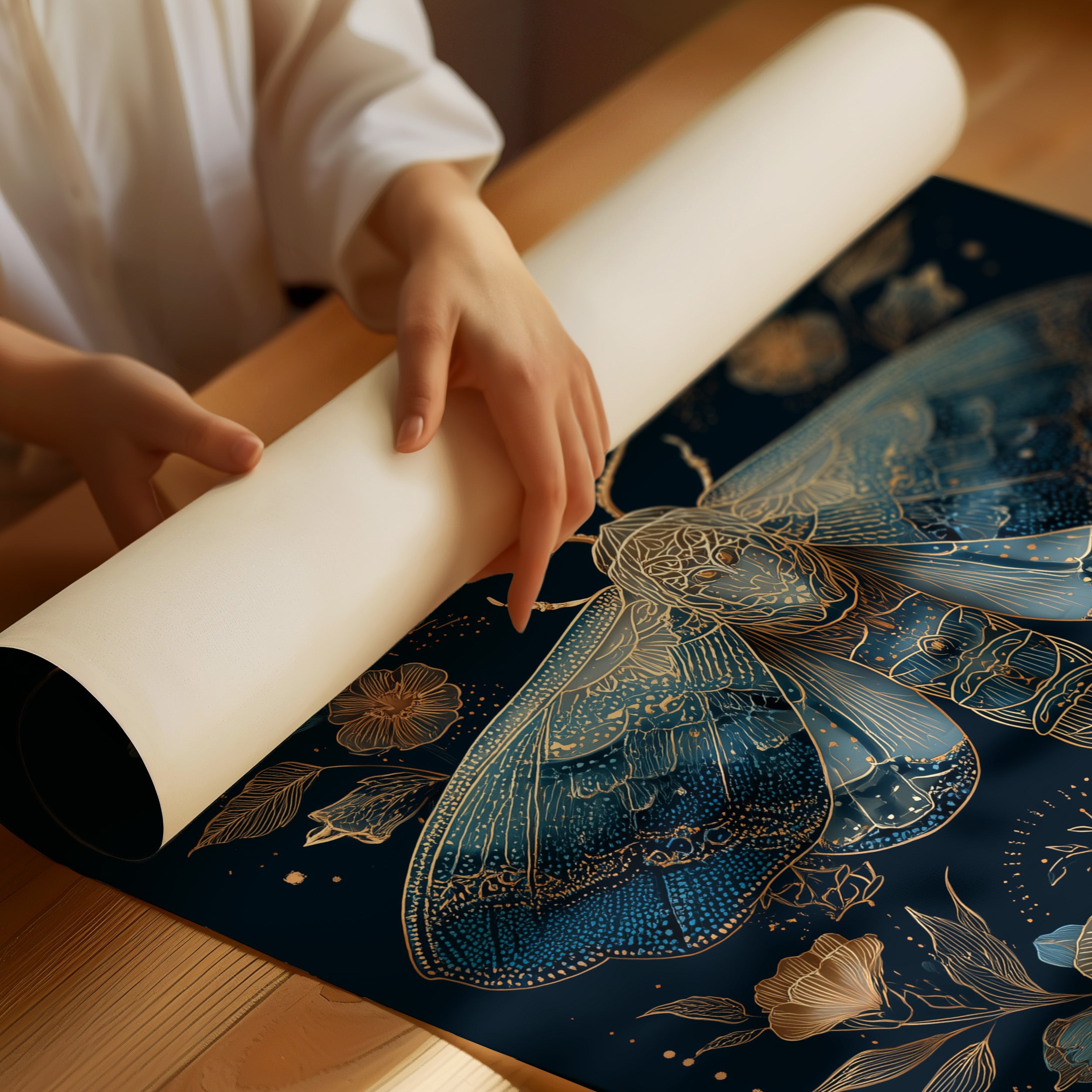 A delicate dance between darkness and light unfolds as a golden moth takes flight beneath a crescent moon. Deep navy blues merge with luminous gold and soft teal accents, creating an enchanted garden where blooms open only in twilight hours. The intricate details of the moth's wings mirror the celestial patterns above, suggesting a cosmic connection between earth and sky.