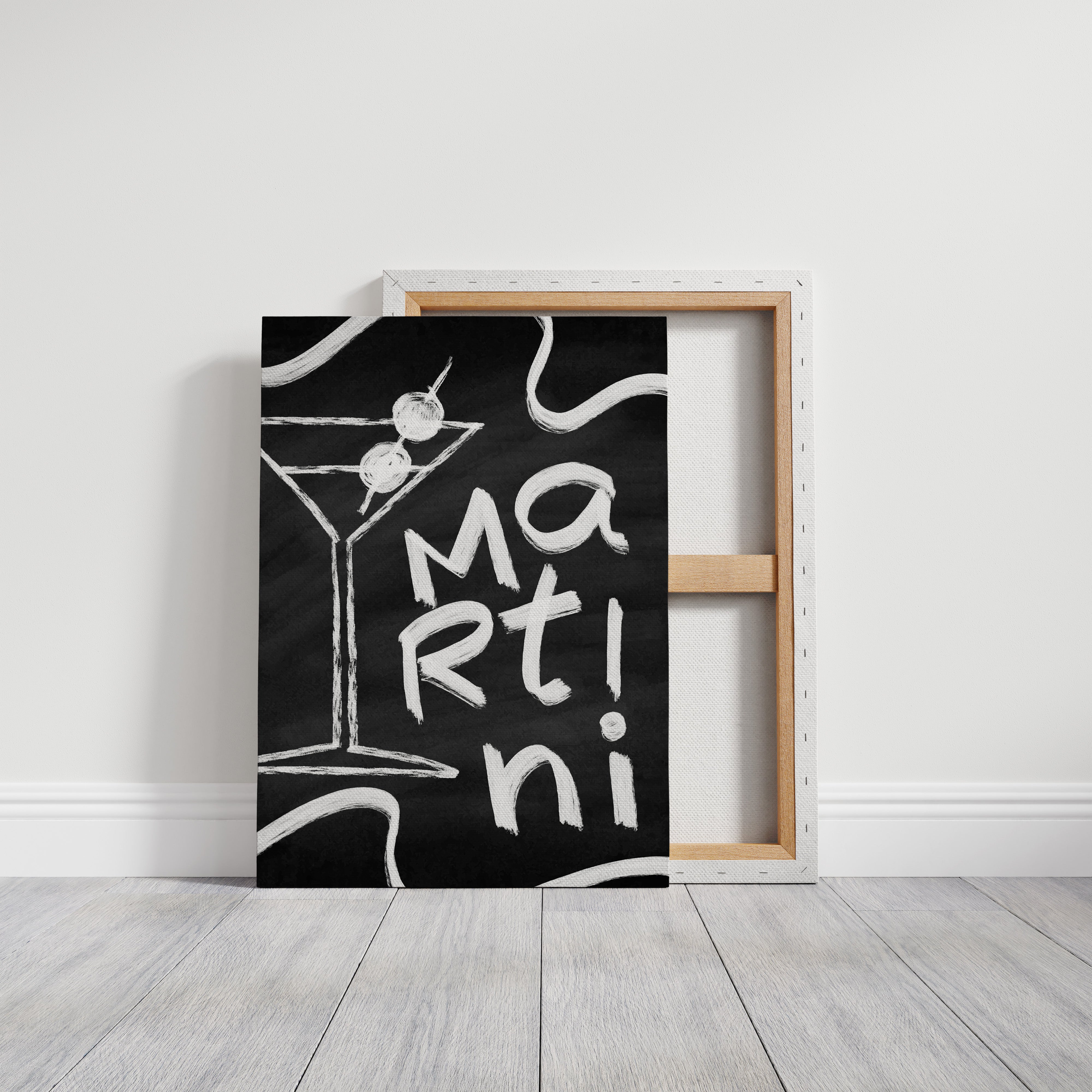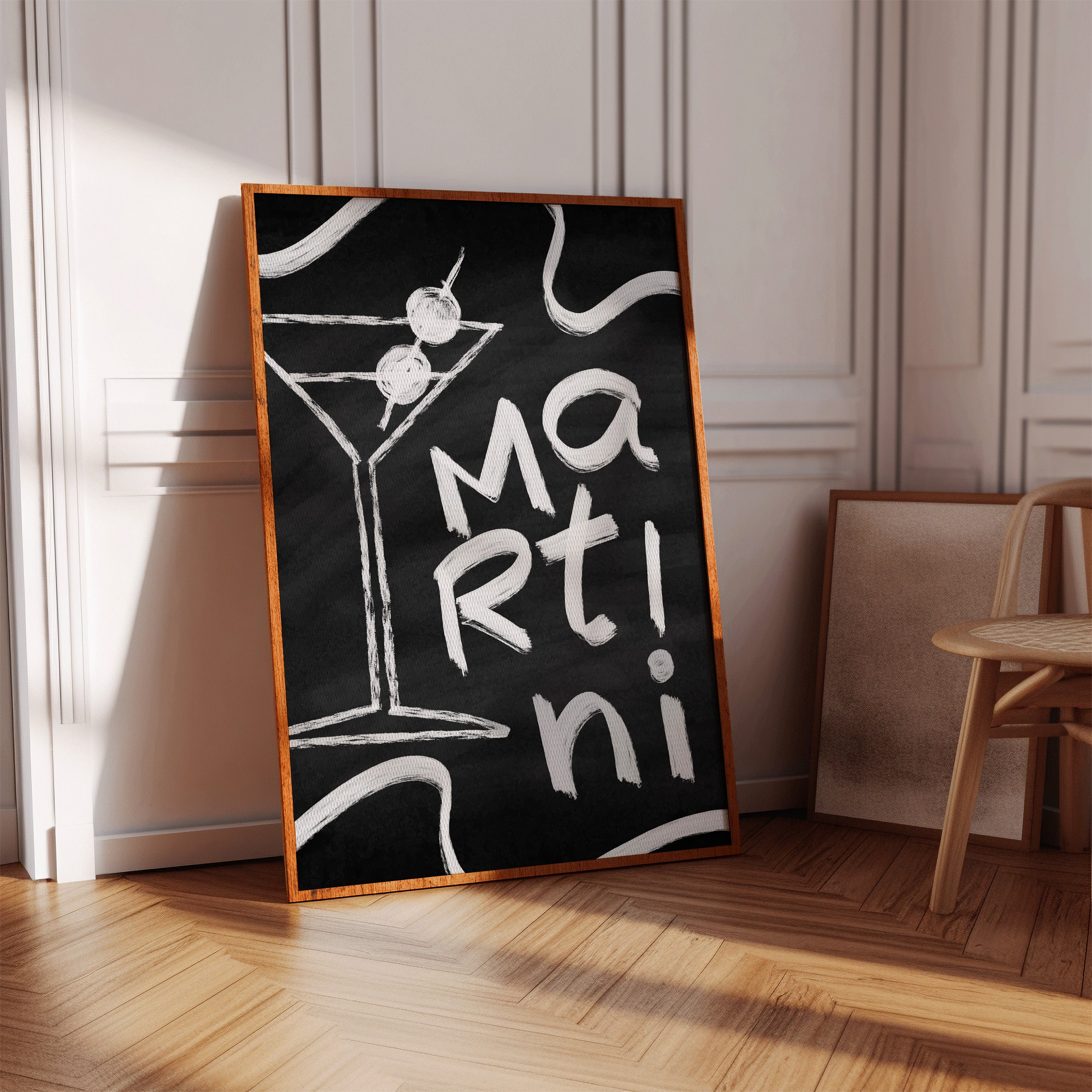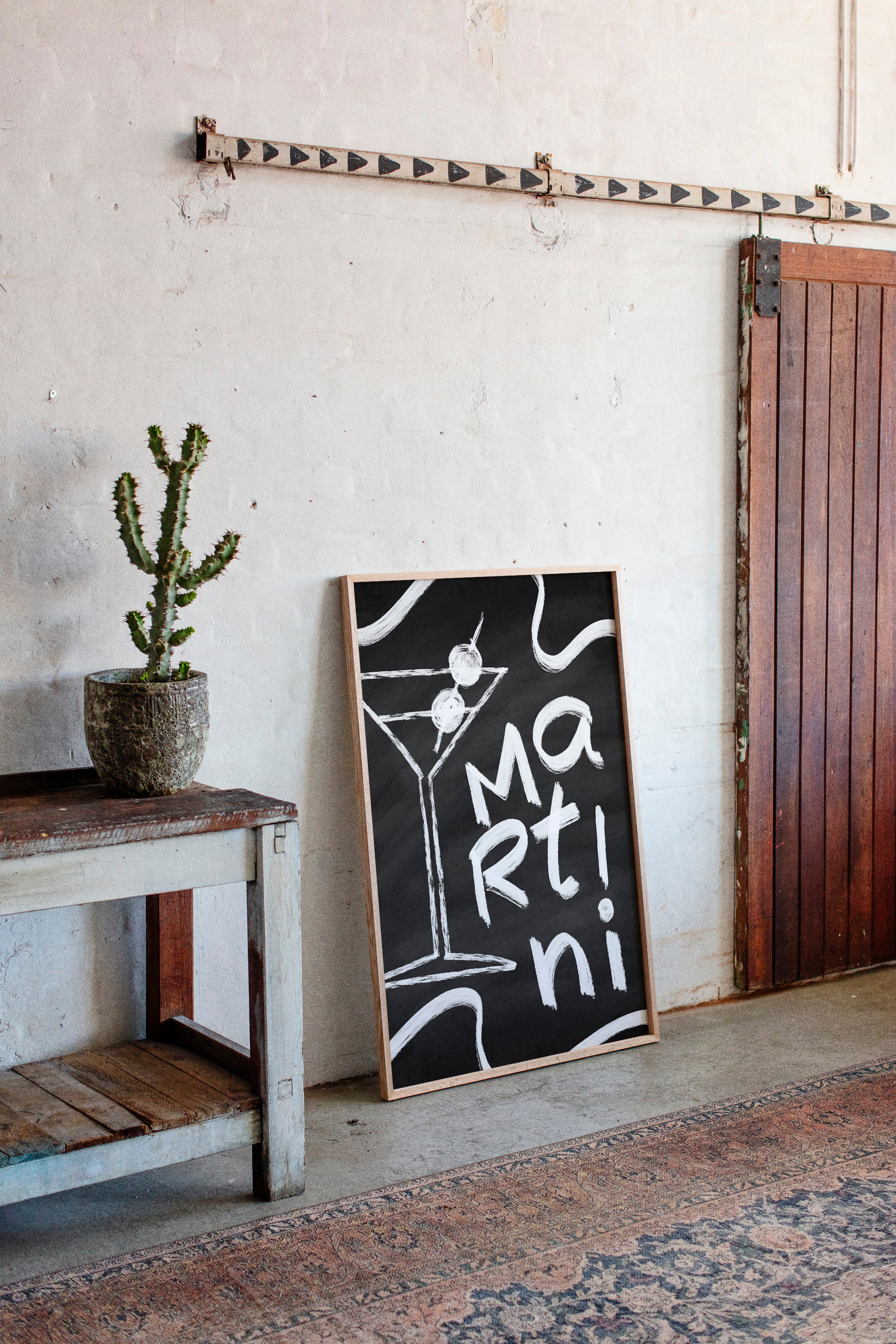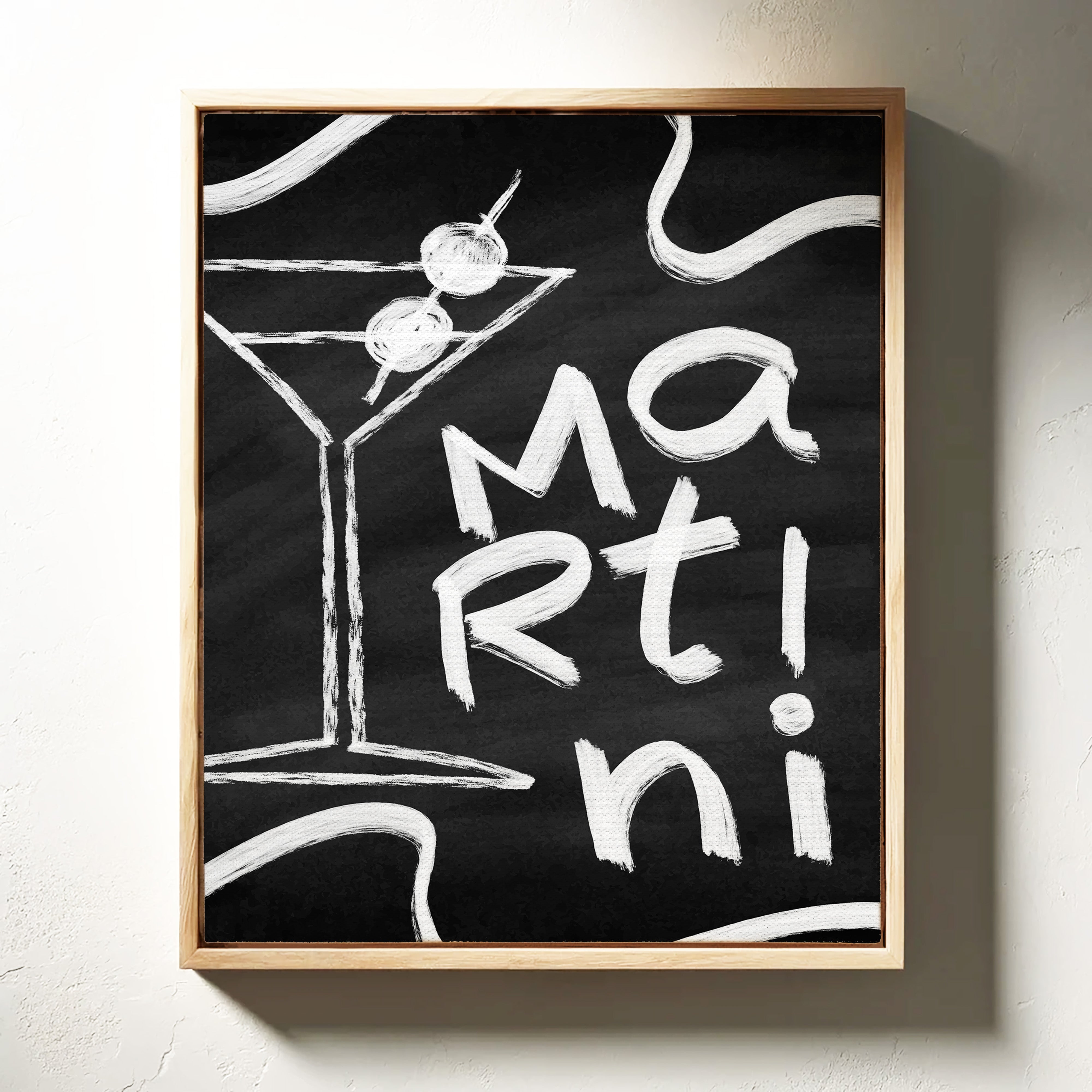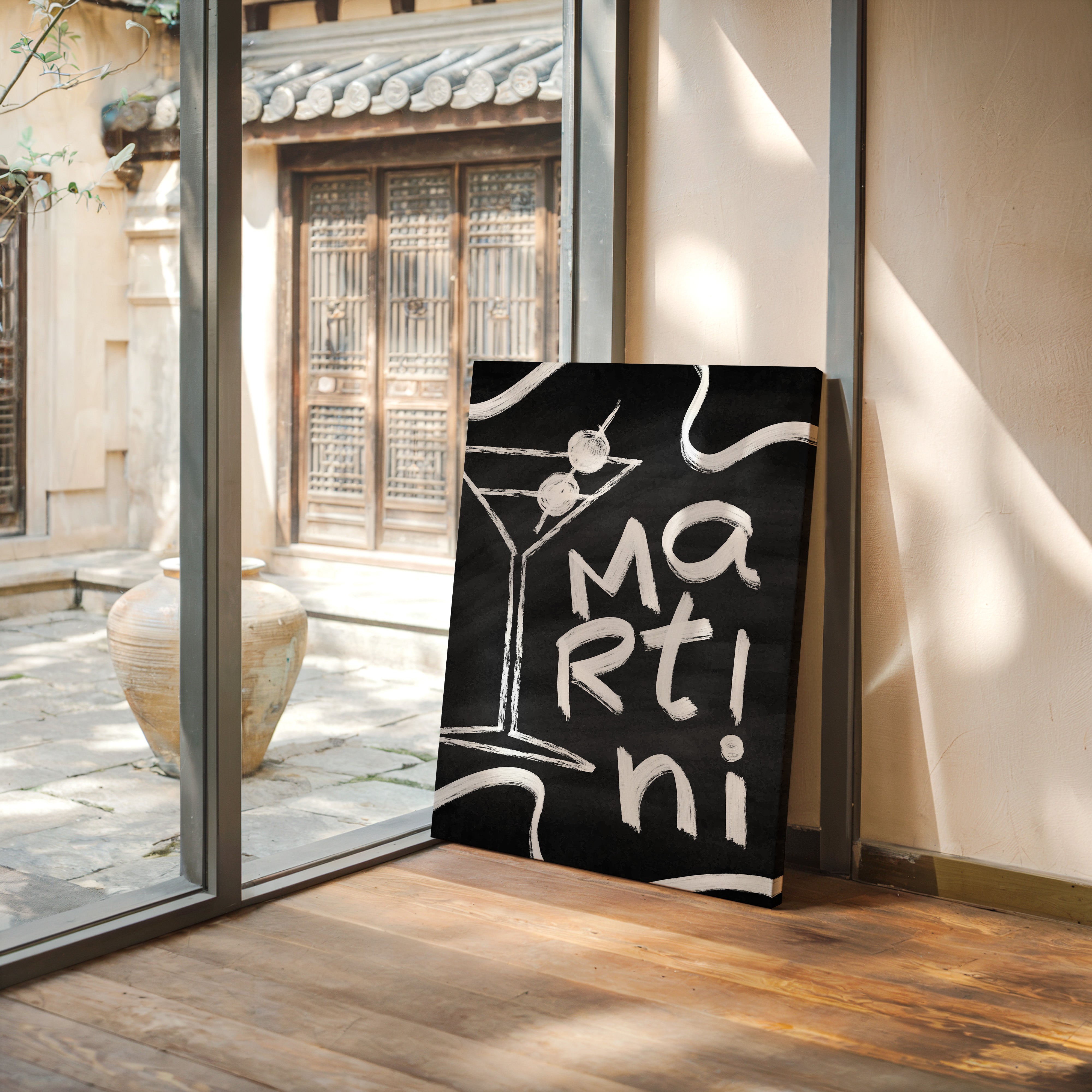 A playful twist on cocktail culture emerges through bold chalk strokes against midnight black, capturing the essence of sophisticated revelry. This piece belongs to our Contemporary collection, where modern minimalism meets creative expression. The martini glass stands as an iconic symbol, its clean lines and curves dancing with the spontaneous energy of hand-drawn letters, while abstract swirls suggest the buzz of evening conversation and laughter. Perfect for adding a dash of wit and style to a home bar, dining room, or kitchen space. The monochromatic palette speaks to both classic elegance and modern design sensibilities.