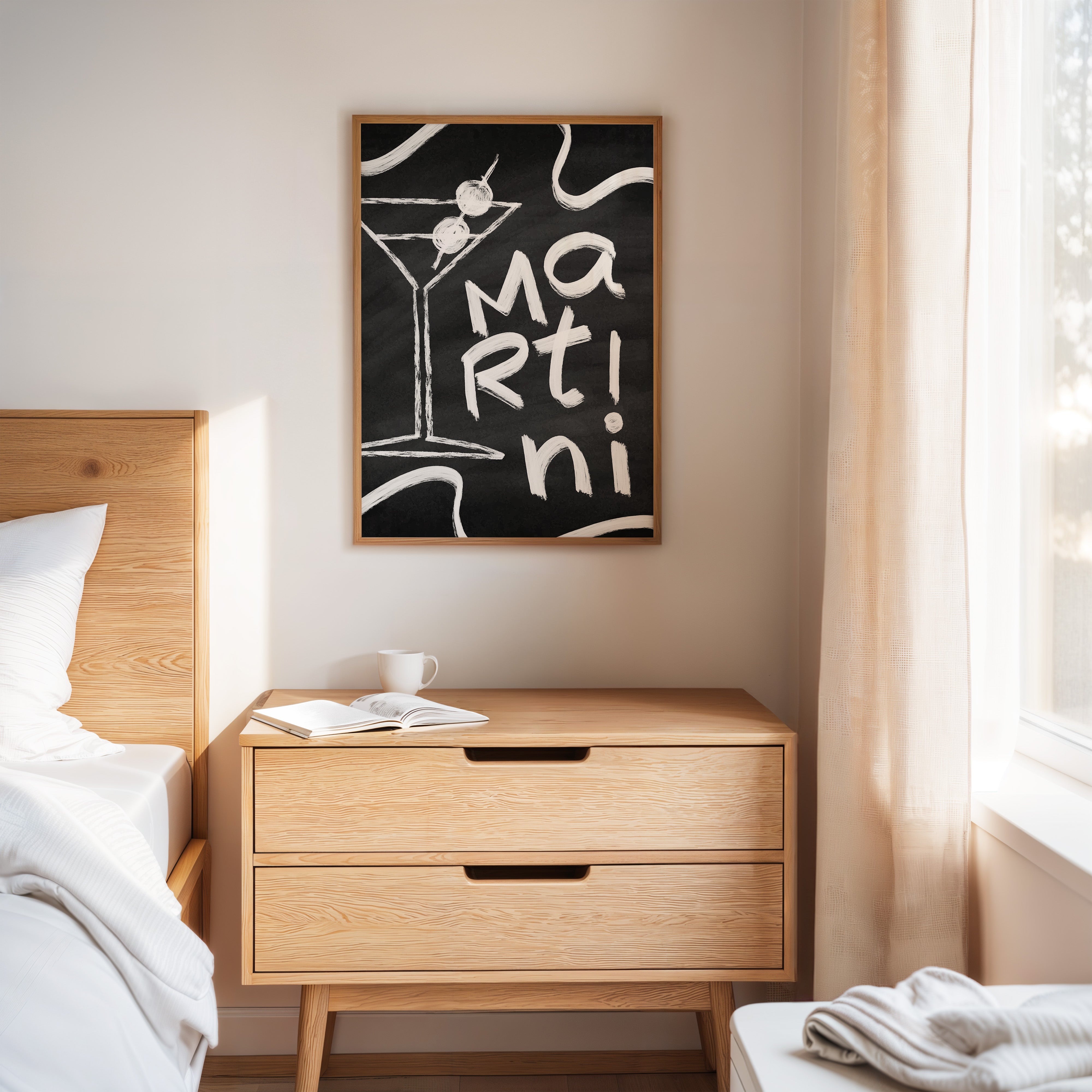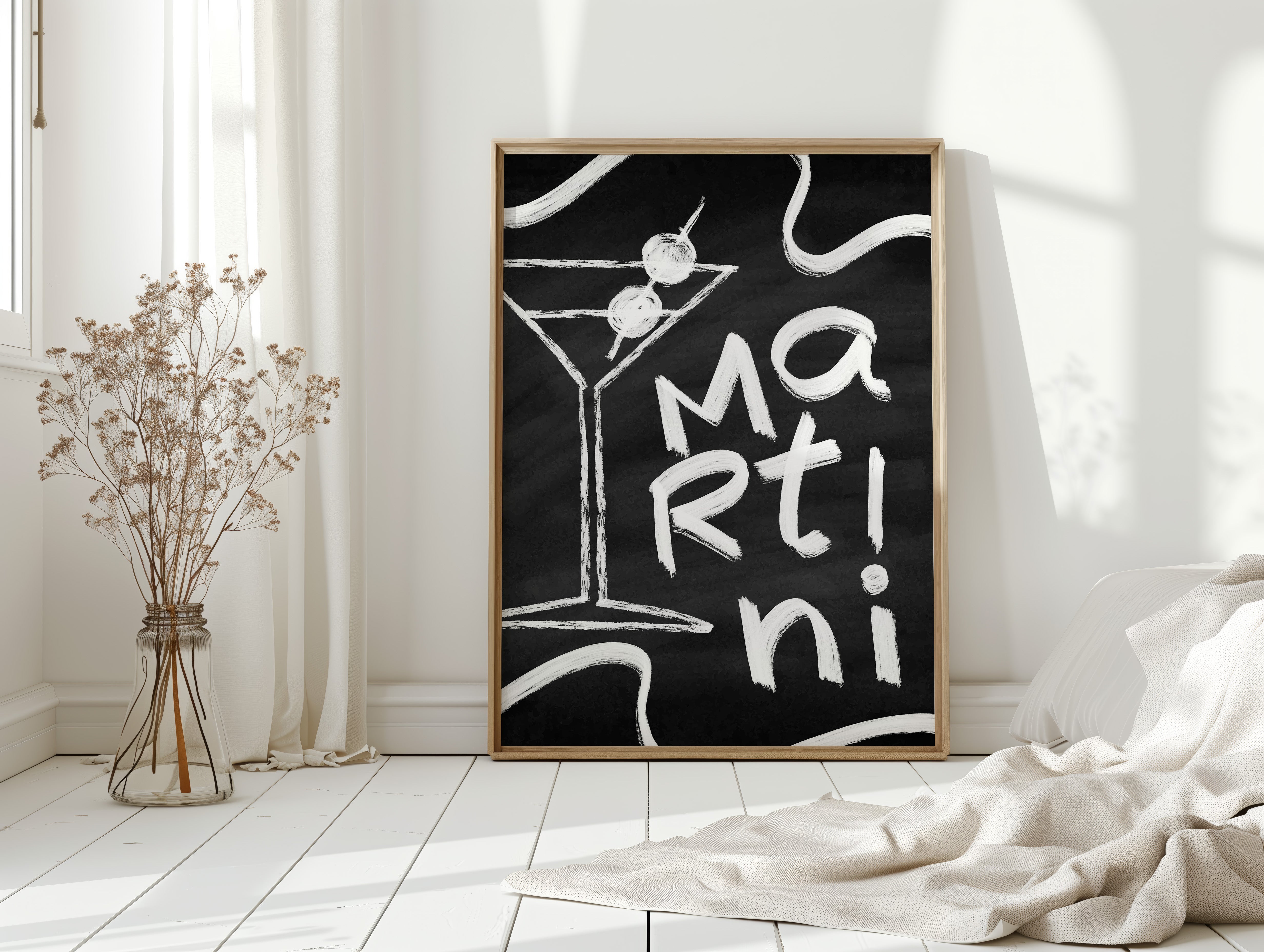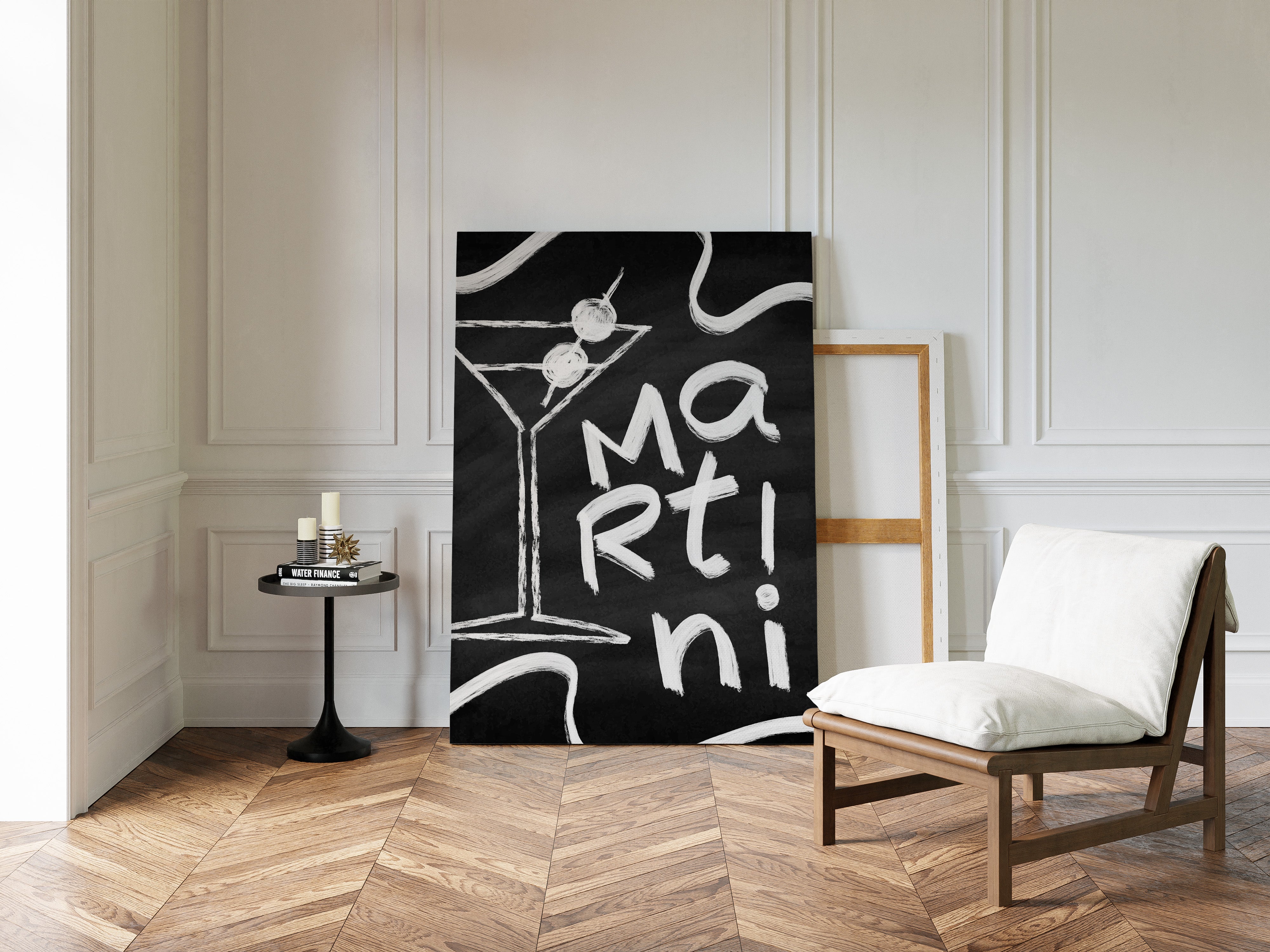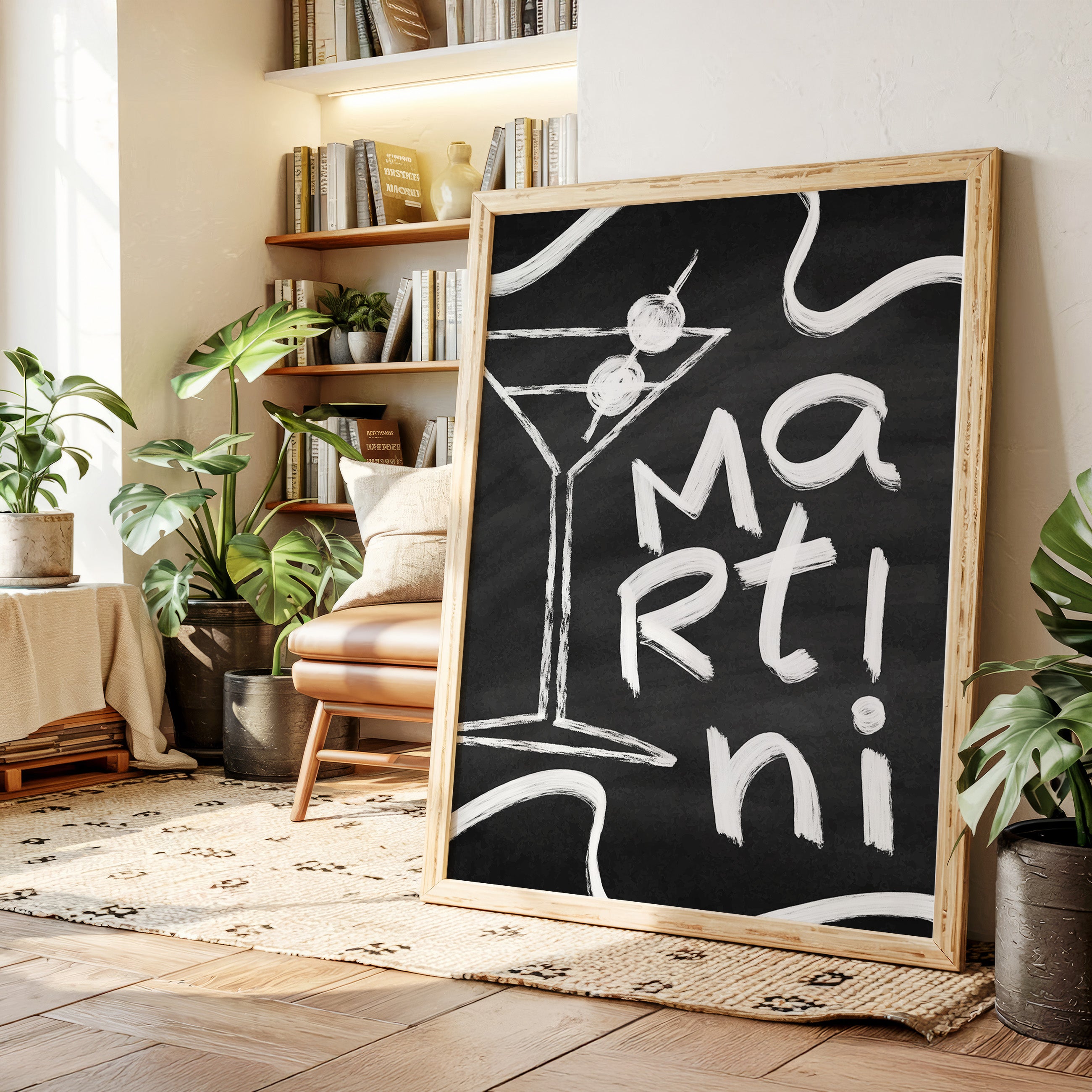 A playful twist on cocktail culture emerges through bold chalk strokes against midnight black, capturing the essence of sophisticated revelry. This piece belongs to our Contemporary collection, where modern minimalism meets creative expression. The martini glass stands as an iconic symbol, its clean lines and curves dancing with the spontaneous energy of hand-drawn letters, while abstract swirls suggest the buzz of evening conversation and laughter. Perfect for adding a dash of wit and style to a home bar, dining room, or kitchen space. The monochromatic palette speaks to both classic elegance and modern design sensibilities.