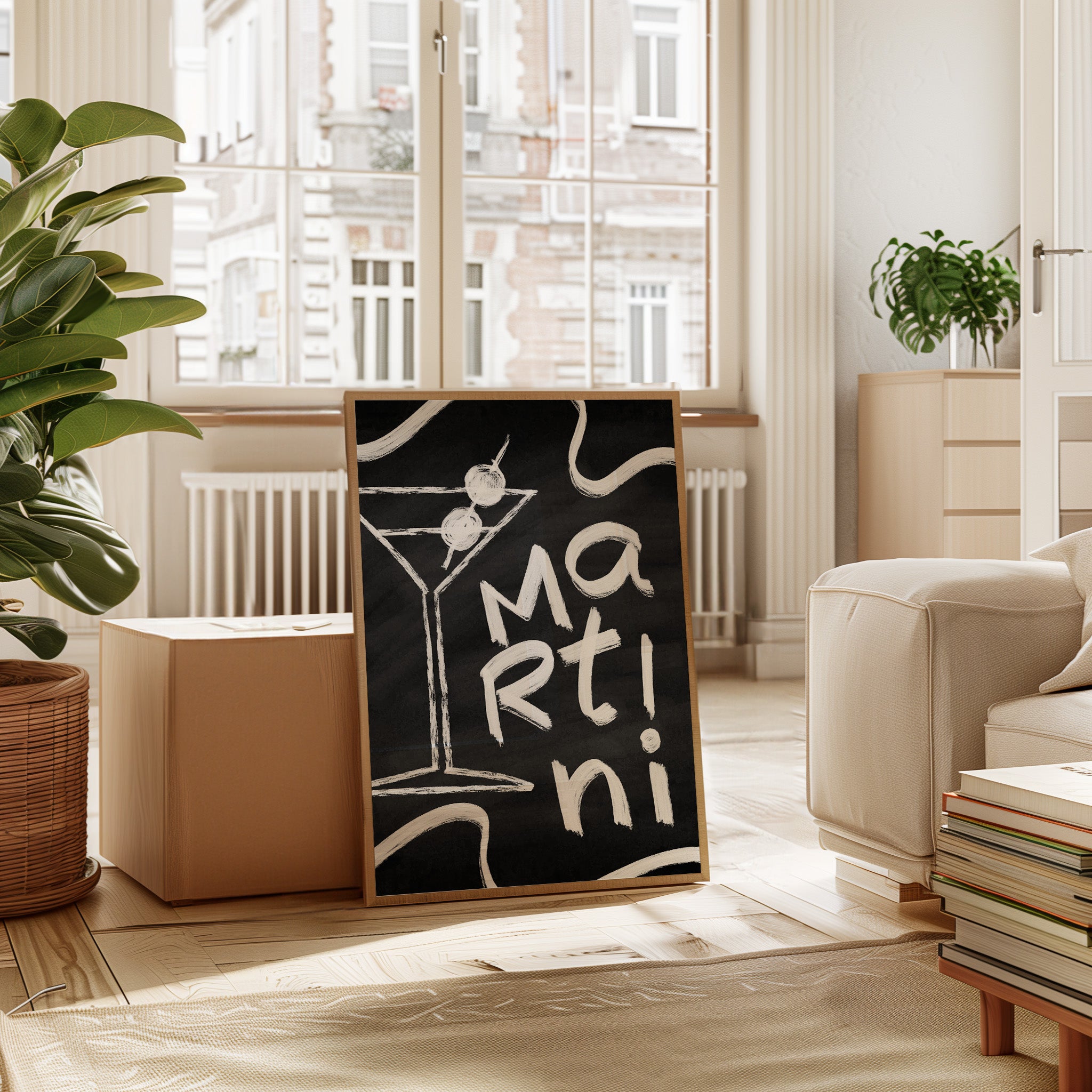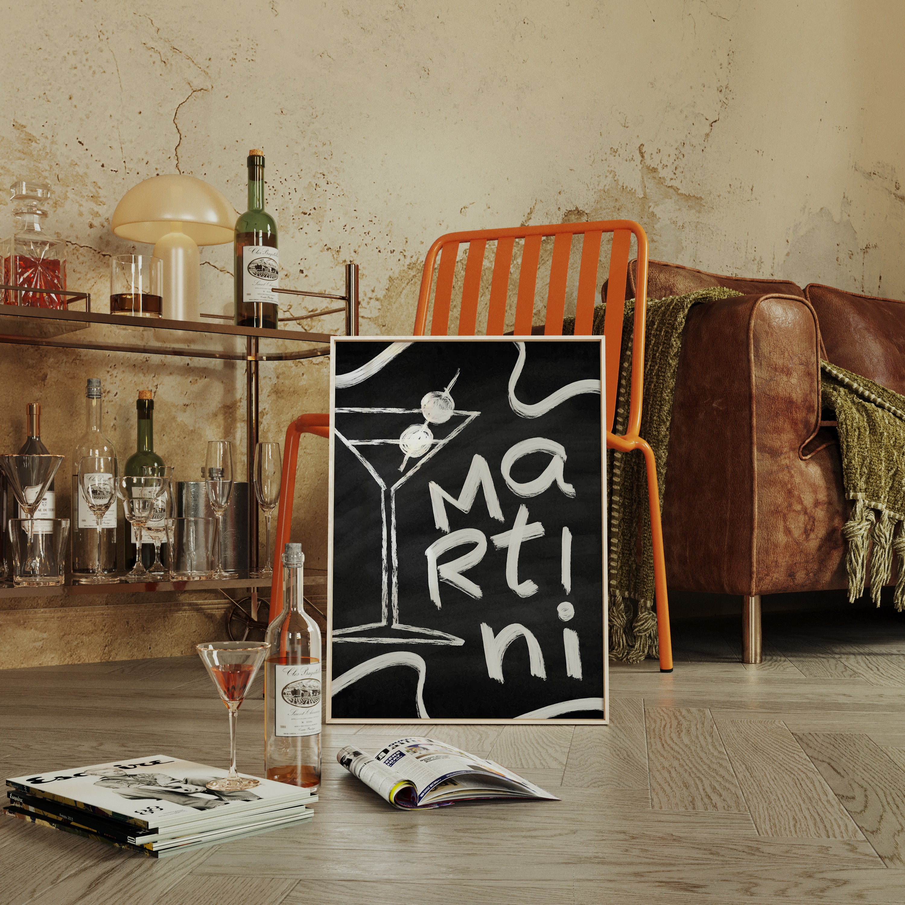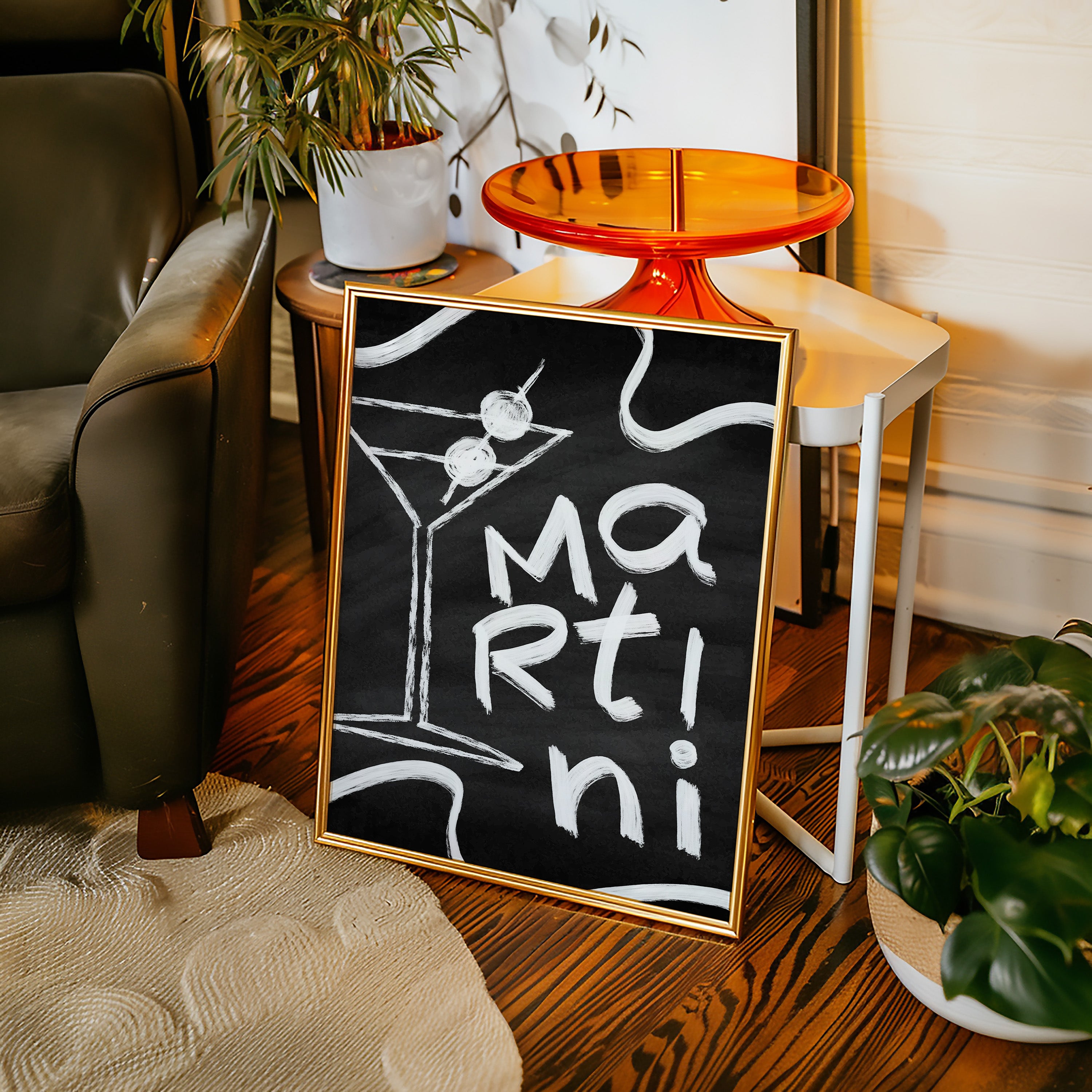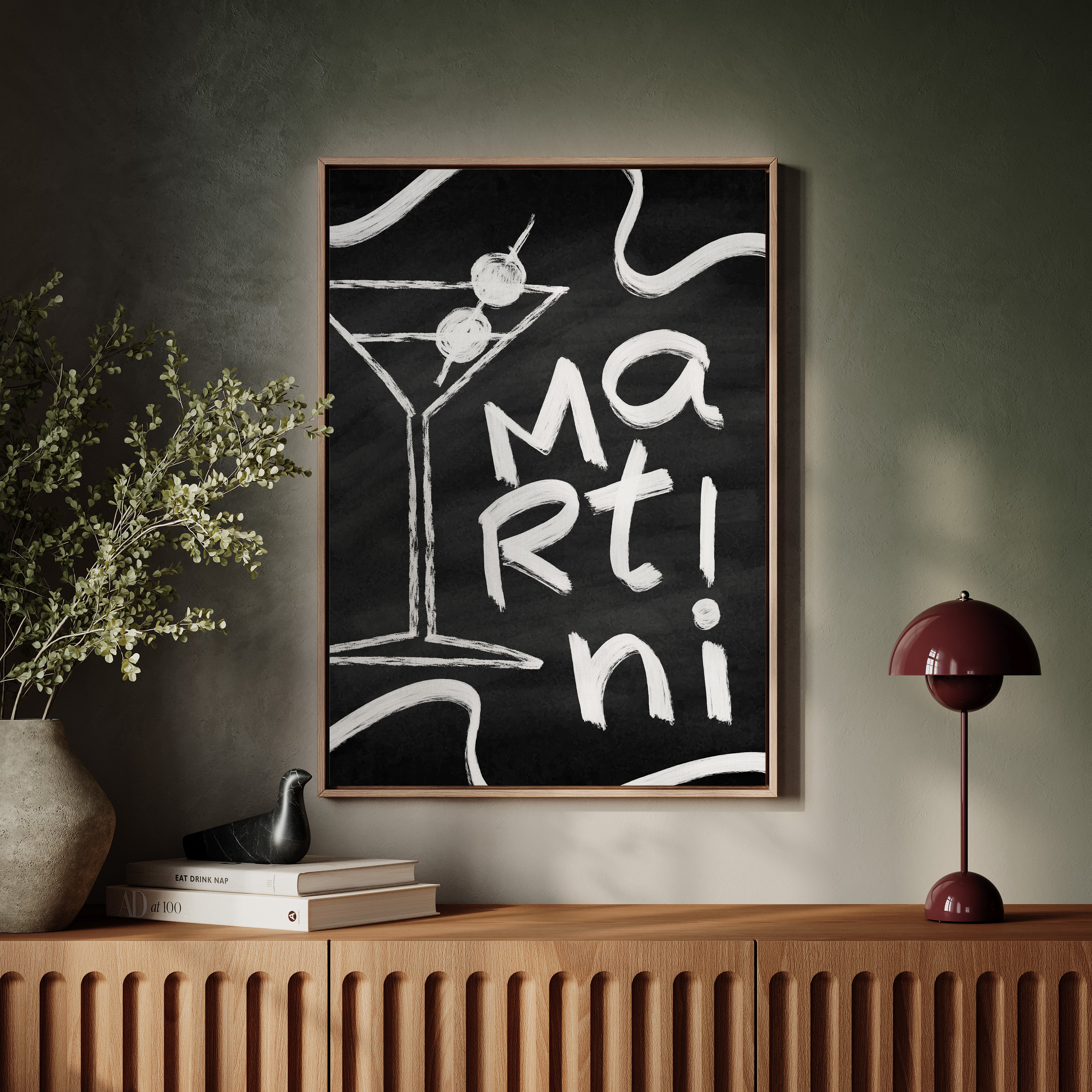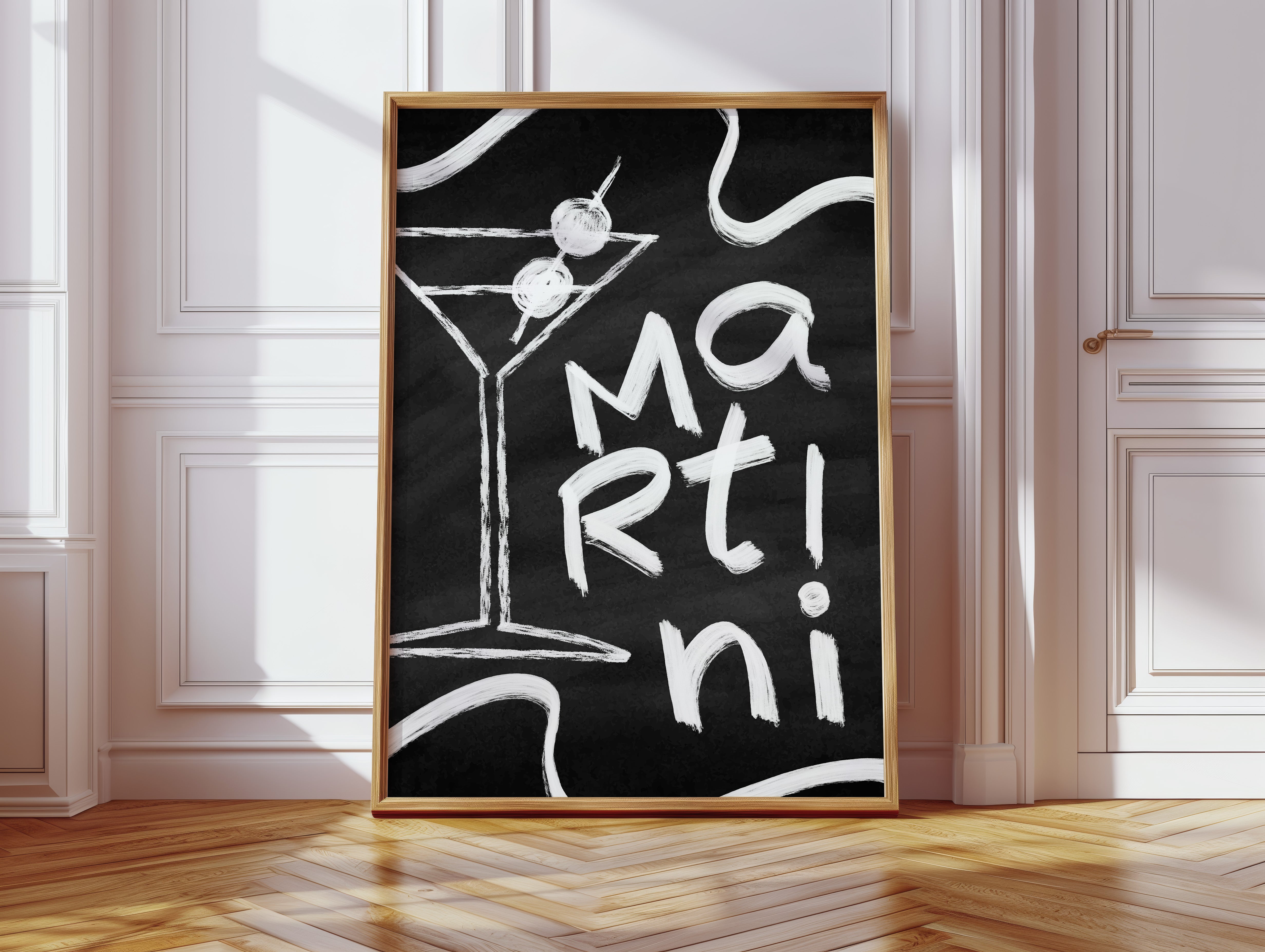 A playful twist on cocktail culture emerges through bold chalk strokes against midnight black, capturing the essence of sophisticated revelry. This piece belongs to our Contemporary collection, where modern minimalism meets creative expression. The martini glass stands as an iconic symbol, its clean lines and curves dancing with the spontaneous energy of hand-drawn letters, while abstract swirls suggest the buzz of evening conversation and laughter. Perfect for adding a dash of wit and style to a home bar, dining room, or kitchen space. The monochromatic palette speaks to both classic elegance and modern design sensibilities.